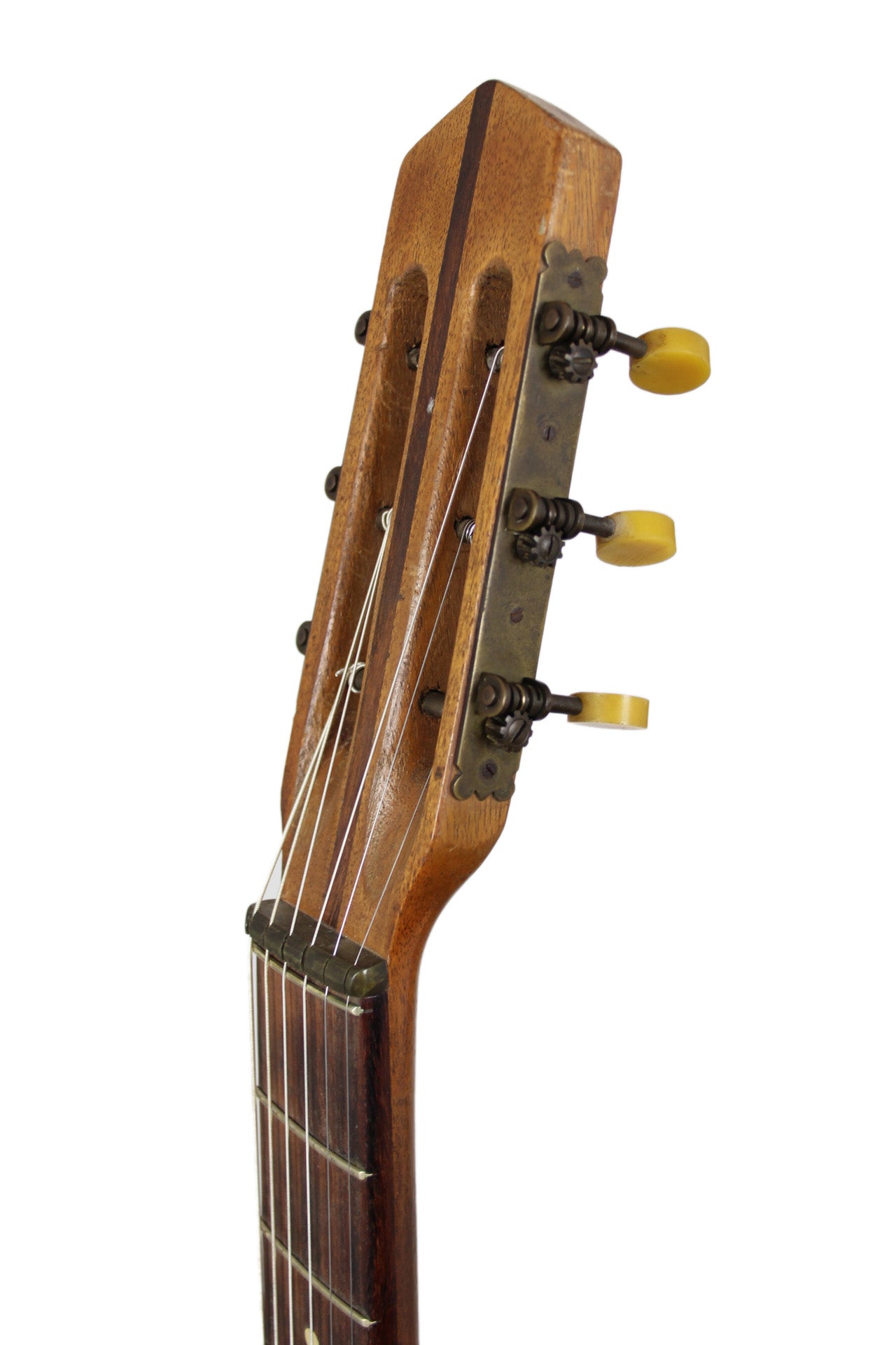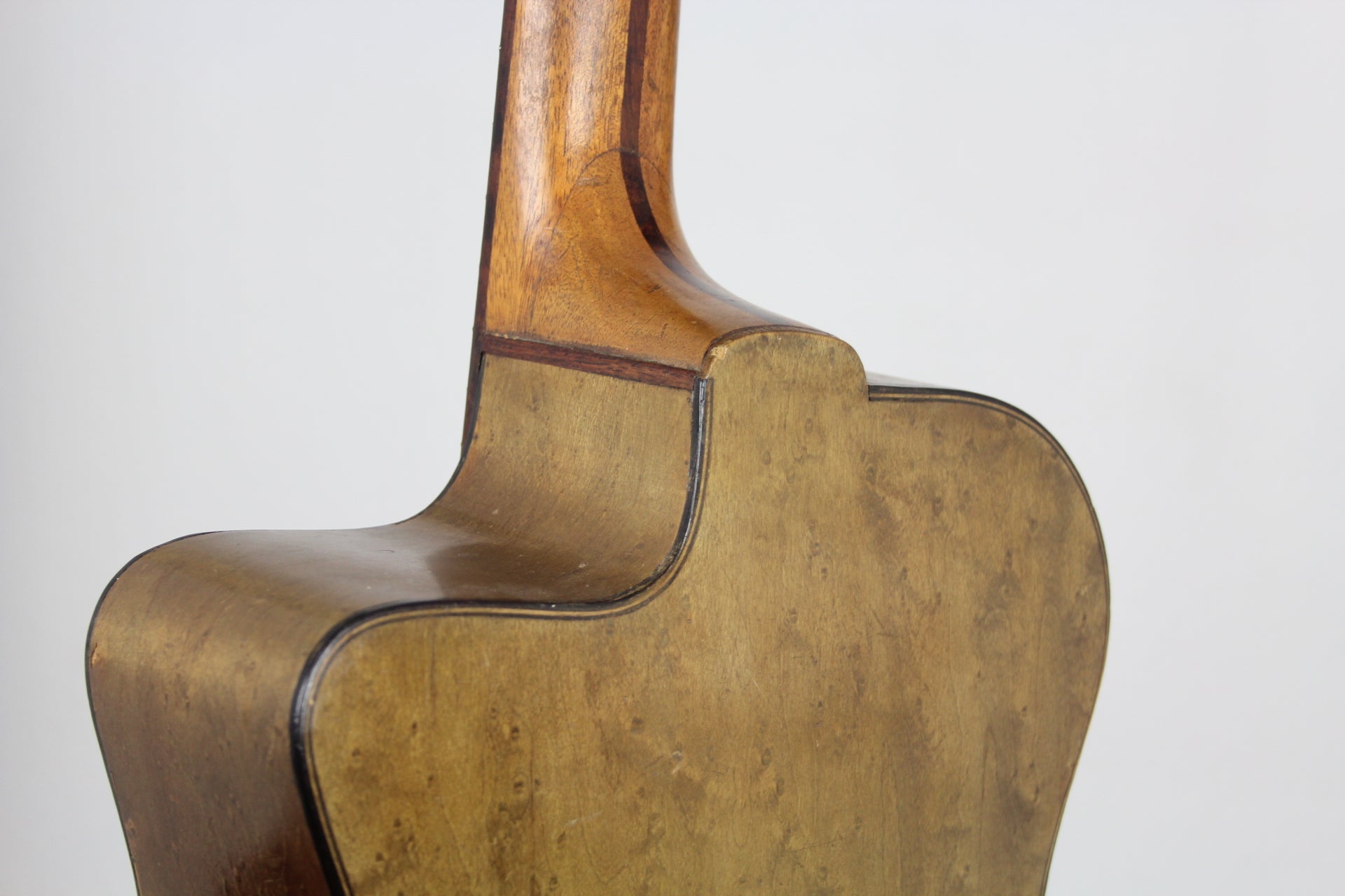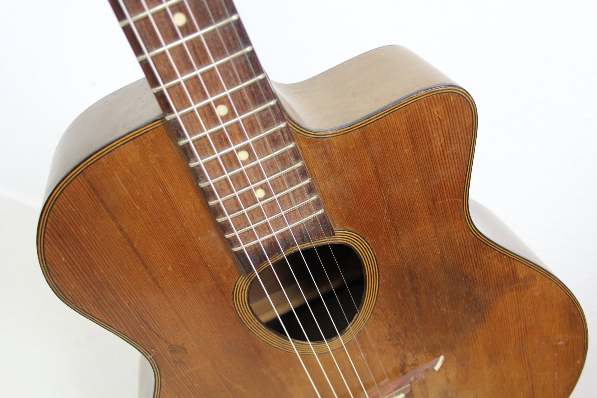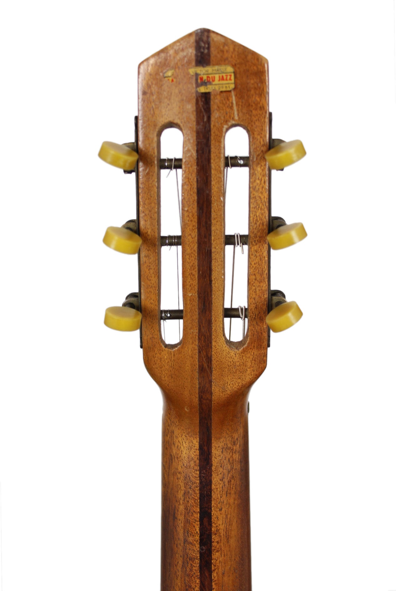 A wonderful old Gypsy Guitar made in the 40’s by Joseph di Mauro. Not to be confused with Antoine's son.. this is Antoine's brother. He worked on his own and his guitars are quite rare, initially. The guitar has a solid spruce top and laminated birdseye maple back and sides, 3-piece mahogany neck with rosewood stripe and fingerboard. Original tuners that turn backwards. Unfortunately the neck warped over time and some higher frets popped out a bit so at the moment playability is an issue. Therefore a professional refretting should be done to gain playability. Including a certificate of authenticity by Luthier Jérôme Casanova.