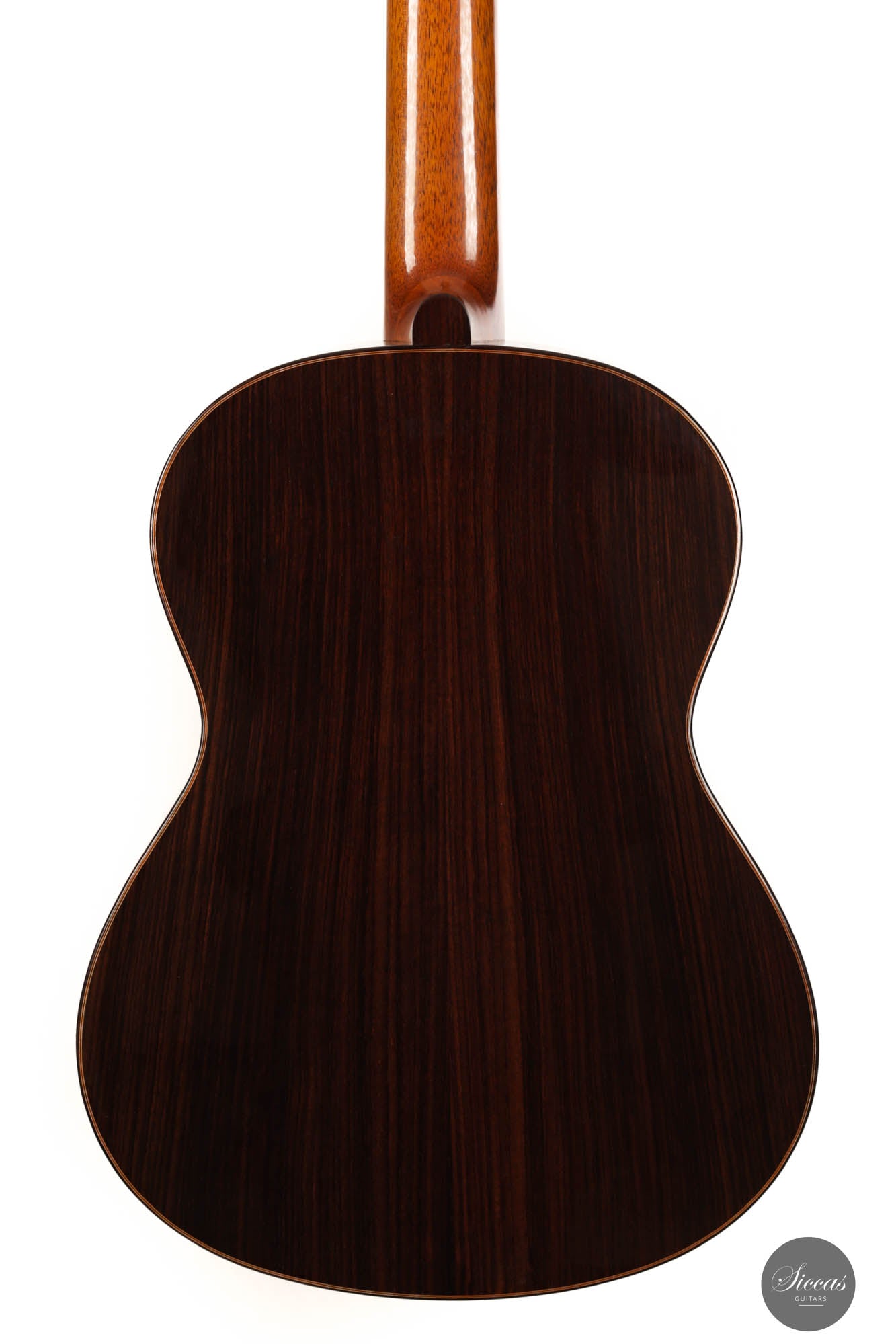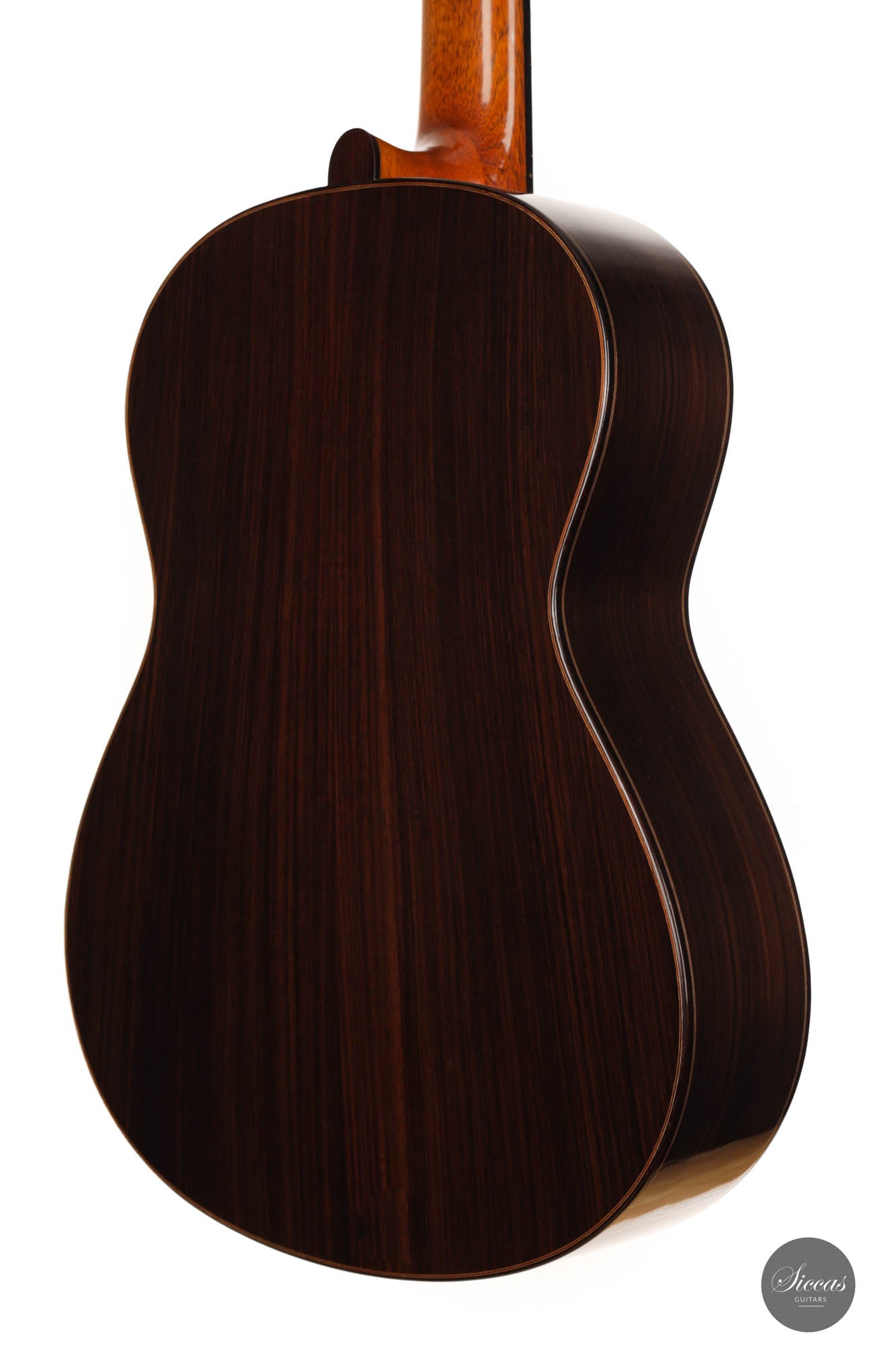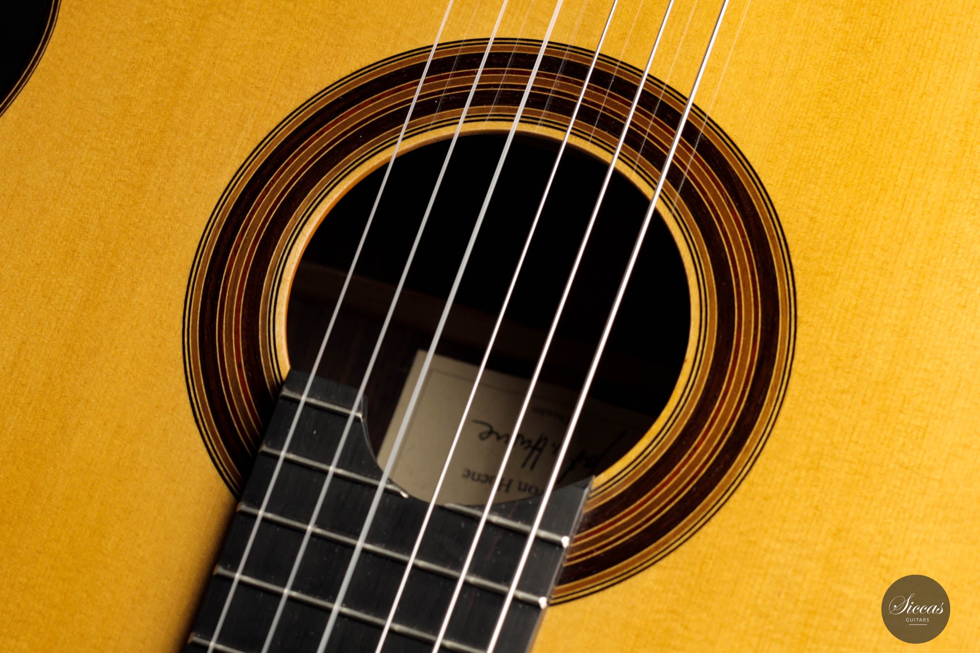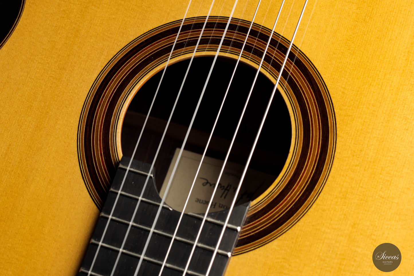 The 2023 Jost von Huene guitar combines traditional inspiration with refined modern craftsmanship. Built with a carefully aged spruce top and elegant purflings around the rosette, it reflects both visual sophistication and respect for the Torres and Arias heritage. Its light fan bracing, reinforced by two diagonal bars, creates a powerful projection while preserving sustain and tonal richness. The result is a sound that is expansive, smooth, and responsive, making the guitar both stable and inspiring to play. With its balance of elegance, clarity, and expressive depth, this instrument stands as an excellent example of Jost von Huene’s artistry.