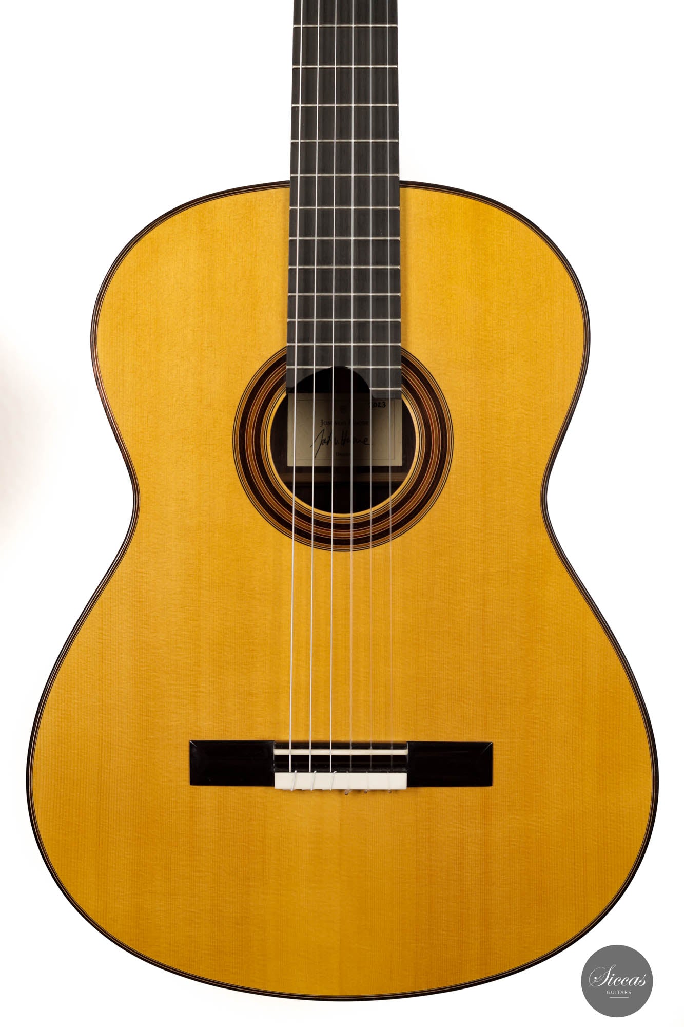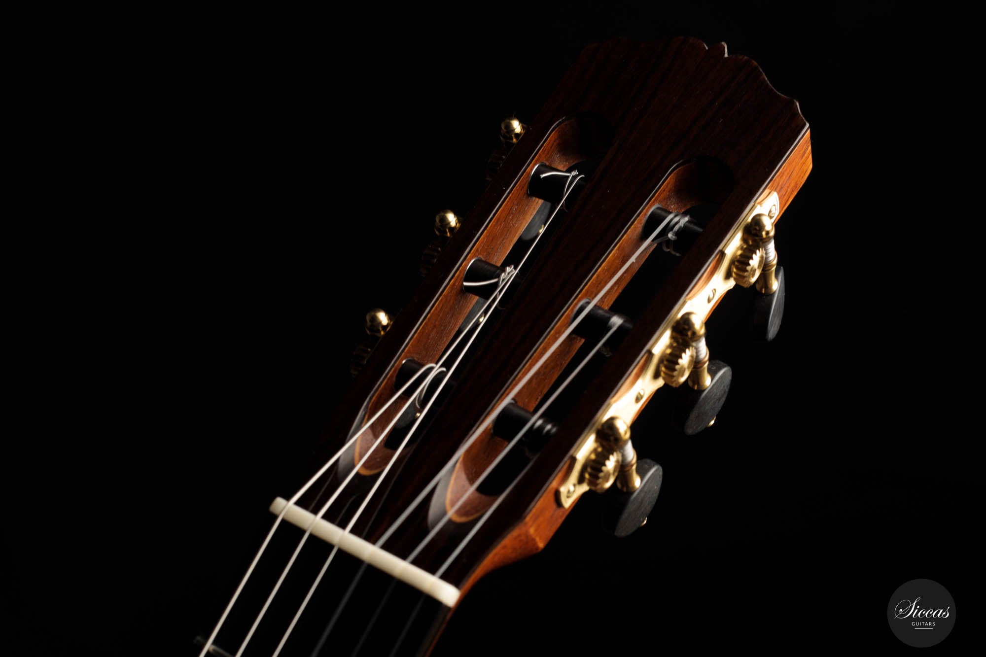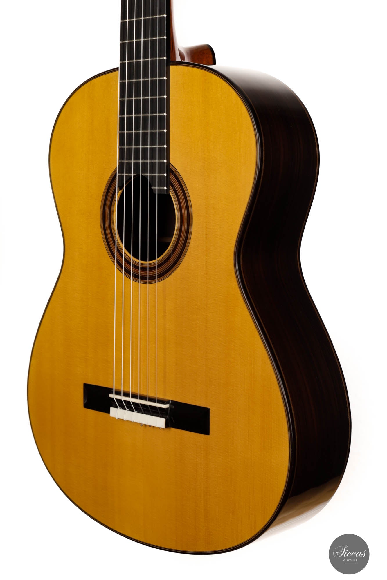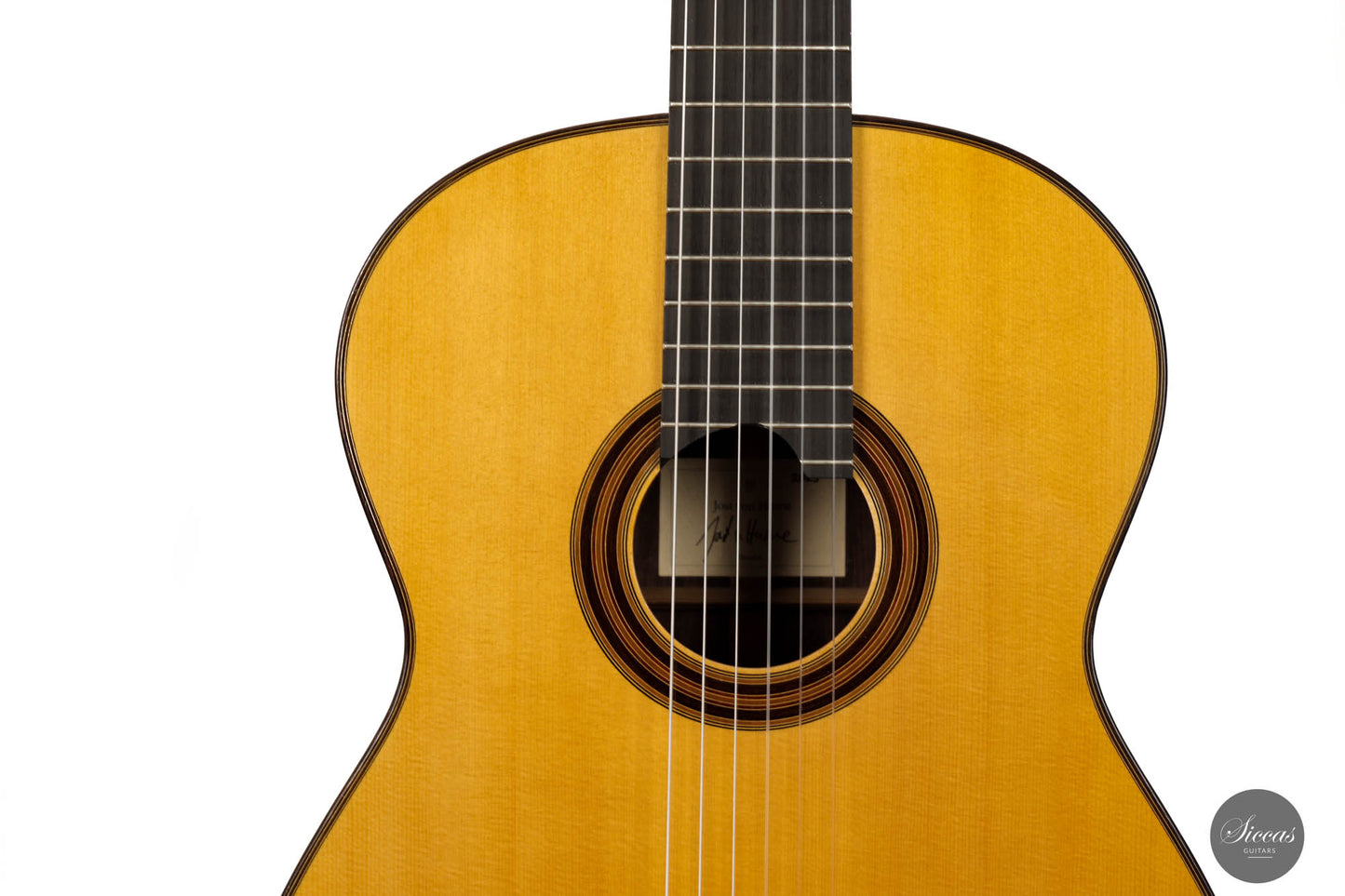 The 2023 Jost von Huene guitar combines traditional inspiration with refined modern craftsmanship. Built with a carefully aged spruce top and elegant purflings around the rosette, it reflects both visual sophistication and respect for the Torres and Arias heritage. Its light fan bracing, reinforced by two diagonal bars, creates a powerful projection while preserving sustain and tonal richness. The result is a sound that is expansive, smooth, and responsive, making the guitar both stable and inspiring to play. With its balance of elegance, clarity, and expressive depth, this instrument stands as an excellent example of Jost von Huene’s artistry.