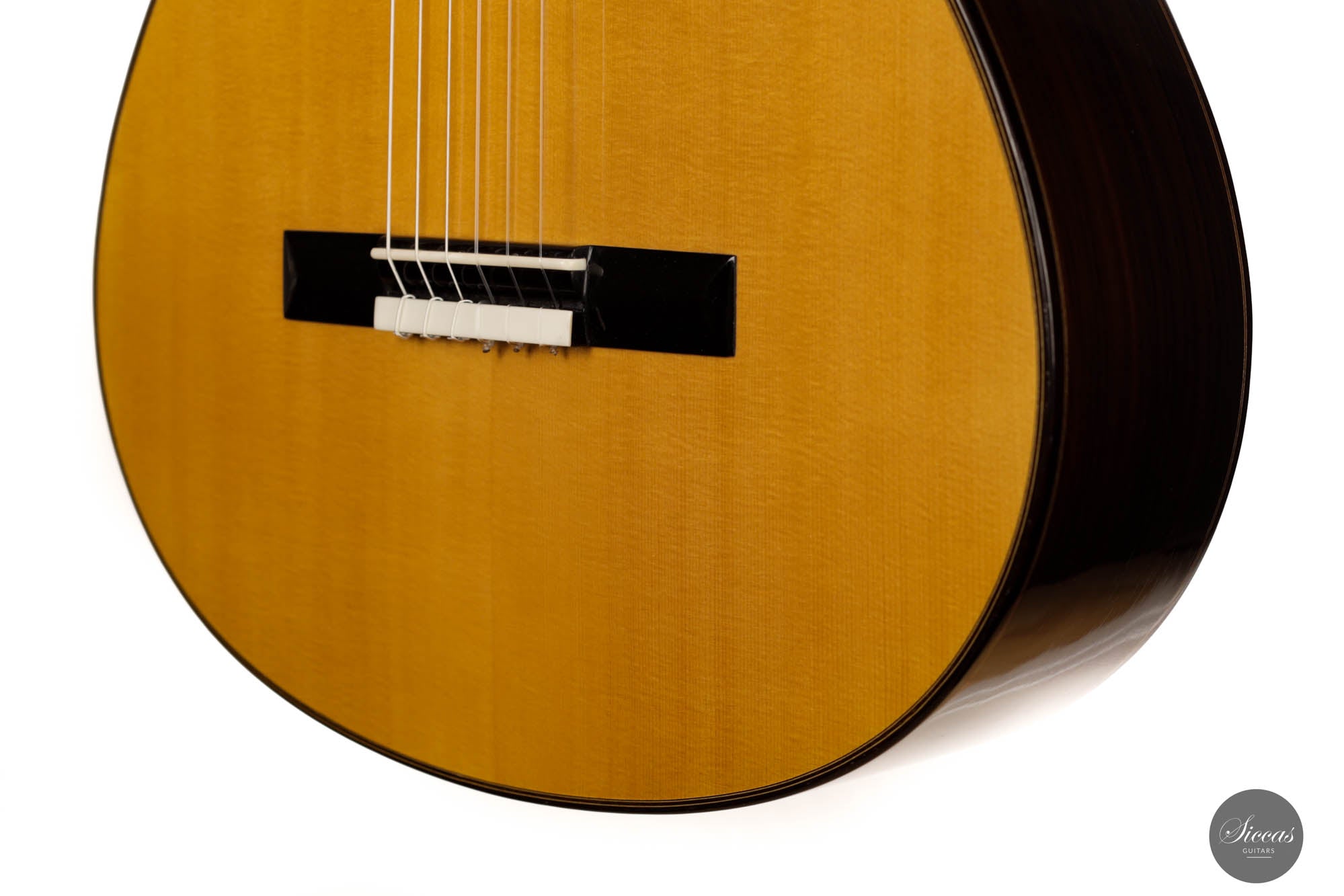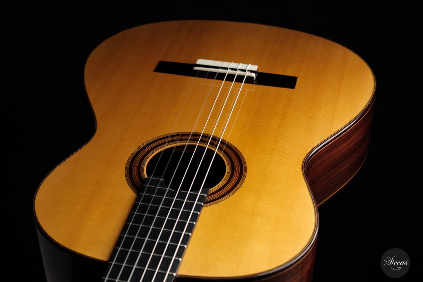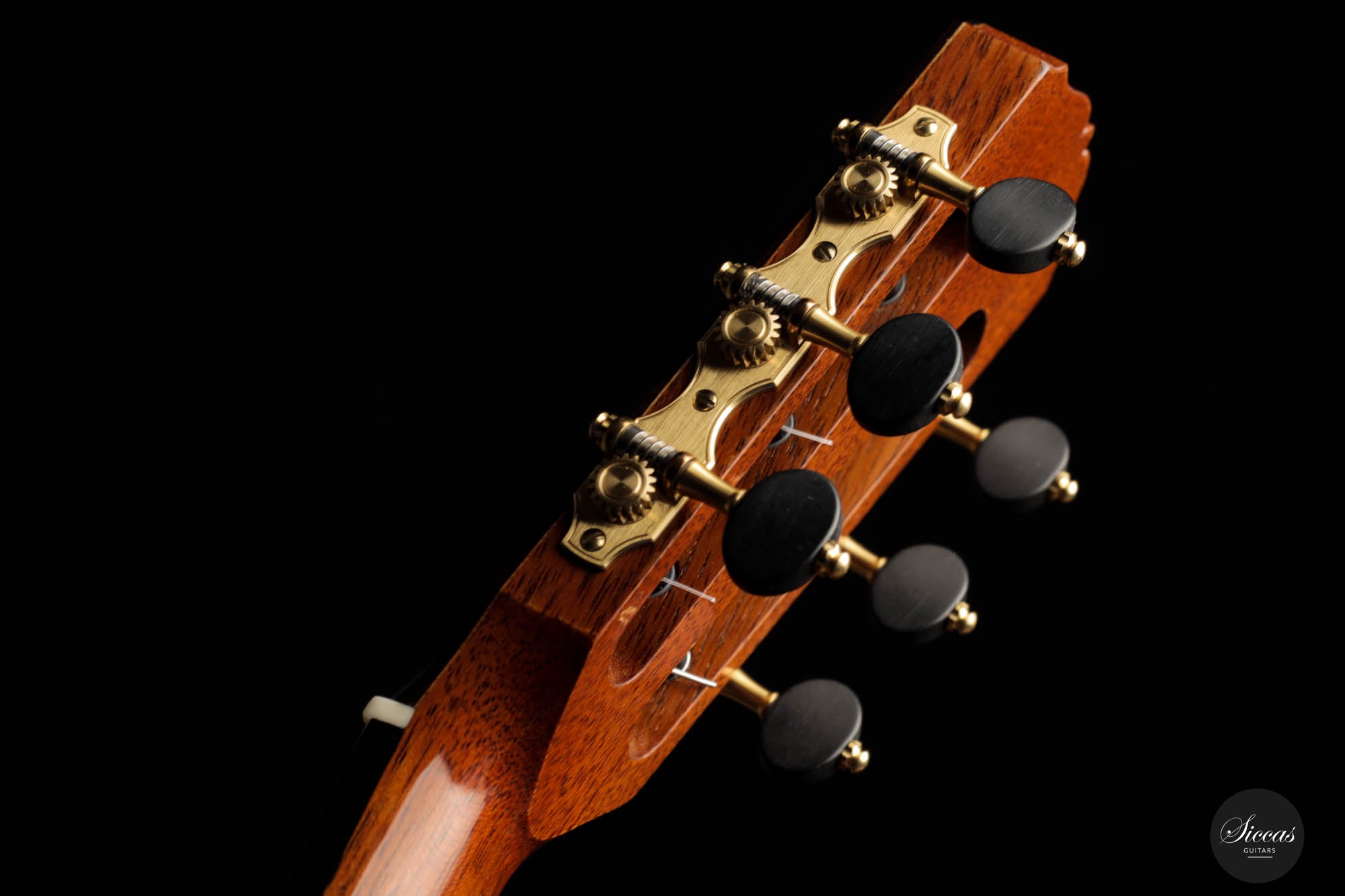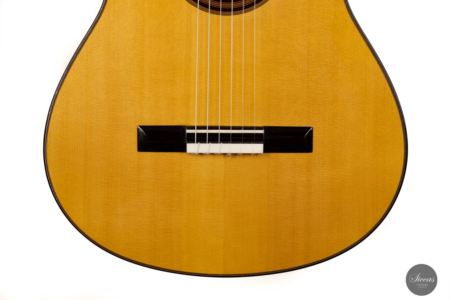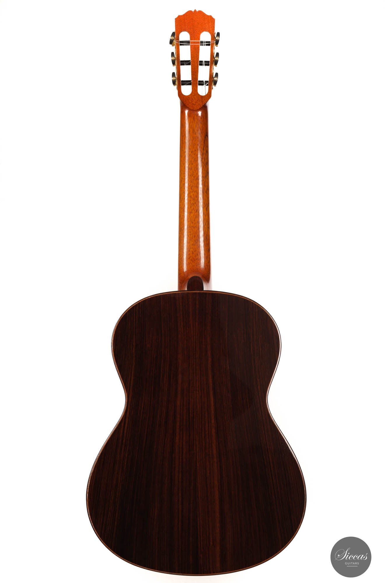 The 2023 Jost von Huene guitar combines traditional inspiration with refined modern craftsmanship. Built with a carefully aged spruce top and elegant purflings around the rosette, it reflects both visual sophistication and respect for the Torres and Arias heritage. Its light fan bracing, reinforced by two diagonal bars, creates a powerful projection while preserving sustain and tonal richness. The result is a sound that is expansive, smooth, and responsive, making the guitar both stable and inspiring to play. With its balance of elegance, clarity, and expressive depth, this instrument stands as an excellent example of Jost von Huene’s artistry.