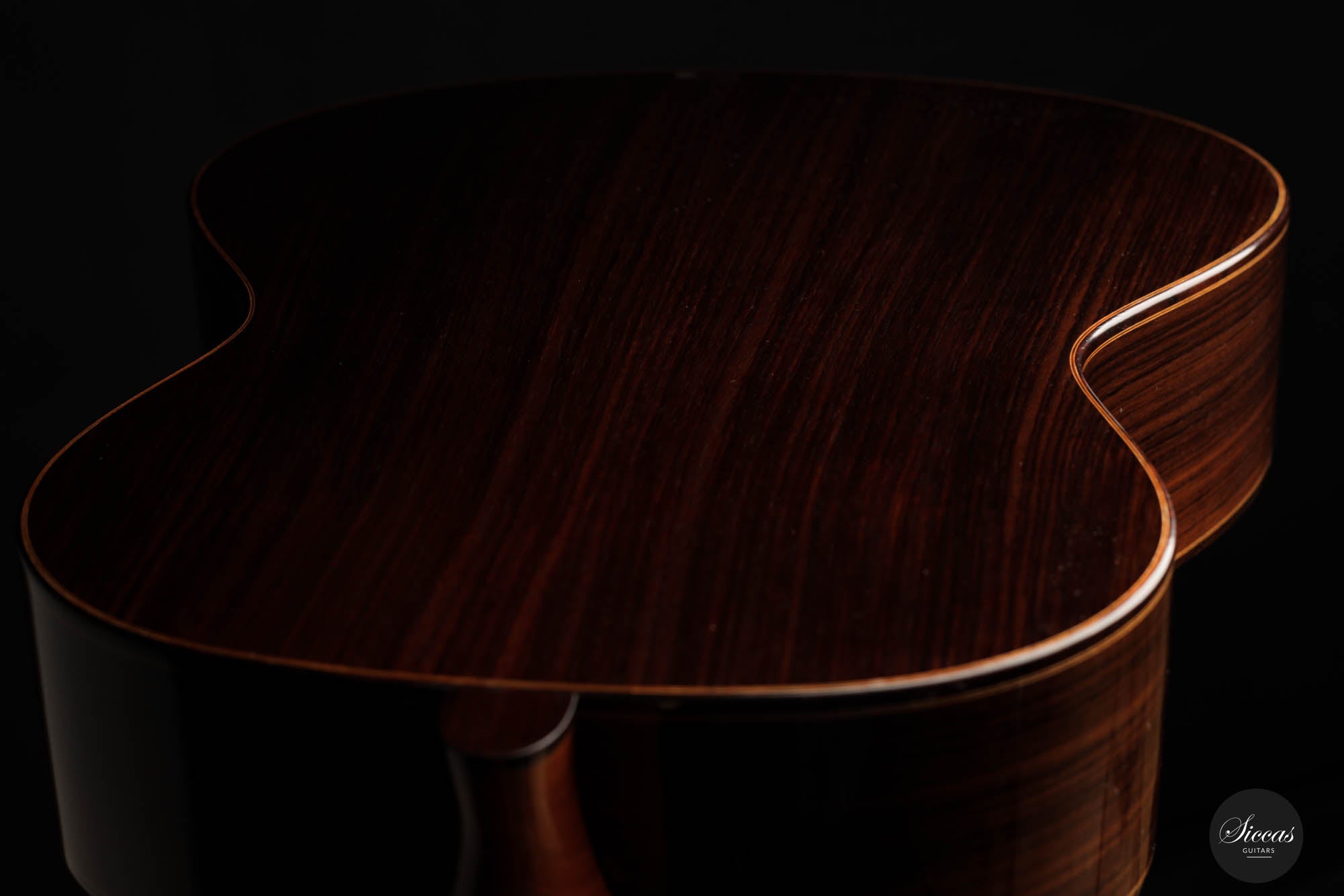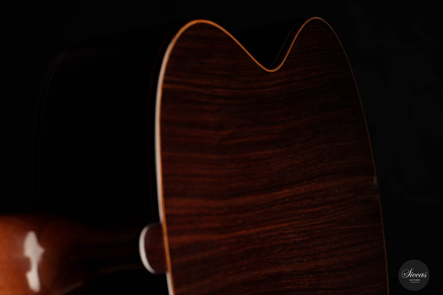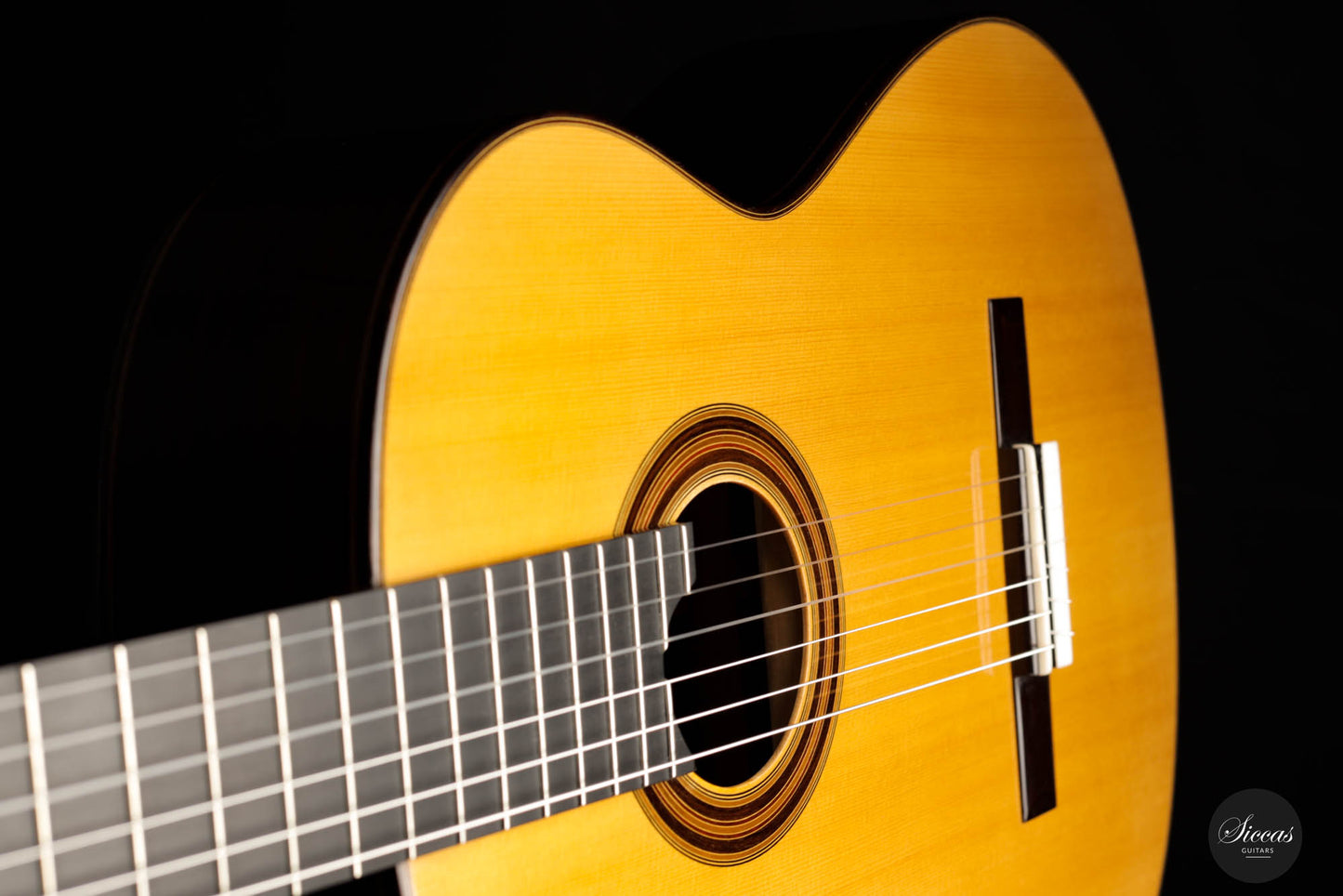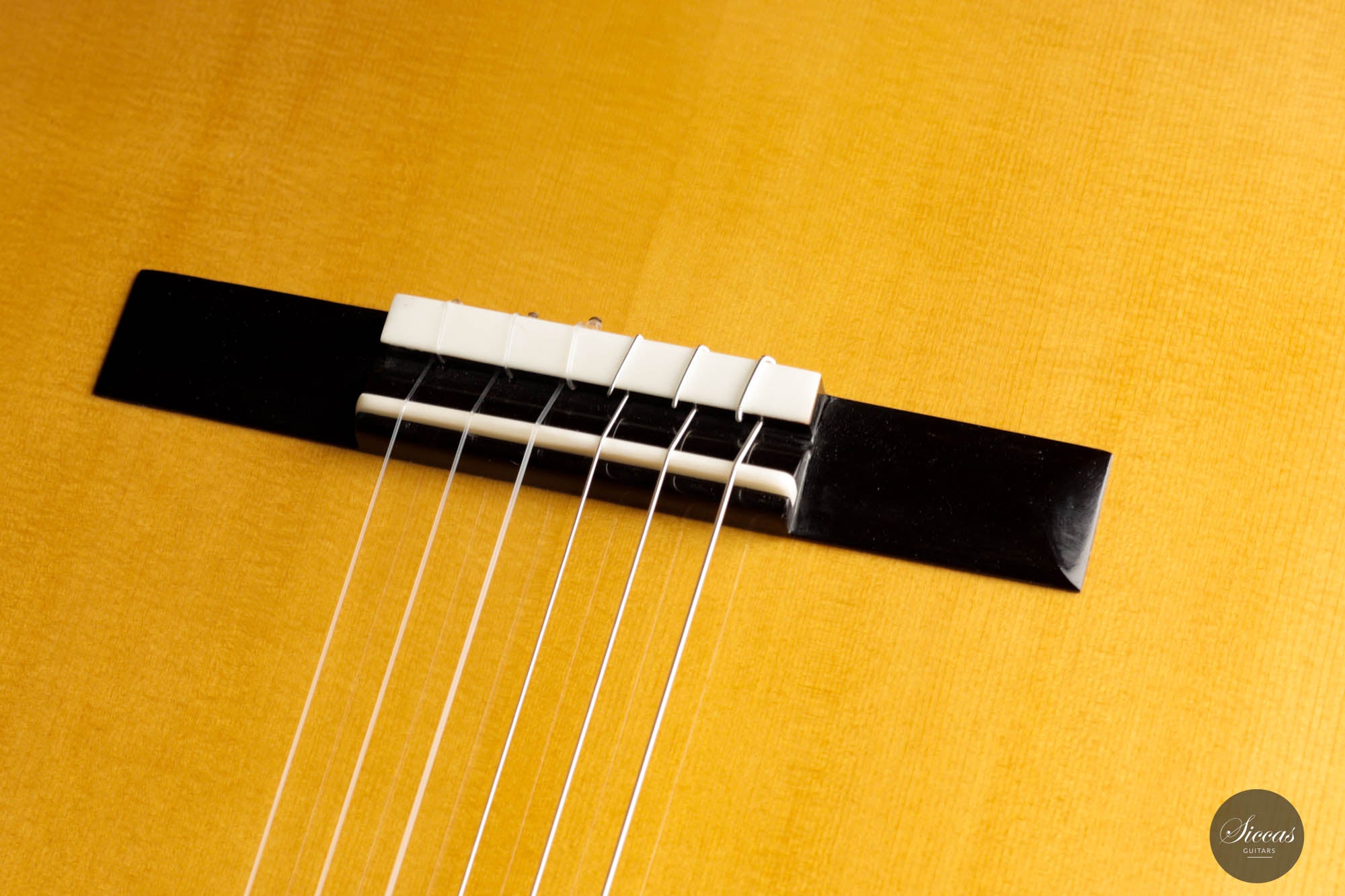 The 2023 Jost von Huene guitar combines traditional inspiration with refined modern craftsmanship. Built with a carefully aged spruce top and elegant purflings around the rosette, it reflects both visual sophistication and respect for the Torres and Arias heritage. Its light fan bracing, reinforced by two diagonal bars, creates a powerful projection while preserving sustain and tonal richness. The result is a sound that is expansive, smooth, and responsive, making the guitar both stable and inspiring to play. With its balance of elegance, clarity, and expressive depth, this instrument stands as an excellent example of Jost von Huene’s artistry.