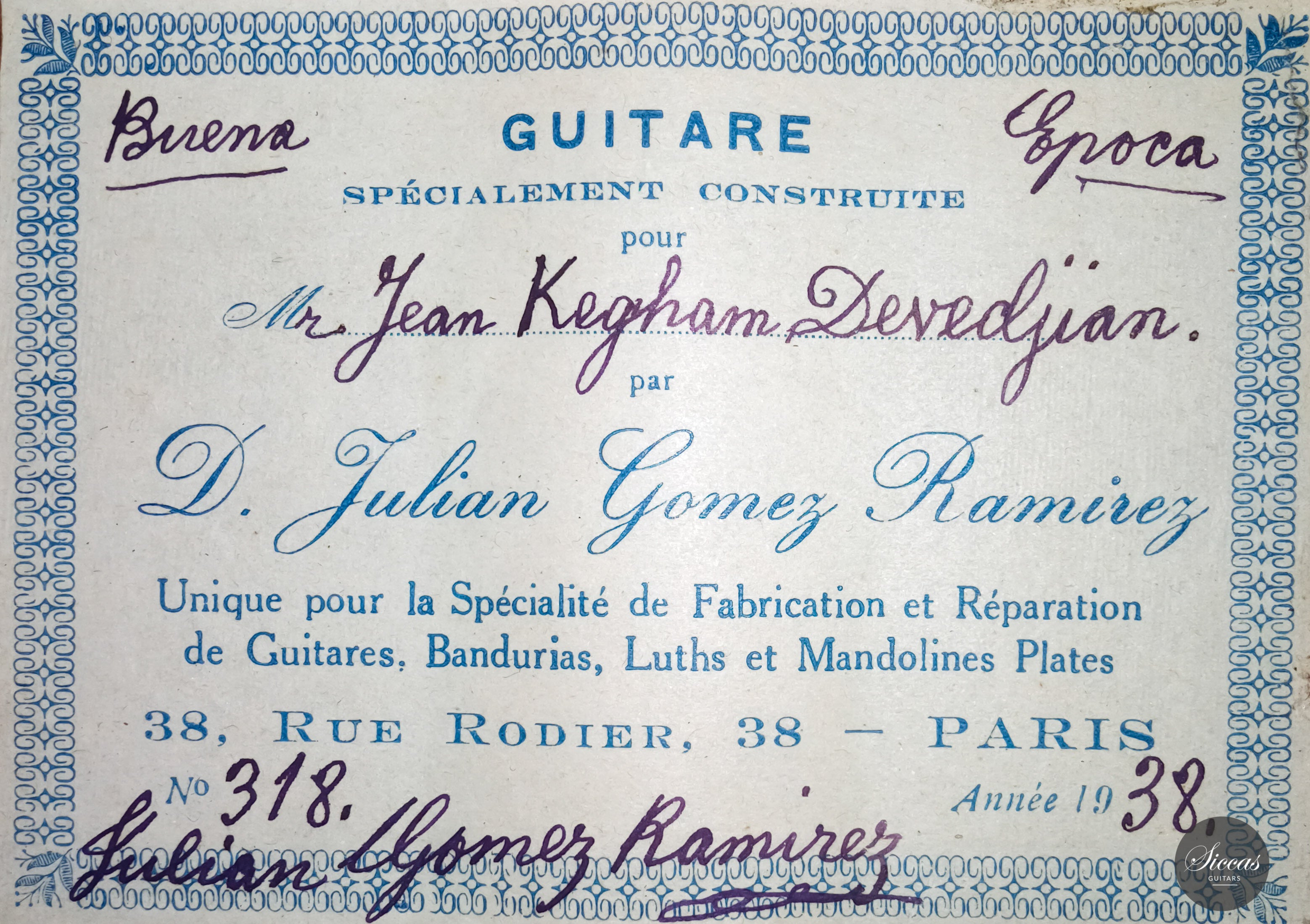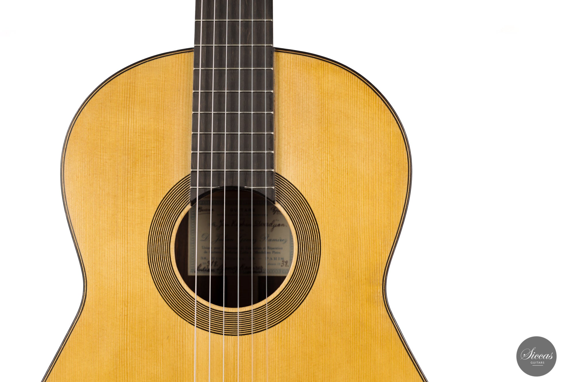 This wonderful Julian Gomez Ramirez guitar has a remarkable history. It was built in 1938 for Jean Kegham Devedjian and was owned by the Devejian family until recently. The family members themselves did not play the guitar and so it rested untouched in its case until lately. Therefore, this guitar is in exceptional condition. Because it has not seen daylight for decades and therefore has not reacted with UV light, the spruce top has a comparatively light color that is most likely very close to its original hue.