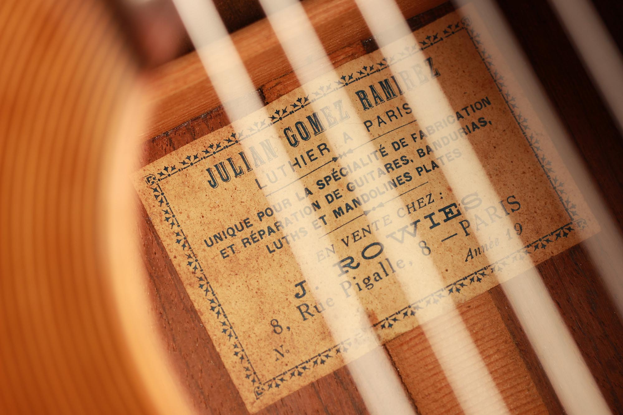 Julián Gómez Ramírez was born in Madrid in 1879. At the early age of 13, he started working in Augustín Andrés’ workshop. In 1910, Julián entered the workshop of José Ramirez I where he worked for four years. He finally moved to Paris in 1914, where he became the first representative of the Spanish guitar-making in France. This new way of building guitars was particularly appreciated as the Spanish fan-braced guitars were richer and more powerful than the small-bodied romantic guitars, whose popularity had decreased a lot with the immense success of the piano in the Parisian salons. In 1938, Robert Bouchet visited Julián Gómez Ramírez’ workshop as a customer. Quickly, the two men became friends and J. G. Ramirez taught R. Bouchet the art of the lutherie, founding the pillars of the French twentieth century school of guitar making.