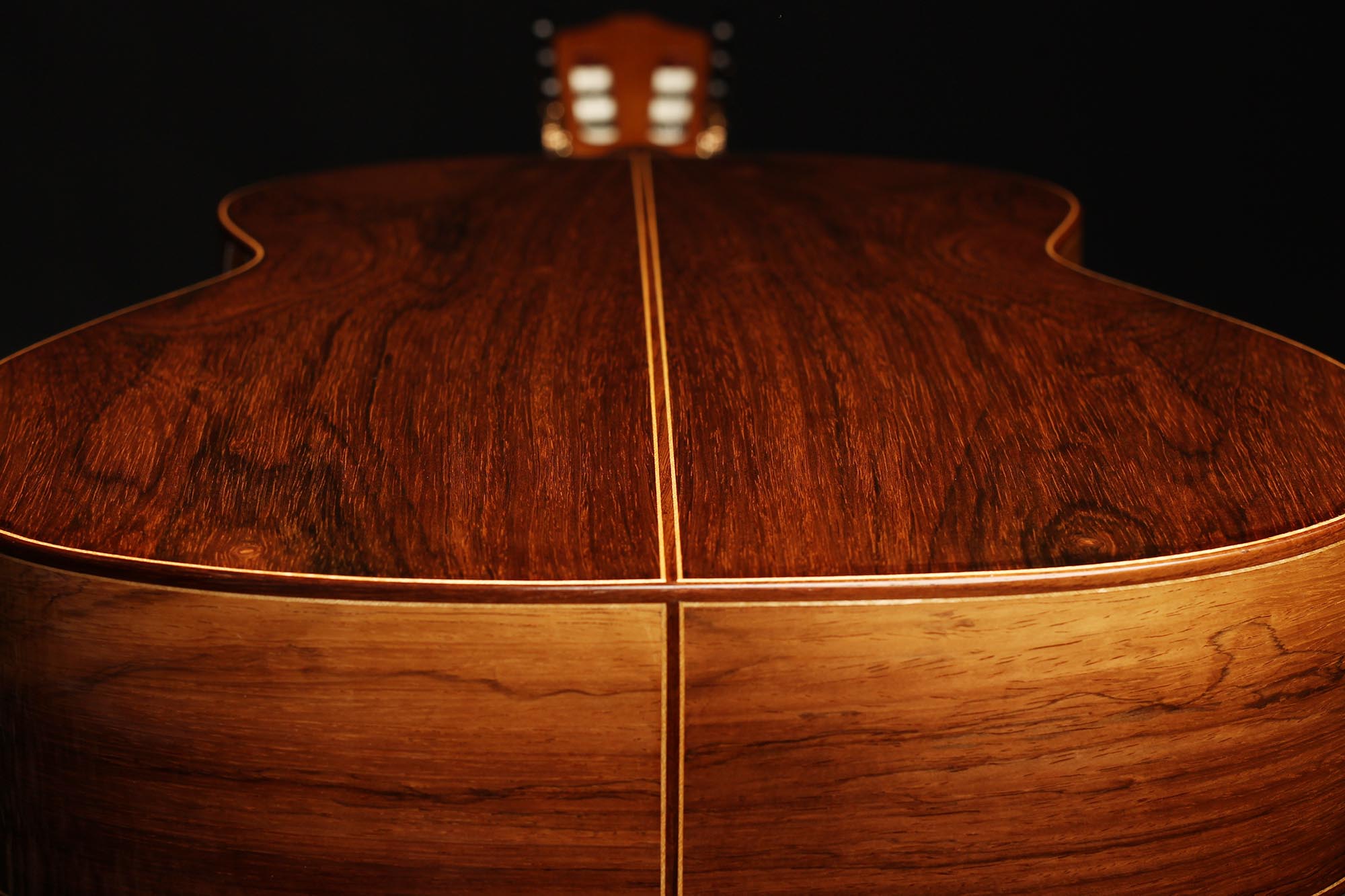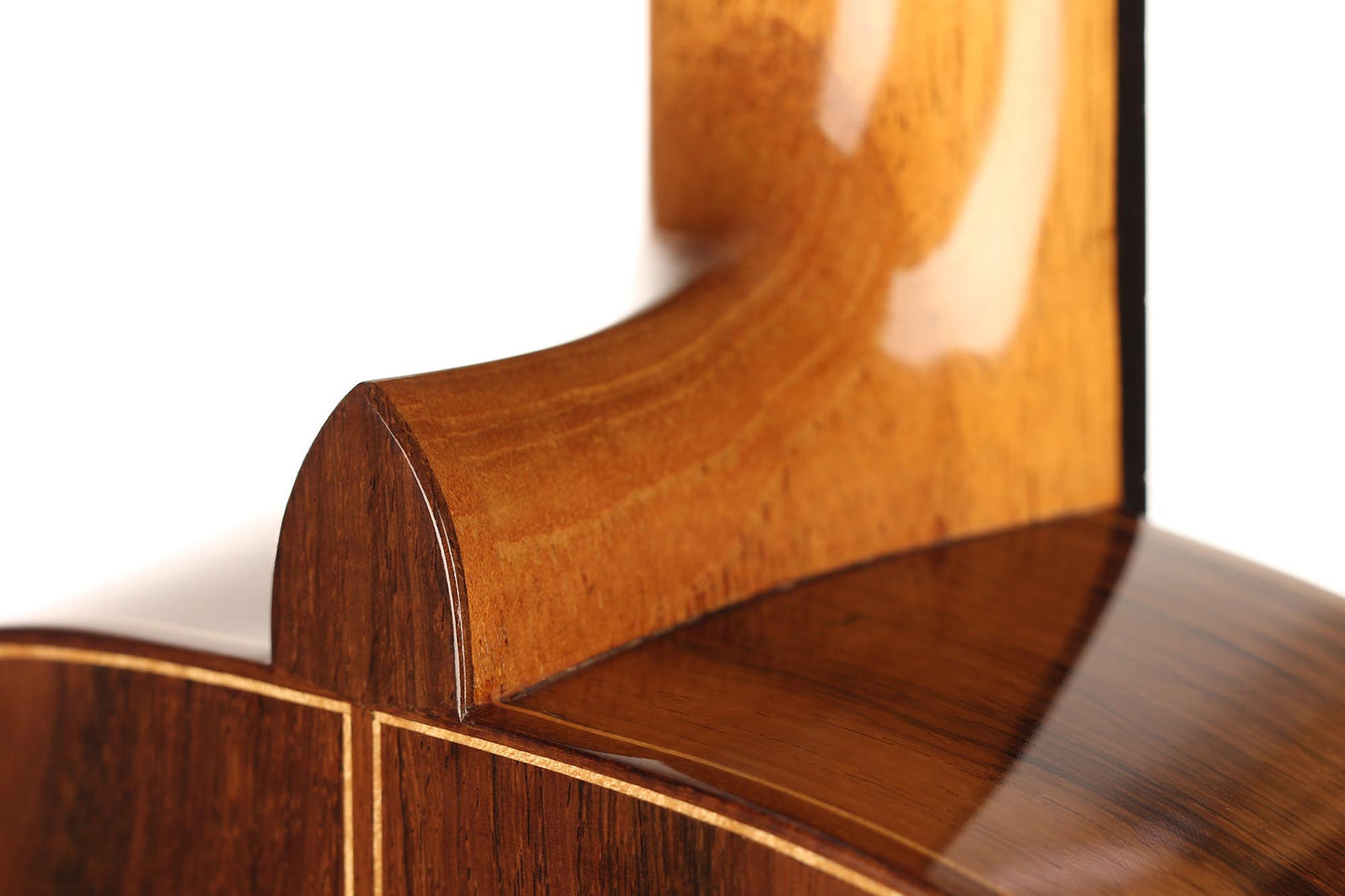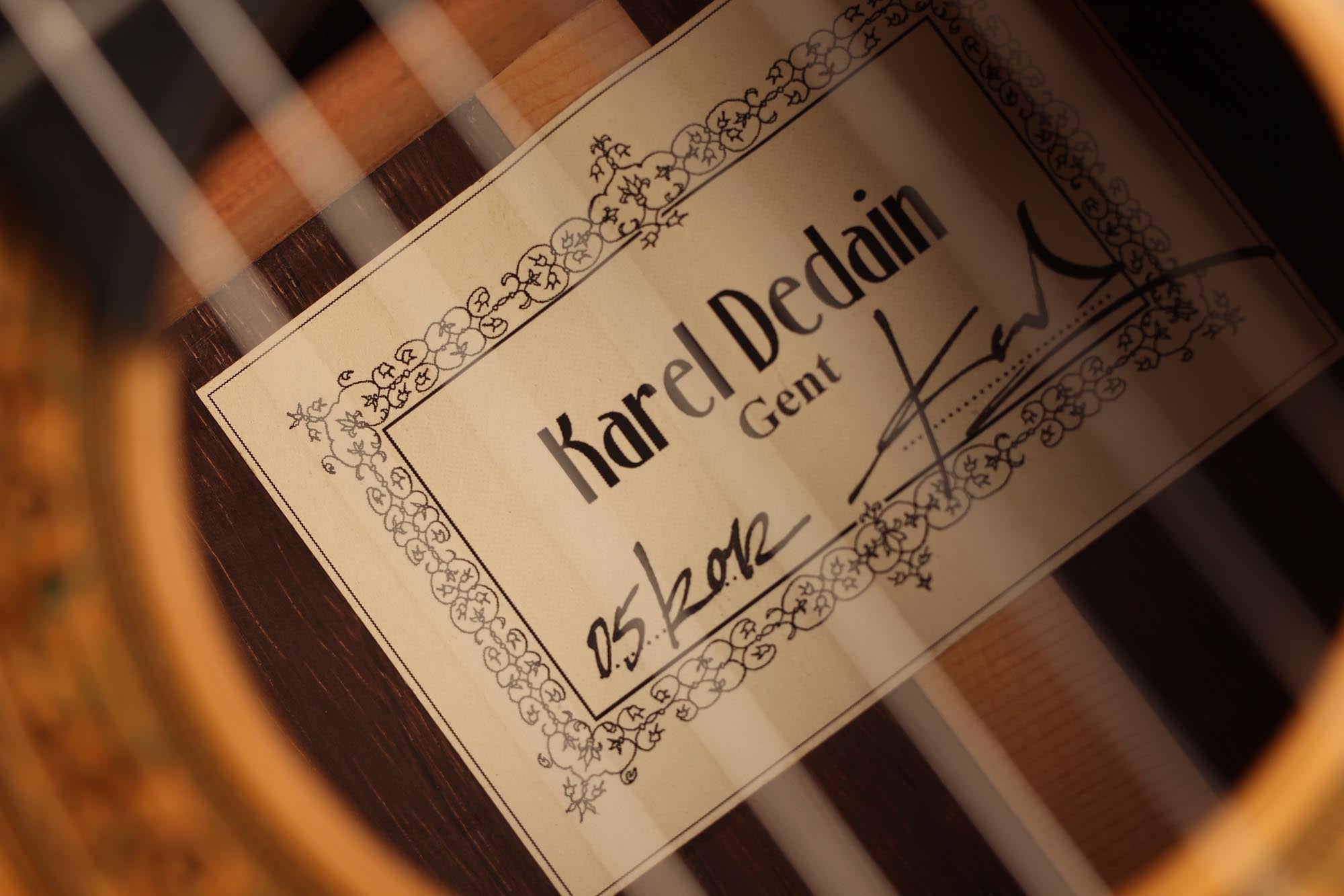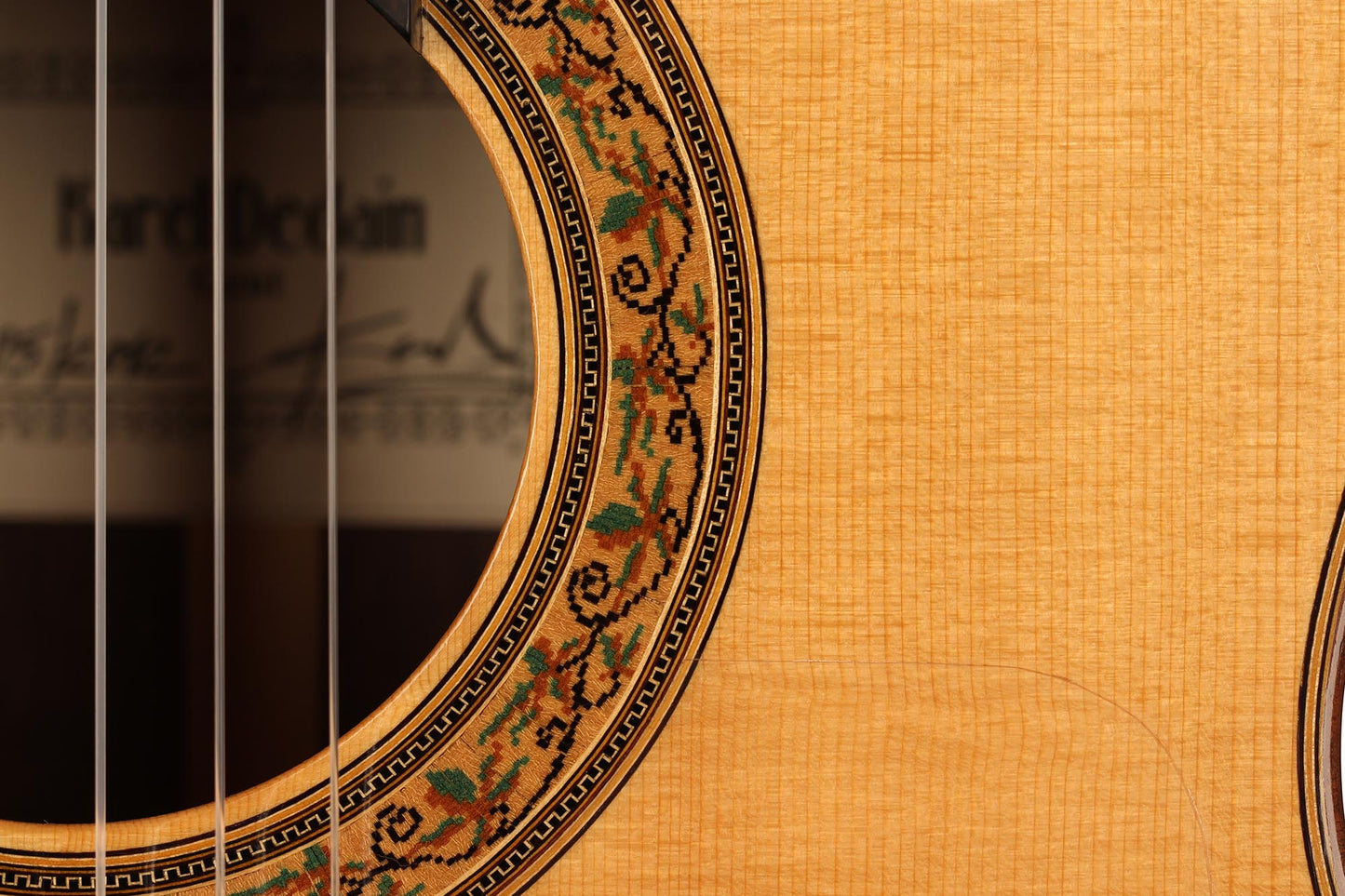 This beautiful flamenco guitar from 2012 is in excellent condition and only superficial marks of playing are visible on the top. The back is made of beautiful Amazonian rosewood, with wonderful colour contrasts on the sides. The top has developed an attractive honey-coloured complexion over the years and the transversal grain of the wood is clearly visible, which is proof of a perfect quarter cut. The floral patterns of the rosette on a pale background give the guitar's aesthetics a very Spanish accent and show the pronounced precision of Karel's work.