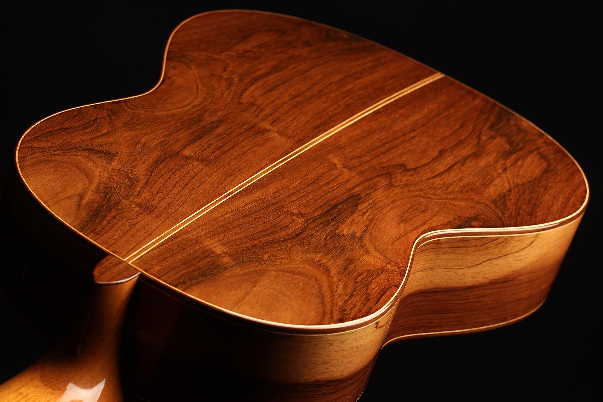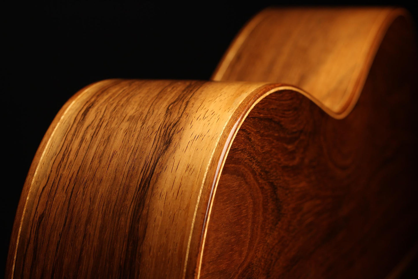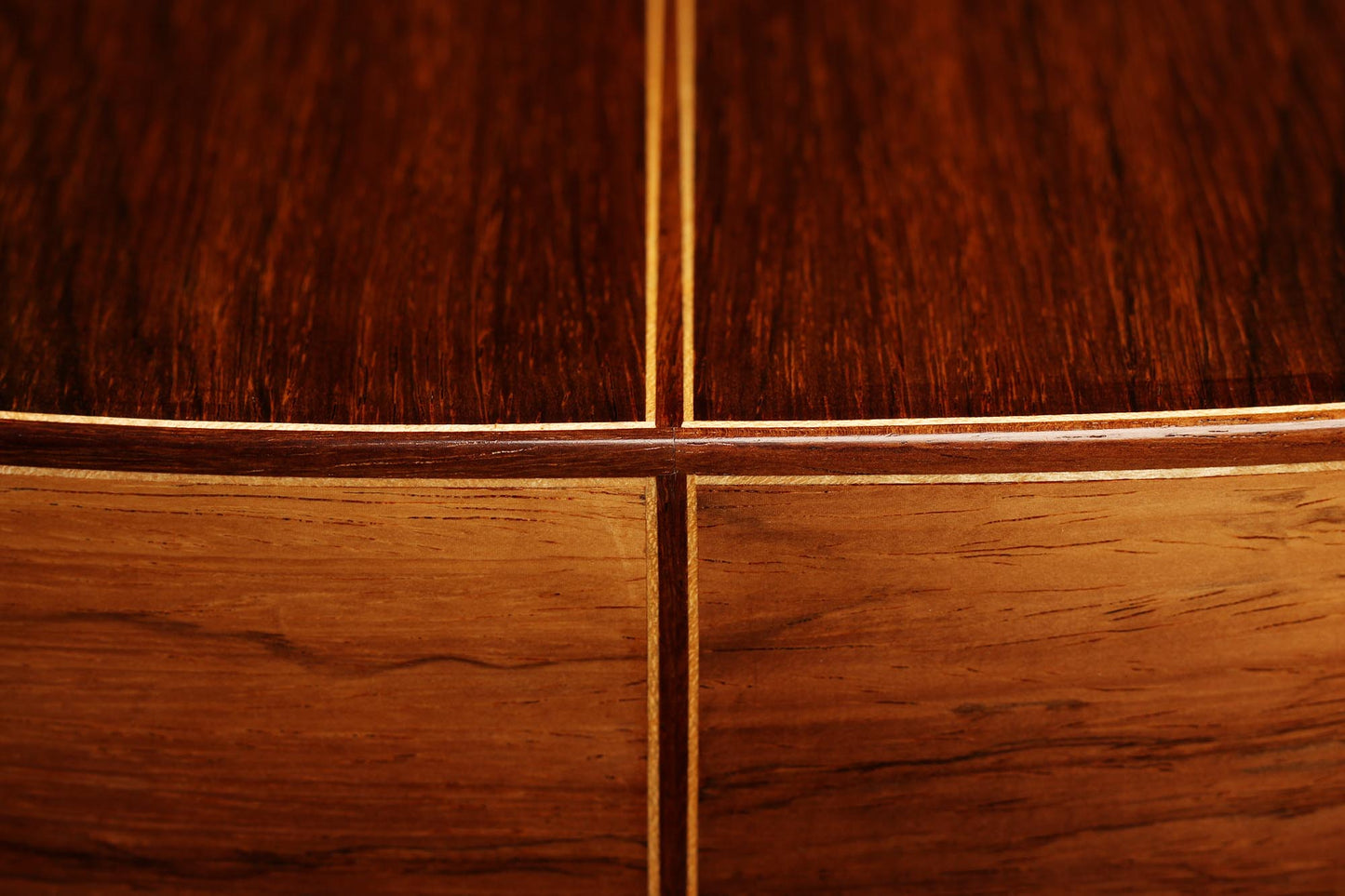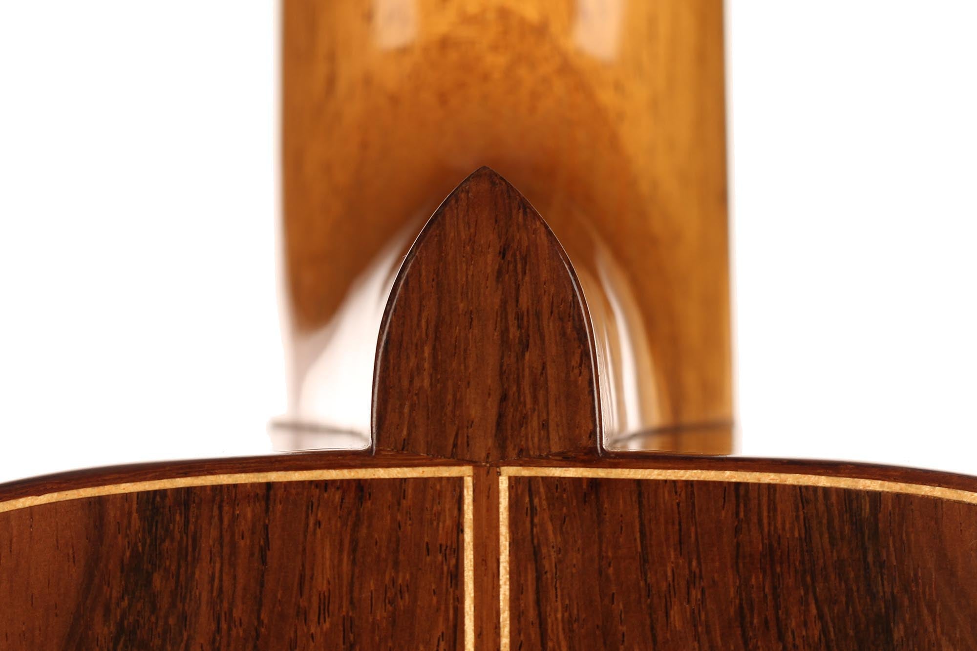 This beautiful flamenco guitar from 2012 is in excellent condition and only superficial marks of playing are visible on the top. The back is made of beautiful Amazonian rosewood, with wonderful colour contrasts on the sides. The top has developed an attractive honey-coloured complexion over the years and the transversal grain of the wood is clearly visible, which is proof of a perfect quarter cut. The floral patterns of the rosette on a pale background give the guitar's aesthetics a very Spanish accent and show the pronounced precision of Karel's work.