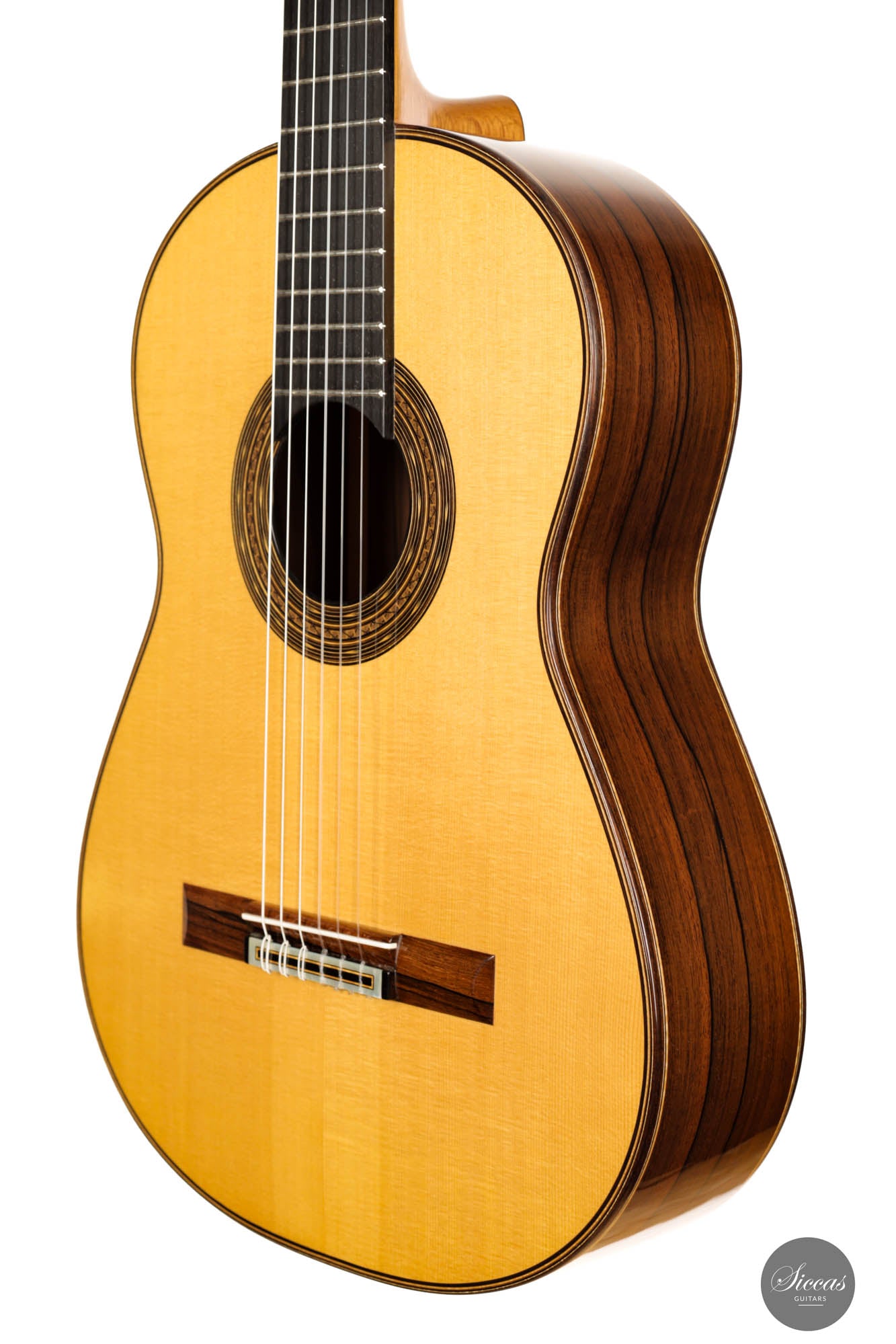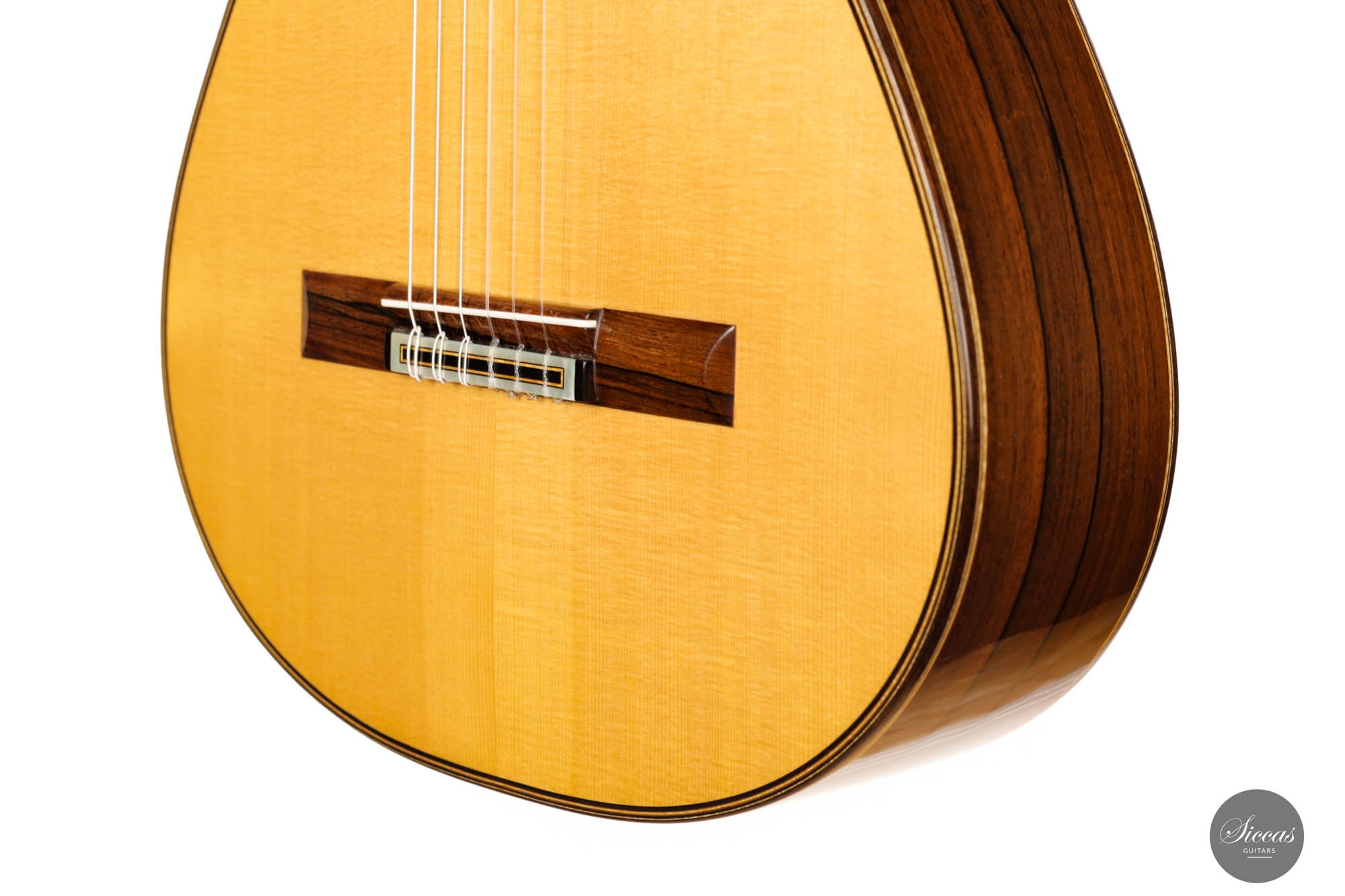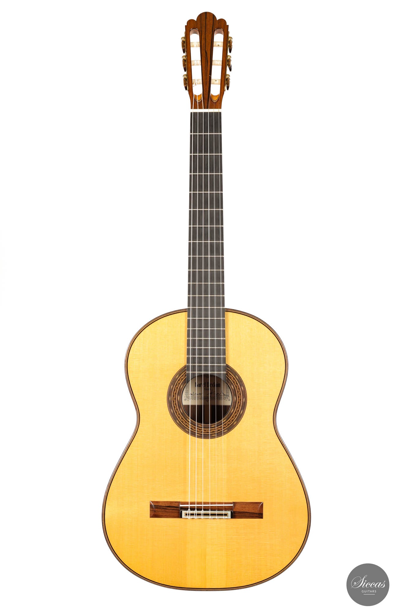 The 2015 Karel Dedain "Garcia" model guitar is a testament to masterful craftsmanship and exceptional tonal quality. Karel has meticulously selected the finest spruce for its soundboard, which perfectly complements the visually arresting Madagascar that graces the guitar's back and sides. Despite its deceptively compact body, this guitar possesses a powerhouse of sound, delivering a resounding volume that belies its size. However, volume isn’t its only strength; the "Garcia" boasts a rich and varied tonal spectrum that effortlessly captures and enhances the nuances of any musical piece. The guitarist's tonal imagination is the only limit to what this instrument can achieve. Maintained in impeccable condition, it bears only a few nail marks, a minor testament to its history and usage. Indeed, it is not just a guitar but a sonic art.