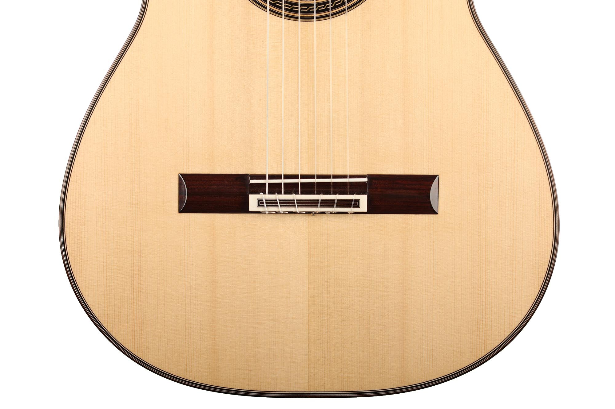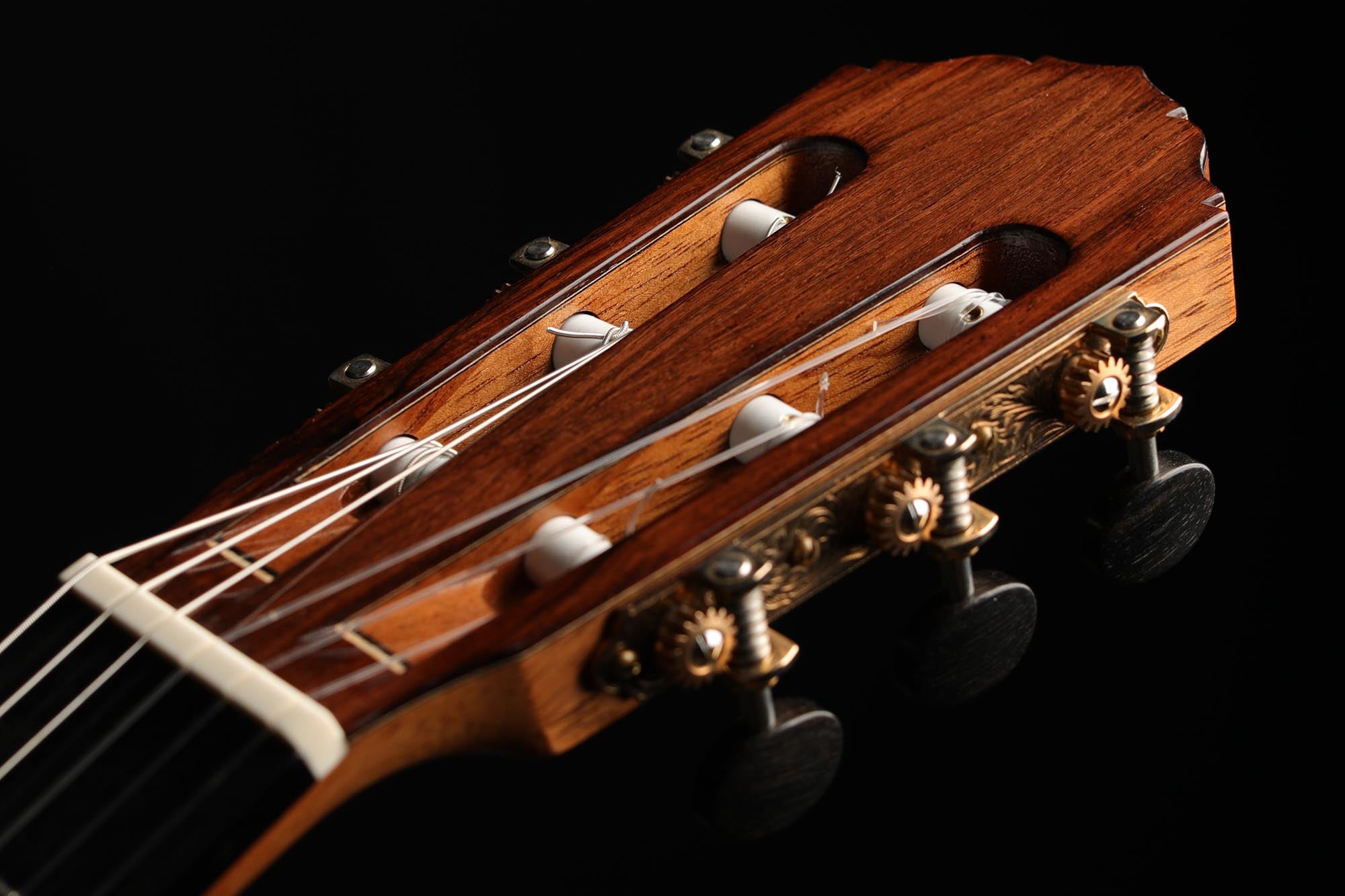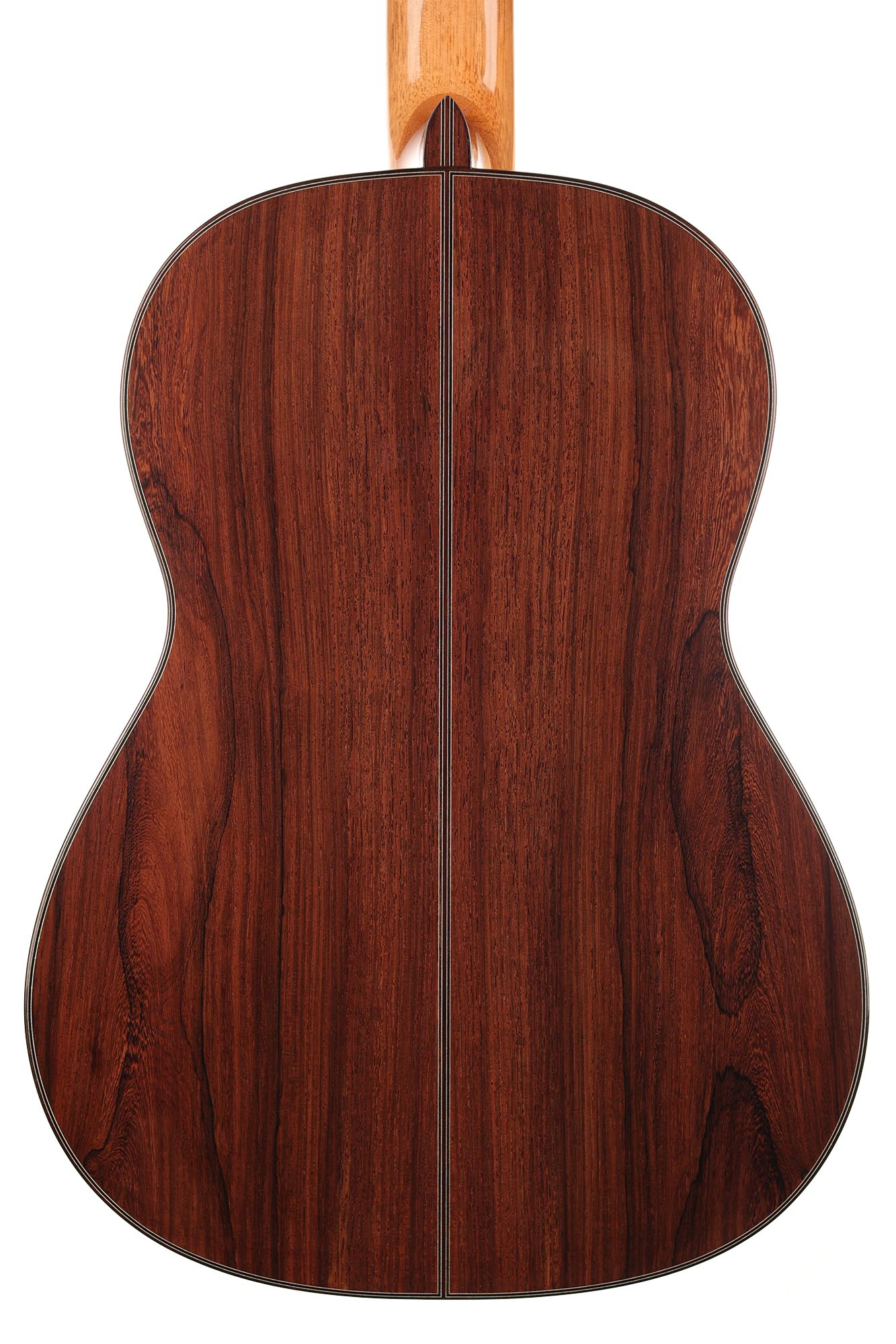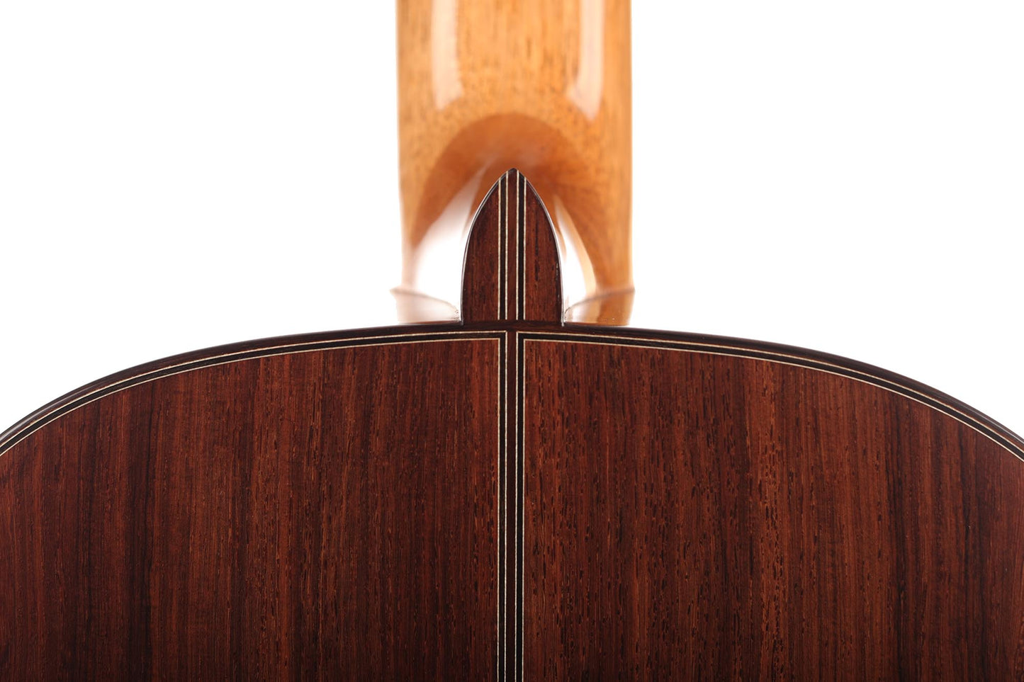 This guitar, built in 2020 especially for Siccas Guitars, has a lot of unique and exciting features. Together with Karel we aimed to create an instrument that combines excellent playability with a rich, powerful and traditional sound. As a result, this guitar has a 64 cm scale length, which provides a comfortable playing feel for the left hand, and a slightly raised fingerboard, which makes playing in the high registers more comfortable.The top is made of the highest quality Italian spruce and has a 7-fan bracing with a very thin transverse bar, a so-called "Barre d'âme", a construction element adopted from the famous luthier Robert Bouchet. For the back and sides, Karel has also used an excellent rosewood from Madagascar. The latter has a fine and distinct grain, which gives this guitar a unique look and personality. As always, Karel's work is flawless.