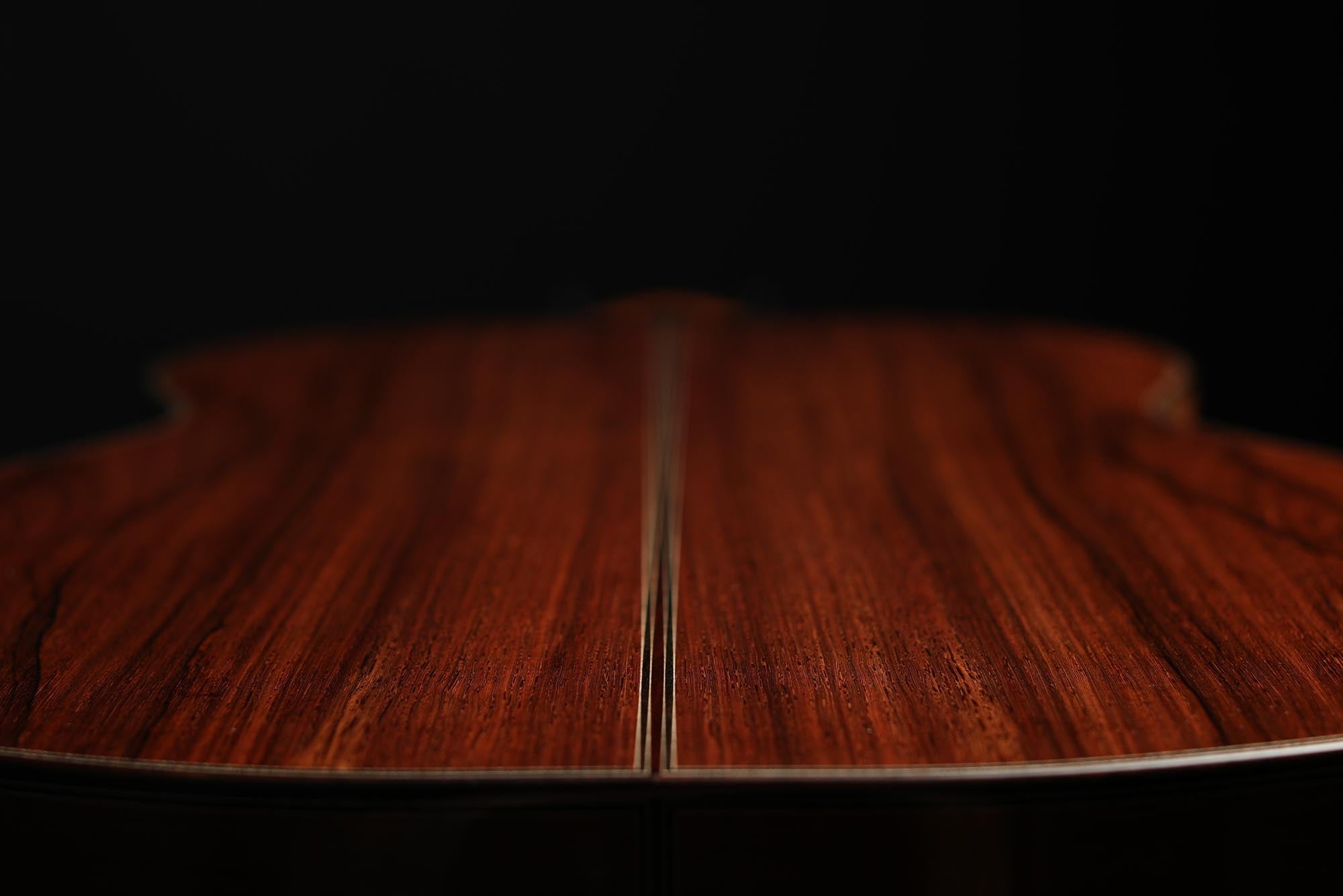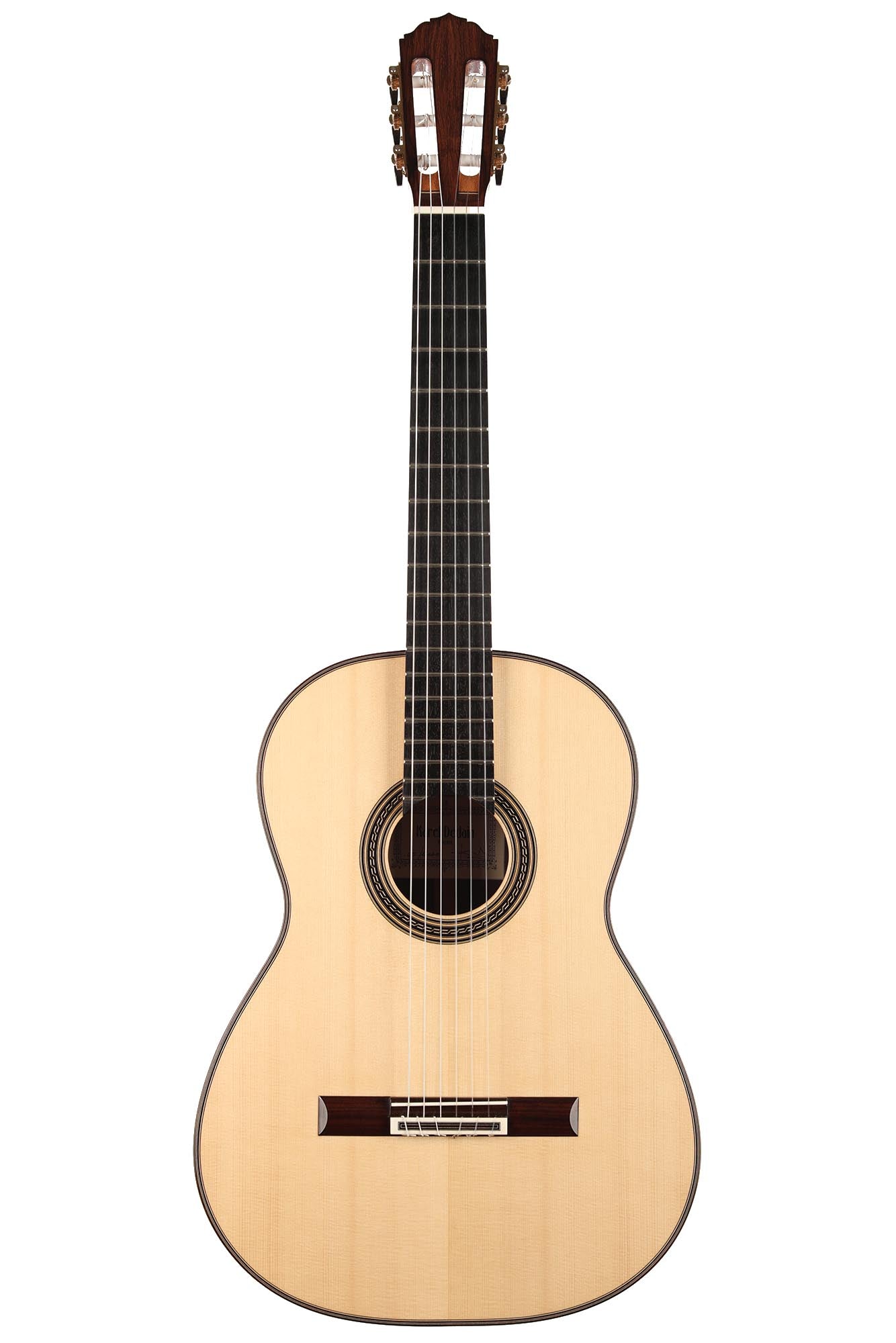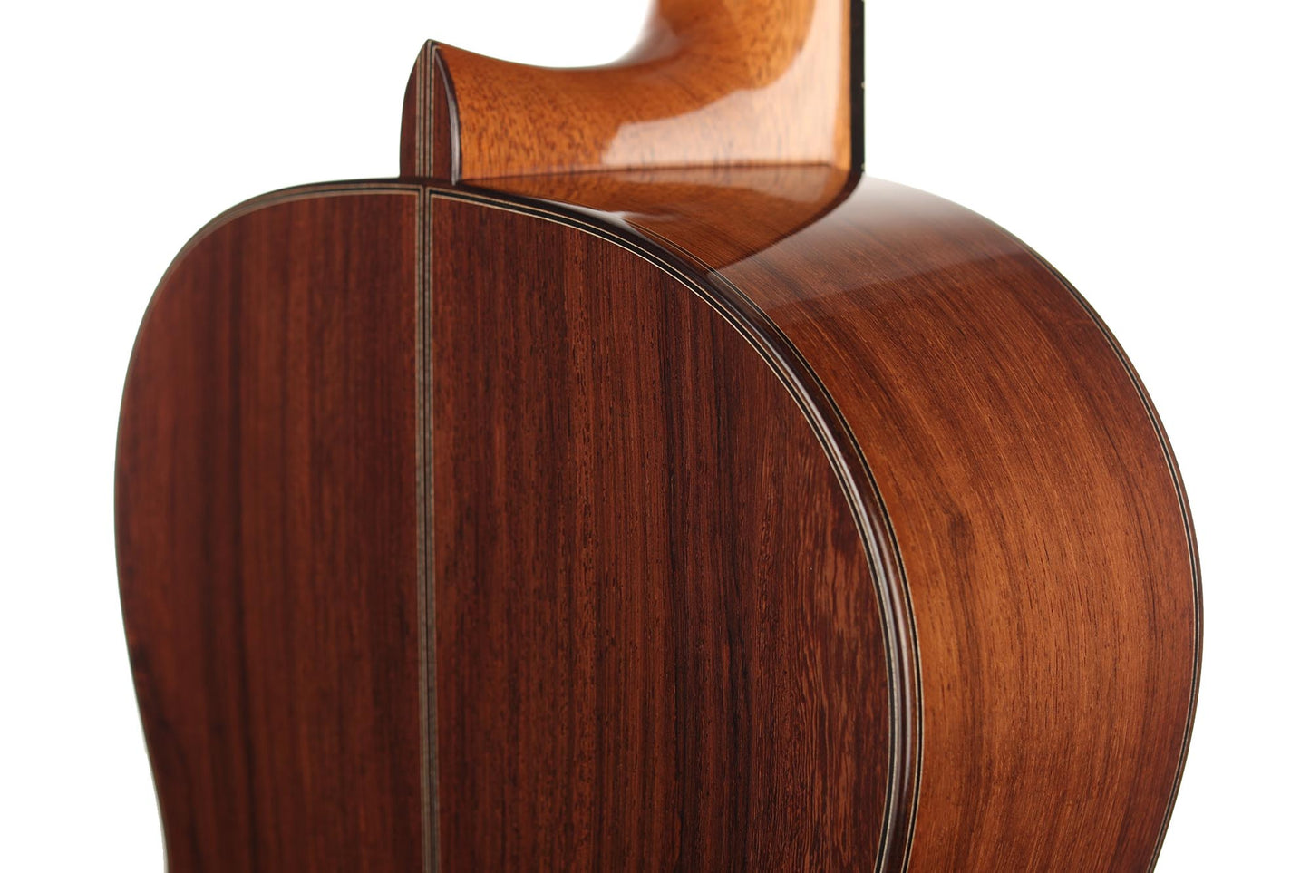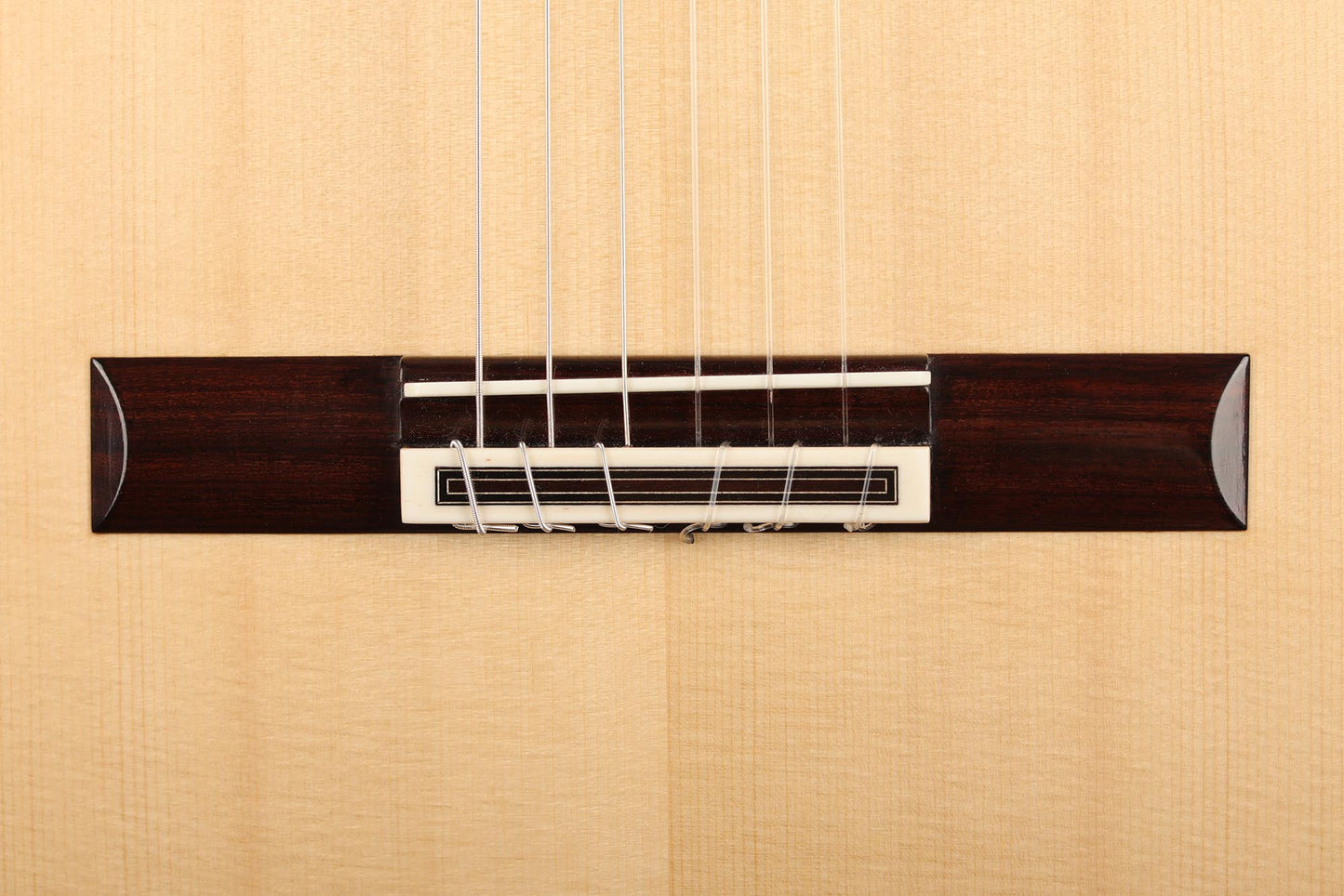 This guitar, built in 2020 especially for Siccas Guitars, has a lot of unique and exciting features. Together with Karel we aimed to create an instrument that combines excellent playability with a rich, powerful and traditional sound. As a result, this guitar has a 64 cm scale length, which provides a comfortable playing feel for the left hand, and a slightly raised fingerboard, which makes playing in the high registers more comfortable.The top is made of the highest quality Italian spruce and has a 7-fan bracing with a very thin transverse bar, a so-called "Barre d'âme", a construction element adopted from the famous luthier Robert Bouchet. For the back and sides, Karel has also used an excellent rosewood from Madagascar. The latter has a fine and distinct grain, which gives this guitar a unique look and personality. As always, Karel's work is flawless.