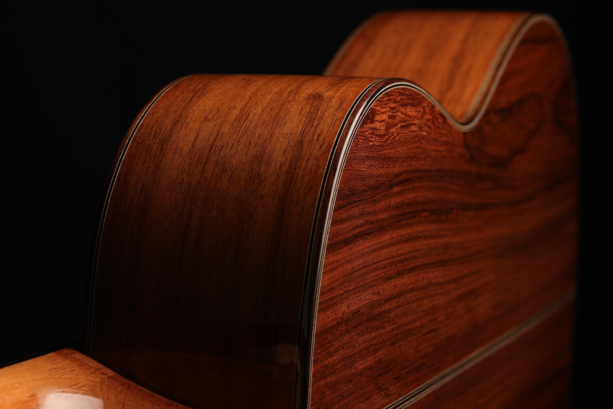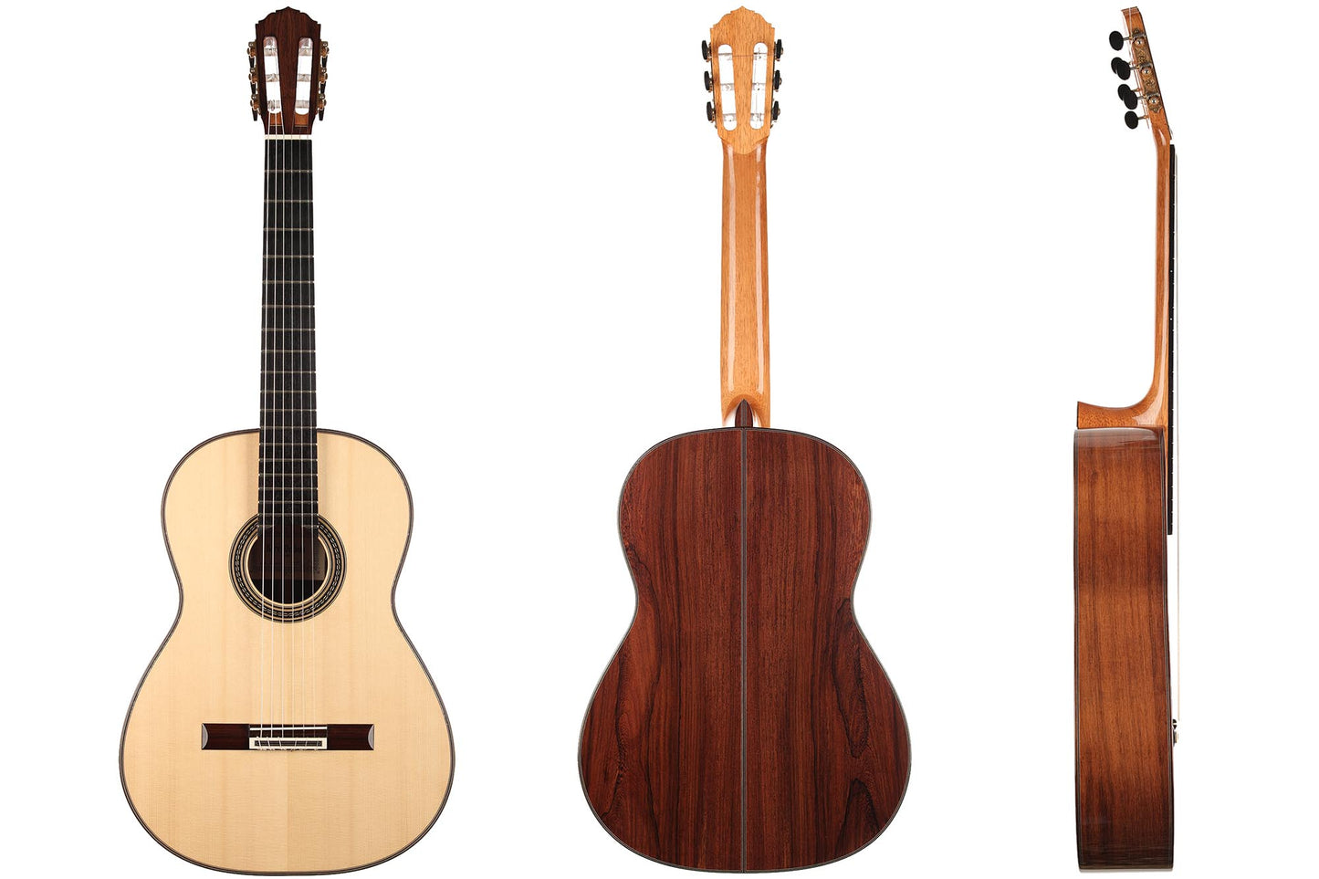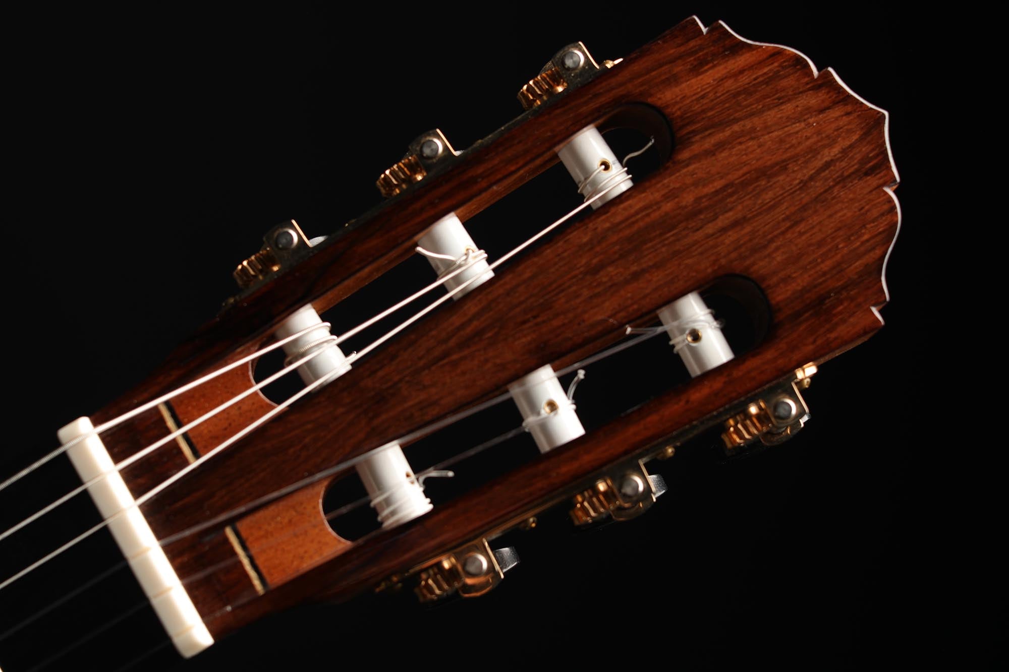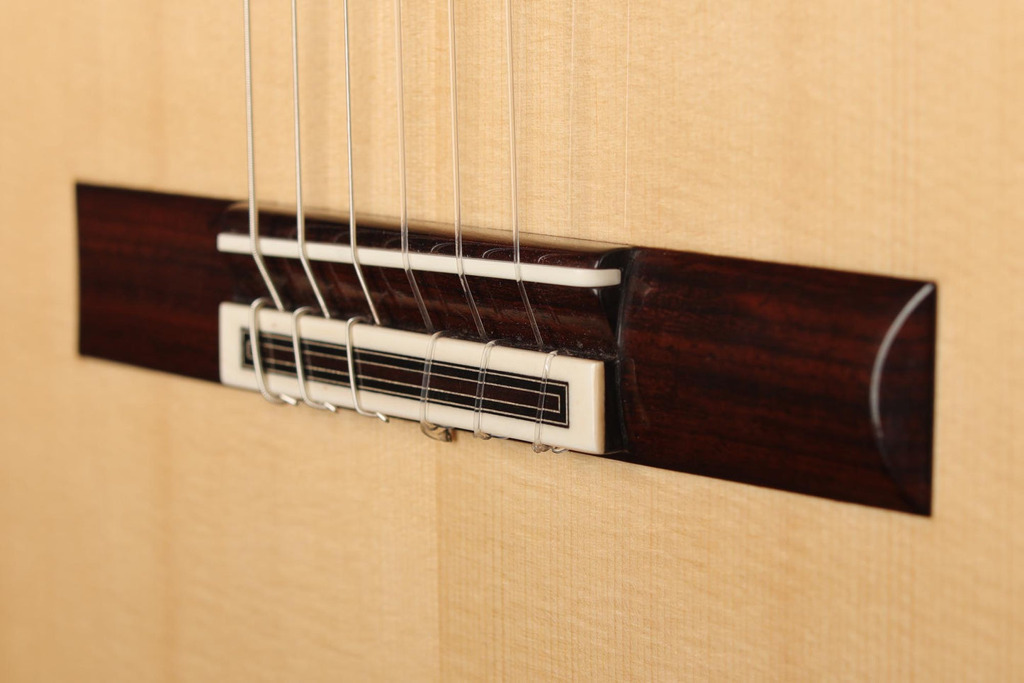 This guitar, built in 2020 especially for Siccas Guitars, has a lot of unique and exciting features. Together with Karel we aimed to create an instrument that combines excellent playability with a rich, powerful and traditional sound. As a result, this guitar has a 64 cm scale length, which provides a comfortable playing feel for the left hand, and a slightly raised fingerboard, which makes playing in the high registers more comfortable.The top is made of the highest quality Italian spruce and has a 7-fan bracing with a very thin transverse bar, a so-called "Barre d'âme", a construction element adopted from the famous luthier Robert Bouchet. For the back and sides, Karel has also used an excellent rosewood from Madagascar. The latter has a fine and distinct grain, which gives this guitar a unique look and personality. As always, Karel's work is flawless.