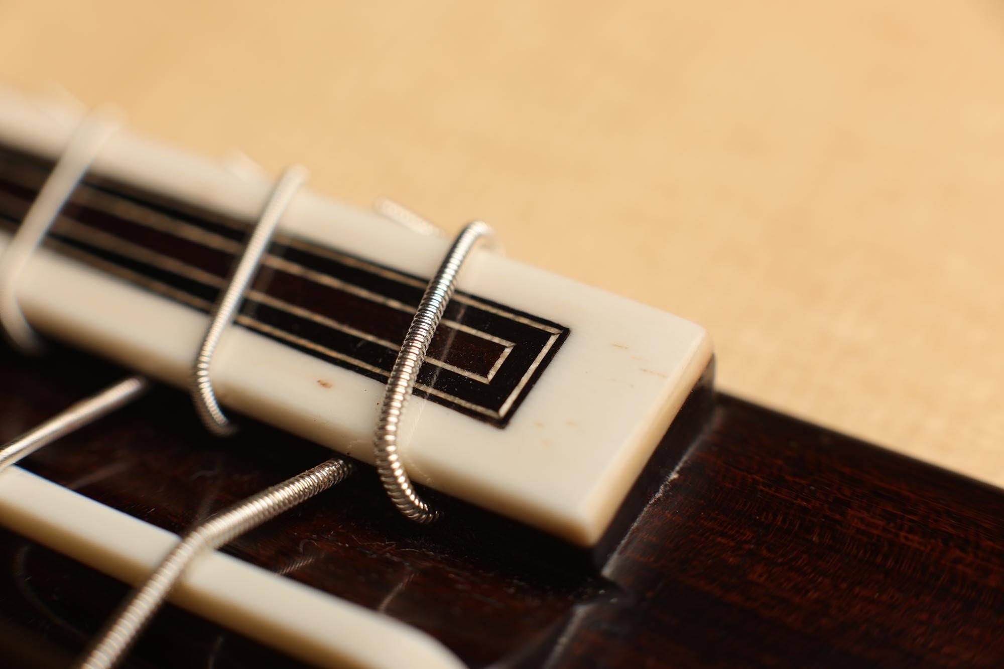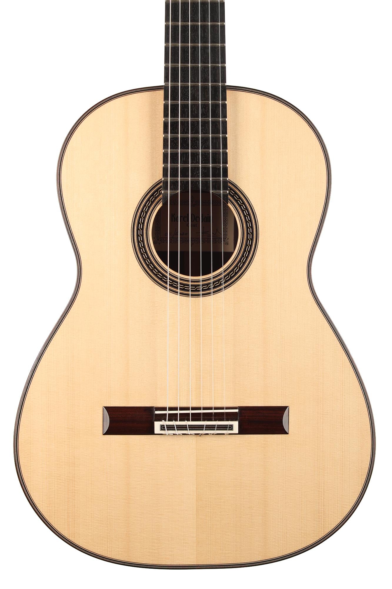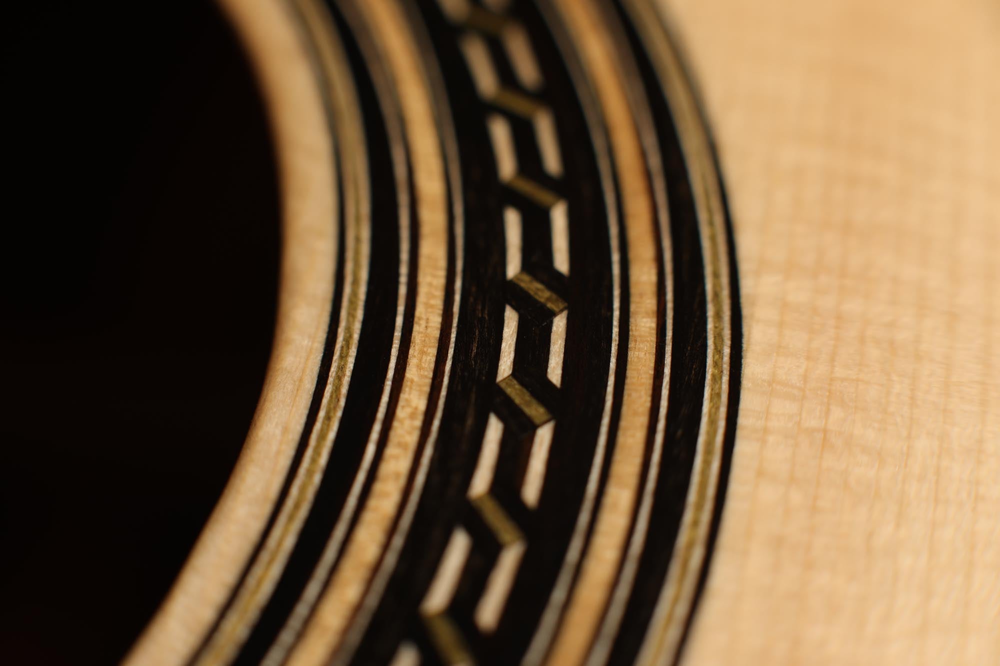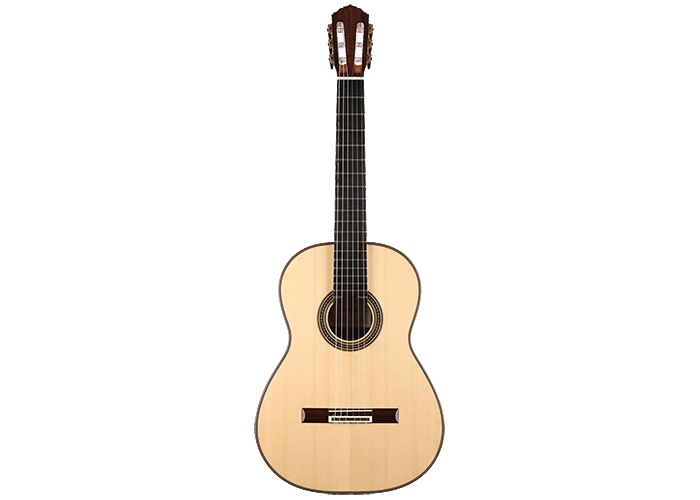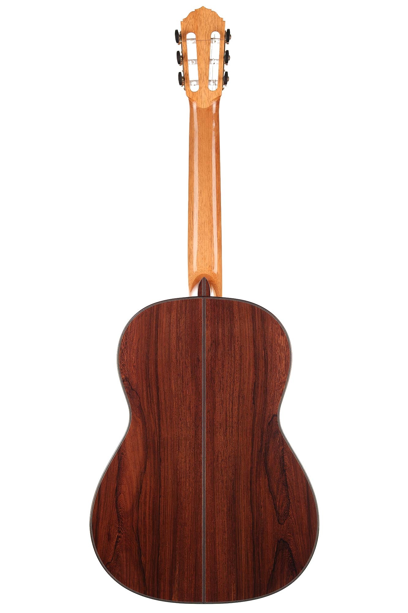 This guitar, built in 2020 especially for Siccas Guitars, has a lot of unique and exciting features. Together with Karel we aimed to create an instrument that combines excellent playability with a rich, powerful and traditional sound. As a result, this guitar has a 64 cm scale length, which provides a comfortable playing feel for the left hand, and a slightly raised fingerboard, which makes playing in the high registers more comfortable.The top is made of the highest quality Italian spruce and has a 7-fan bracing with a very thin transverse bar, a so-called "Barre d'âme", a construction element adopted from the famous luthier Robert Bouchet. For the back and sides, Karel has also used an excellent rosewood from Madagascar. The latter has a fine and distinct grain, which gives this guitar a unique look and personality. As always, Karel's work is flawless.