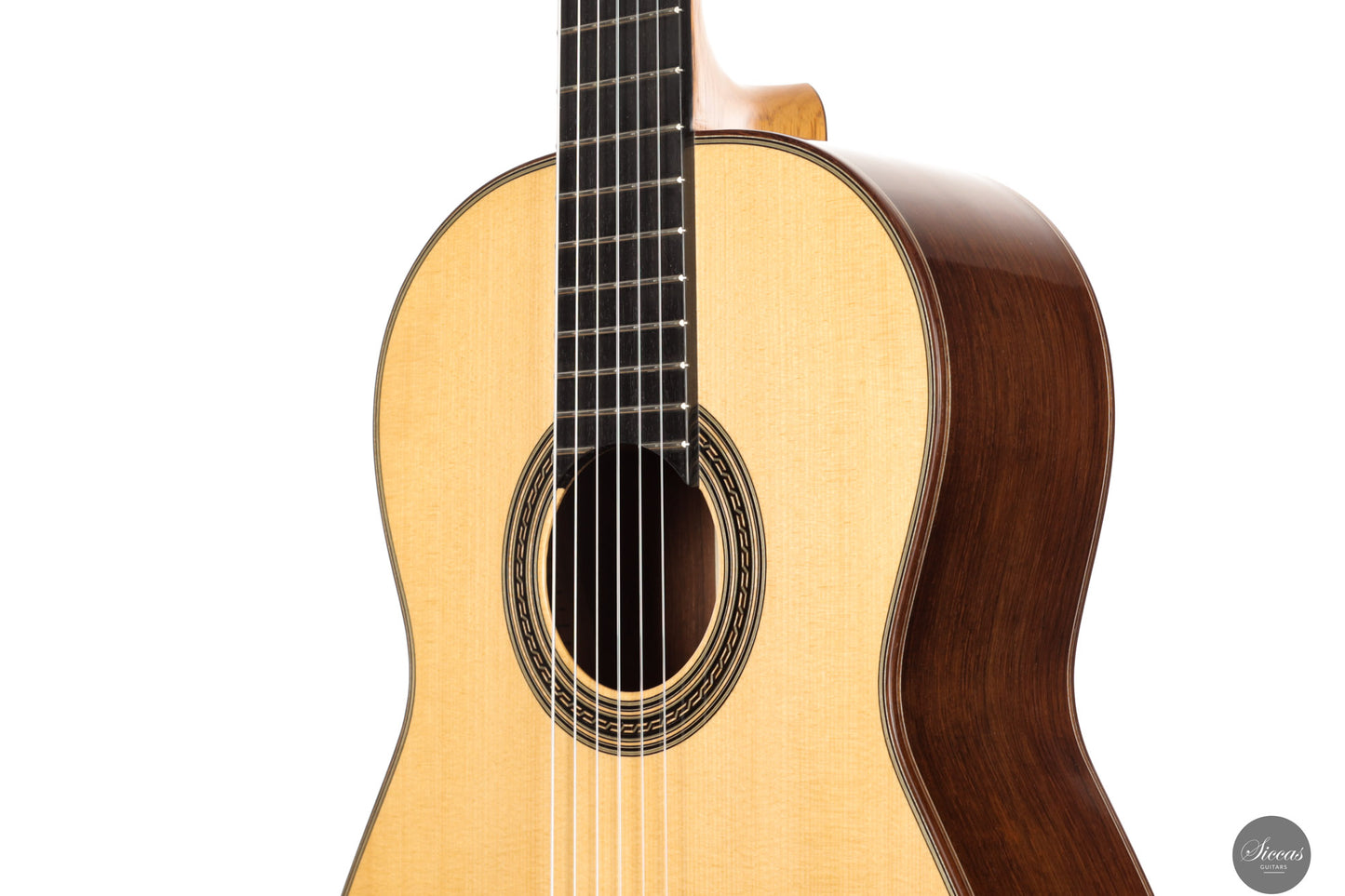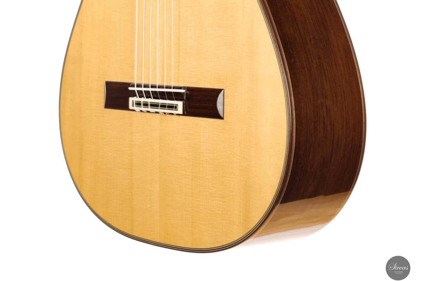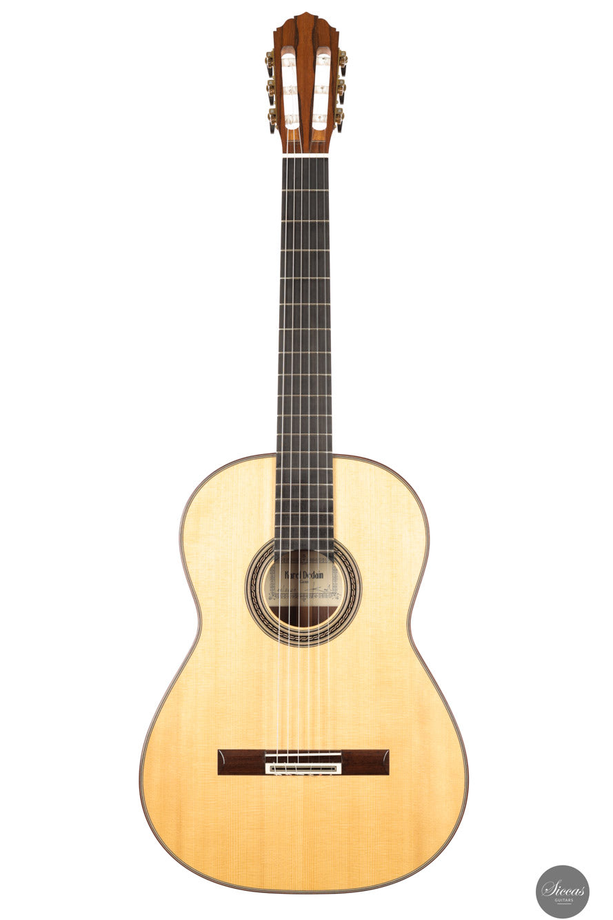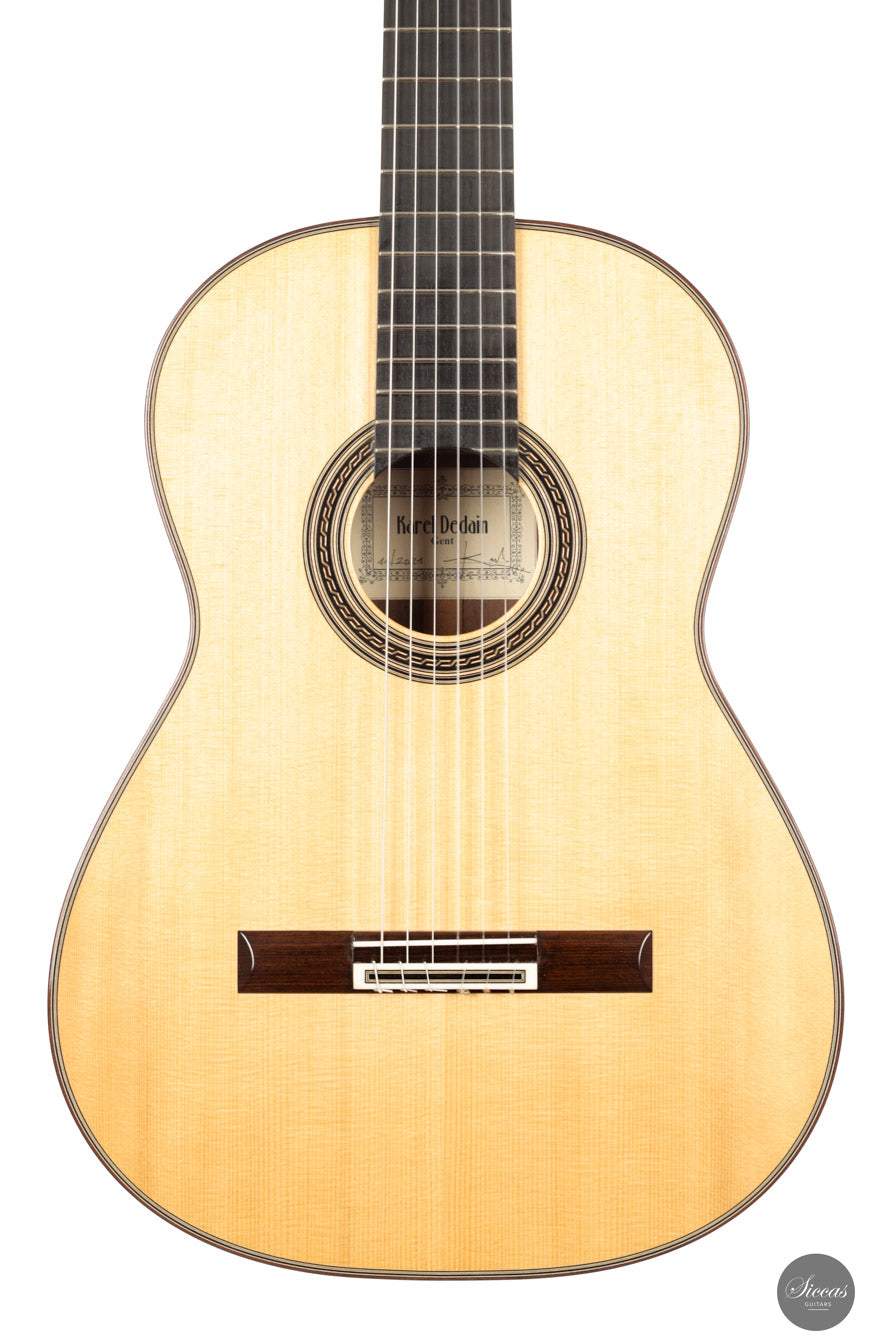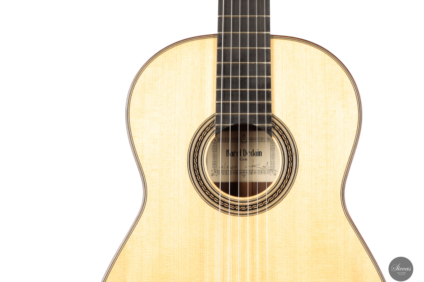 This 2021 guitar by Karel Dedain exemplifies the essence of expert craftsmanship, blending traditional techniques with tonewoods of the highest quality to deliver a remarkable musical instrument. It features a spruce soundboard supported by seven fan braces, and the back and sides are made of Madagascar rosewood, contributing not only to the visual elegance of the instrument but also to its lush, resonant sound. The result is a guitar with a highly desirable combination of balance, depth, and responsiveness, an ideal choice for serious players seeking tonal sophistication and precision.