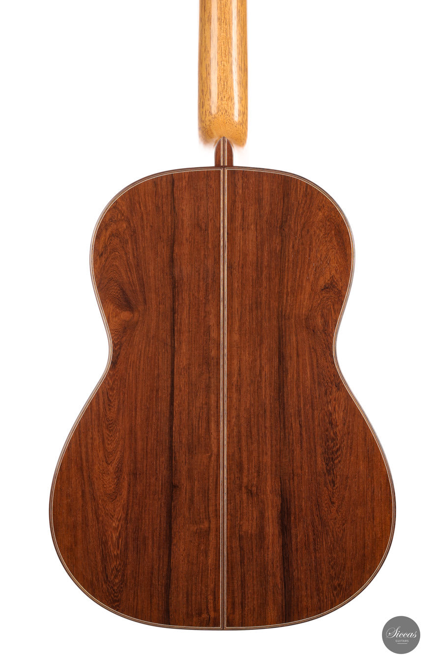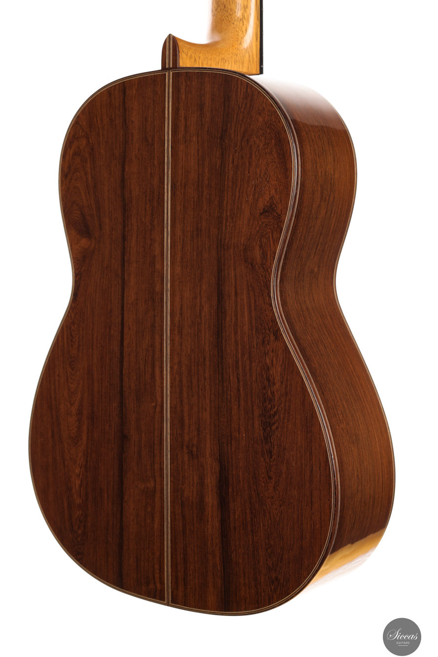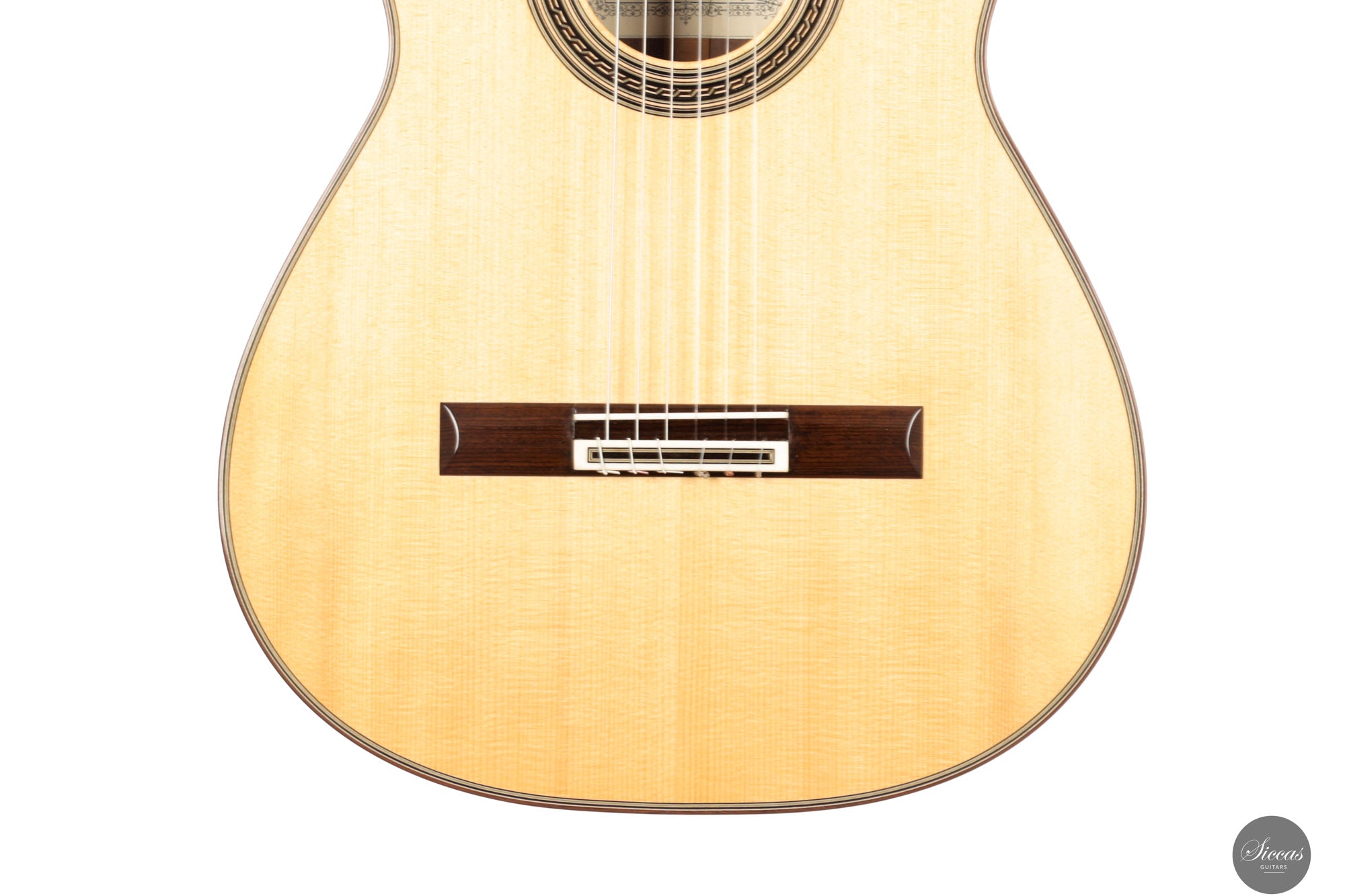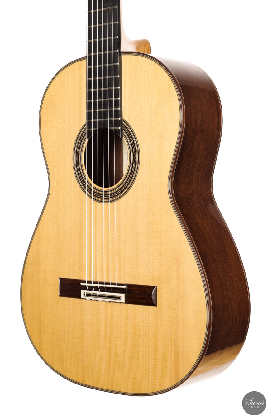 This 2021 guitar by Karel Dedain exemplifies the essence of expert craftsmanship, blending traditional techniques with tonewoods of the highest quality to deliver a remarkable musical instrument. It features a spruce soundboard supported by seven fan braces, and the back and sides are made of Madagascar rosewood, contributing not only to the visual elegance of the instrument but also to its lush, resonant sound. The result is a guitar with a highly desirable combination of balance, depth, and responsiveness, an ideal choice for serious players seeking tonal sophistication and precision.