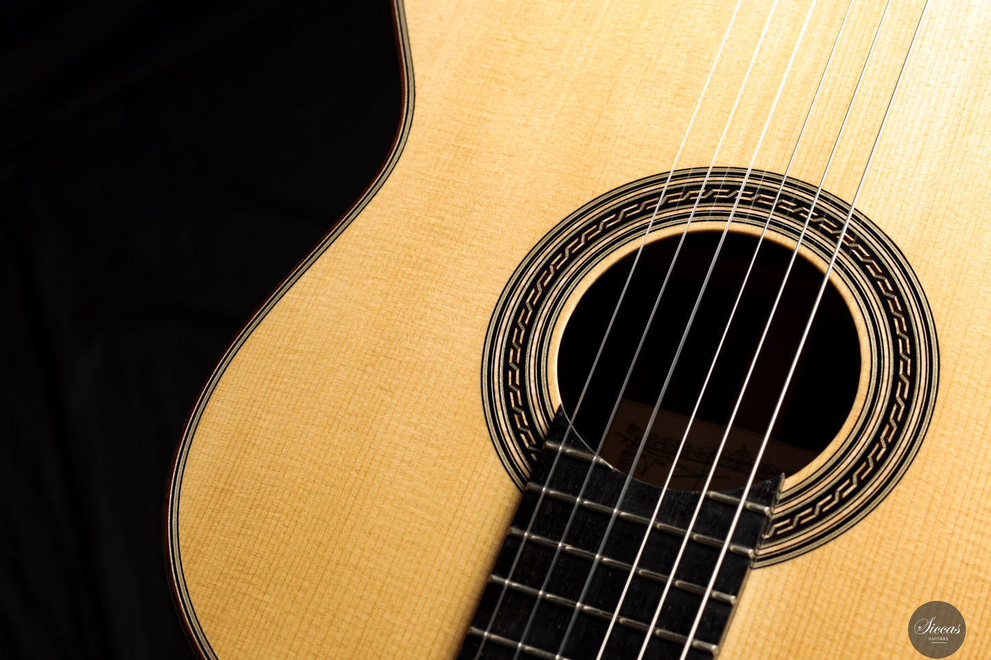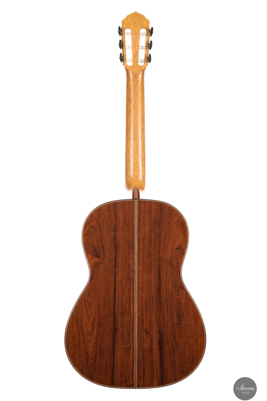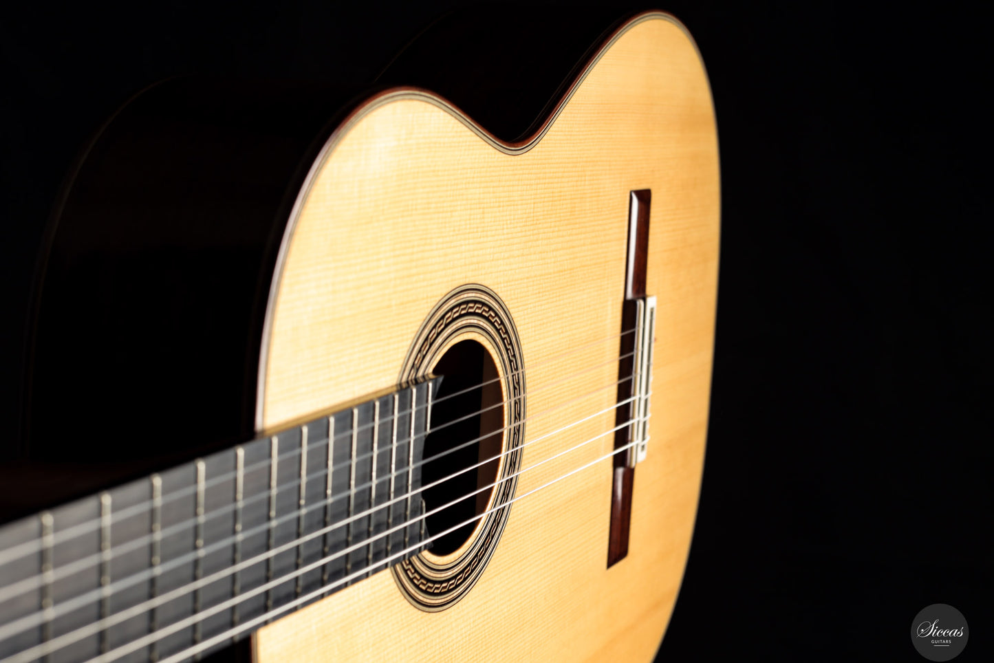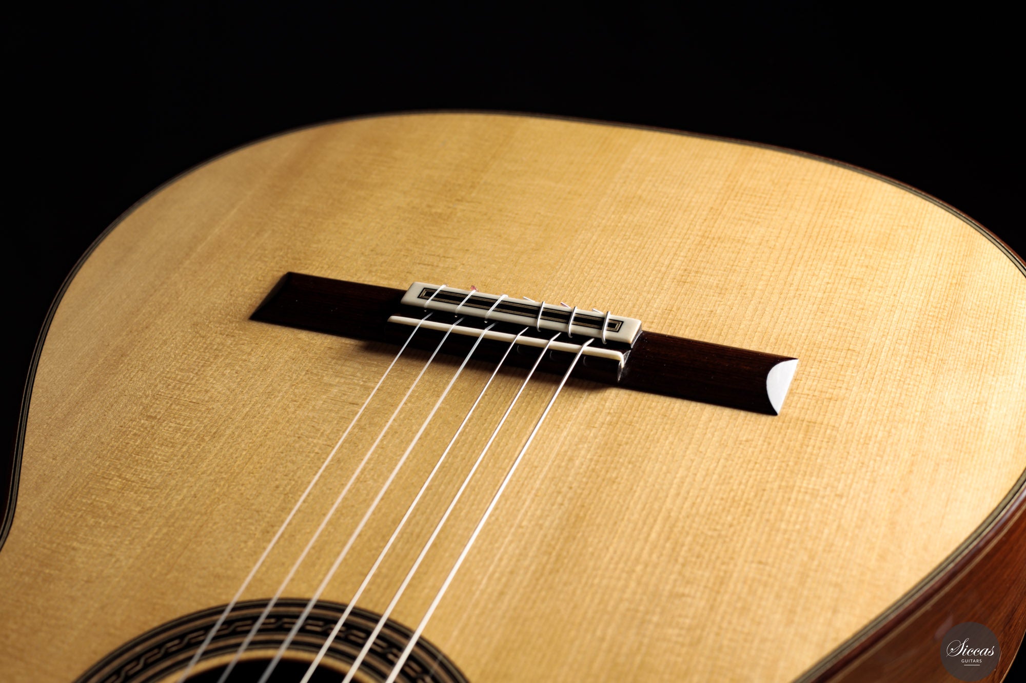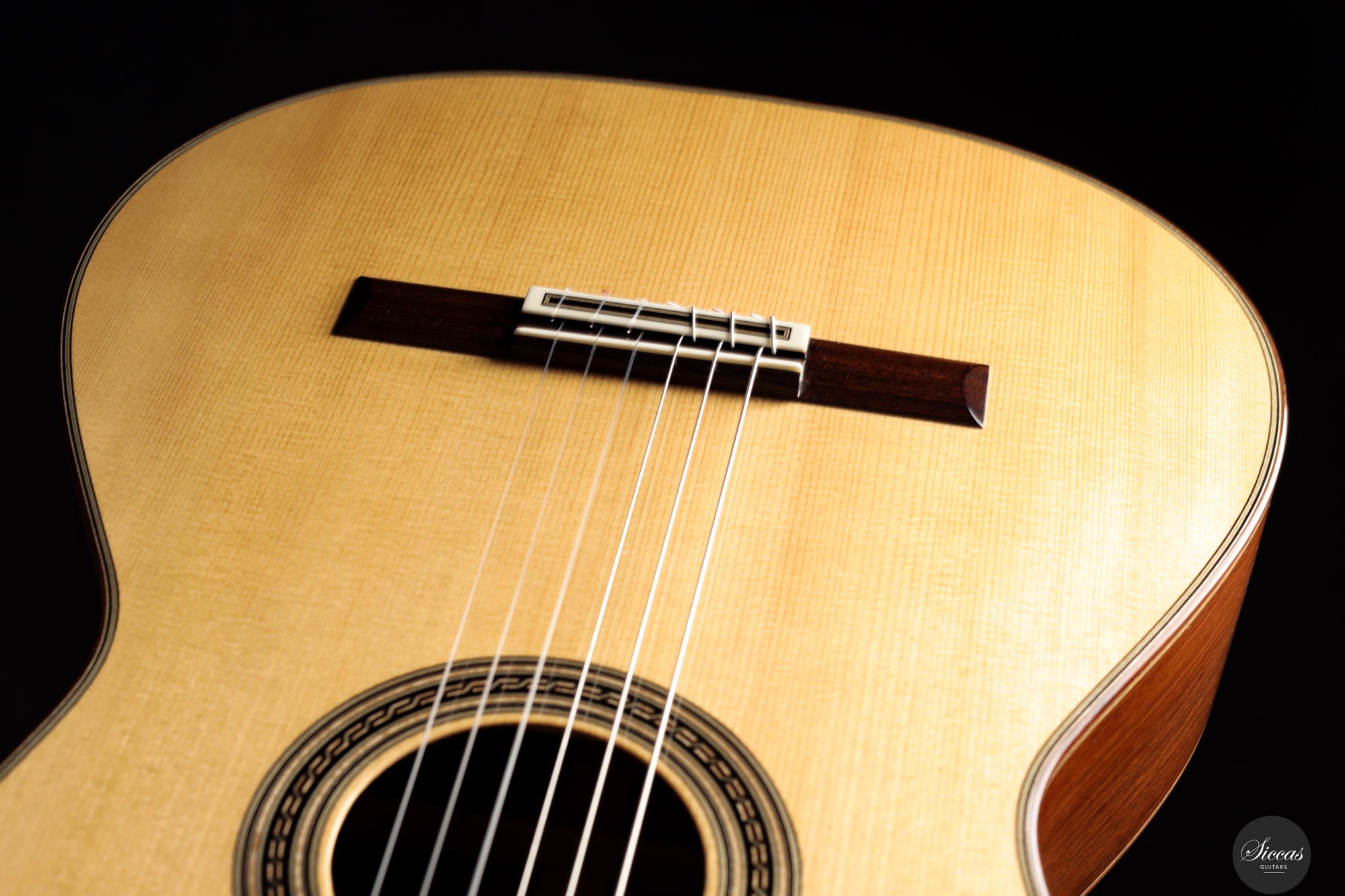 This 2021 guitar by Karel Dedain exemplifies the essence of expert craftsmanship, blending traditional techniques with tonewoods of the highest quality to deliver a remarkable musical instrument. It features a spruce soundboard supported by seven fan braces, and the back and sides are made of Madagascar rosewood, contributing not only to the visual elegance of the instrument but also to its lush, resonant sound. The result is a guitar with a highly desirable combination of balance, depth, and responsiveness, an ideal choice for serious players seeking tonal sophistication and precision.