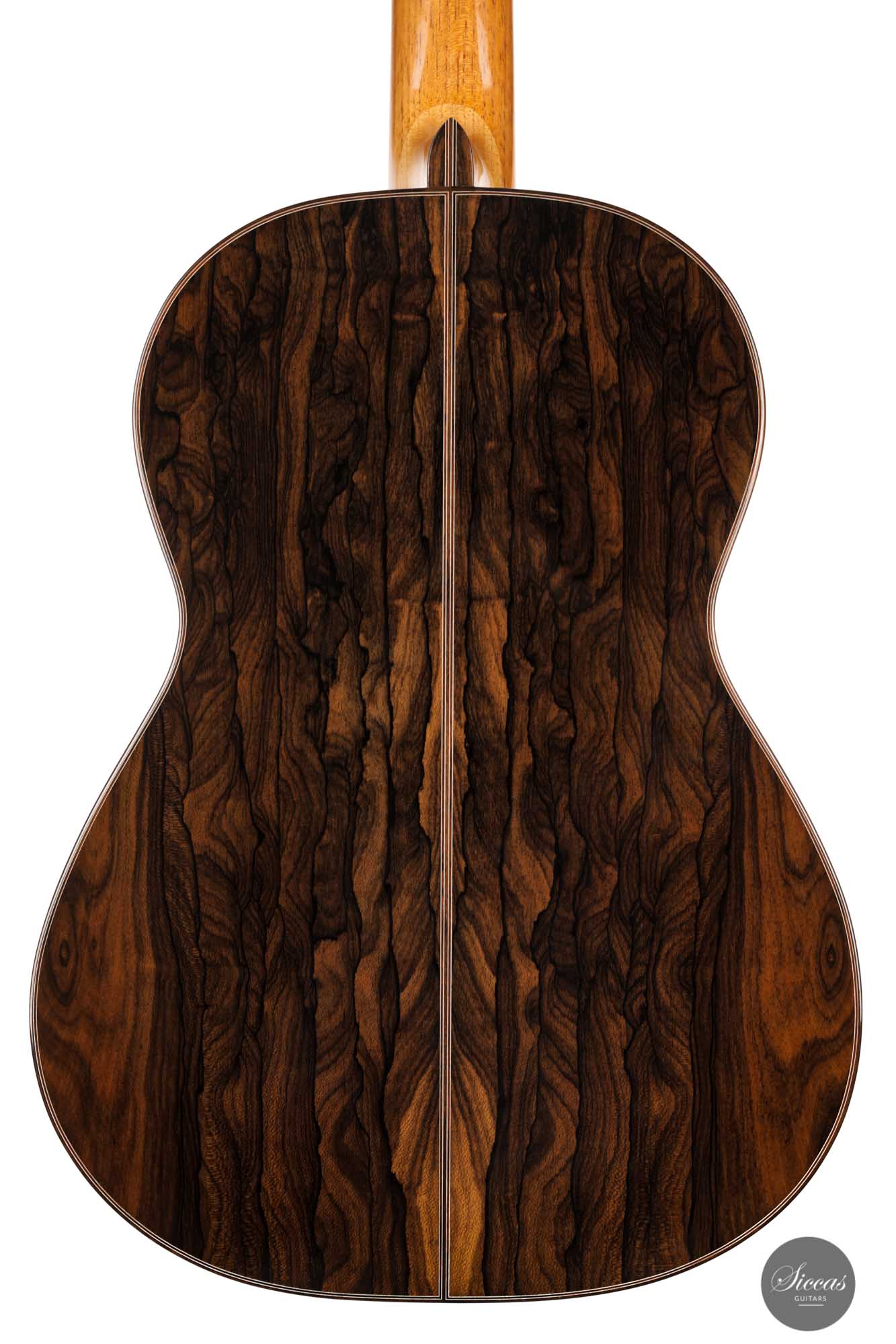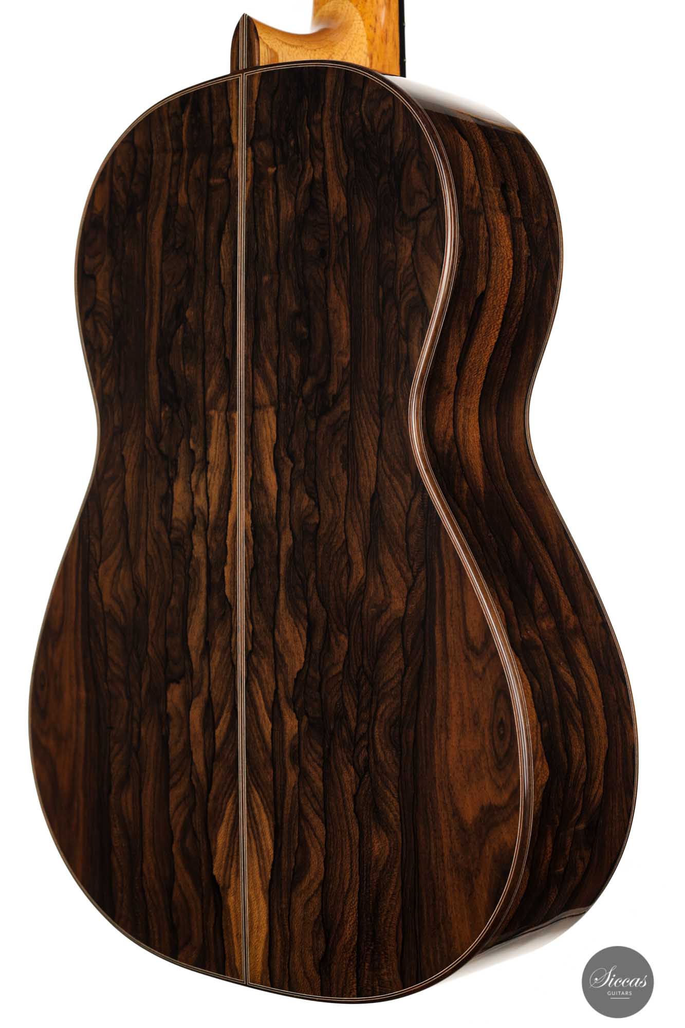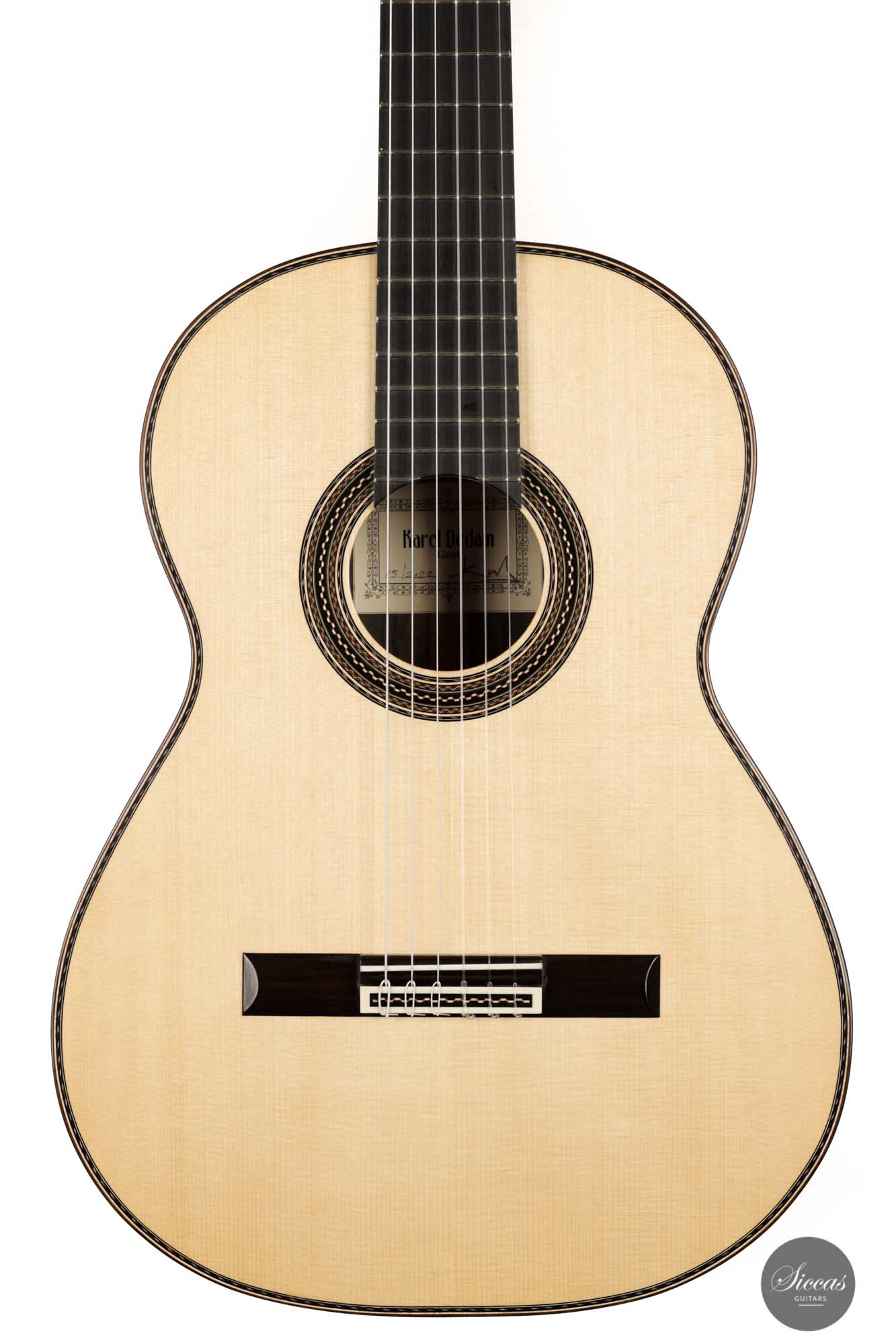 The top is made of the highest quality Italian spruce and has a 7-fan bracing with a very thin transverse bar, a so-called “Barre d’âme”, a construction element adopted from the famous luthier Robert Bouchet. For the back and sides, Karel used an outstanding set of dense and figured Ziricote.