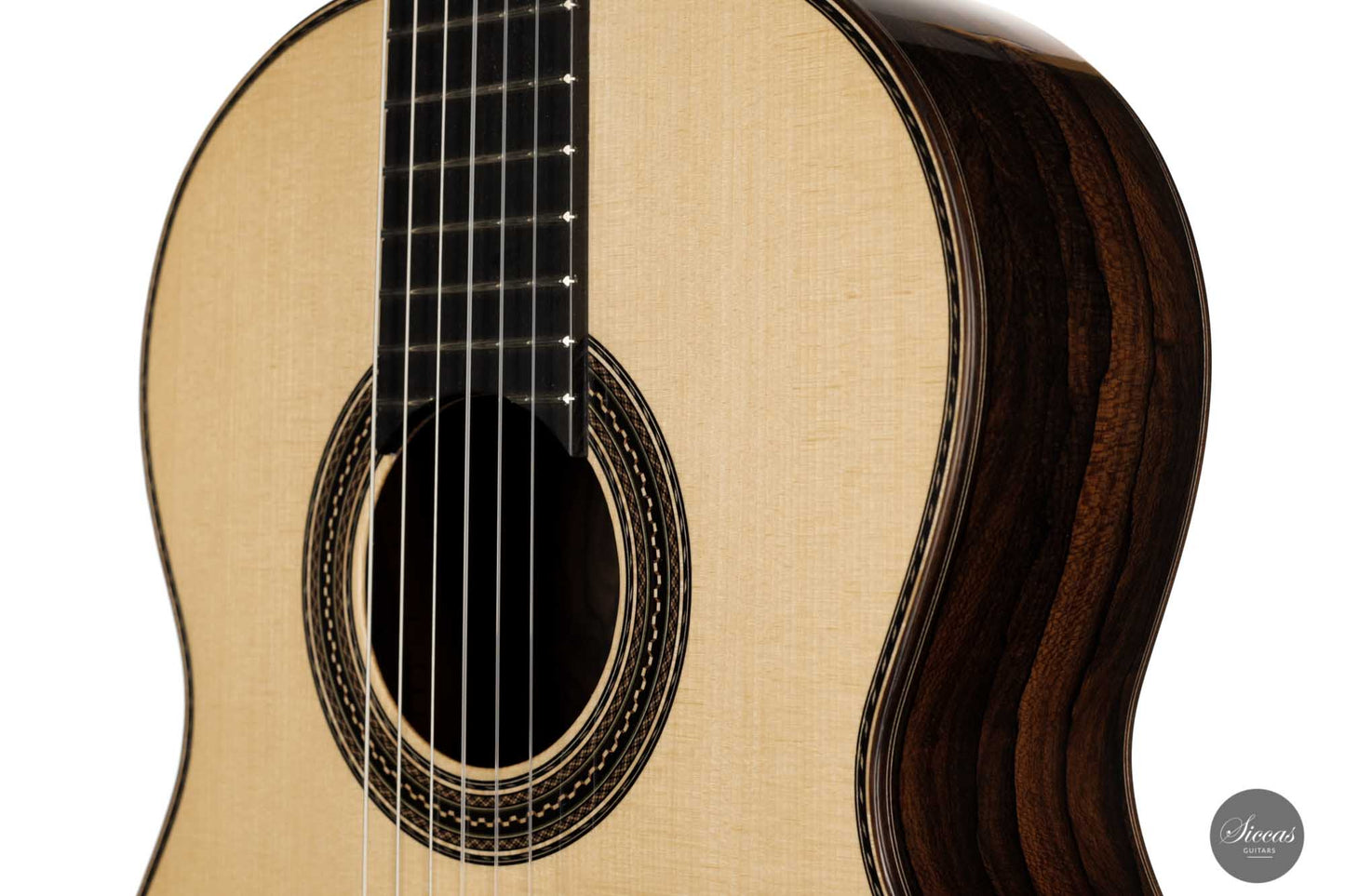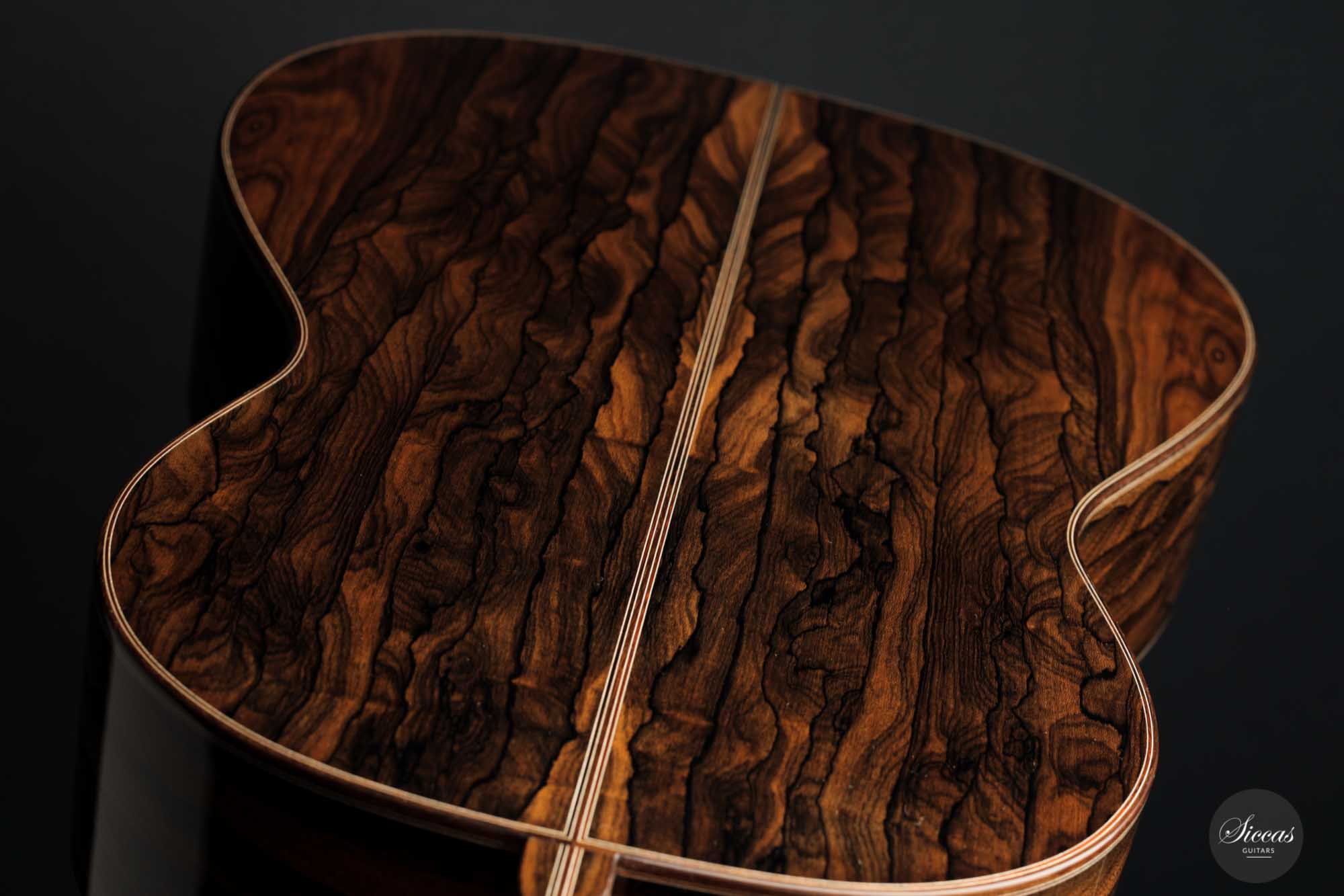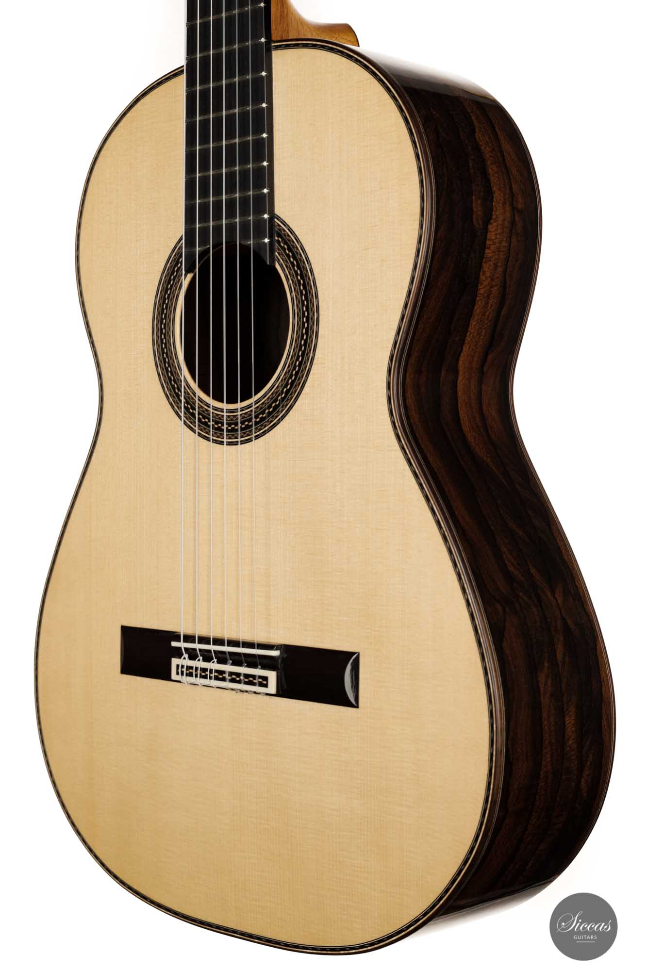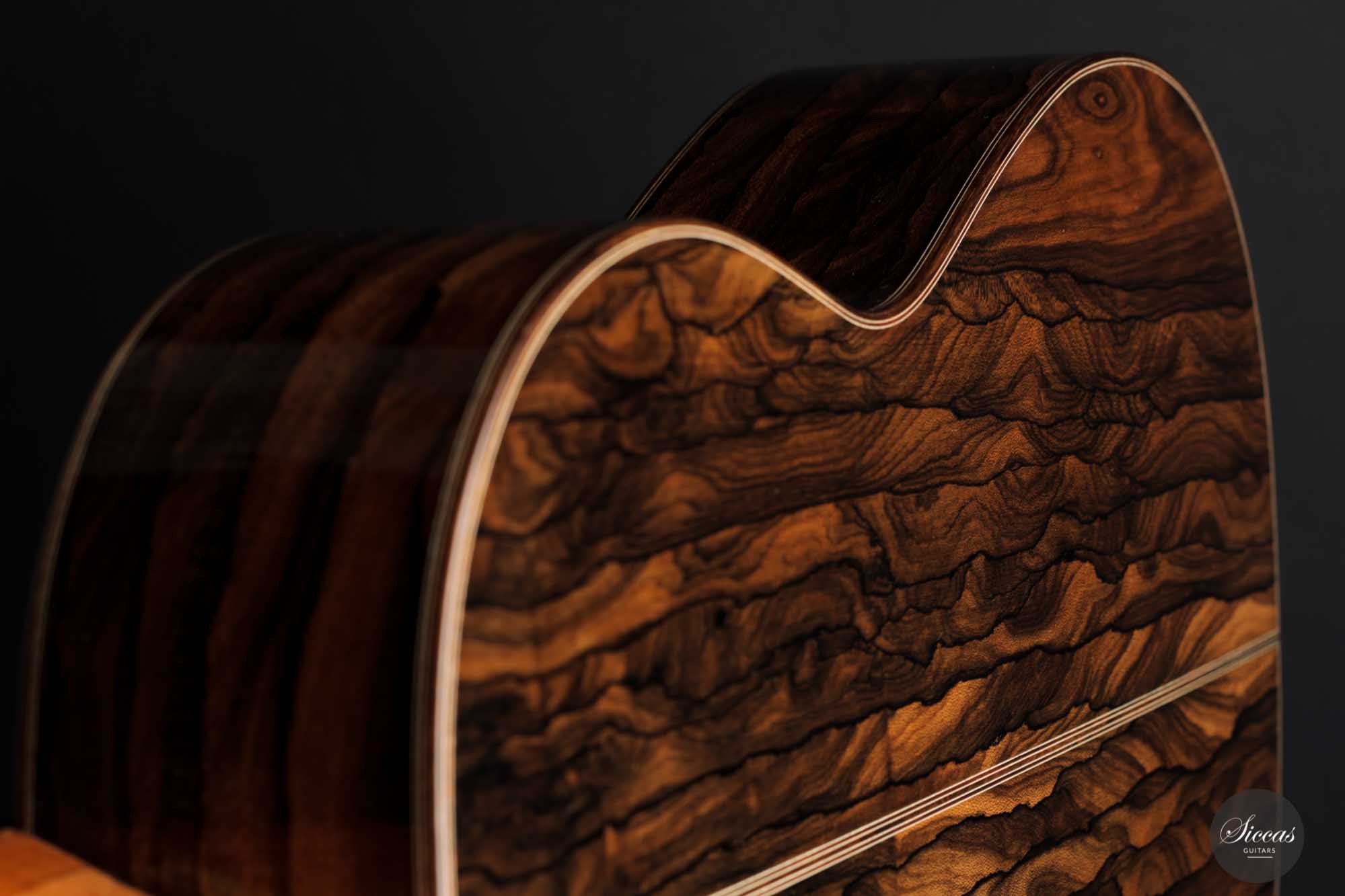 The top is made of the highest quality Italian spruce and has a 7-fan bracing with a very thin transverse bar, a so-called “Barre d’âme”, a construction element adopted from the famous luthier Robert Bouchet. For the back and sides, Karel used an outstanding set of dense and figured Ziricote.