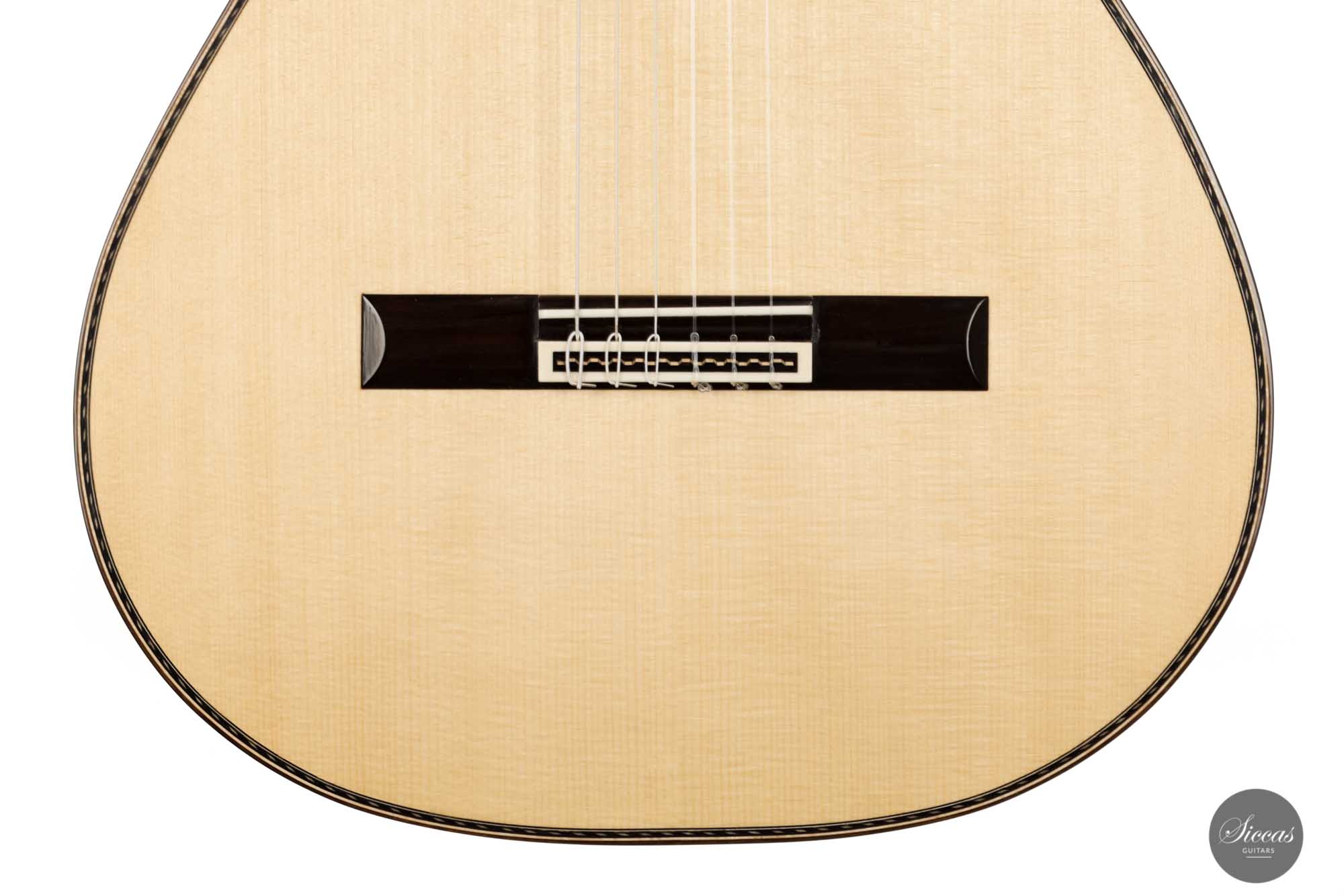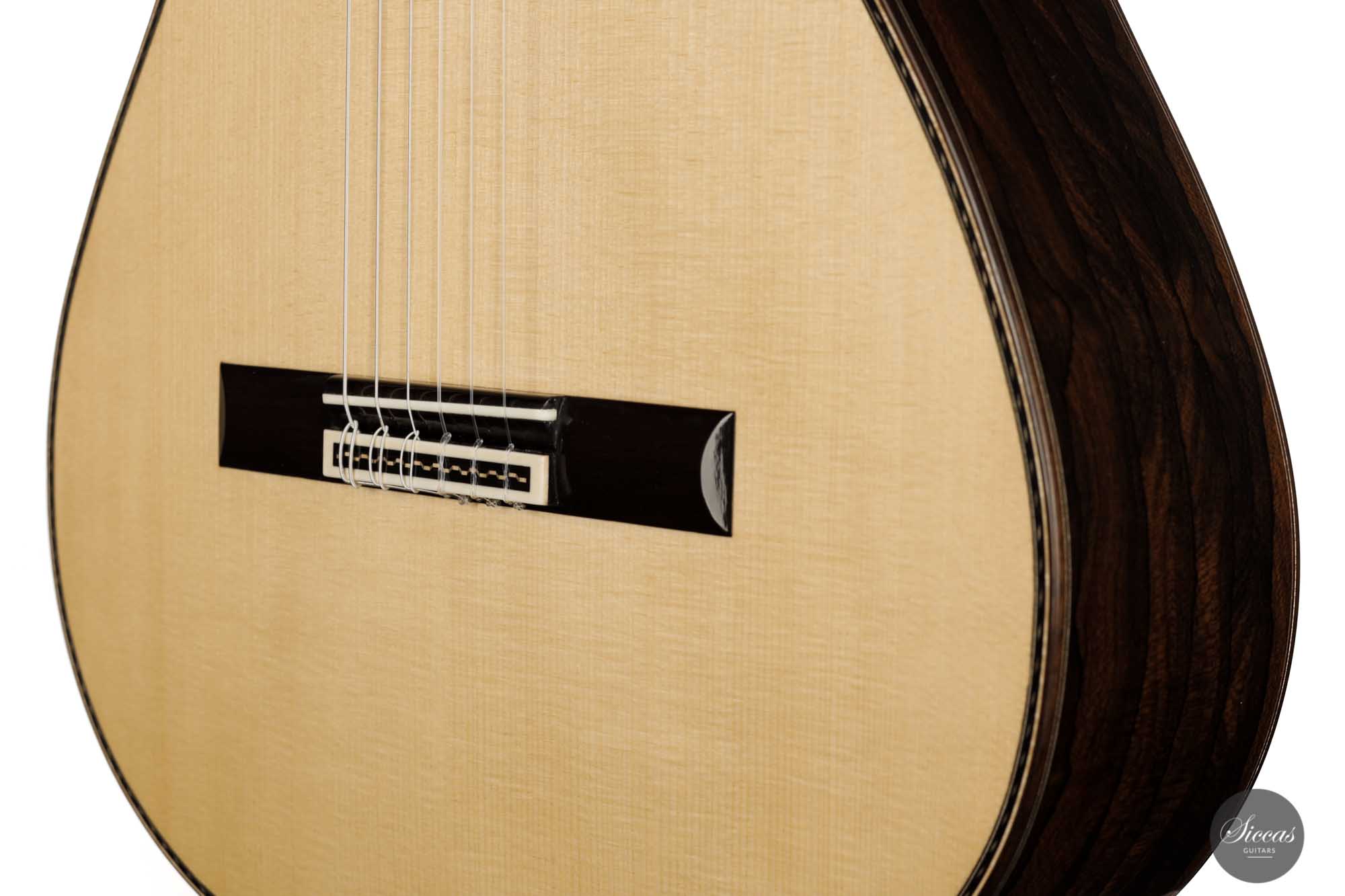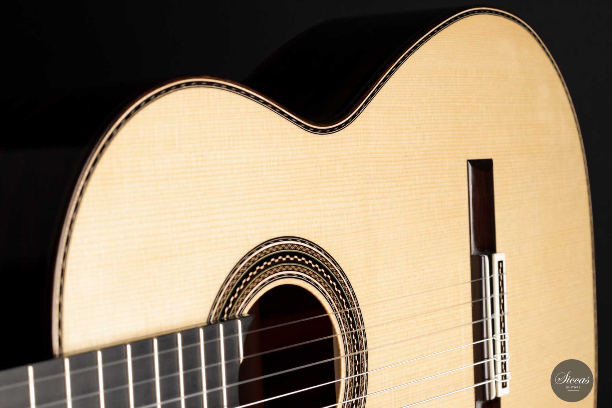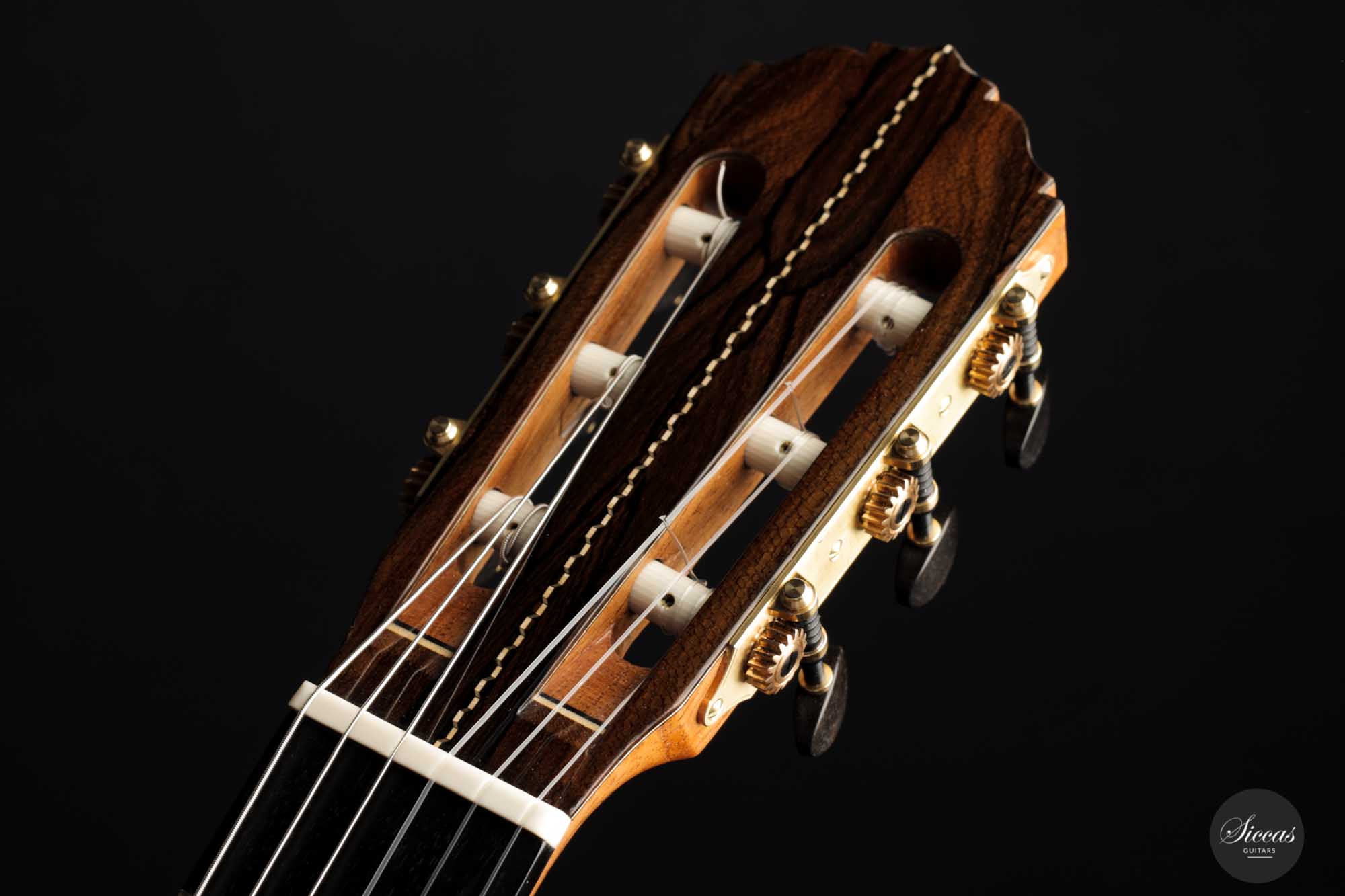 This guitar, built in 2022 especially for Siccas Guitars, has a lot of unique and exciting features. Together with Karel we aimed to create an instrument that combines excellent playability with a rich, powerful and traditional sound. As a result, this guitar has a 64 cm scale length, which provides a comfortable playing feel for the left hand, and a slightly raised fingerboard, which makes playing in the high registers more comfortable.