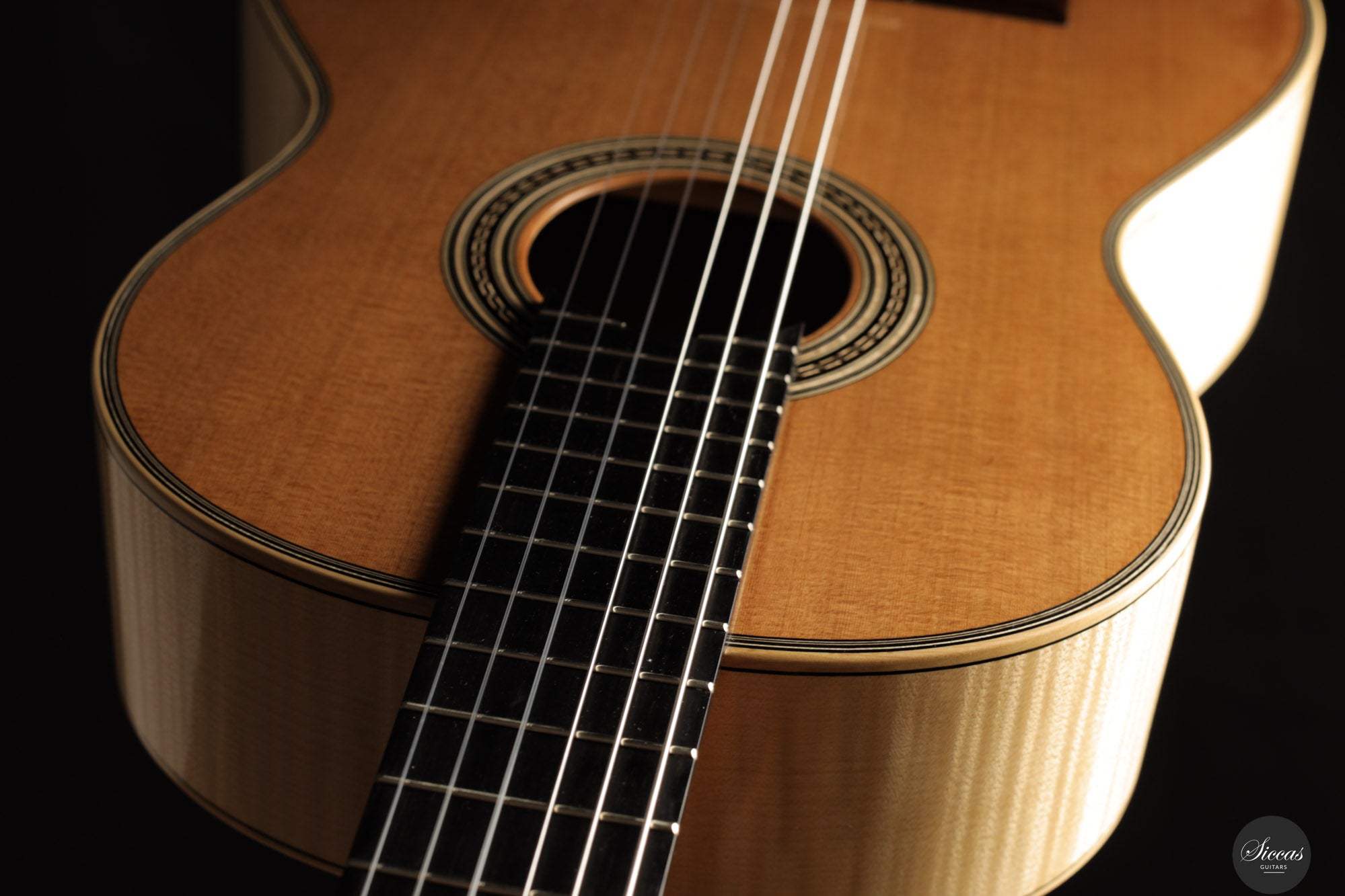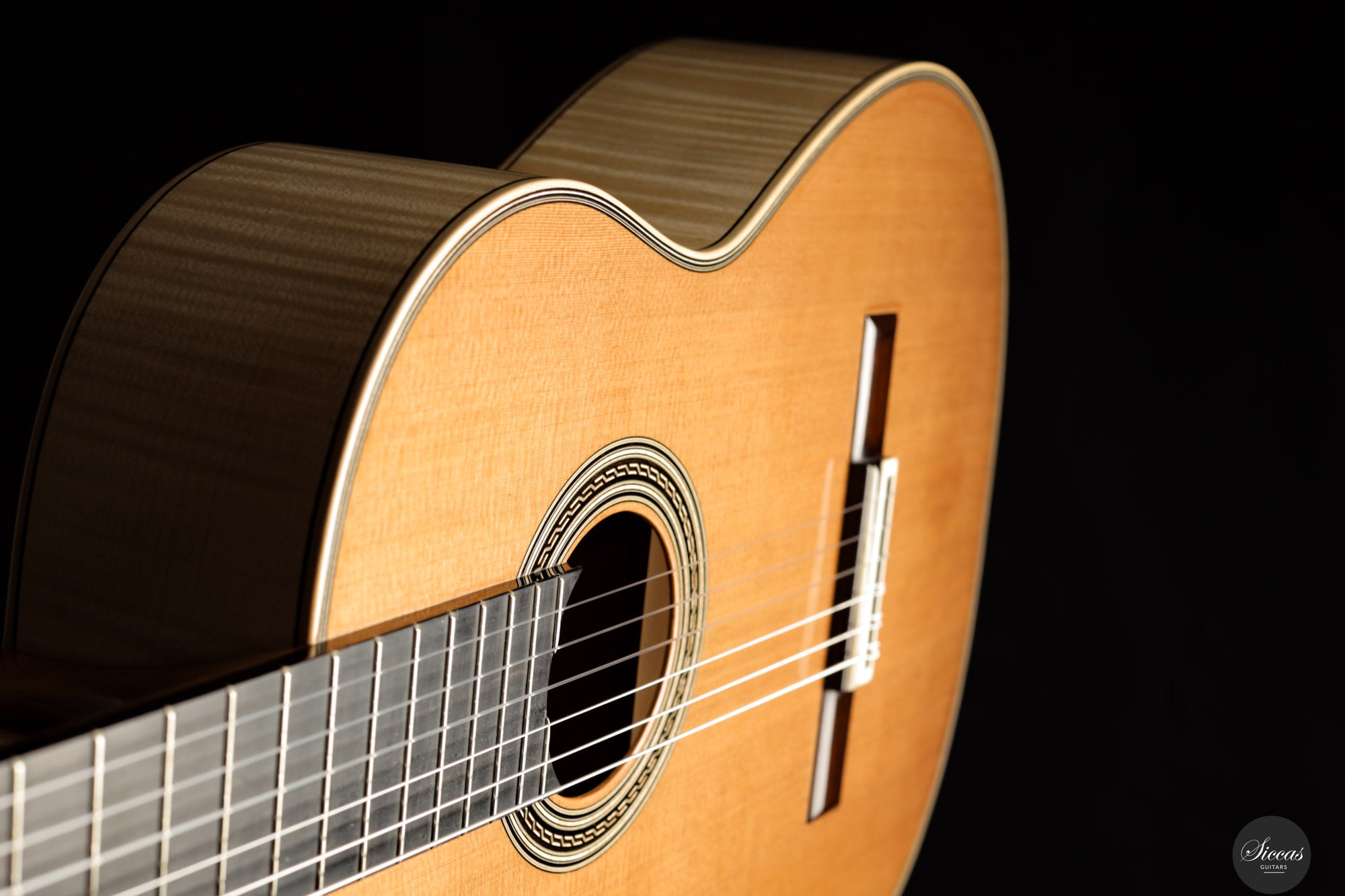 This brand new guitar by Karel is a truly distinctive instrument, thanks to its uncommon yet highly effective combination of a cedar soundboard and maple back and sides. The warmth and roundness of the cedar pair beautifully with the velvety tonal character of the maple, resulting in a guitar with a remarkable tonal palette and responsiveness.