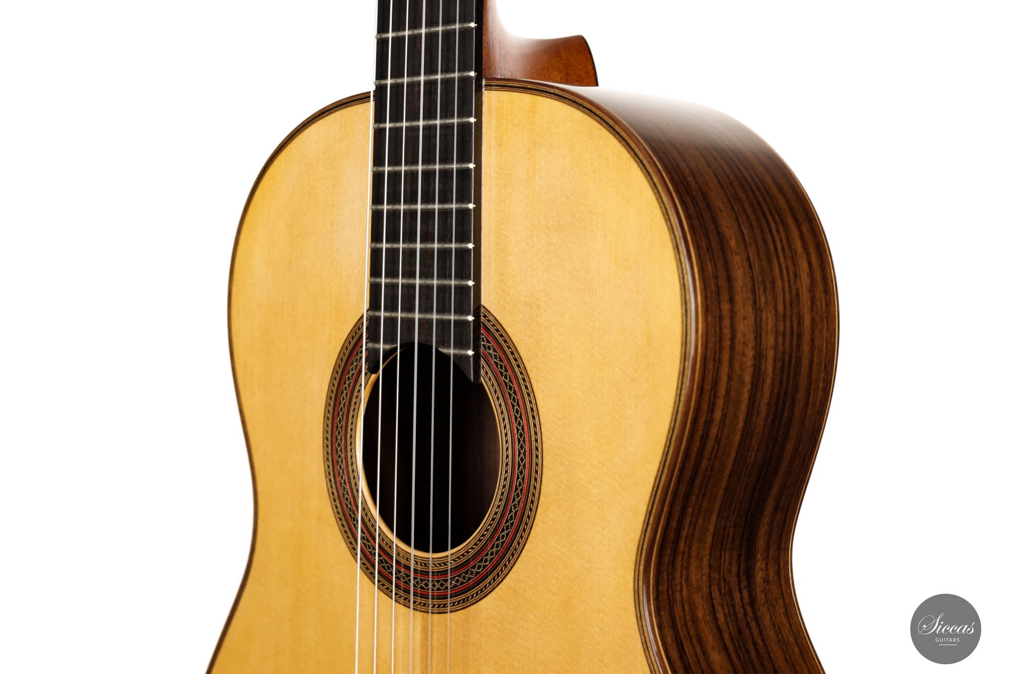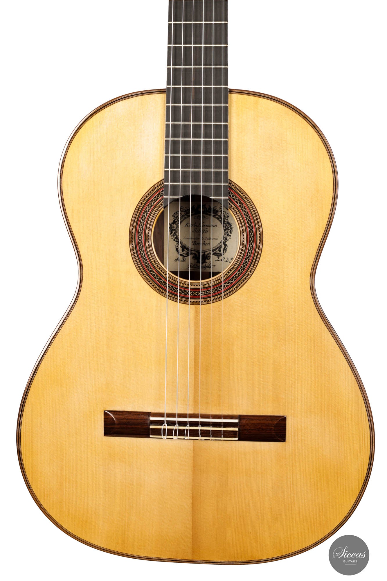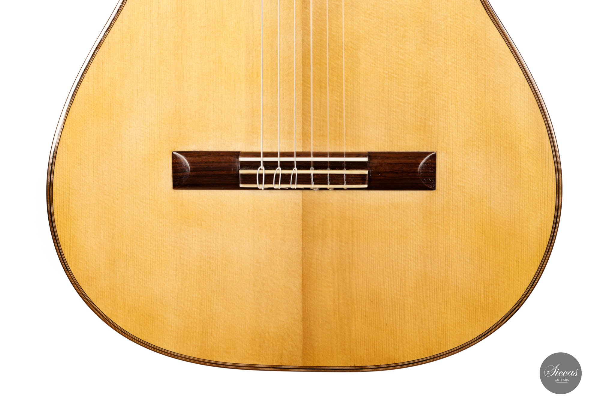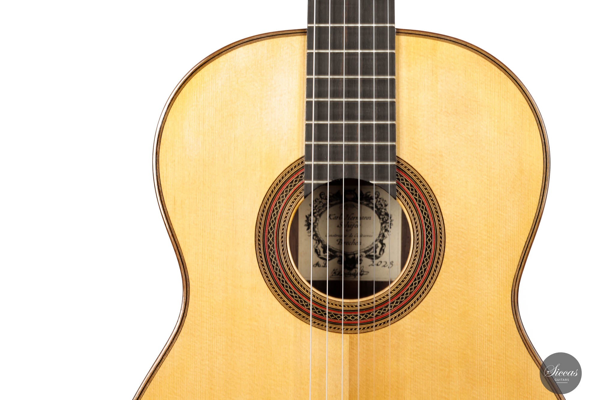 Discover the auditory finesse of the 2023 Karl-Hermann Schäfer guitar. Constructed with a spruce soundboard paired with Indian rosewood for the back and sides, this guitar embodies an exceptional blend of materials meticulously chosen to perfect the sound quality. From an acoustical standpoint, the 2023 Karl-Hermann Schäfer guitar exhibits a complexity, depth, and elegance synonymous with high-end musical instruments. Its sonorous bass notes resonate deeply, while the treble tones present a smooth, clear, and expansive sound. The instrument's construction imbues it with an intriguing and inspiring aura, an inherent quality that, coupled with its prolonged sustain, distinguishes it from its contemporaries. This guitar is not just an instrument; it is a testament to the enduring legacy of fine craftsmanship and sonic excellence.