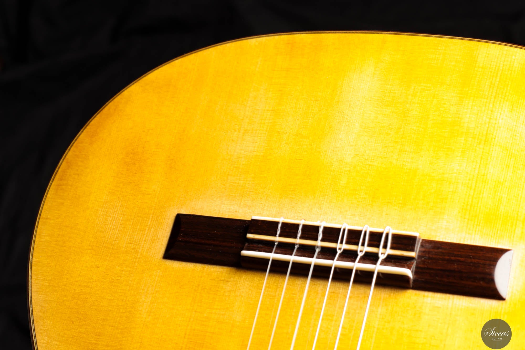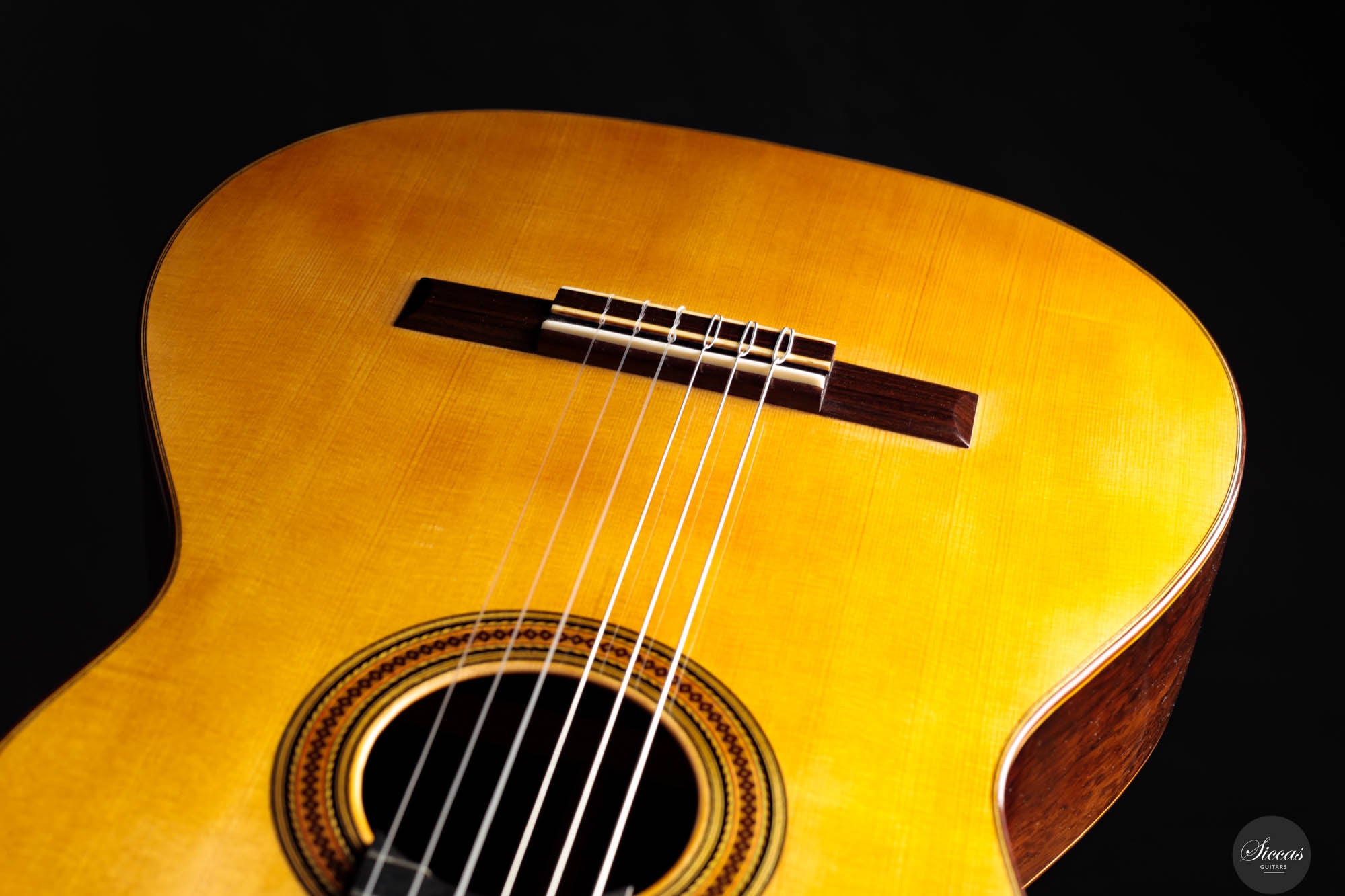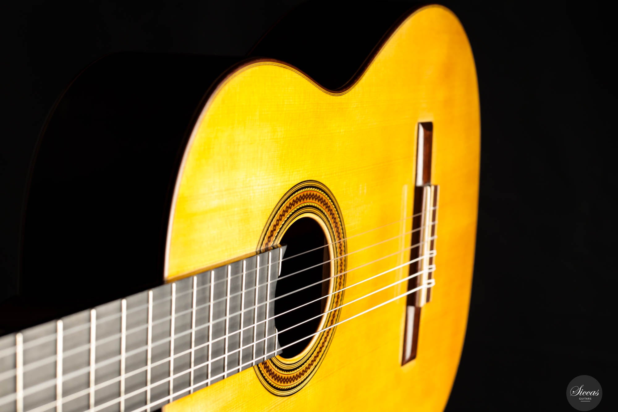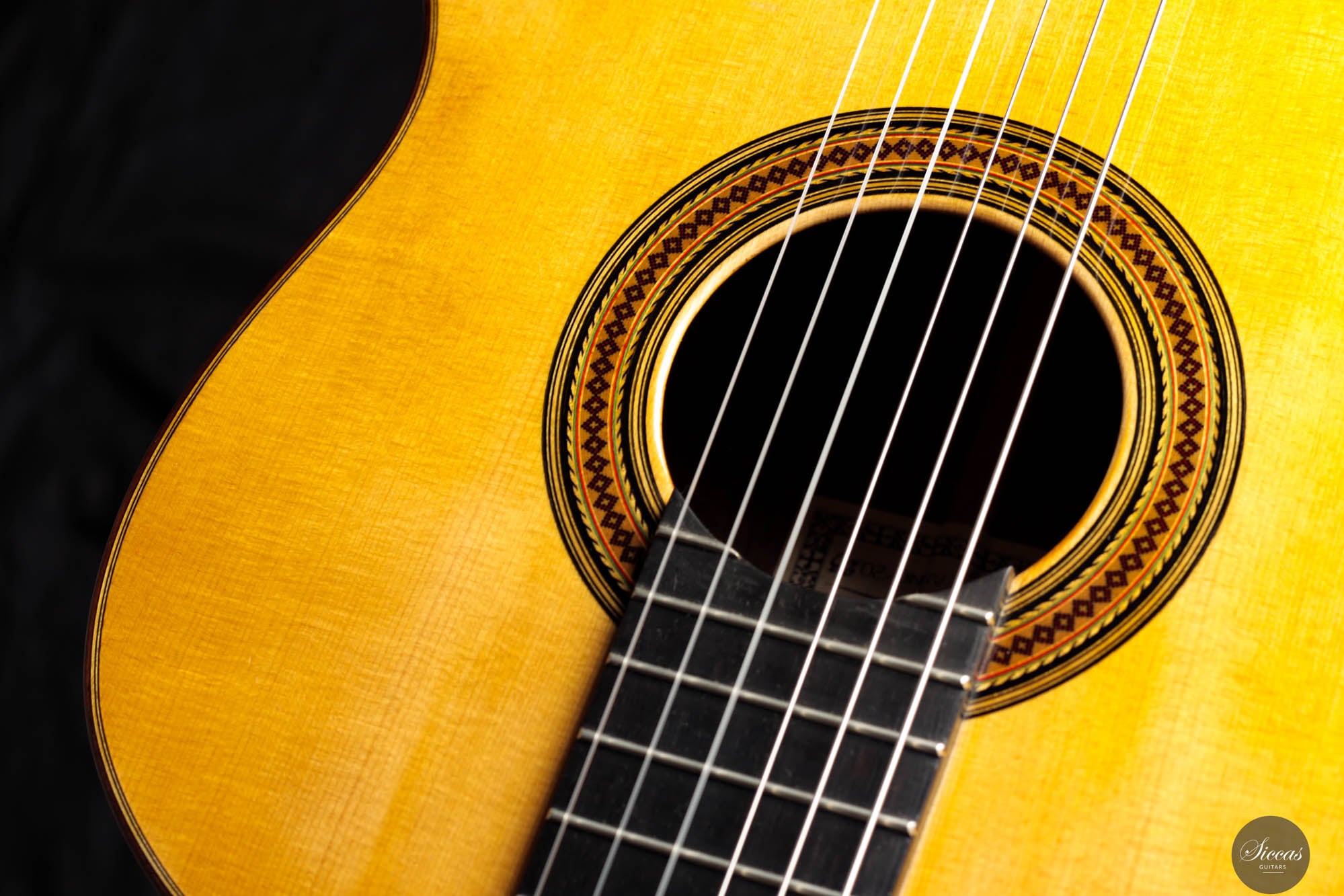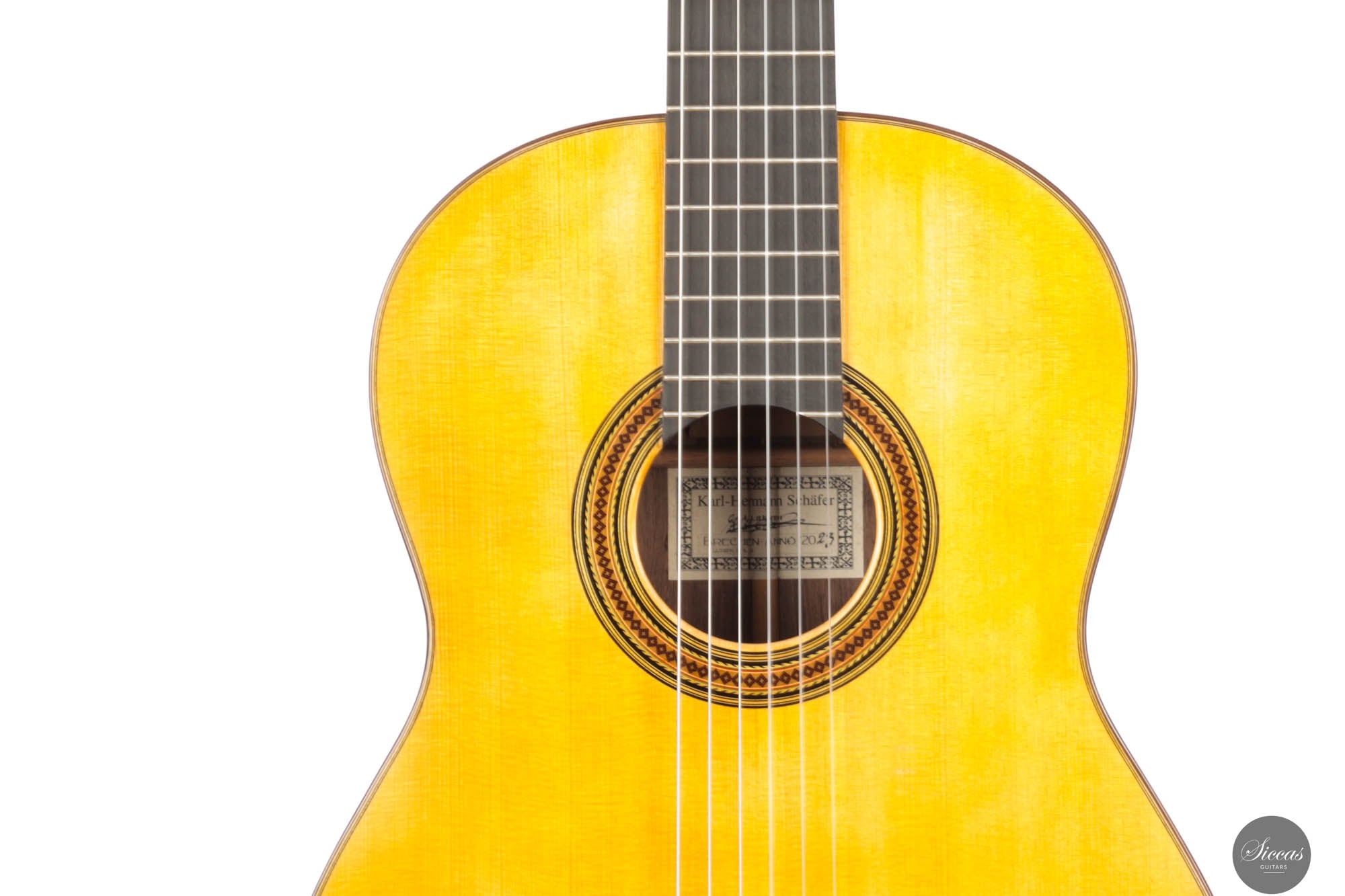 Karl-Hermann Schäfer is undoubtedly one of the few modern luthiers with a profound understanding of early 20th-century Spanish guitar making, particularly the work of Santos Hernández, Antonio de Torres, and other iconic masters. This particular guitar is inspired by the guitars of Santos Hernández, and it reflects Schäfer’s dedication to authenticity, nuance, and historical detail. Tonally, the guitar is strikingly close to a Santos Hernández from the early 1930s, with a similarly angled headstock and an overall playing feel that captures the soul of the original. The instrument delivers a deep resonance between E and F, giving it a distinct “old world” character, while the basses are rich and profound, and the trebles sing with warmth, sustain, and clarity—a rare combination that few luthiers can achieve. It also boasts remarkable evenness across the entire fingerboard and register, making it not only historically accurate but also a highly playable and expressive concert instrument. Internally, the spruce soundboard is supported by a 7-fan bracing system, with five symmetrical braces and two outer braces connected by small diagonal bars, forming subtle “L”-shaped figures. Similar pattern can be found in 1935 Santos Hernandez. As a pre-loved instrument, this guitar is in excellent condition, with only a few minor playing marks. It could easily be rated as near mint, and stands as a beautiful and faithful homage to one of the greatest luthiers of the classical guitar tradition.Regular care extends the life of the instrument