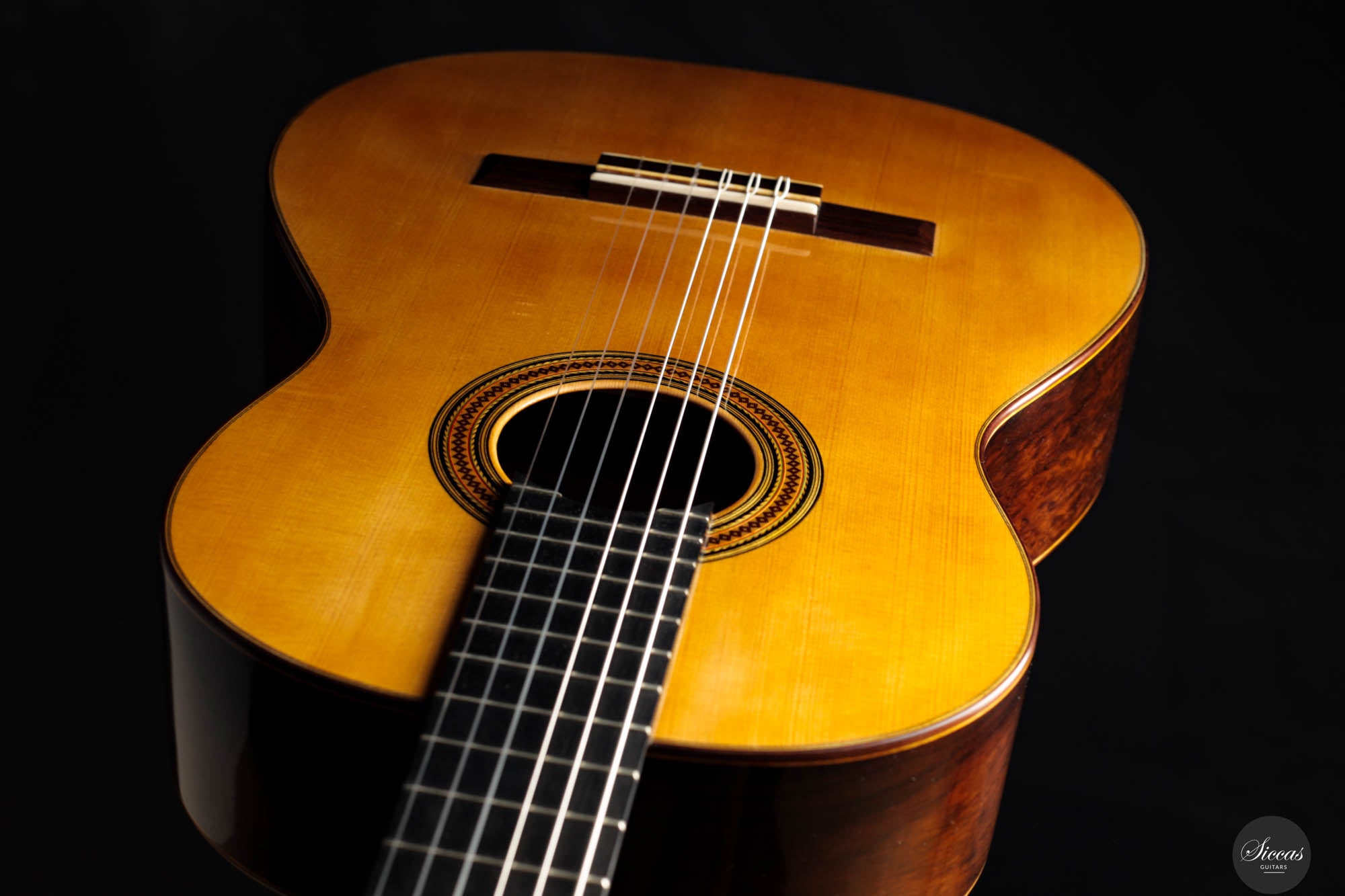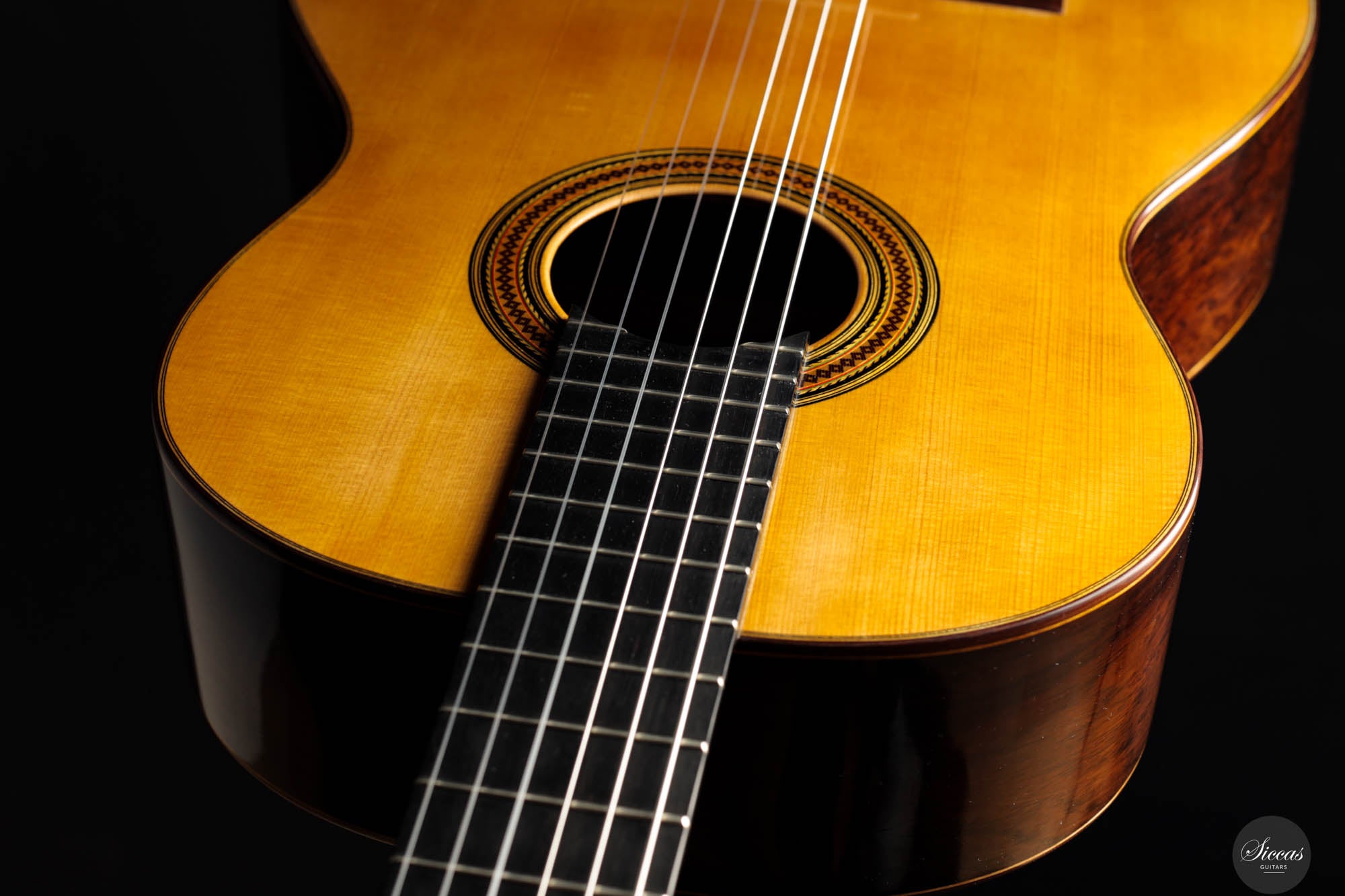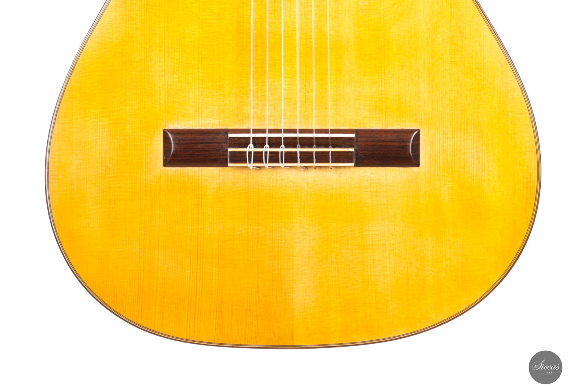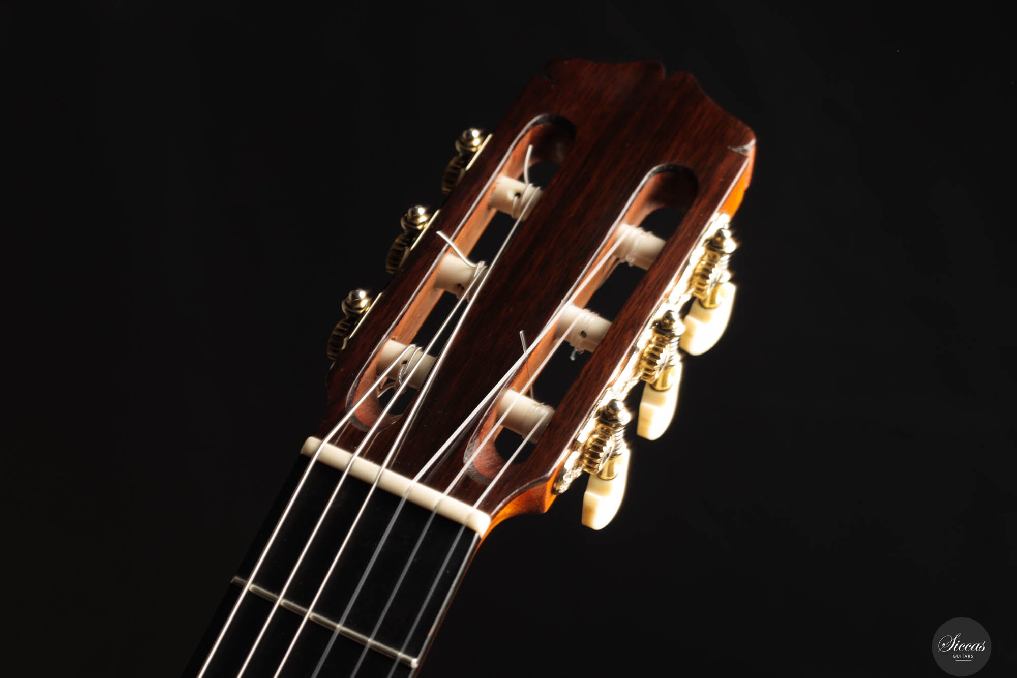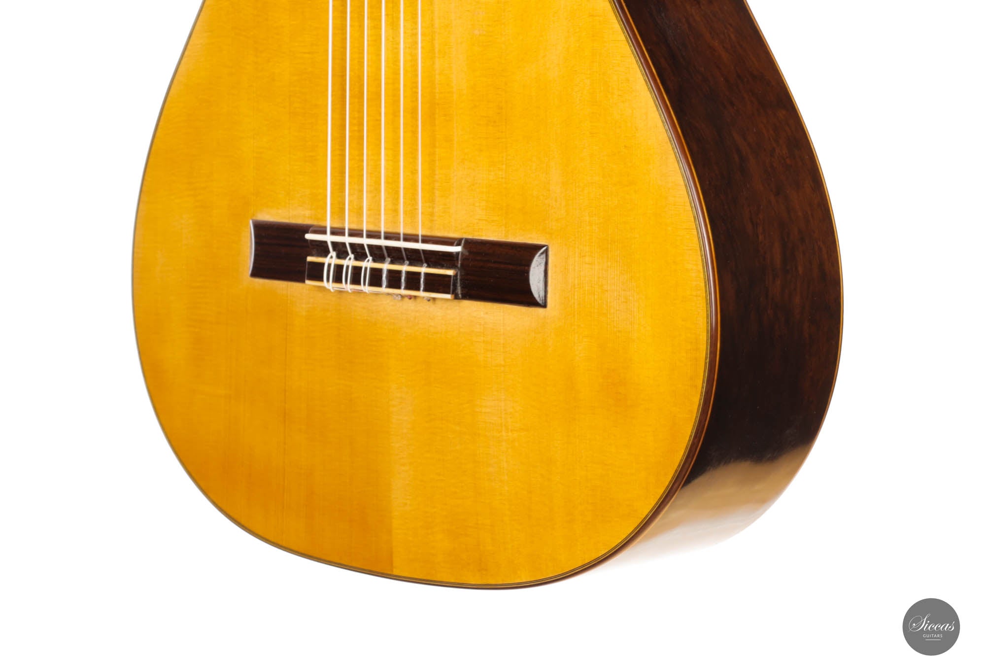 Karl-Hermann Schäfer is undoubtedly one of the few modern luthiers with a profound understanding of early 20th-century Spanish guitar making, particularly the work of Santos Hernández, Antonio de Torres, and other iconic masters. This particular guitar is inspired by the guitars of Santos Hernández, and it reflects Schäfer’s dedication to authenticity, nuance, and historical detail. Tonally, the guitar is strikingly close to a Santos Hernández from the early 1930s, with a similarly angled headstock and an overall playing feel that captures the soul of the original. The instrument delivers a deep resonance between E and F, giving it a distinct “old world” character, while the basses are rich and profound, and the trebles sing with warmth, sustain, and clarity—a rare combination that few luthiers can achieve. It also boasts remarkable evenness across the entire fingerboard and register, making it not only historically accurate but also a highly playable and expressive concert instrument. Internally, the spruce soundboard is supported by a 7-fan bracing system, with five symmetrical braces and two outer braces connected by small diagonal bars, forming subtle “L”-shaped figures. Similar pattern can be found in 1935 Santos Hernandez. As a pre-loved instrument, this guitar is in excellent condition, with only a few minor playing marks. It could easily be rated as near mint, and stands as a beautiful and faithful homage to one of the greatest luthiers of the classical guitar tradition.Regular care extends the life of the instrument