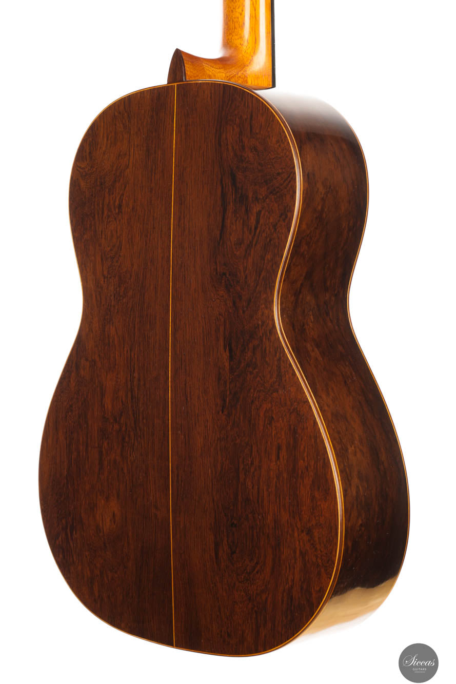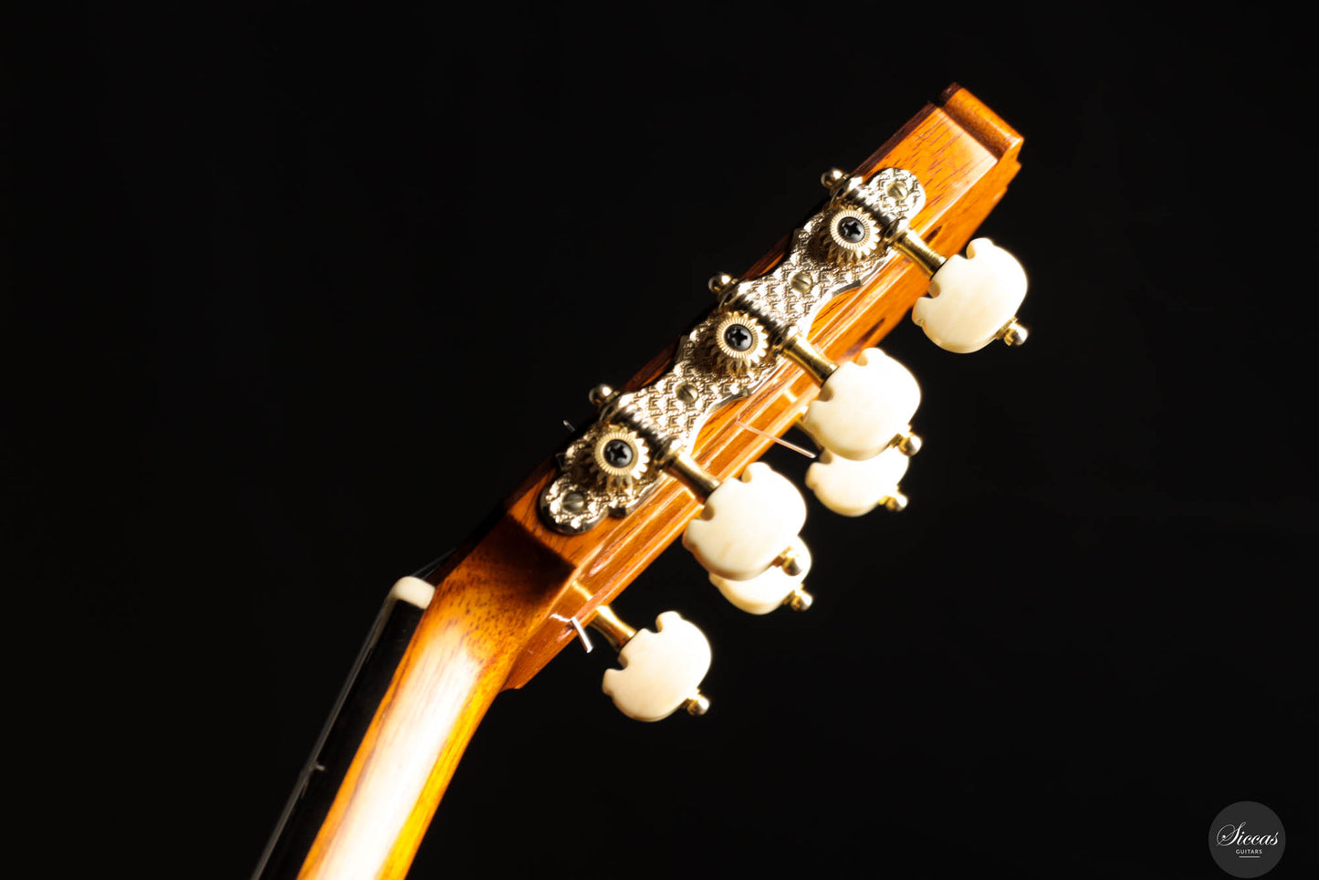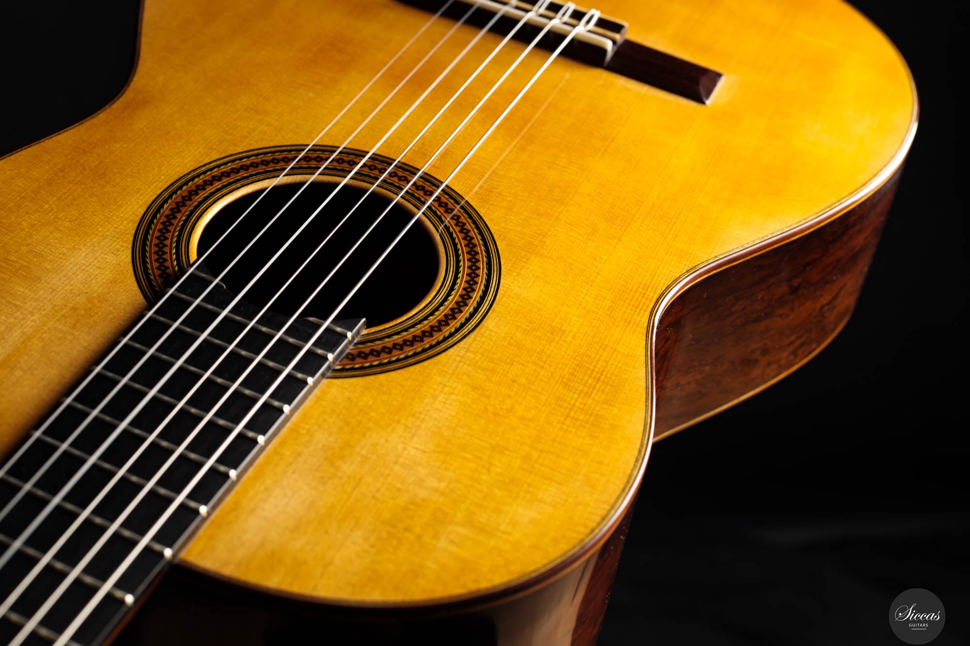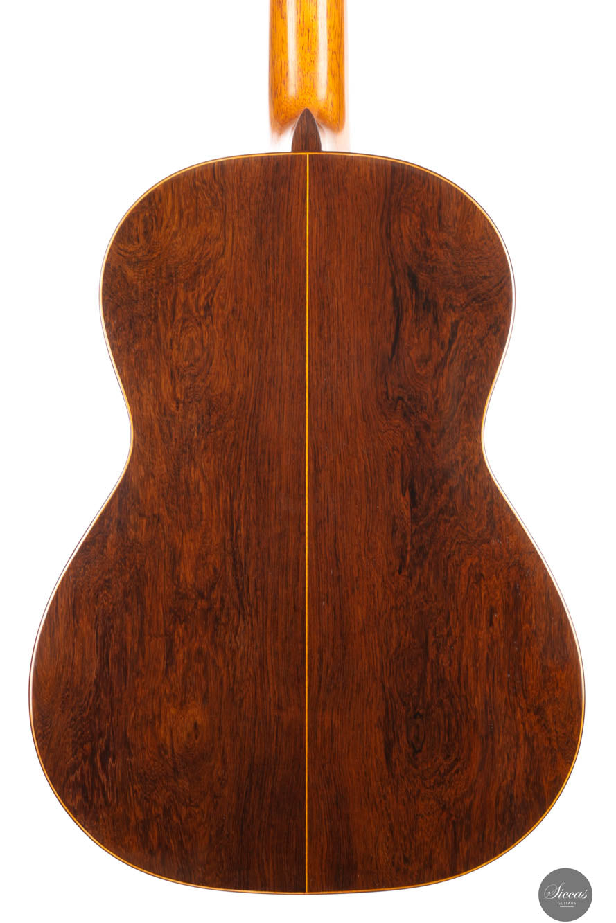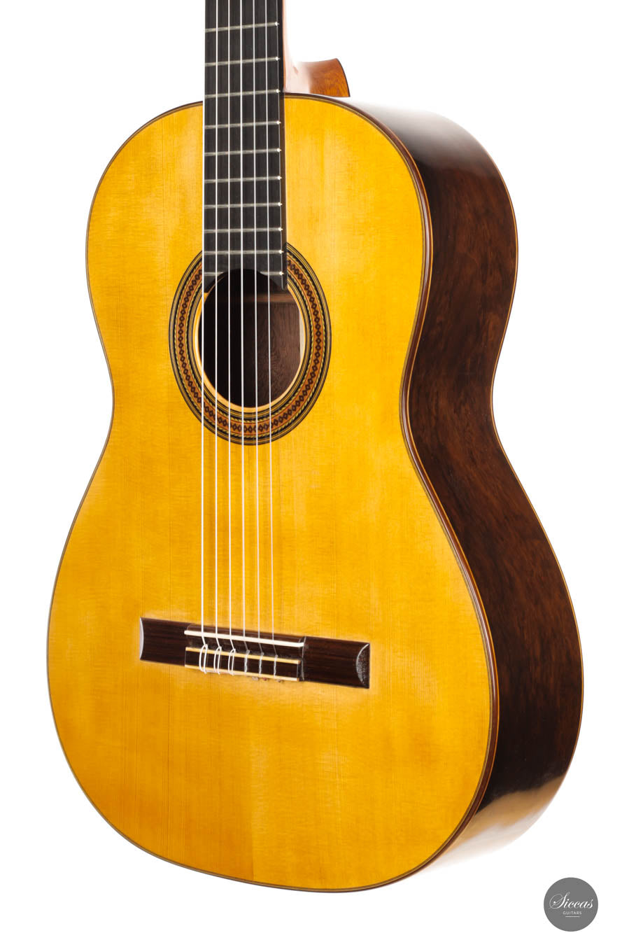 Karl-Hermann Schäfer is undoubtedly one of the few modern luthiers with a profound understanding of early 20th-century Spanish guitar making, particularly the work of Santos Hernández, Antonio de Torres, and other iconic masters. This particular guitar is inspired by the guitars of Santos Hernández, and it reflects Schäfer’s dedication to authenticity, nuance, and historical detail. Tonally, the guitar is strikingly close to a Santos Hernández from the early 1930s, with a similarly angled headstock and an overall playing feel that captures the soul of the original. The instrument delivers a deep resonance between E and F, giving it a distinct “old world” character, while the basses are rich and profound, and the trebles sing with warmth, sustain, and clarity—a rare combination that few luthiers can achieve. It also boasts remarkable evenness across the entire fingerboard and register, making it not only historically accurate but also a highly playable and expressive concert instrument. Internally, the spruce soundboard is supported by a 7-fan bracing system, with five symmetrical braces and two outer braces connected by small diagonal bars, forming subtle “L”-shaped figures. Similar pattern can be found in 1935 Santos Hernandez. As a pre-loved instrument, this guitar is in excellent condition, with only a few minor playing marks. It could easily be rated as near mint, and stands as a beautiful and faithful homage to one of the greatest luthiers of the classical guitar tradition.Regular care extends the life of the instrument