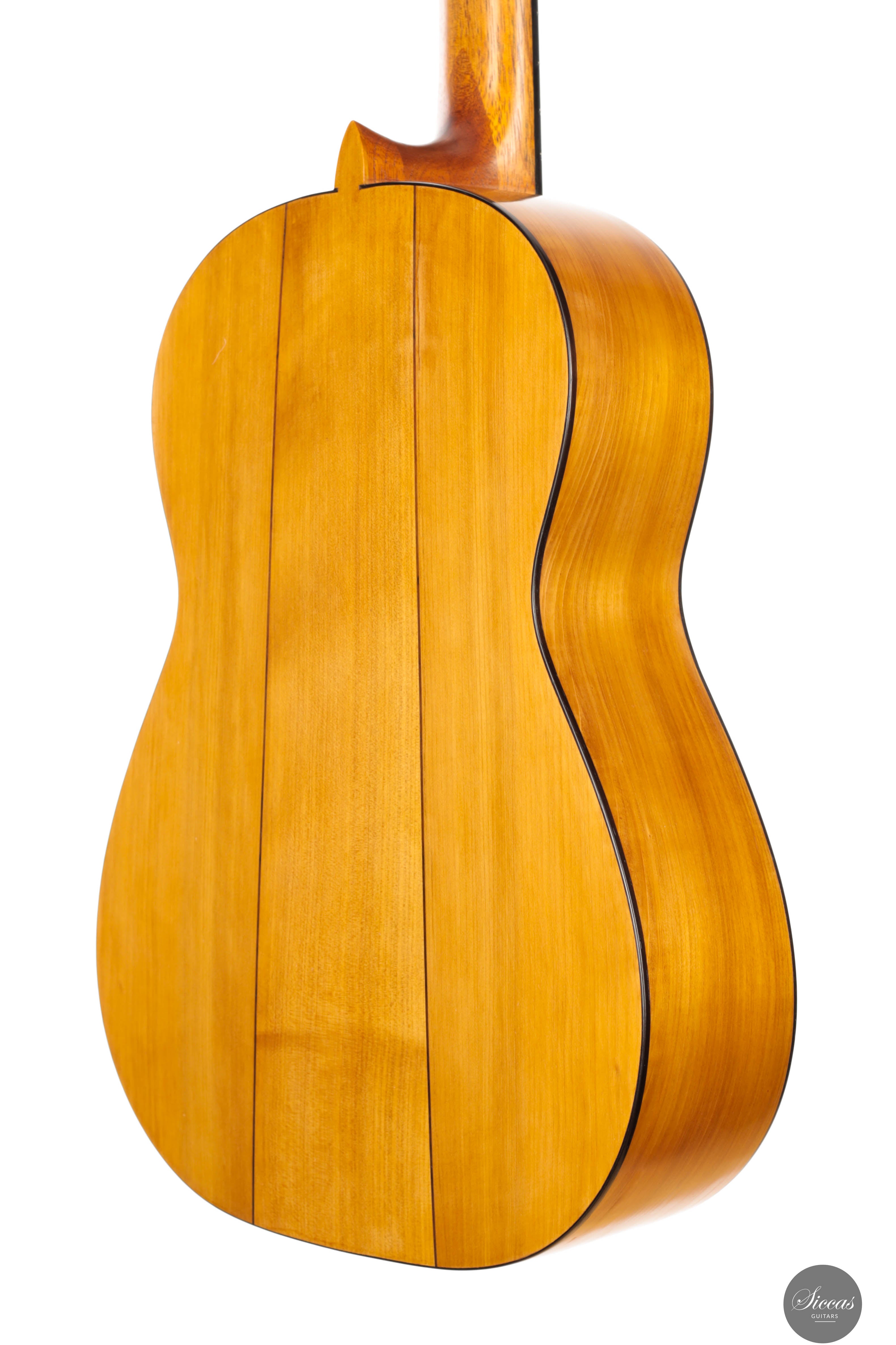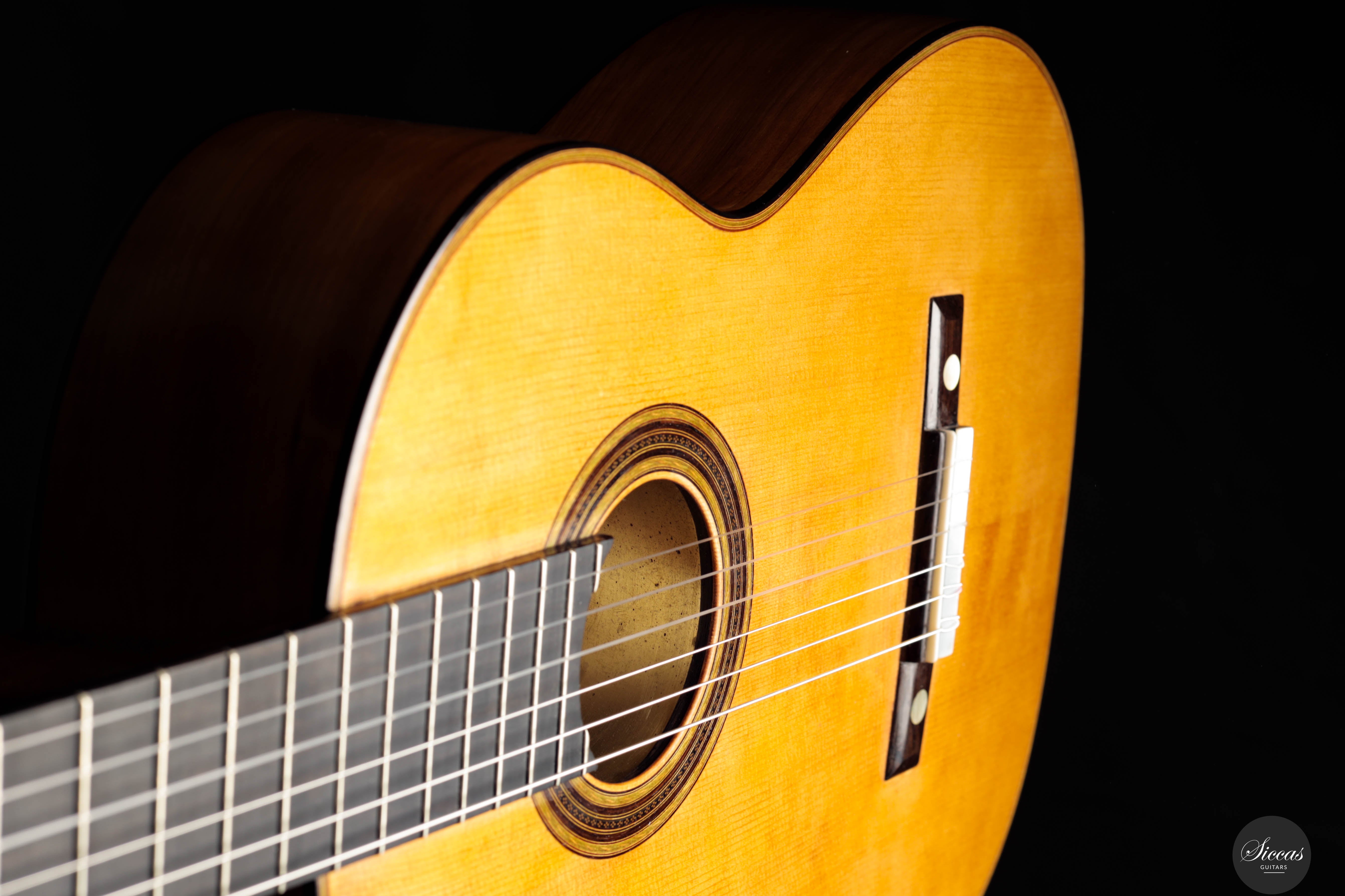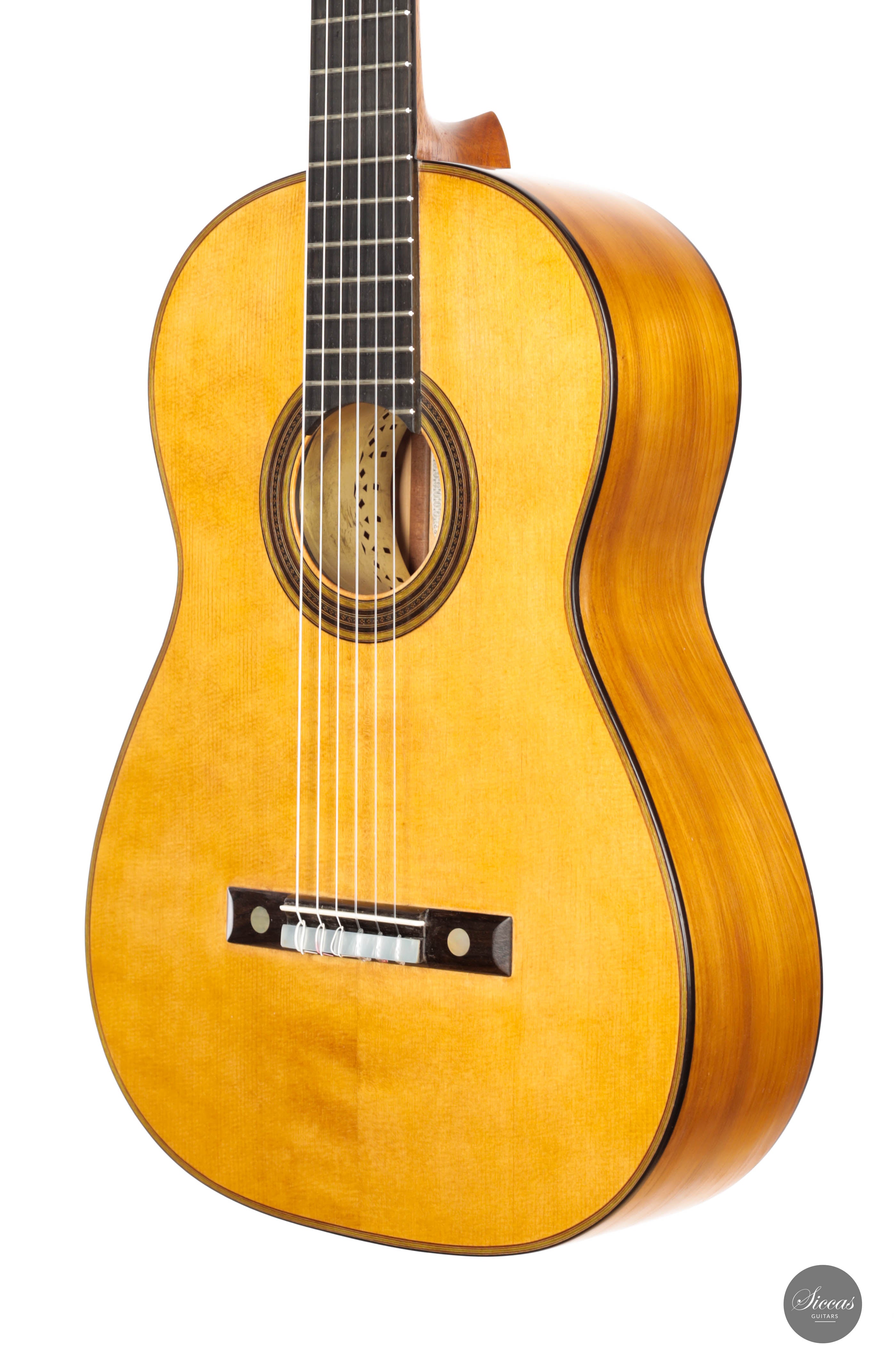 This beautiful instrument is a faithful replica of Antonio de Torres’ FE-09, built in 1859 and famously played by Miguel Llobet. The original guitar is preserved at the Museu de la Música in Barcelona, and this replica remains true to its character and construction—including the tornavoz, just like the original. The guitar beautifully captures the unique sound of Torres, especially the warm, round trebles that define his instruments. Thanks to the very thin soundboard and cypress back and sides, the guitar is incredibly light, weighing only 1,285 grams including the tuners. Its air resonance lies between D♯ and E, contributing to its distinctive “old world” charm. Despite the low body resonance, the basses, mids, and trebles all exhibit long sustain, making the instrument highly expressive and full of character. This guitar practically invites the player to explore Spanish repertoire, and feels particularly suited for the music of Tárrega and his contemporaries.Condition