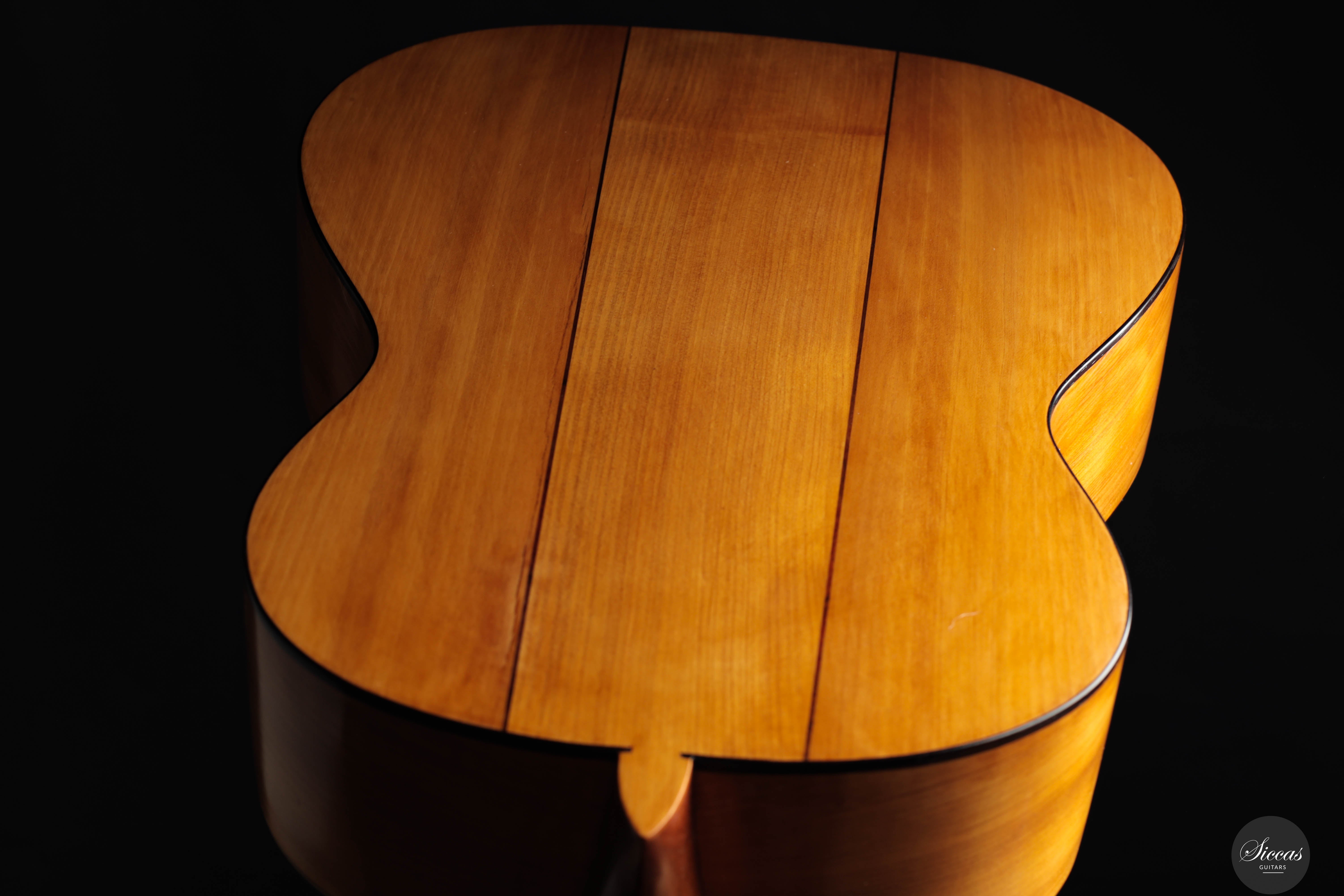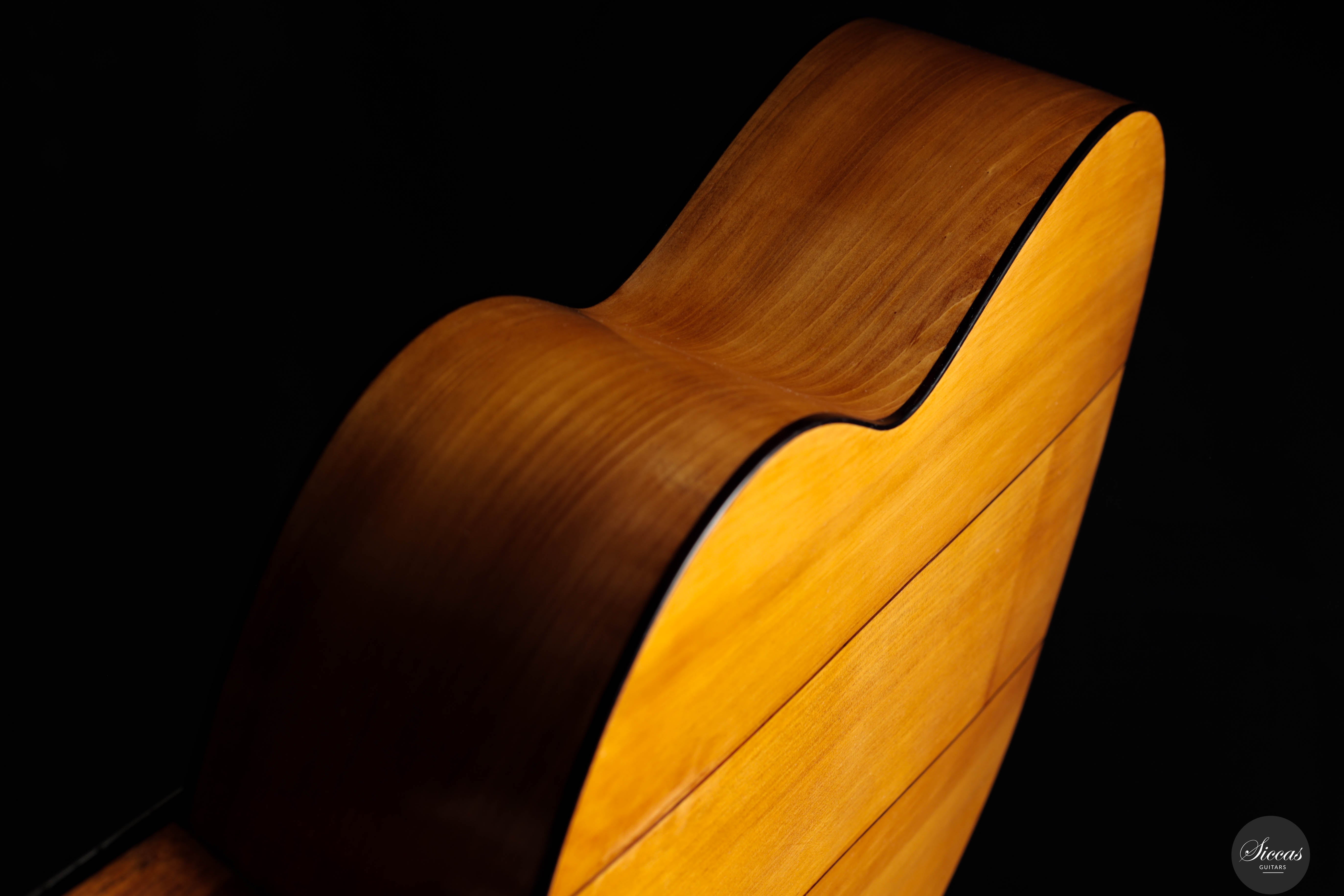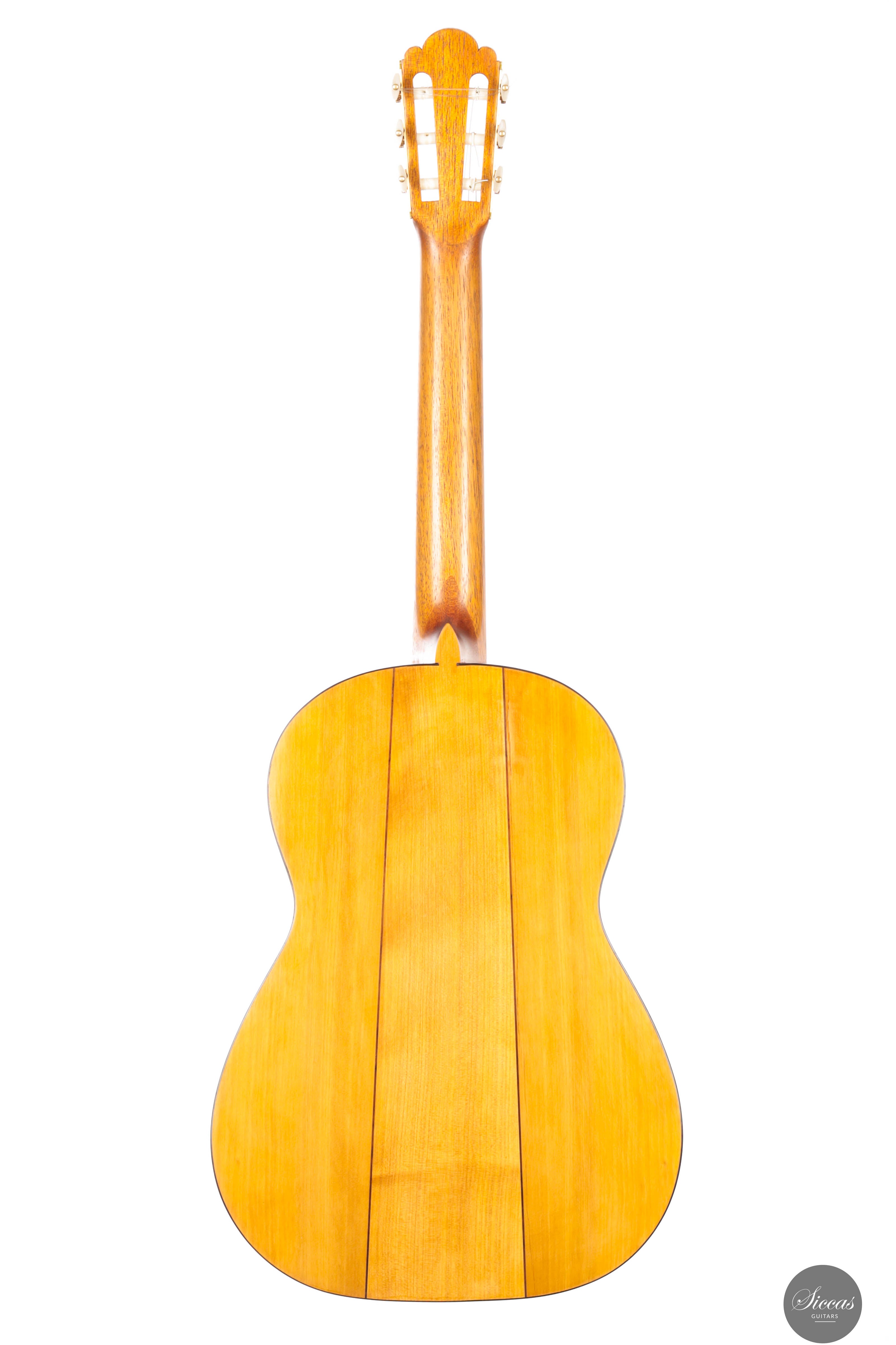 This beautiful instrument is a faithful replica of Antonio de Torres’ FE-09, built in 1859 and famously played by Miguel Llobet. The original guitar is preserved at the Museu de la Música in Barcelona, and this replica remains true to its character and construction—including the tornavoz, just like the original. The guitar beautifully captures the unique sound of Torres, especially the warm, round trebles that define his instruments. Thanks to the very thin soundboard and cypress back and sides, the guitar is incredibly light, weighing only 1,285 grams including the tuners. Its air resonance lies between D♯ and E, contributing to its distinctive “old world” charm. Despite the low body resonance, the basses, mids, and trebles all exhibit long sustain, making the instrument highly expressive and full of character. This guitar practically invites the player to explore Spanish repertoire, and feels particularly suited for the music of Tárrega and his contemporaries.Condition