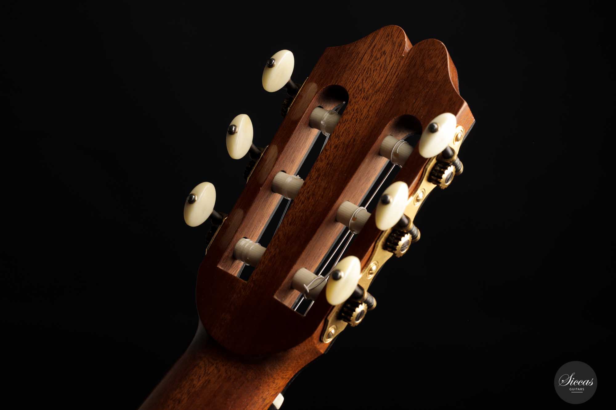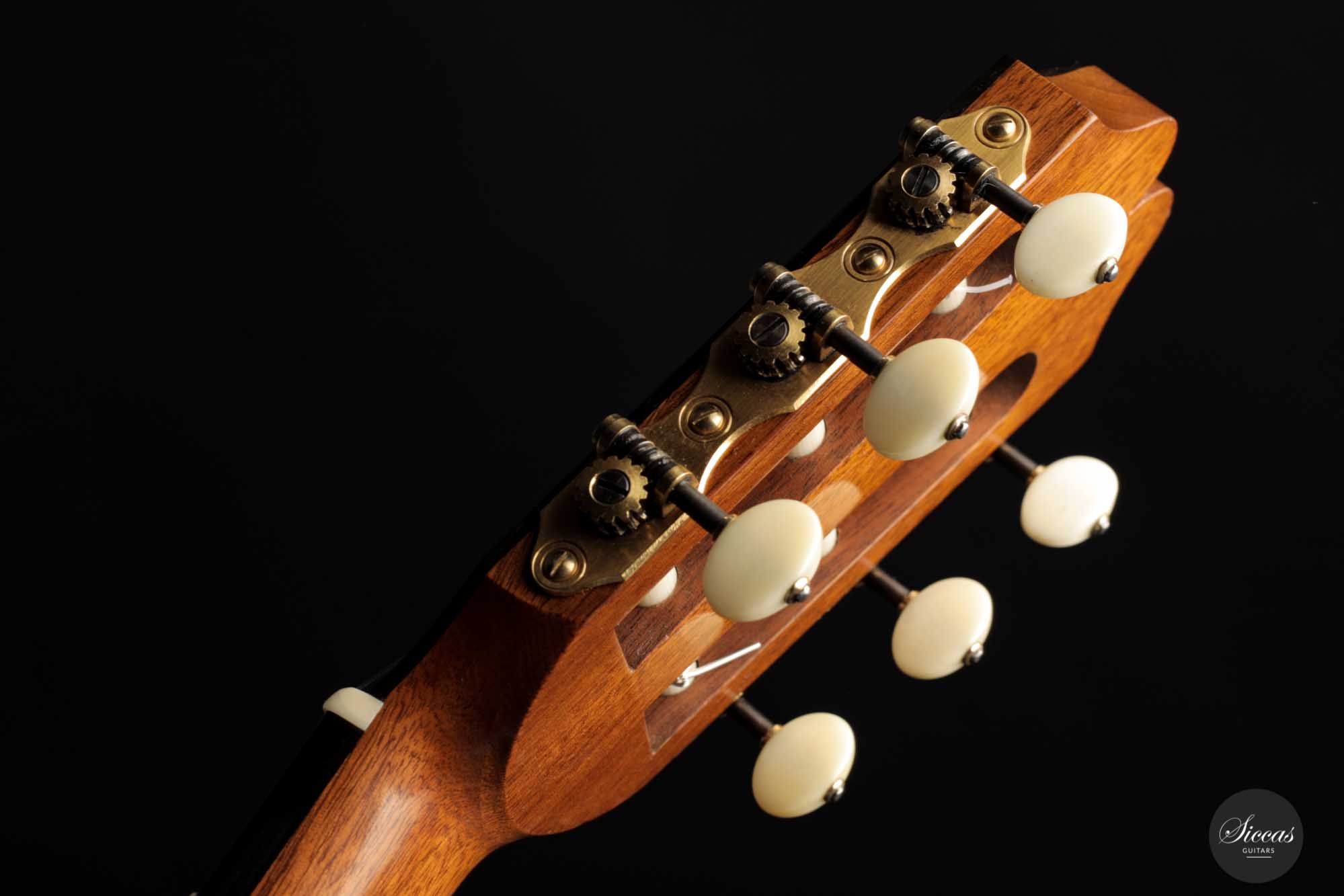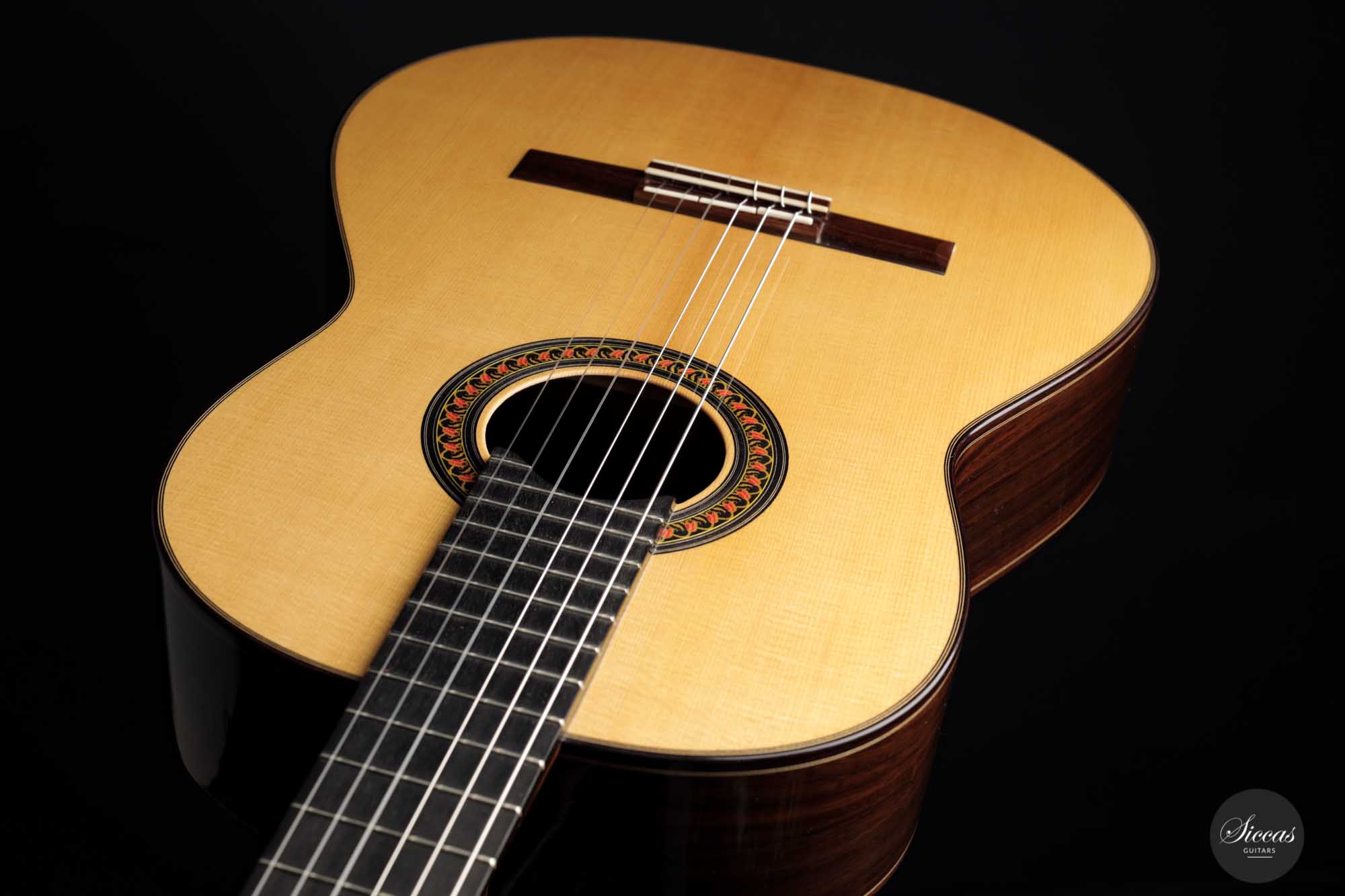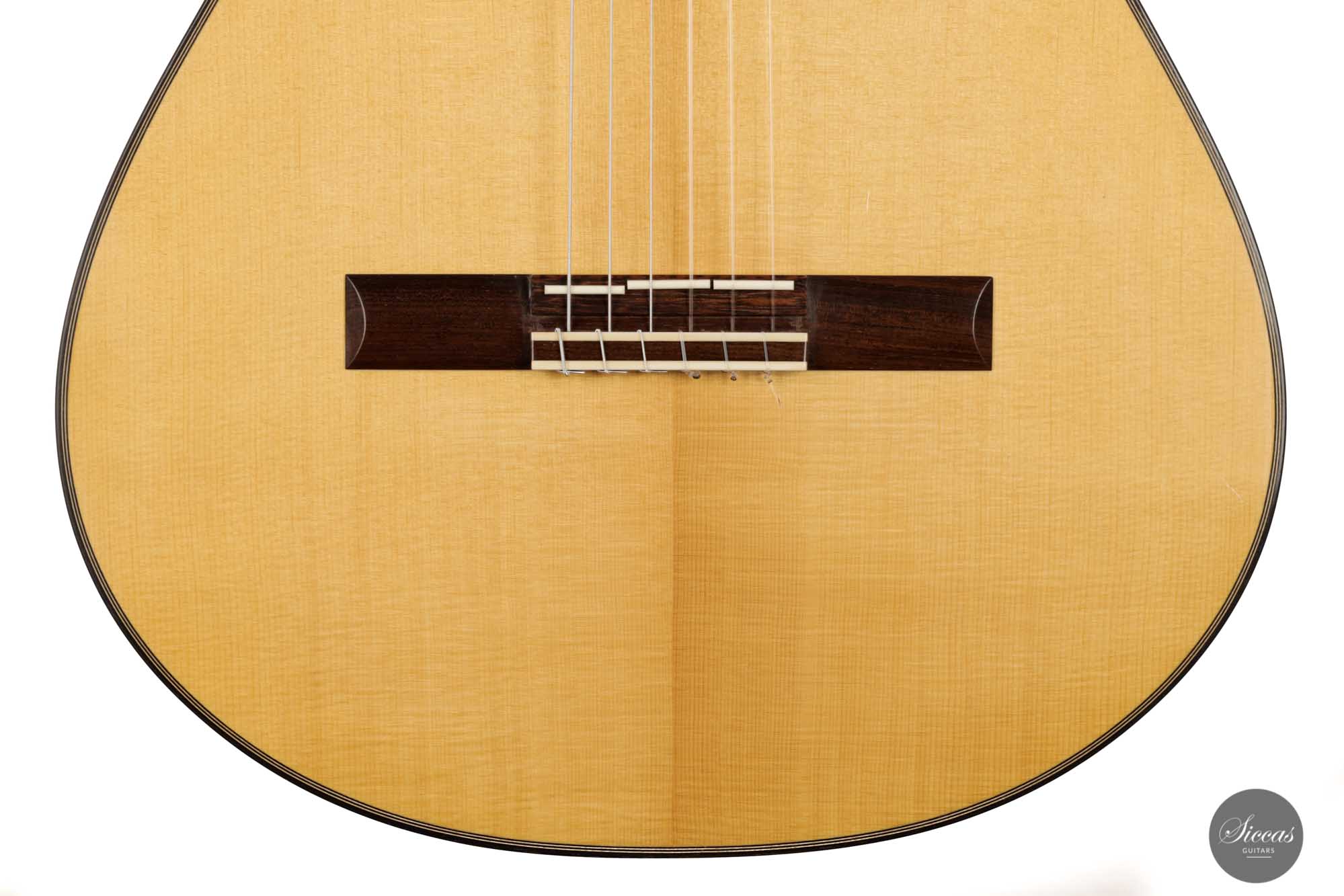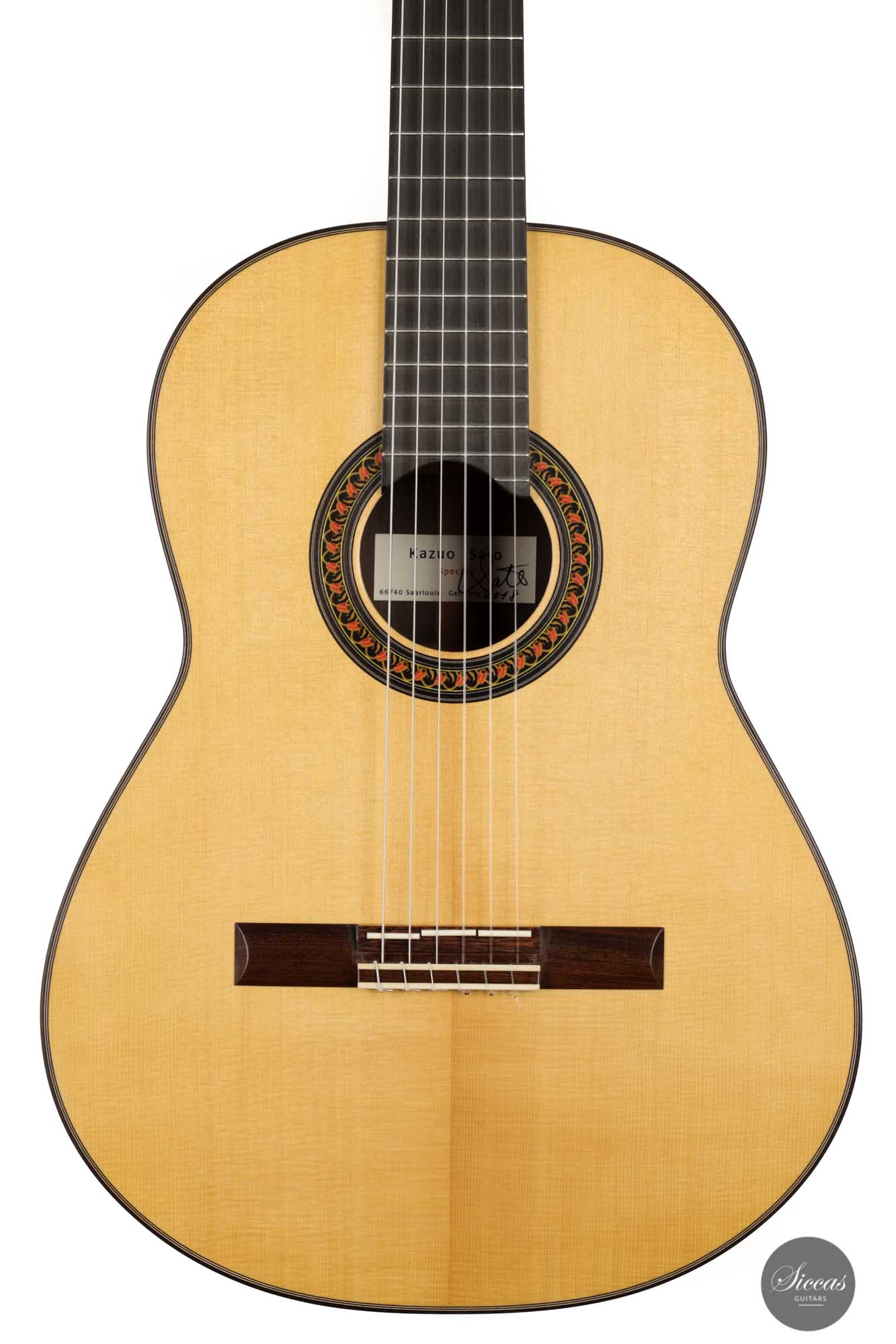 This guitar, built in 2018, is a chef-d'oeuvre. With its 63 cm scale length, this instrument offers an outstanding playing comfort for the left hand. This top-of-the-line model by Kazuo Sato, called the model "Special", is a little gem: built with first-class CITES certified Brazilian rosewood, it also features rare Reischl tuners. An interesting detail of this unique guitar is its bridge, which has a clever intonation system allowing the guitarist to precisely adjust the length of every single string individually by moving the three-piece bone. This guitar was thoroughly played and has some superficial playing marks; besides these, it is in fantastic condition and has a fully open and mature sound. The quality of its timbre is spectacular, and one can feel and hear the master's 55 years of experience in crafting first-class concert guitars.