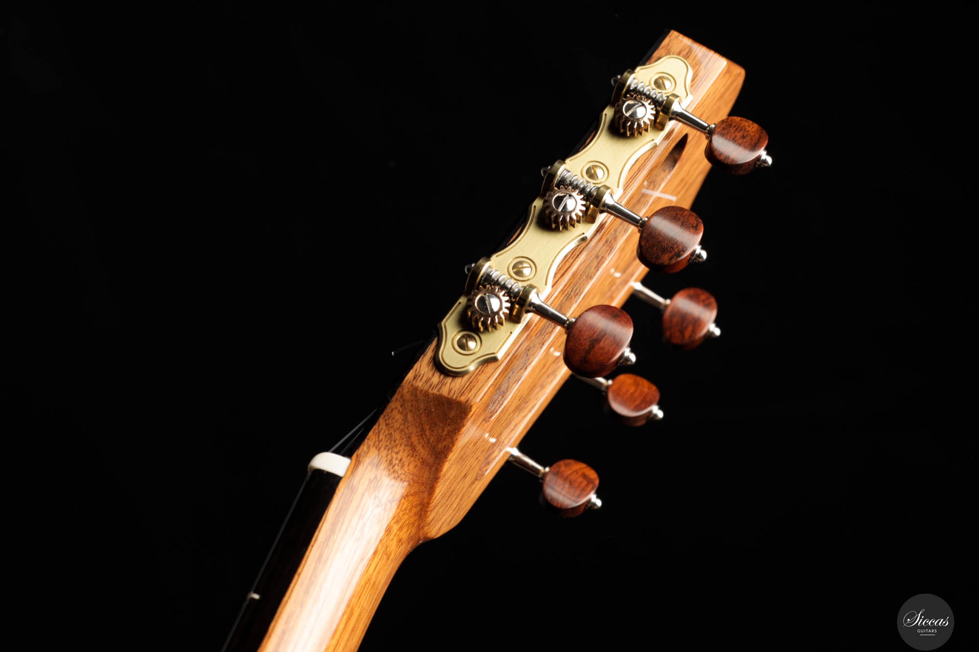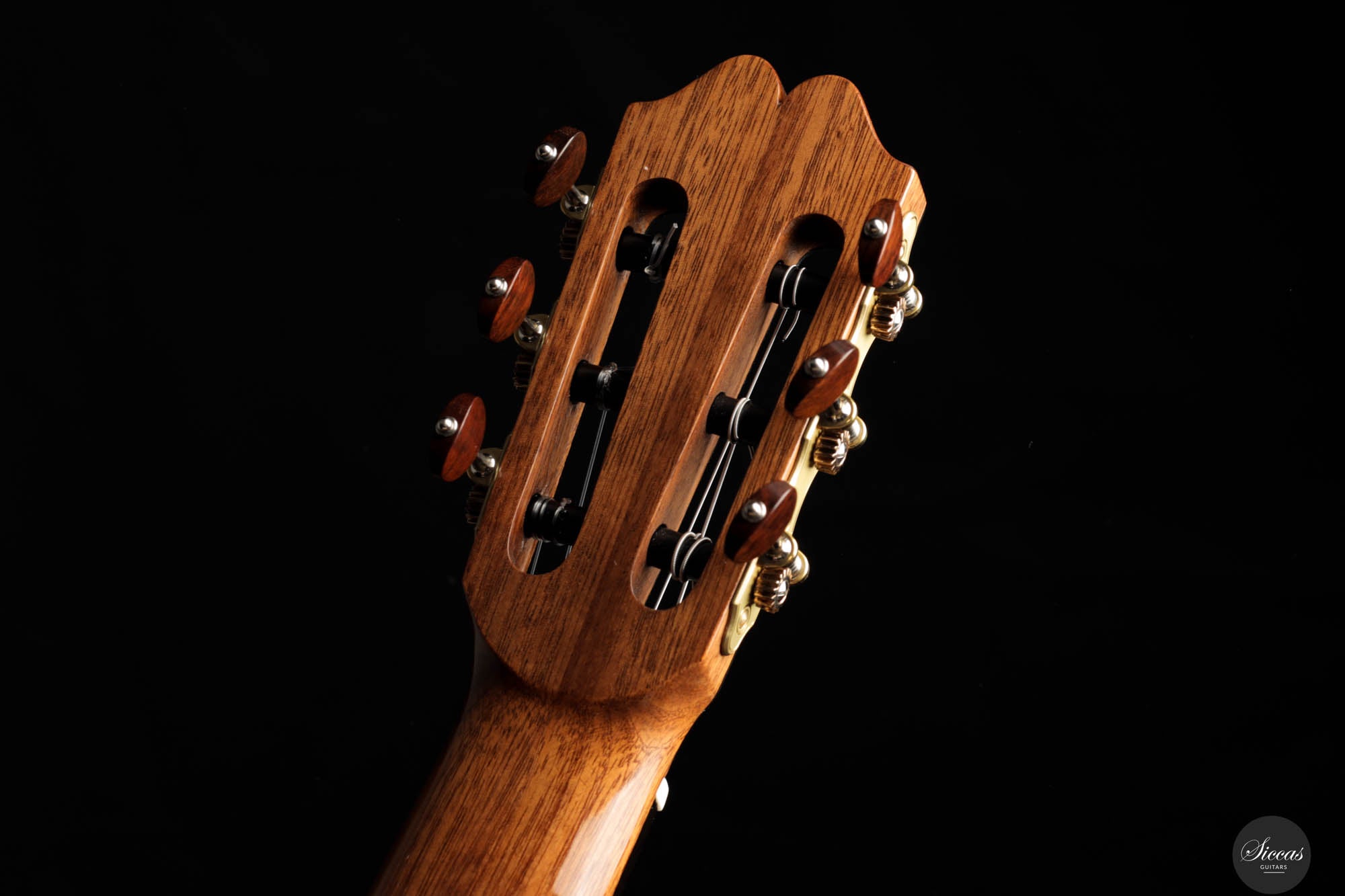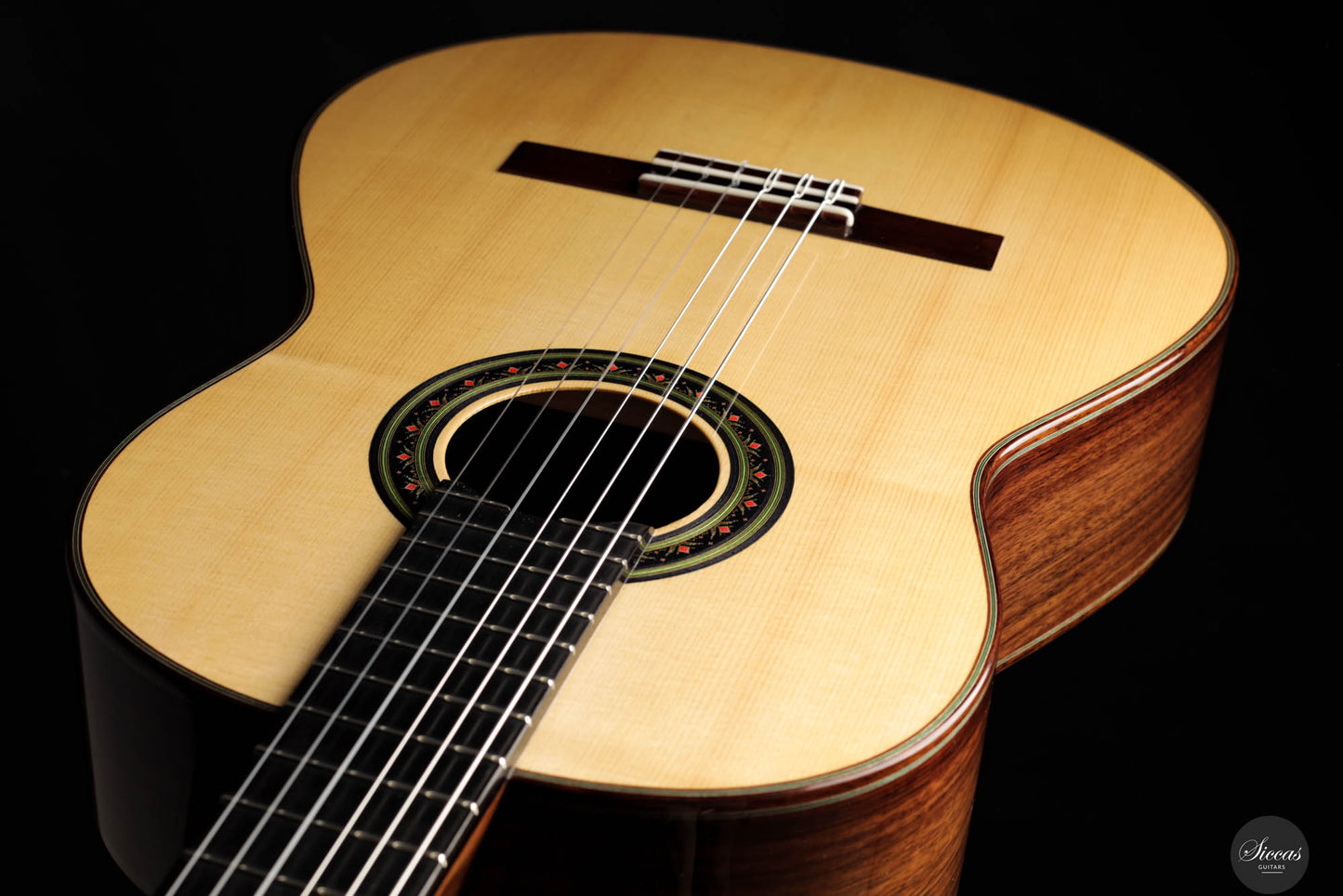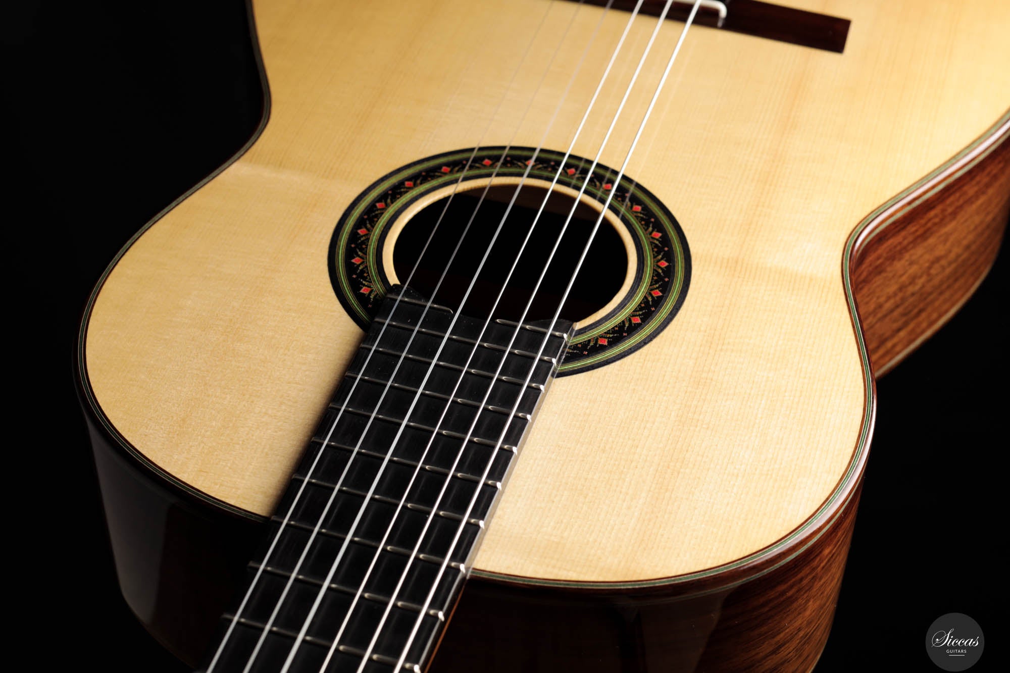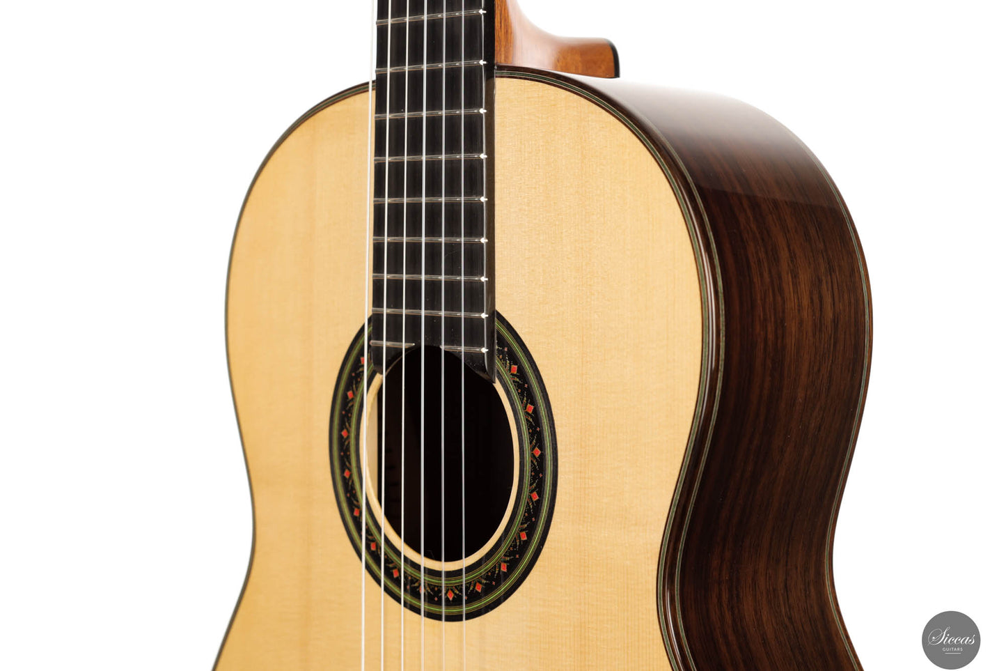 This exquisite guitar features a top crafted from fine Alpine spruce, known for its superb sound quality, paired beautifully with the aesthetically pleasing and sonorous Indian rosewood for the back and sides. The overall appearance exudes refined elegance, enhanced by the shellac finish that not only protects but also adds a lustrous sheen to the guitar. Further complementing its sophisticated design are the Alessi tuners, renowned for their precision and reliability, which contribute to the guitar's premium feel and ease of tuning.