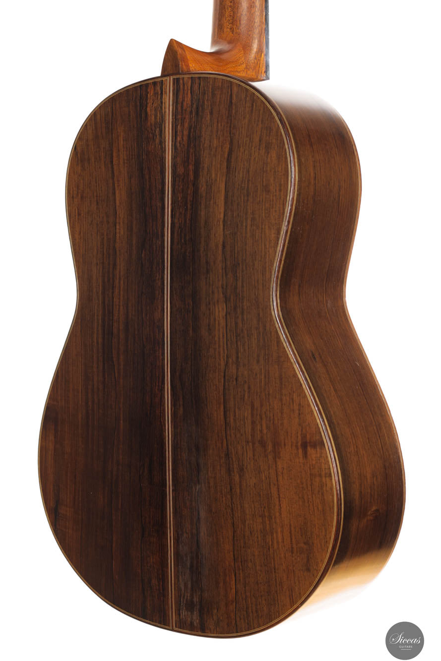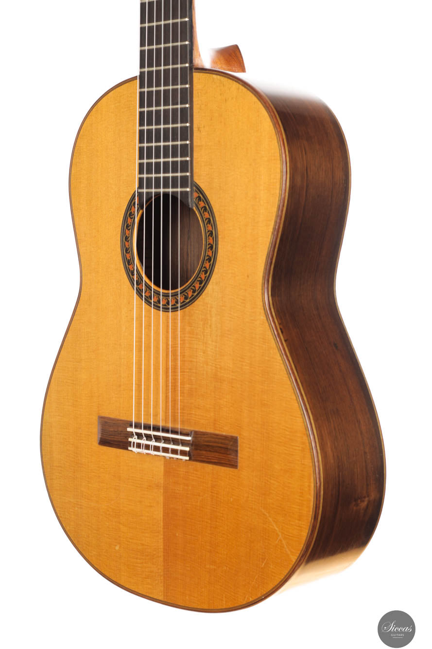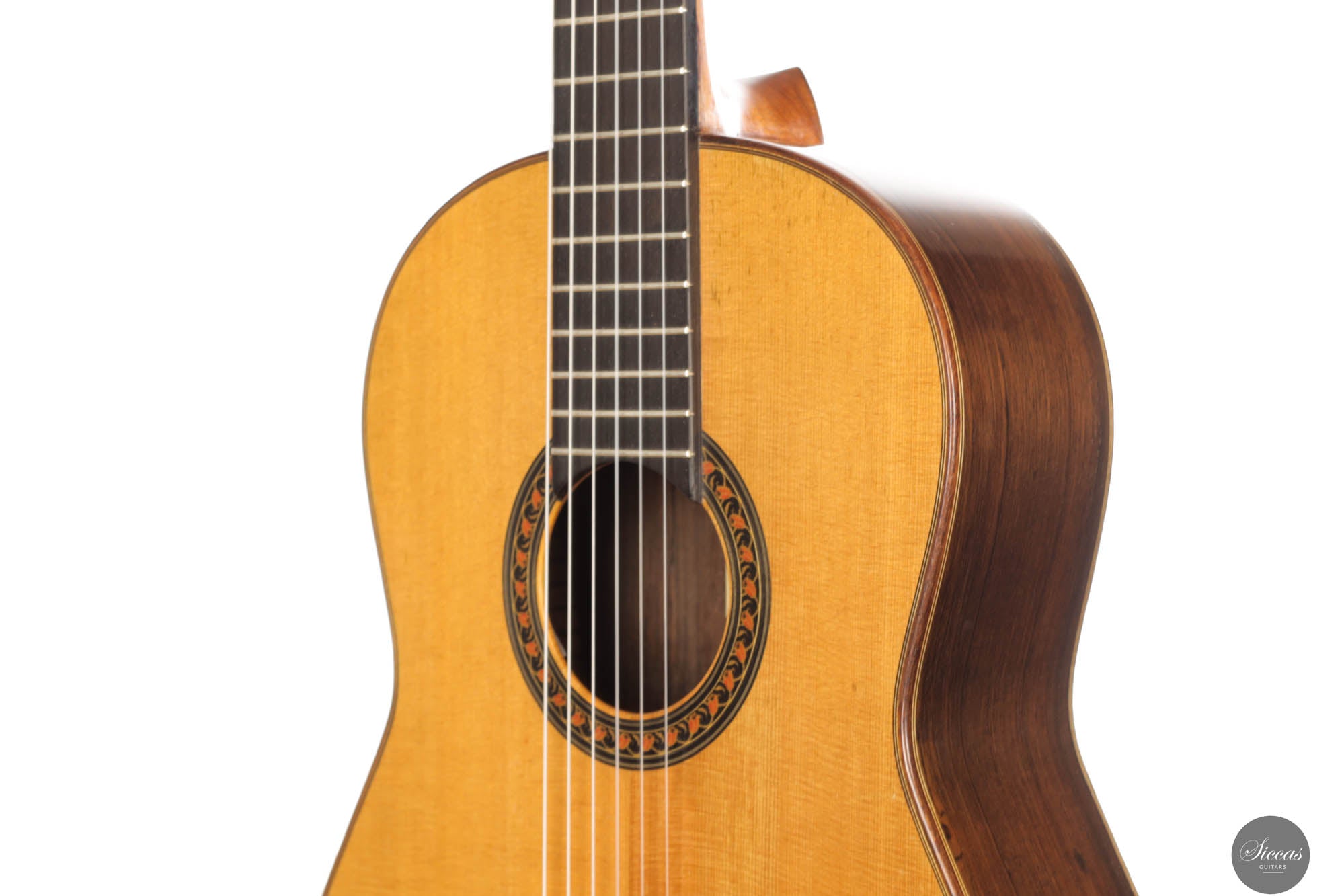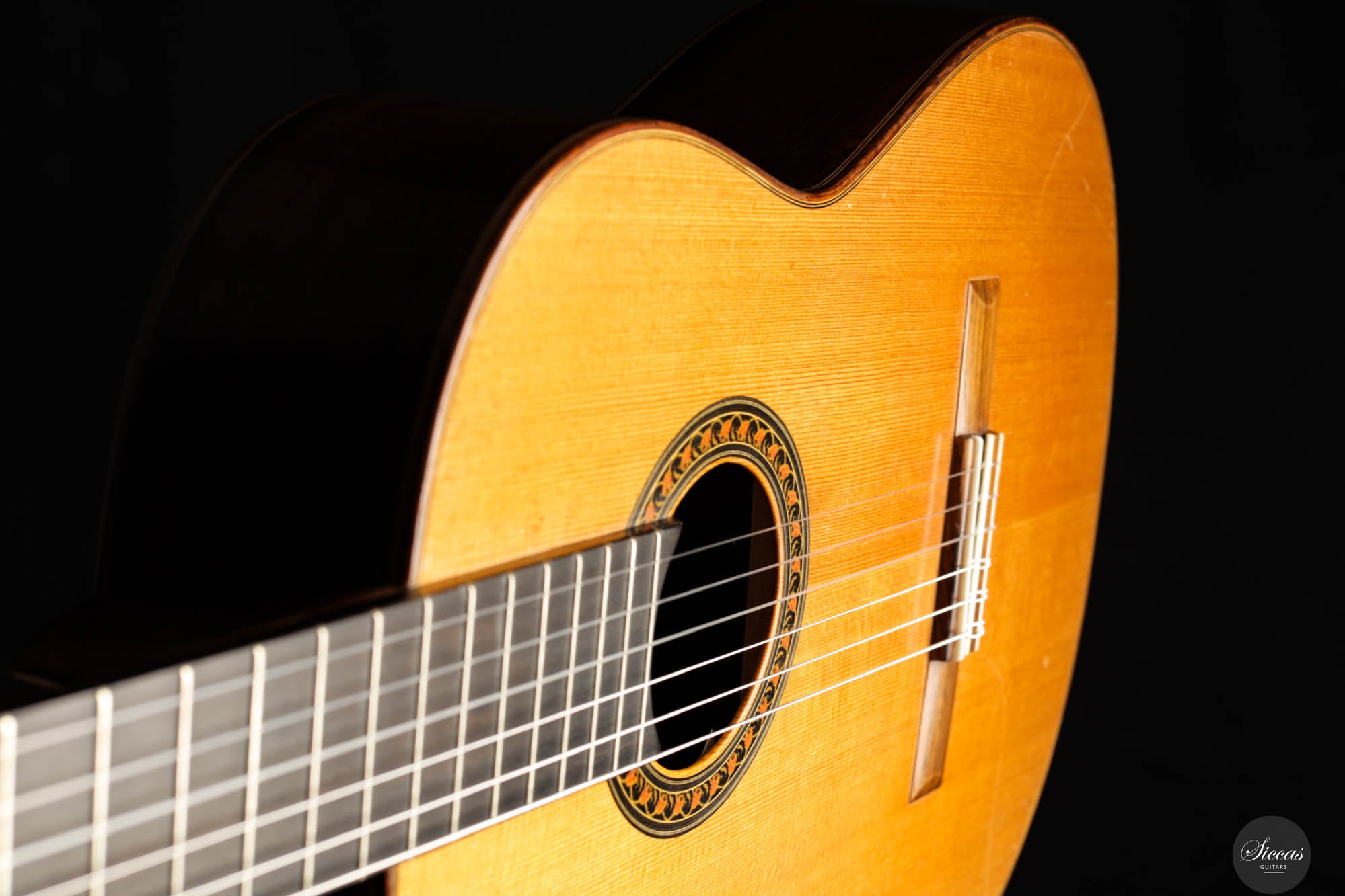Its sound is mature and refined, offering a rich tonal palette with remarkable depth and clarity. The balance across all registers is impressive, ensuring both powerful basses and clear, singing trebles. Additionally, the guitar provides outstanding playing comfort, making it an effortless joy to play. Its exceptional state of preservation, along with its tonal maturation under optimal playing conditions, makes this a superb second-hand instrument—an excellent choice for discerning guitarists seeking both quality and history in their instrument. The condition of the instrument is very good, with normal signs of wear for its age and a professionally repaired crack on the back, which is considered stable.