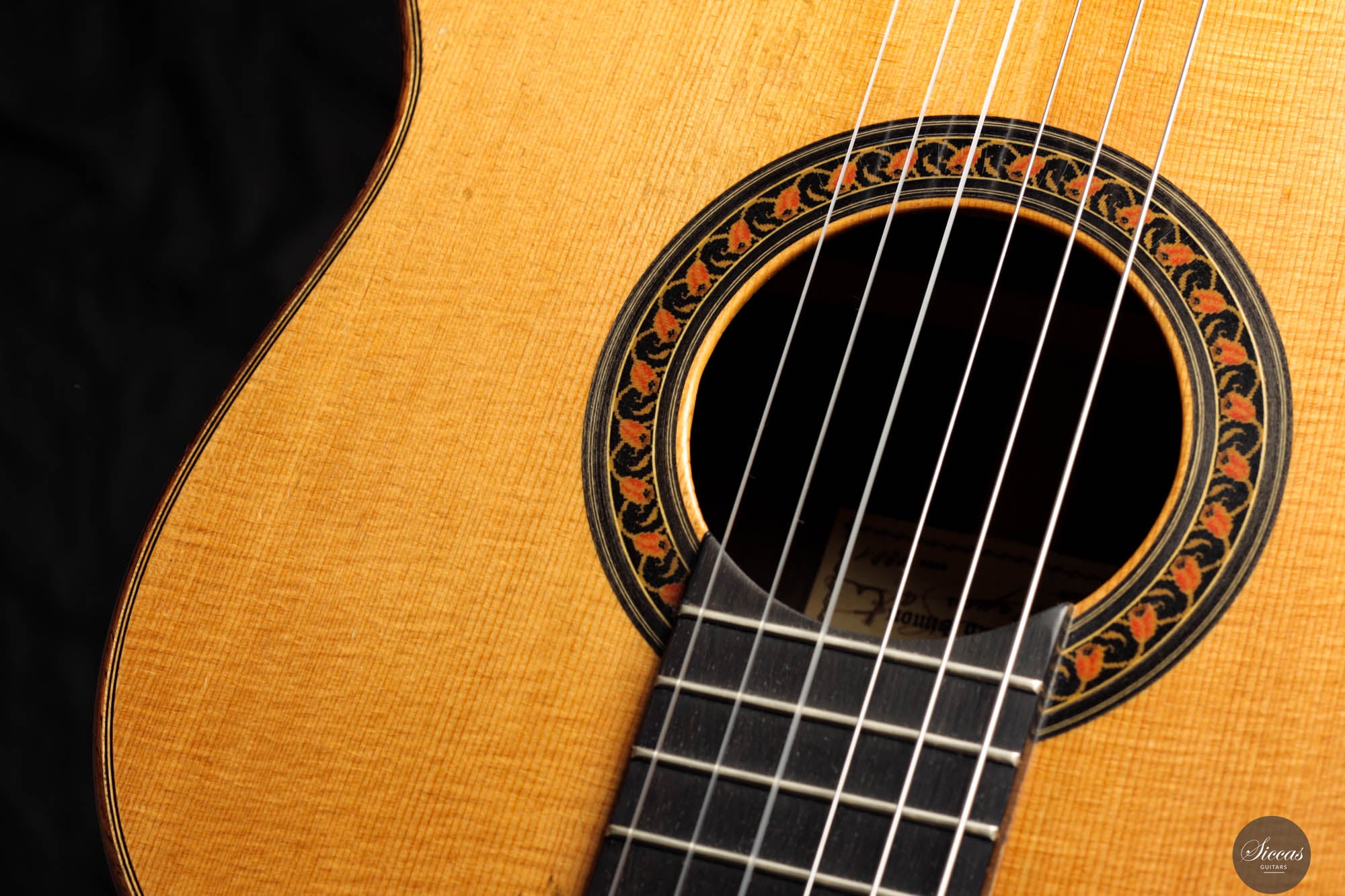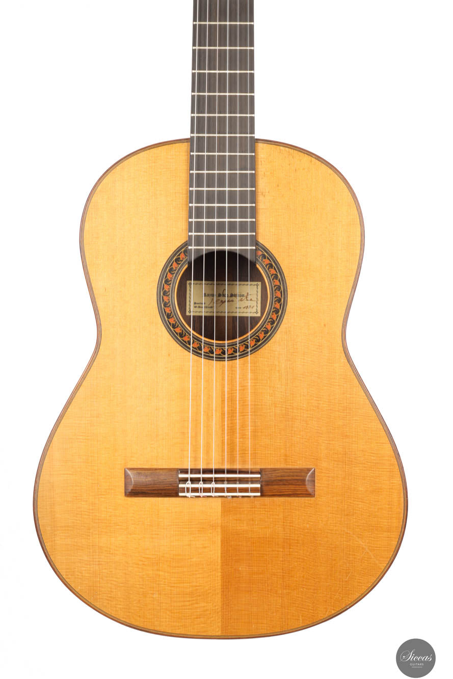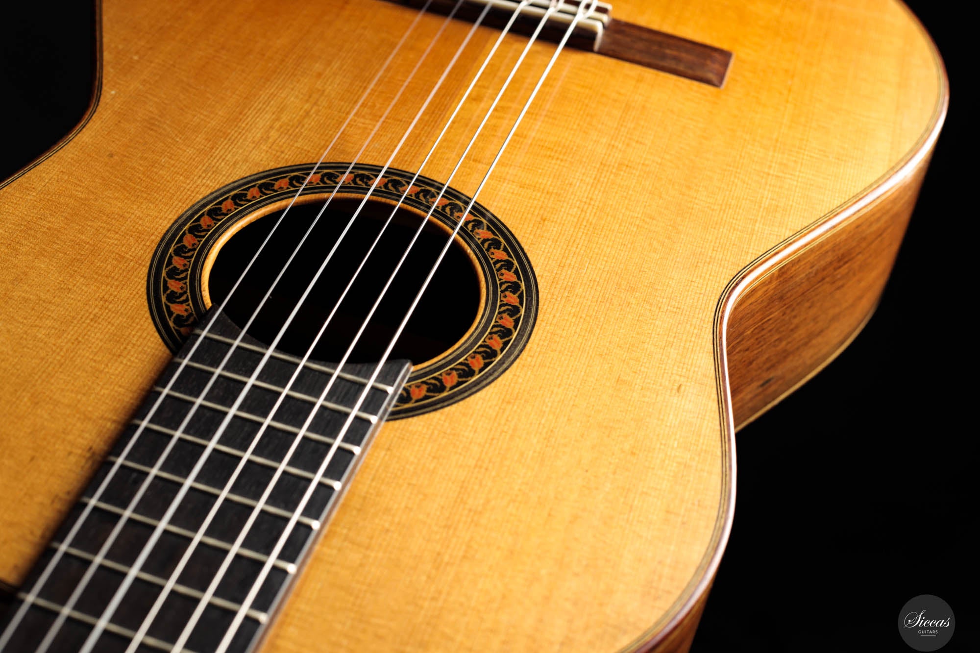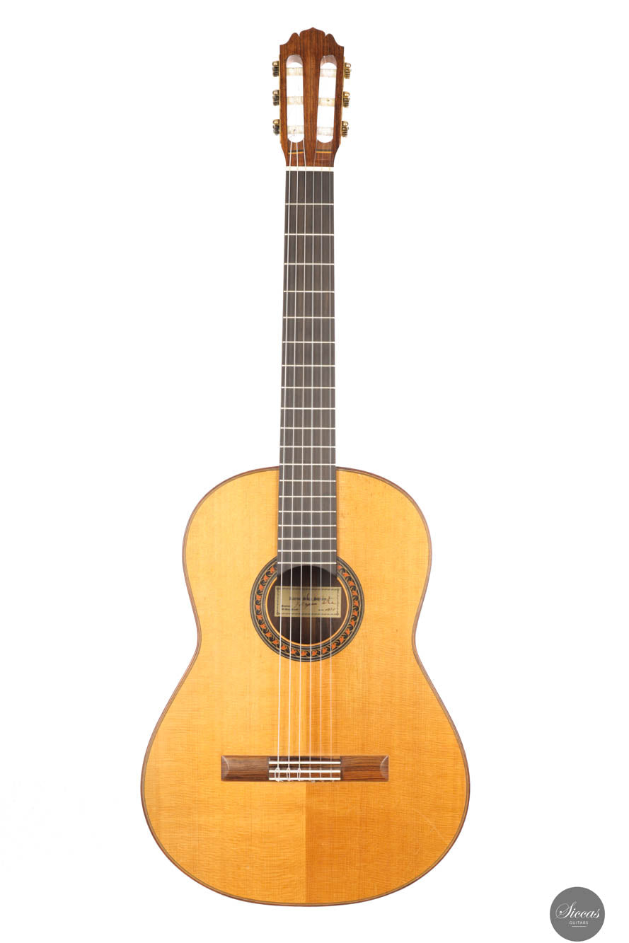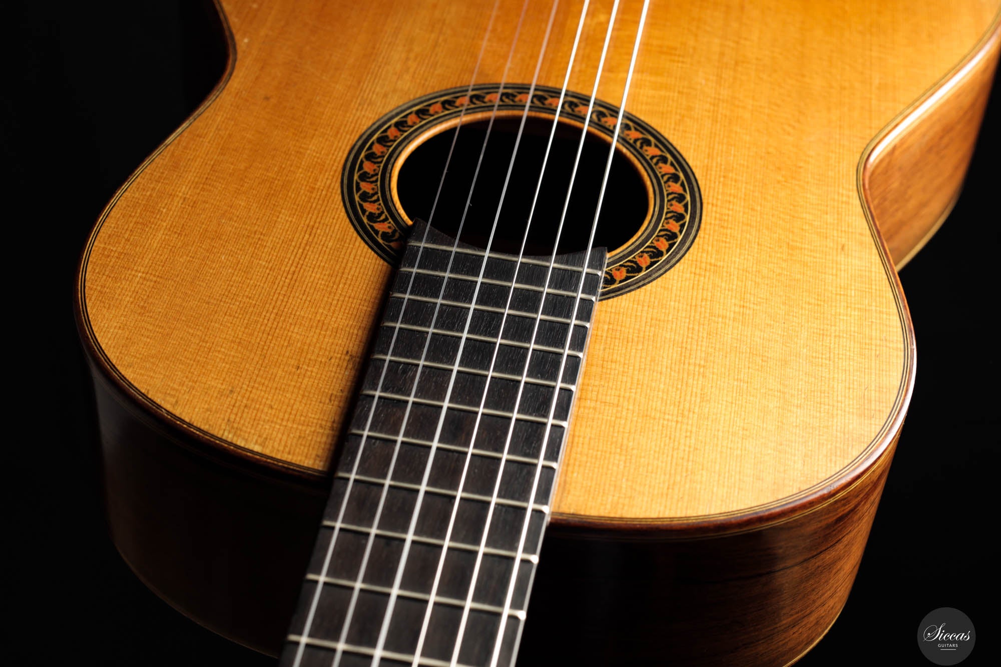 Its sound is mature and refined, offering a rich tonal palette with remarkable depth and clarity. The balance across all registers is impressive, ensuring both powerful basses and clear, singing trebles. Additionally, the guitar provides outstanding playing comfort, making it an effortless joy to play. Its exceptional state of preservation, along with its tonal maturation under optimal playing conditions, makes this a superb second-hand instrument—an excellent choice for discerning guitarists seeking both quality and history in their instrument. The condition of the instrument is very good, with normal signs of wear for its age and a professionally repaired crack on the back, which is considered stable.