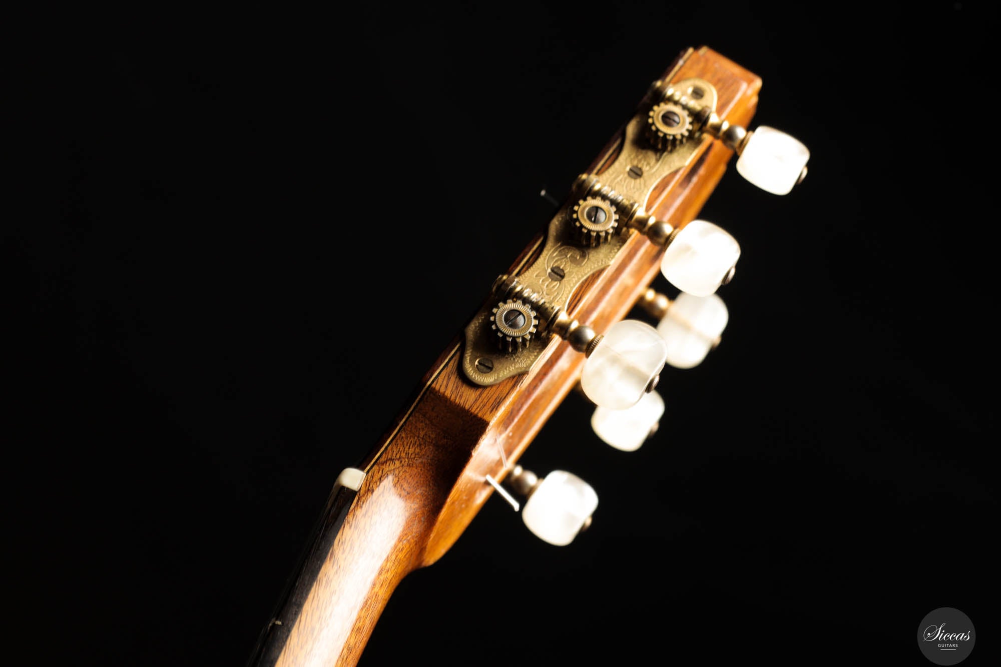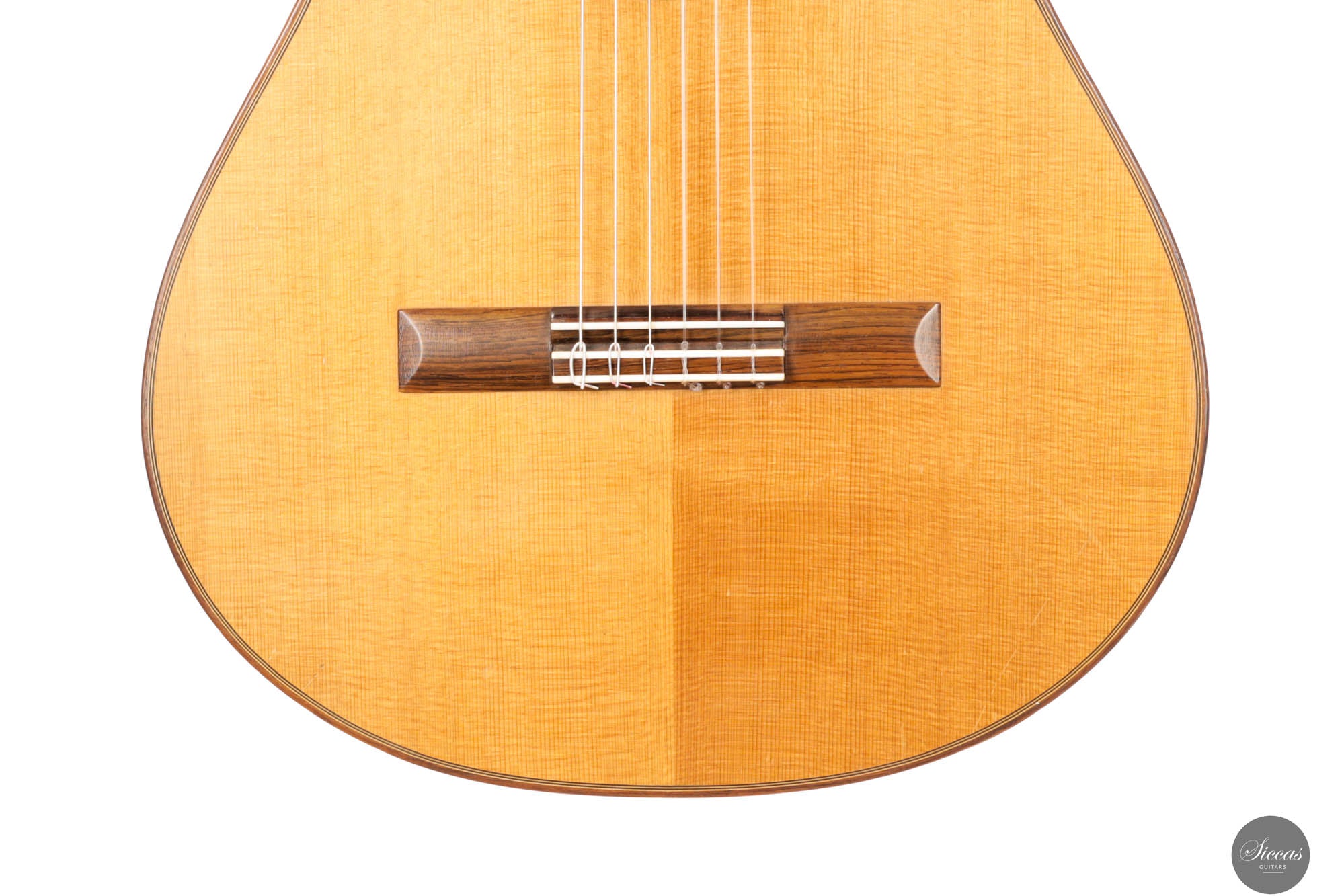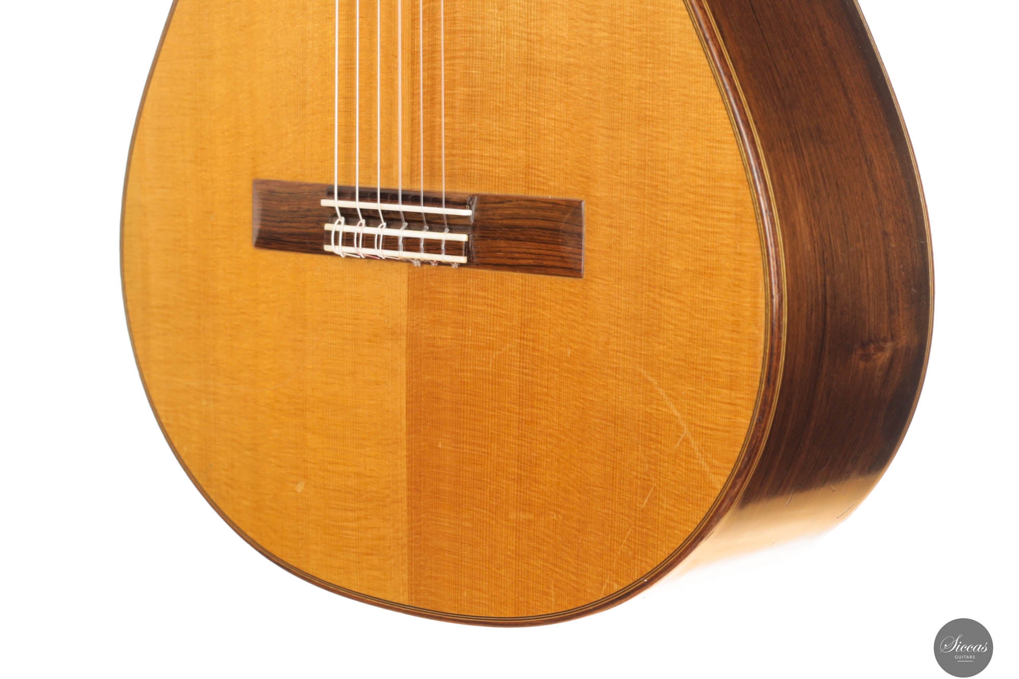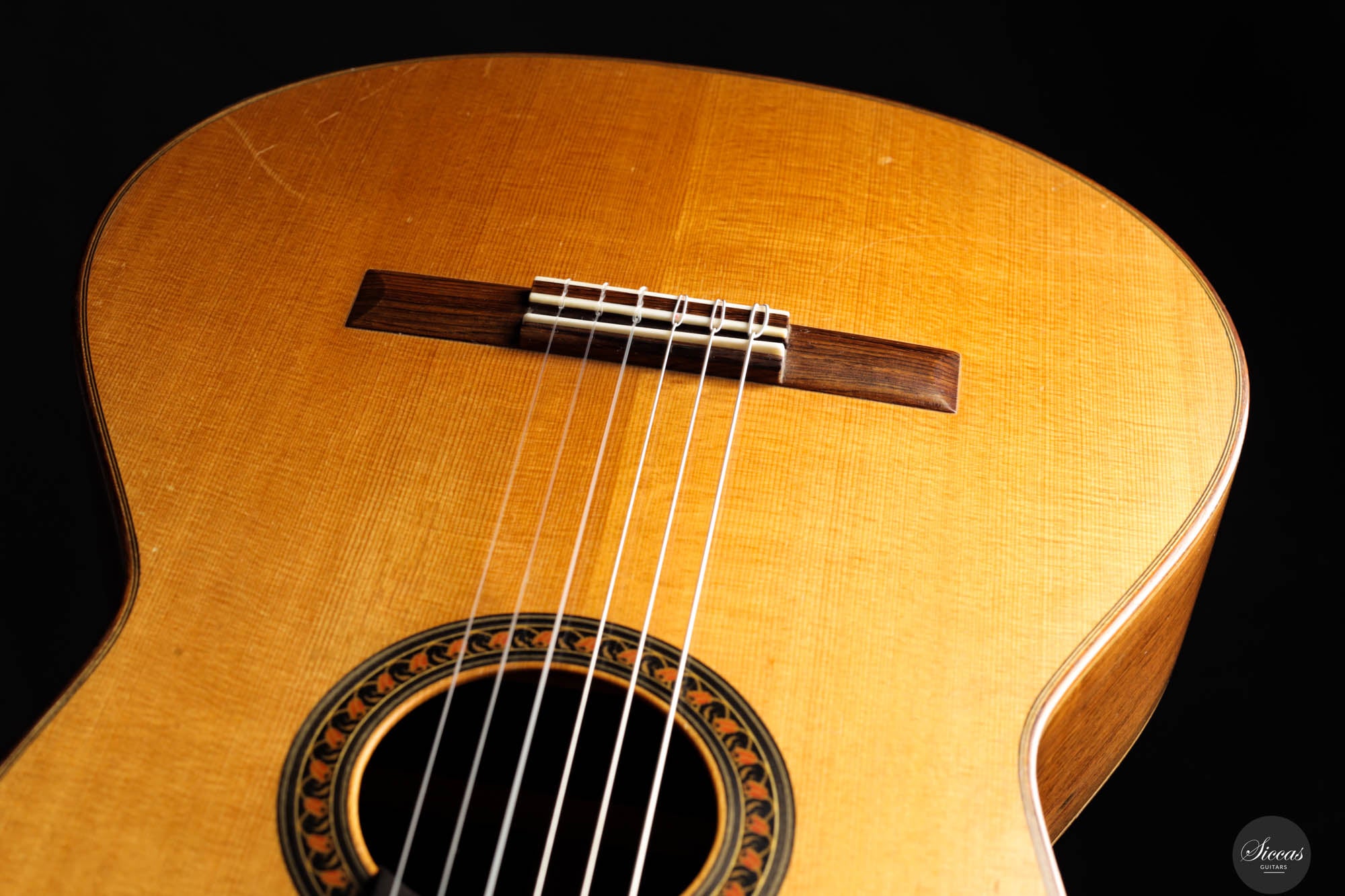 This 1981 Kazuo Sato guitar is an extraordinary instrument, featuring a spruce top paired with exquisite Brazilian rosewood back and sides. The choice of this precious tonewood enhances not only the visual elegance of the guitar but also its tonal qualities, contributing to a deep, resonant voice with exceptional sustain and warmth.