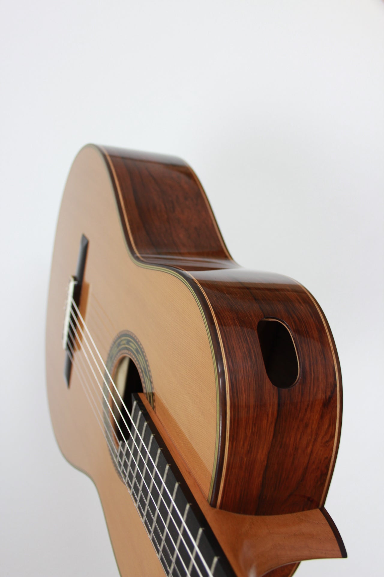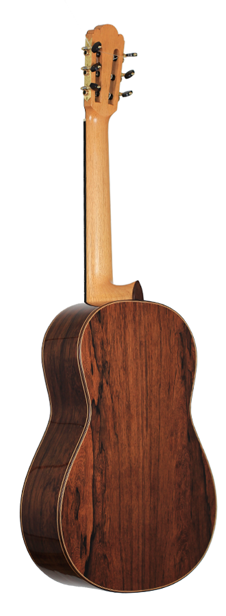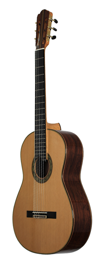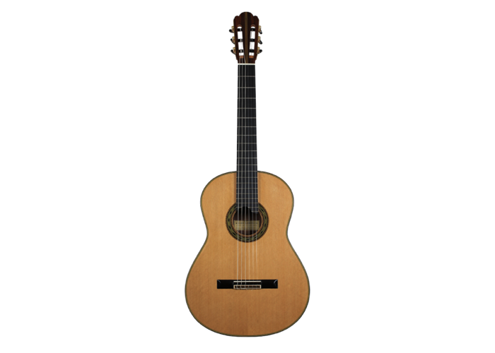 Cedar double top number 70 with Madagascar rosewood back and sides, 650 mm scale, elevated fingerboard, Alessi tuning machines, 12 hole bridge, oval soundport. D'Addario Pro Arte medium tension strings (except G which is Oasis carbon string). Included is a Hiscox PRO-GCL case.