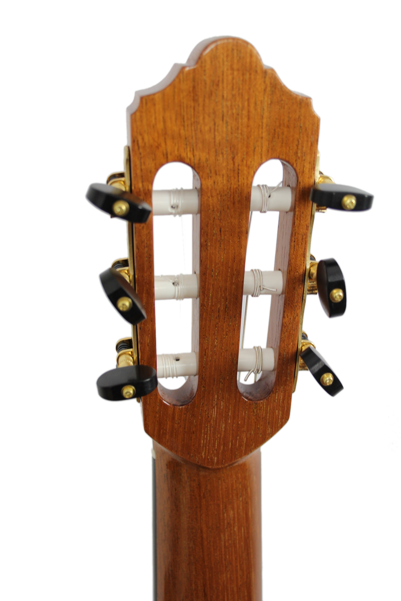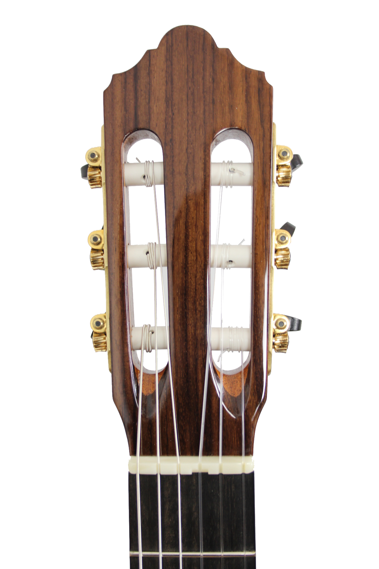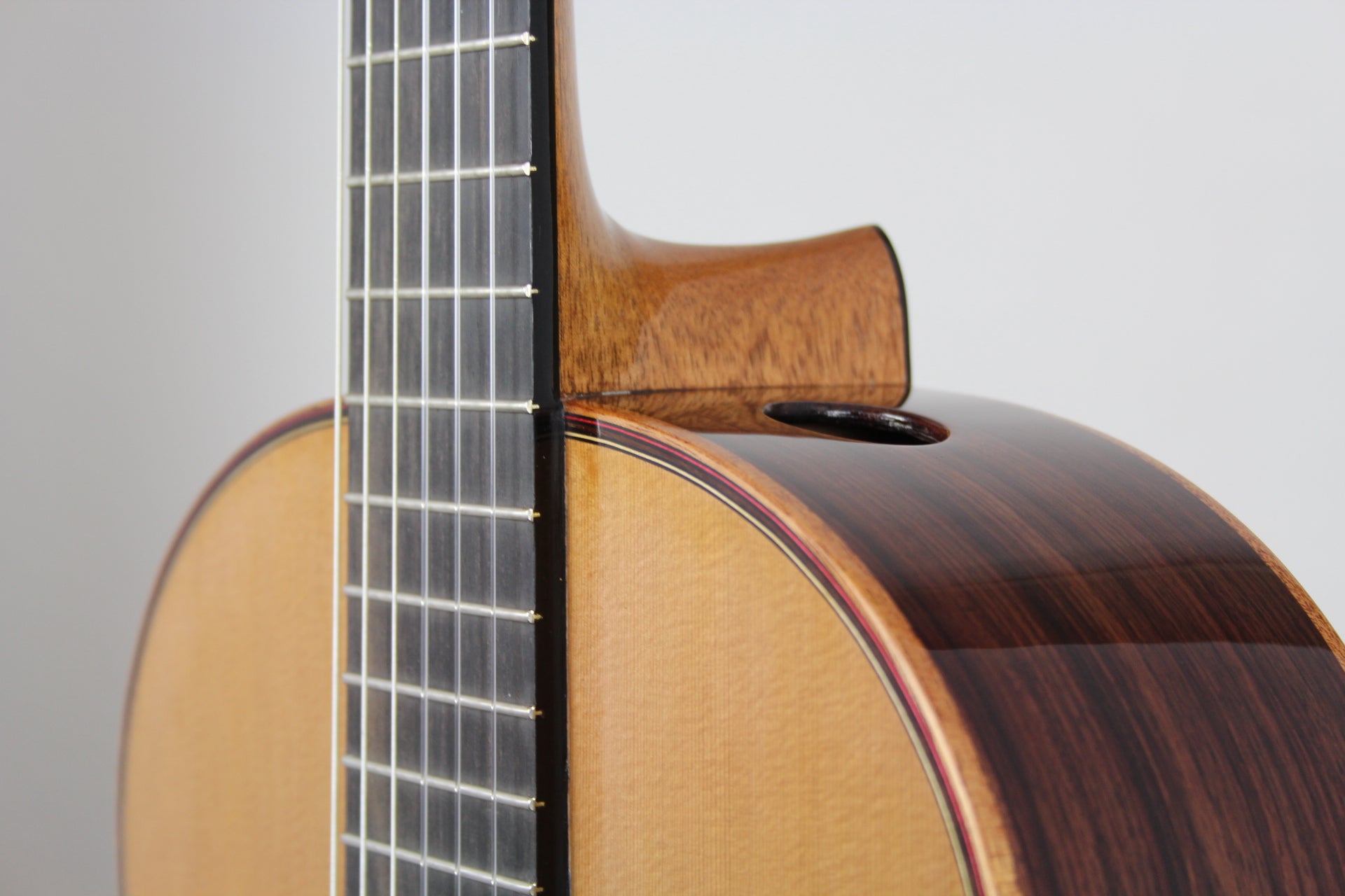 As President of Hill Guitar Company,Inc., Kenny continues to develop the Hill Guitar line in Santa Cruz building fine classical guitars for the world market. This is the location where luthiers are making the entire range of Signature, and Performance model guitars. Kenny Hill has written many articles for various guitar publications, including Acoustic Guitar, Soundboard, and American Lutherie. This guitar is designed for the player desiring a nylon string instrument with easy left hand reach. It has a double top made of two very thin layers of cedar, Nomex and spruce. In this case the cedar is facing out and gives the sound its dominant character, while the inner layer flavours it.