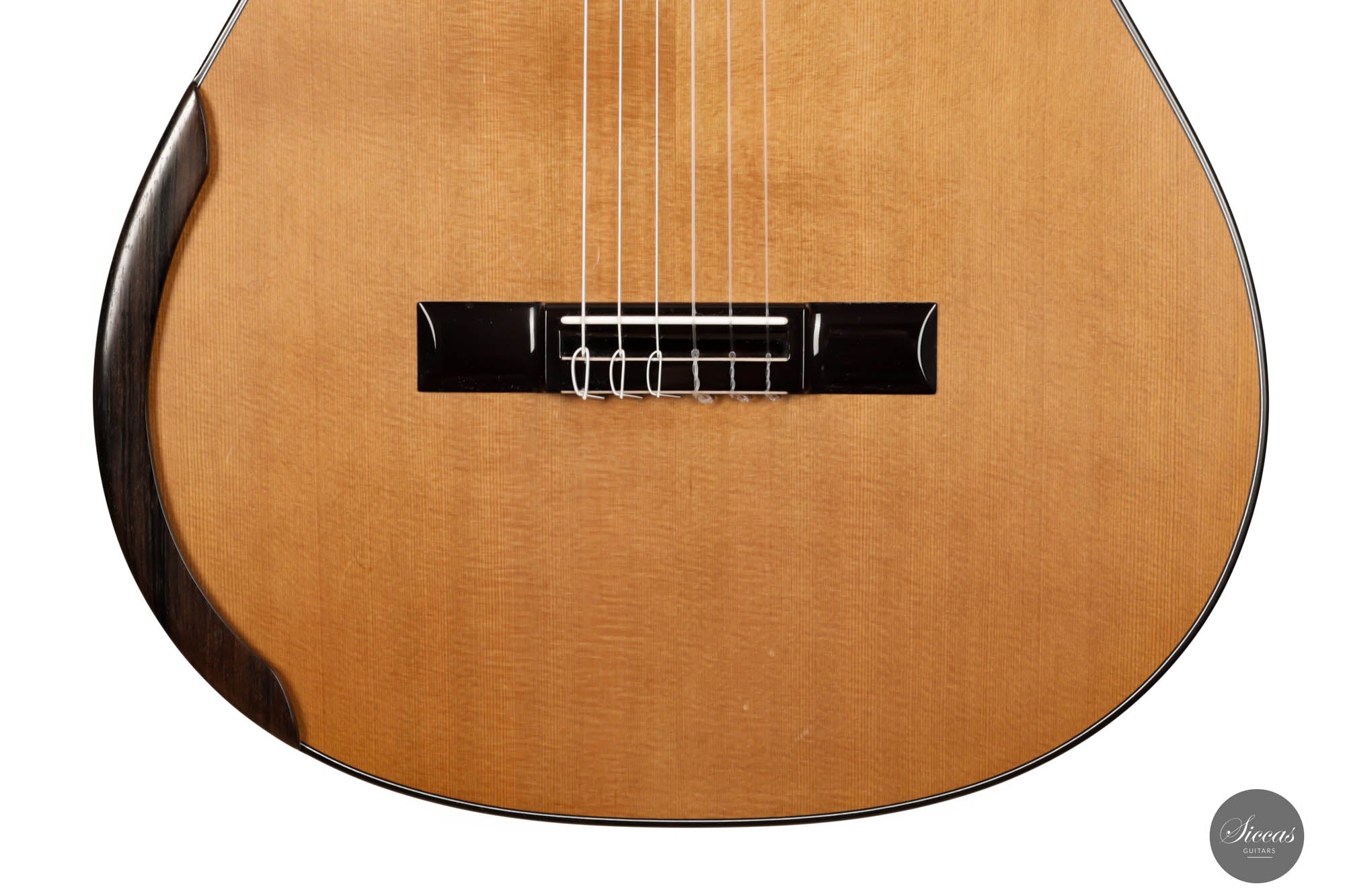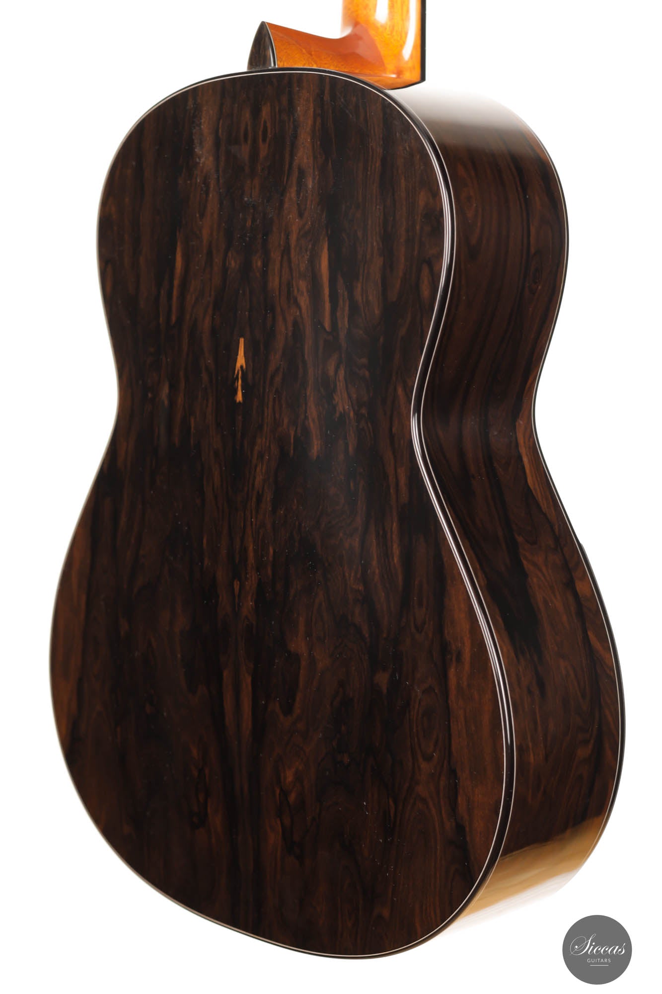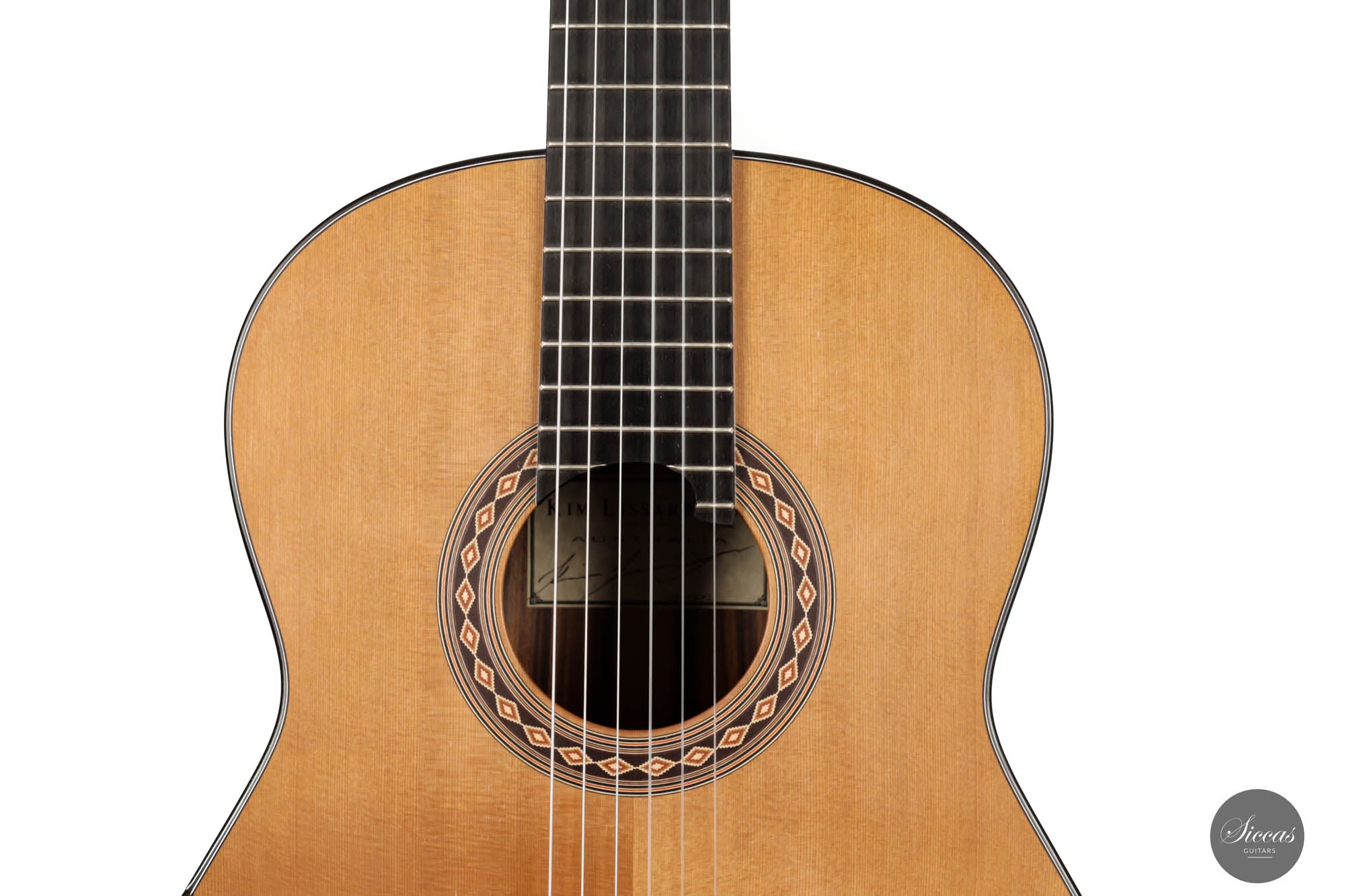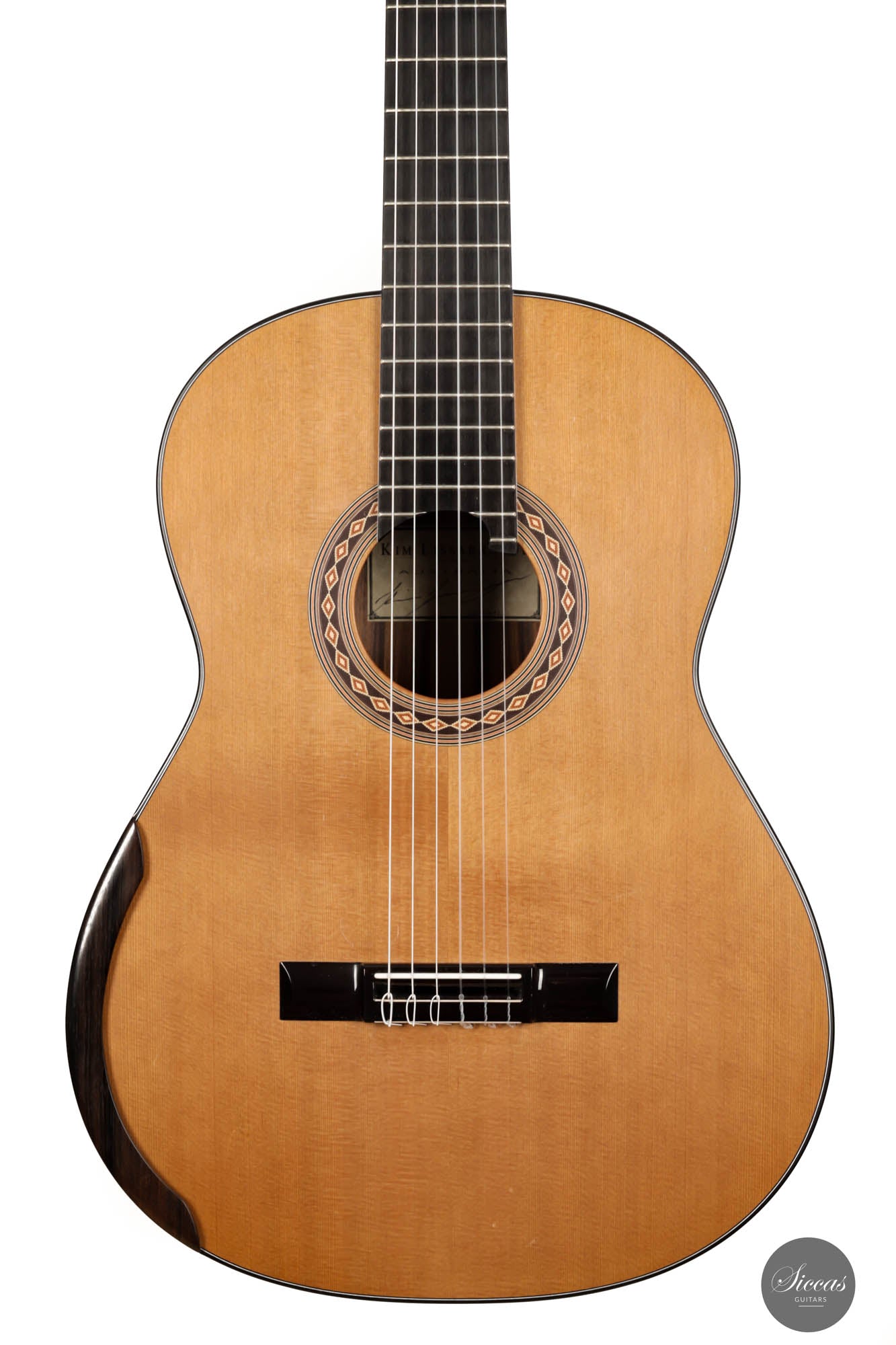 This 2017 lattice guitar is in very good condition. As a pre-loved instrument, it displays minimal playing wears but nothing structural. This beautiful instrument was crafted with an exceptionally thin, responsive cedar top and beautiful dark-grained Ziricote back and sides. The expressive power emanating from this guitar is impressive, making this instrument by Kim Lissarrague of our top 5 most powerful guitars. Not only does it impress with its volume of sound, but also its very rich and flexible tone. This instrument is definitely a true concert powerhouse that can be played in any concert setting. The responsive and strong trebles make this guitar easy for the right hand. Combined with an exceptional neck shape, this guitar is a pure joy to play.
