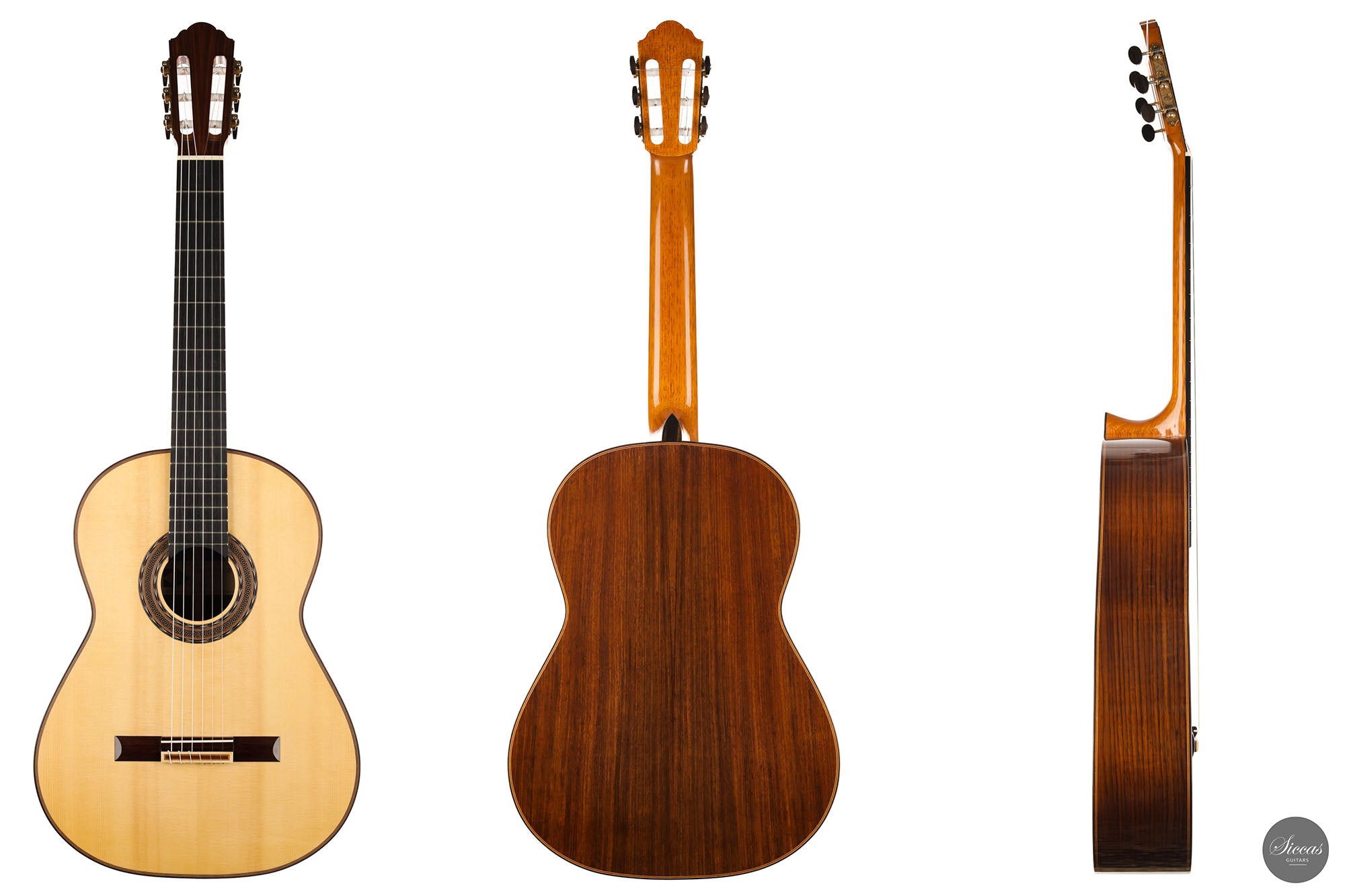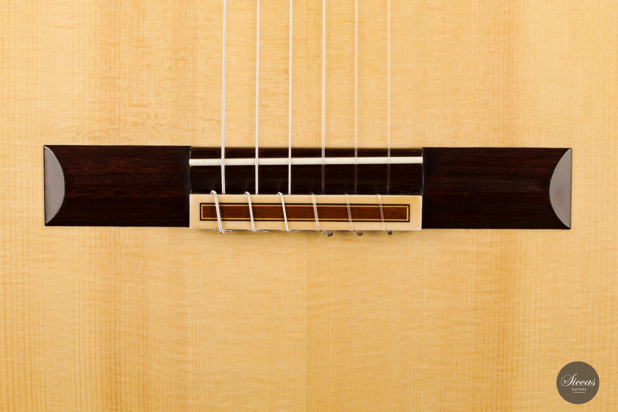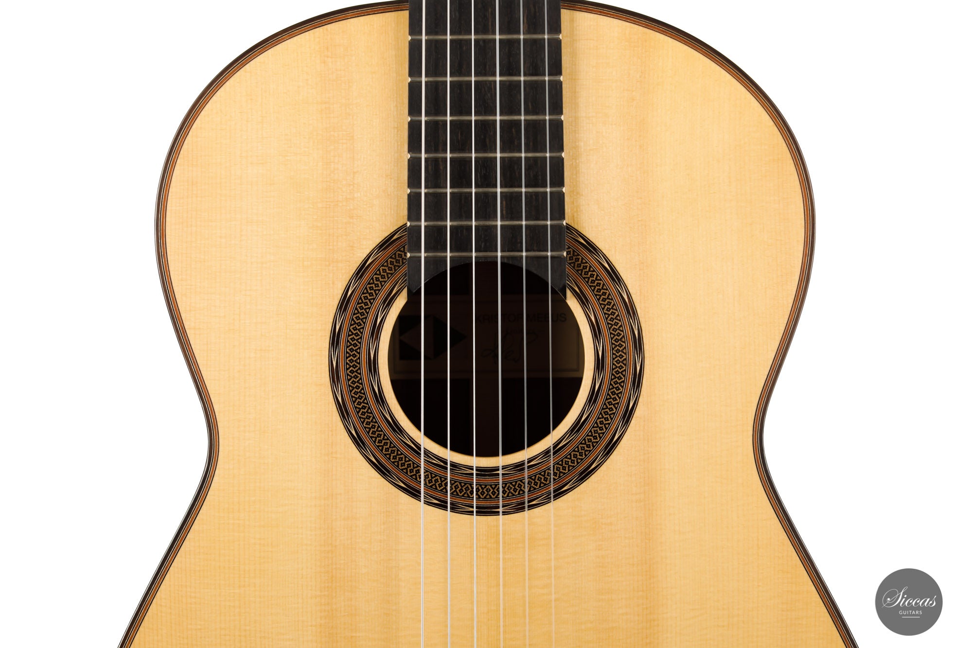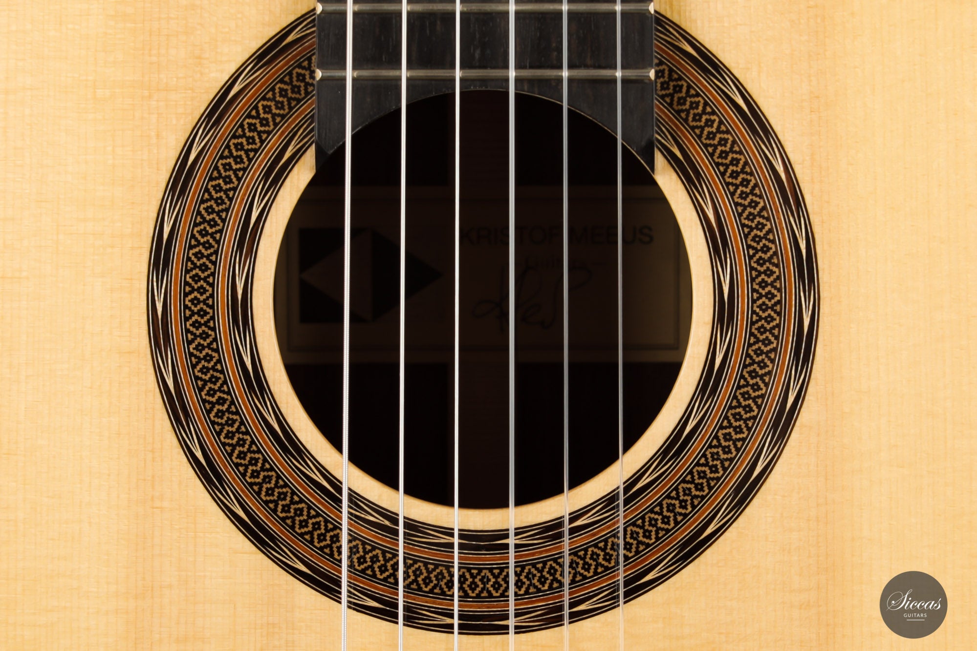 This excellent classical guitar is Kristof Meeus' personal concert model. It features a fascinating lattice bracing pattern made of spruce, reinforced by cedar inlays at each crossing to give it strength and flexibility. This guitar's overall look, particularly the rosette, reminds of some Enrique Garcia designs and is appealing to the eye. Conveying a feeling of harmony in its aesthetic, one can also find this quality in this instrument's sound. The response of the soundboard is immediate and develops a mature, velvety sound. Stunning balance and delightful playability finalise the overall excellent picture of this fine guitar.