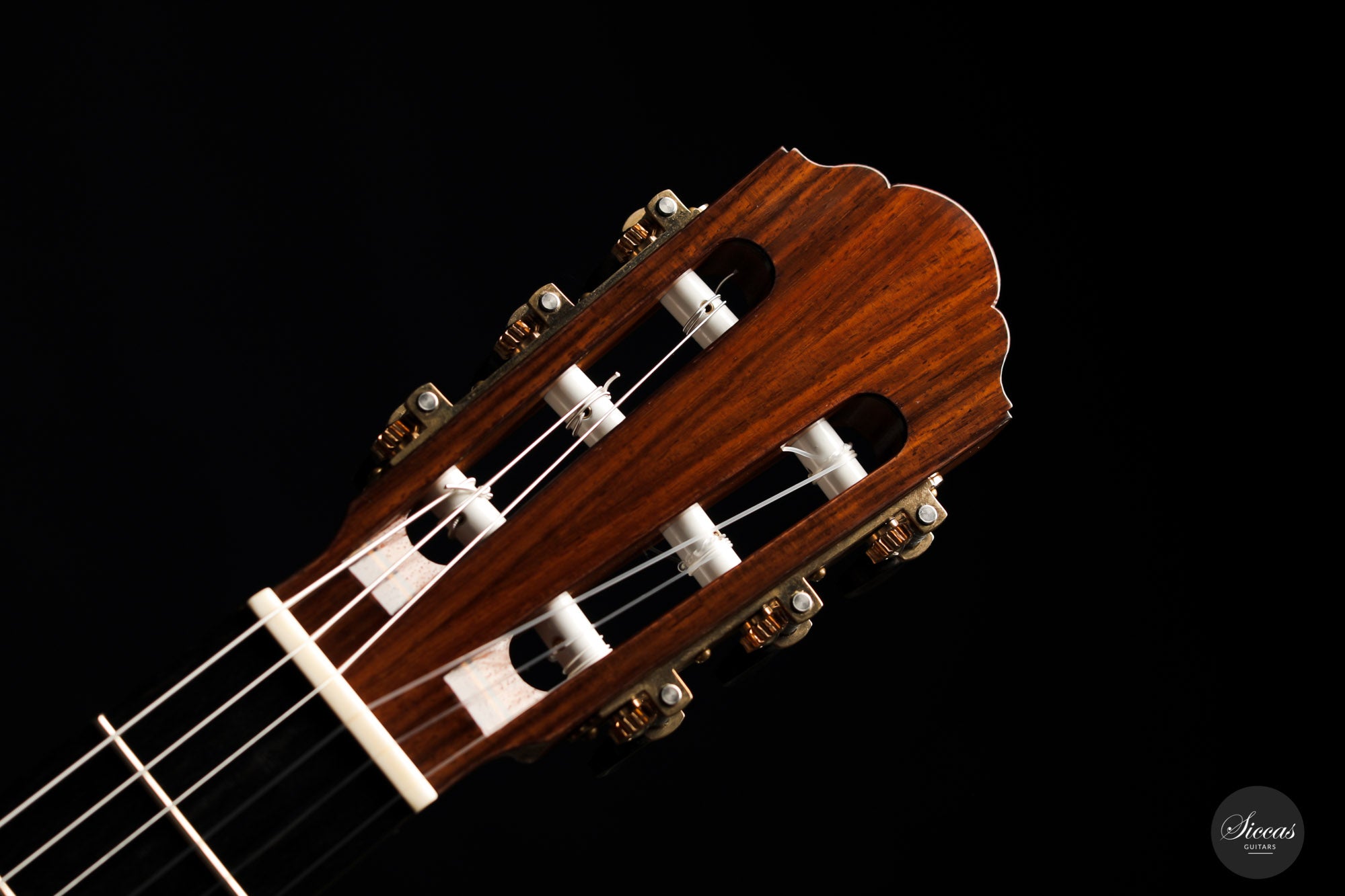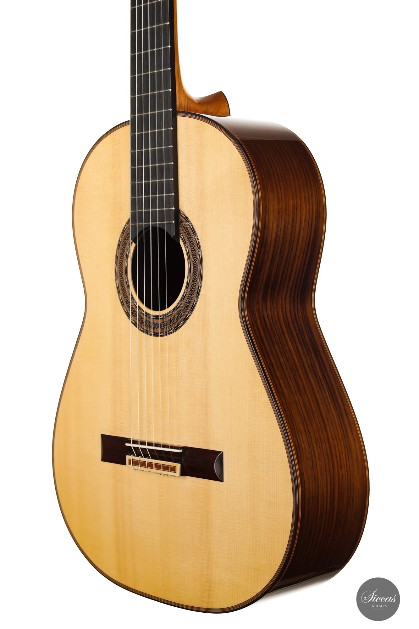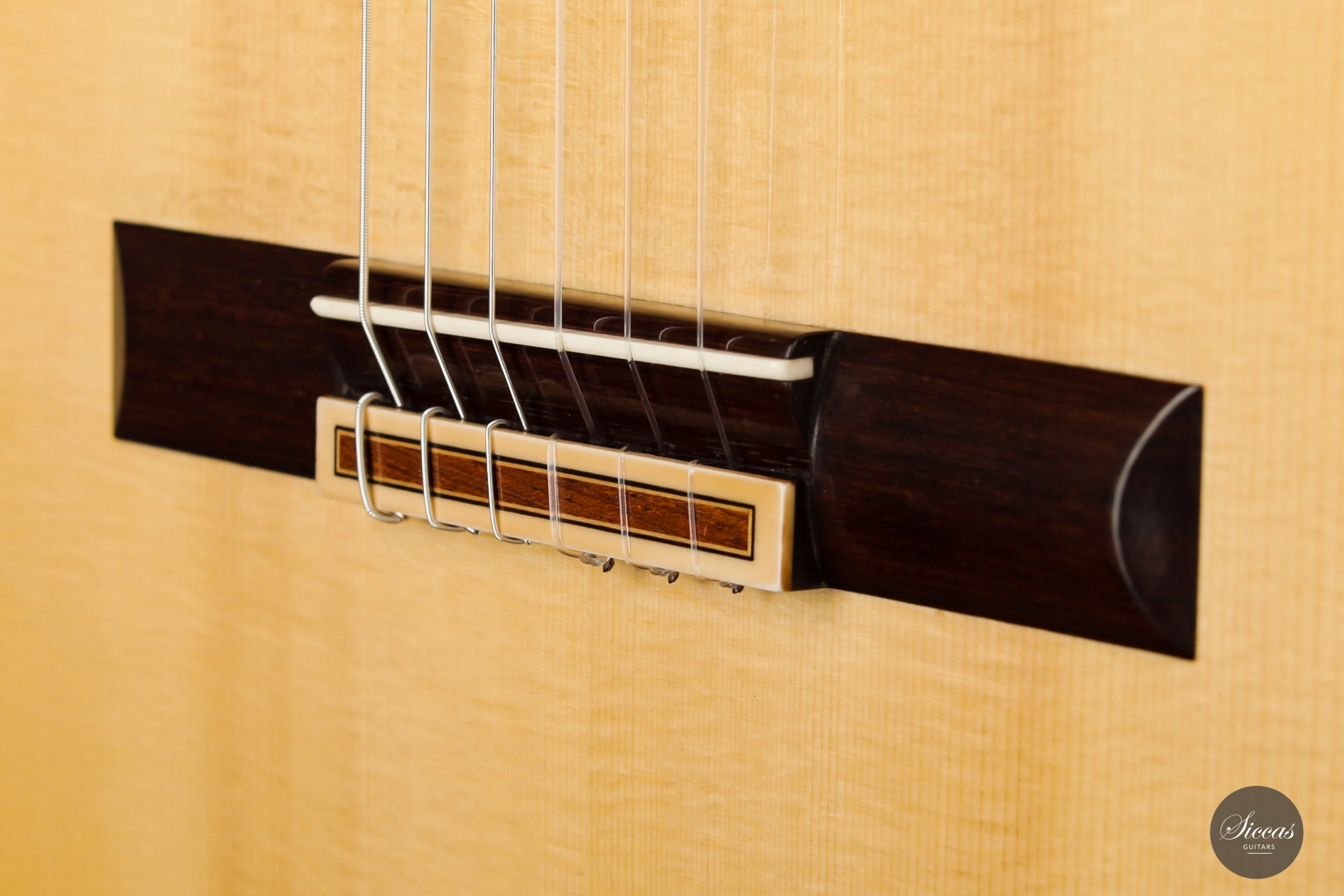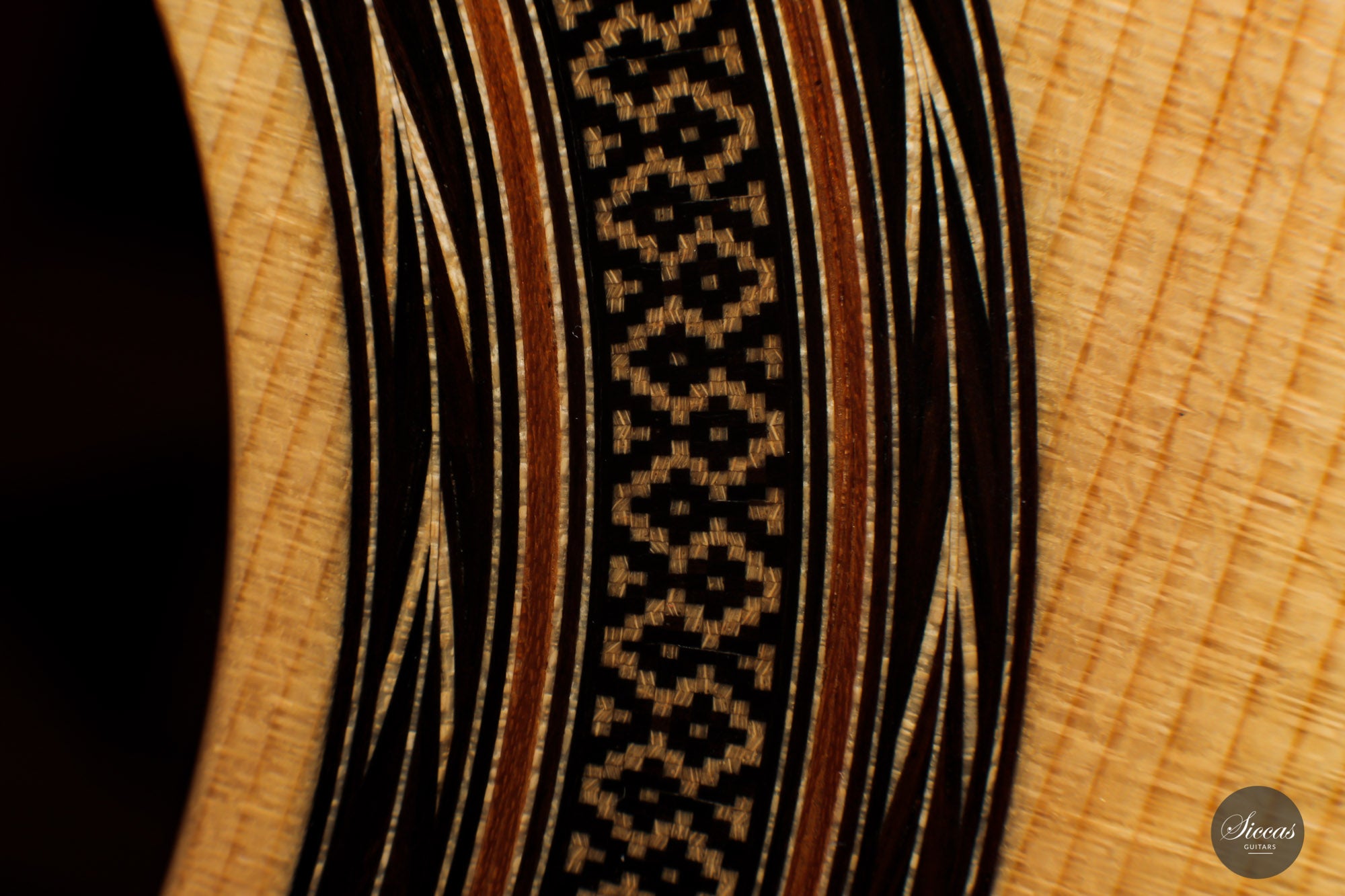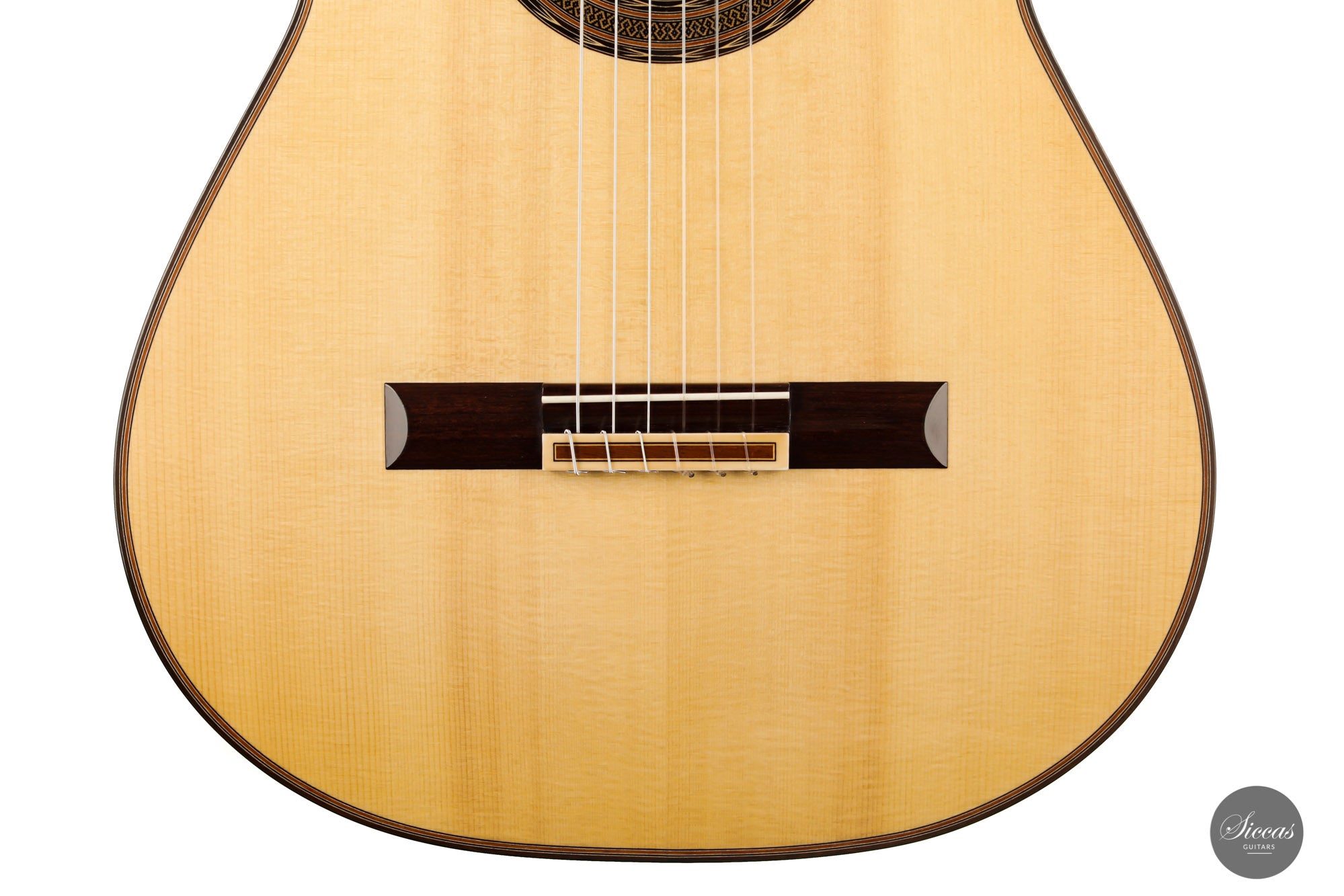 This excellent classical guitar is Kristof Meeus' personal concert model. It features a fascinating lattice bracing pattern made of spruce, reinforced by cedar inlays at each crossing to give it strength and flexibility. This guitar's overall look, particularly the rosette, reminds of some Enrique Garcia designs and is appealing to the eye. Conveying a feeling of harmony in its aesthetic, one can also find this quality in this instrument's sound. The response of the soundboard is immediate and develops a mature, velvety sound. Stunning balance and delightful playability finalise the overall excellent picture of this fine guitar.