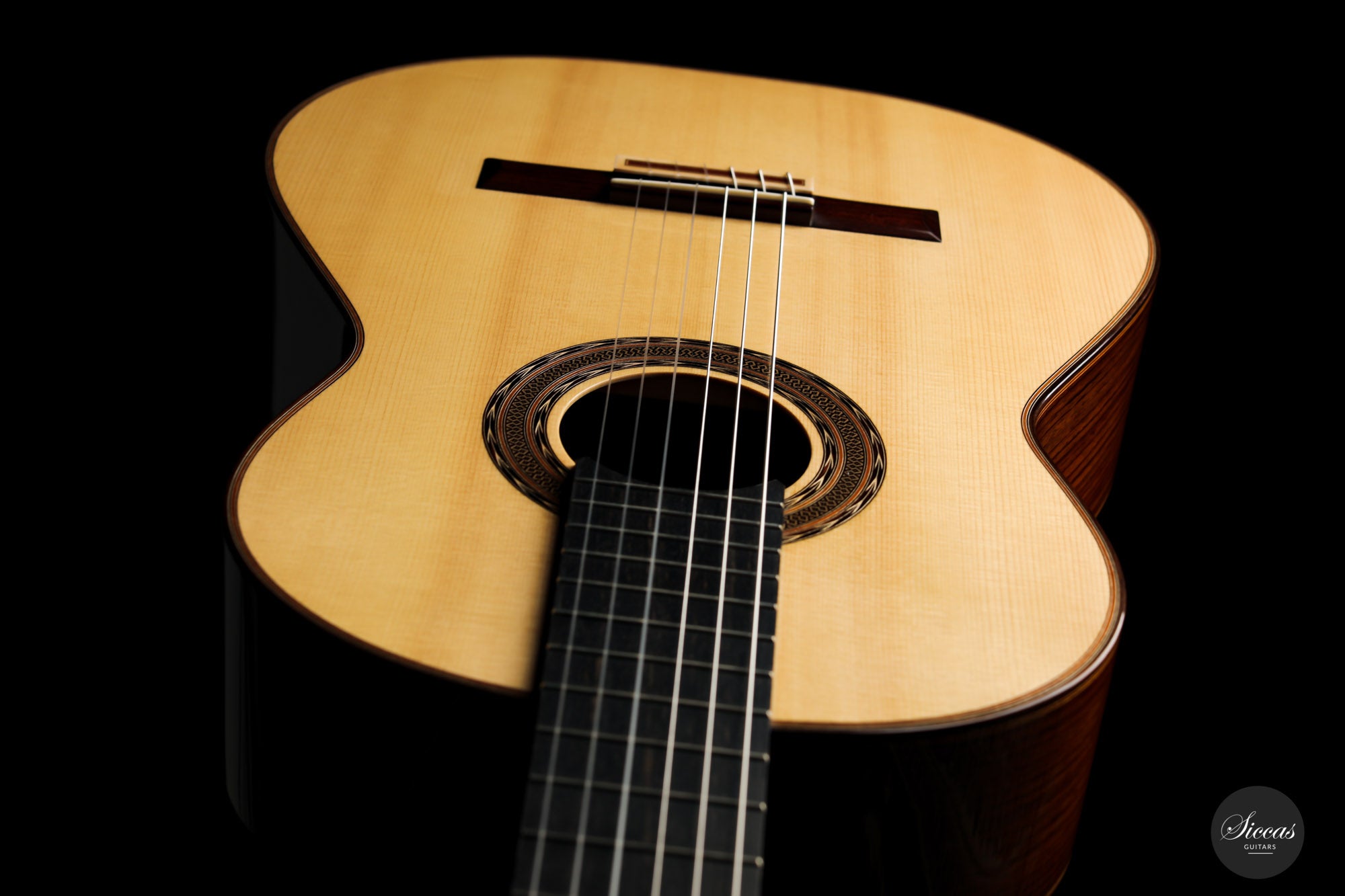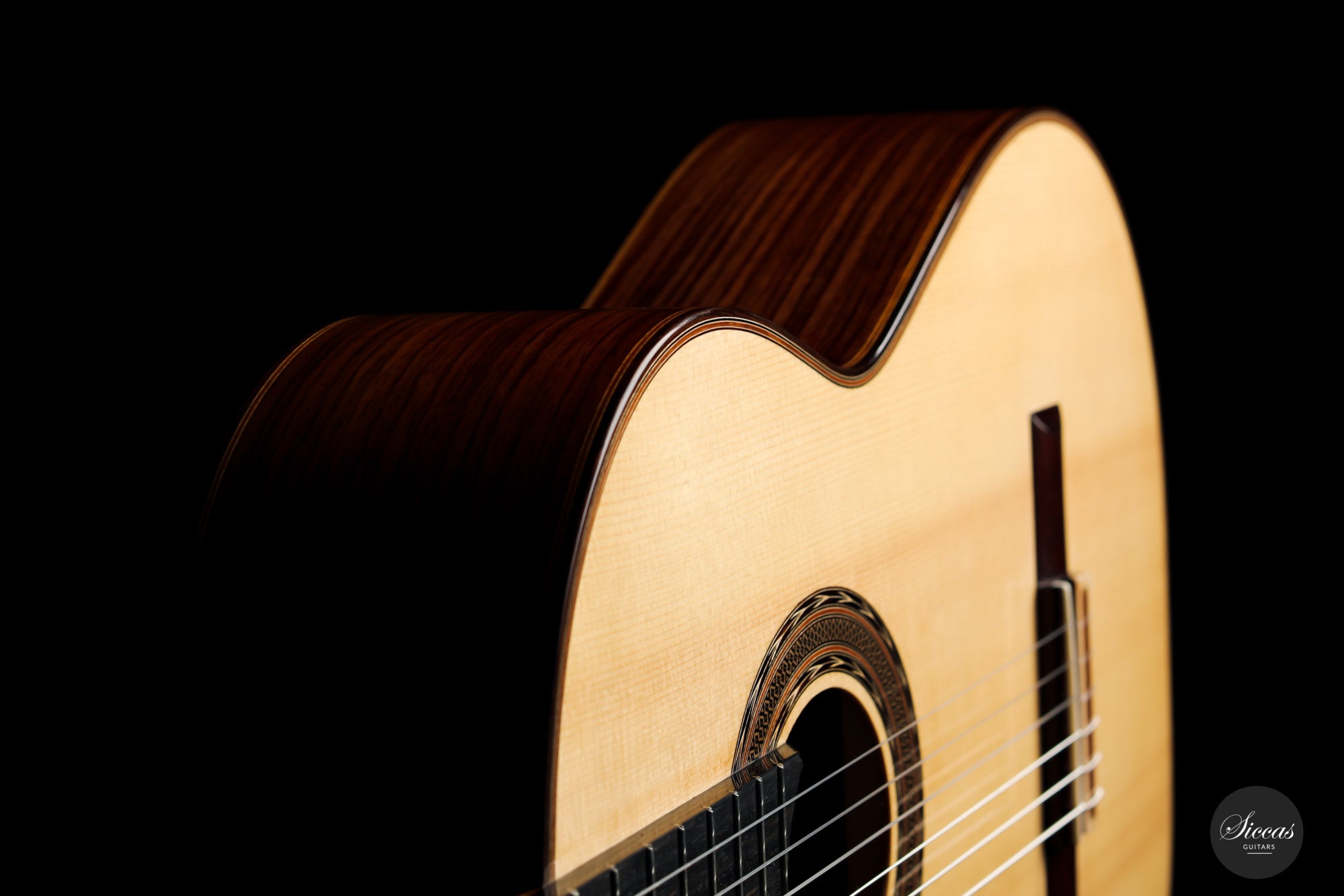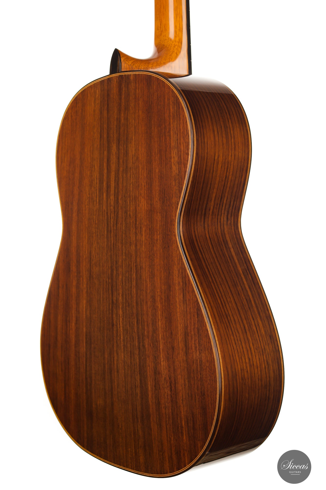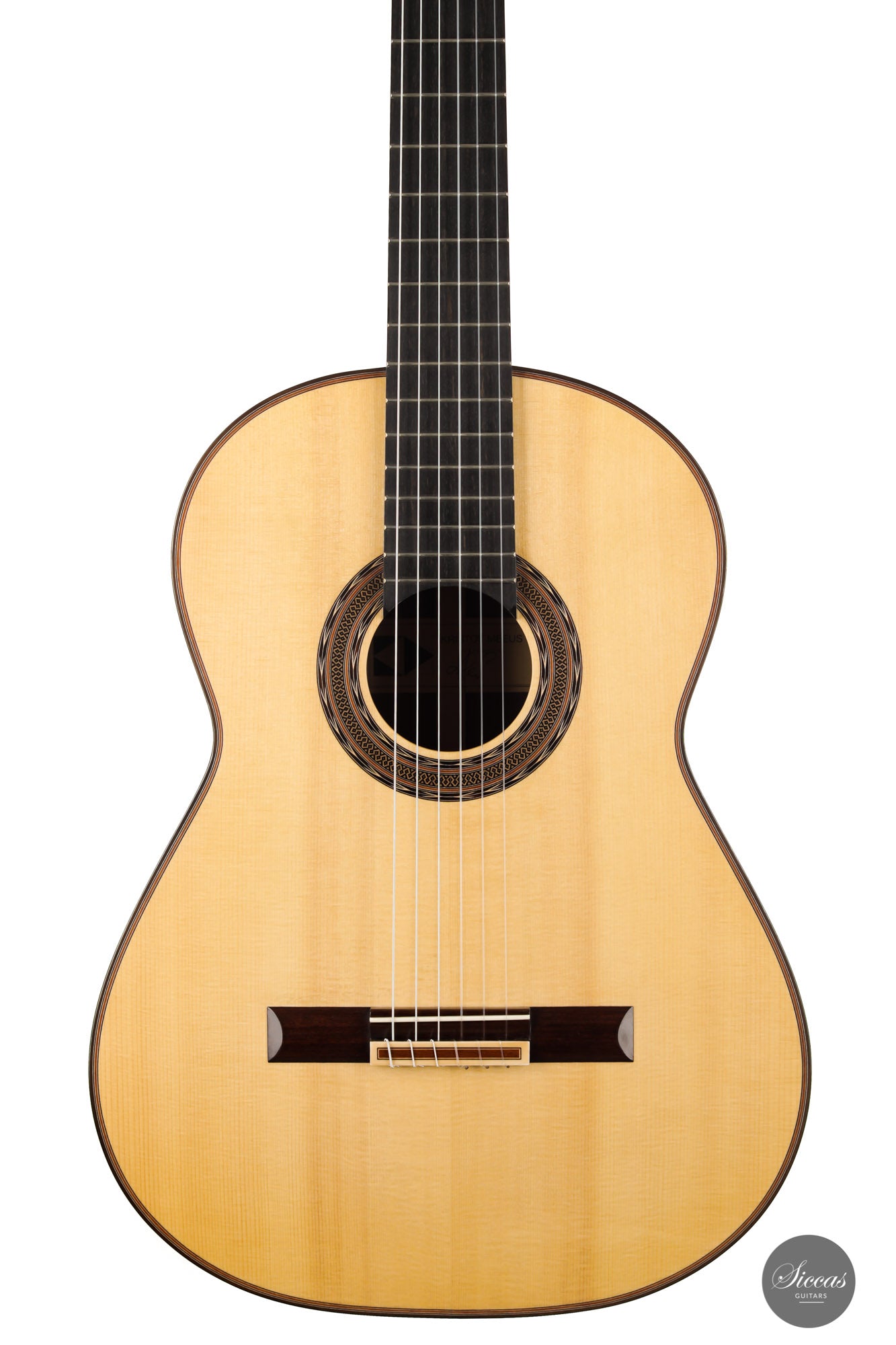 This excellent classical guitar is Kristof Meeus' personal concert model. It features a fascinating lattice bracing pattern made of spruce, reinforced by cedar inlays at each crossing to give it strength and flexibility. This guitar's overall look, particularly the rosette, reminds of some Enrique Garcia designs and is appealing to the eye. Conveying a feeling of harmony in its aesthetic, one can also find this quality in this instrument's sound. The response of the soundboard is immediate and develops a mature, velvety sound. Stunning balance and delightful playability finalise the overall excellent picture of this fine guitar.