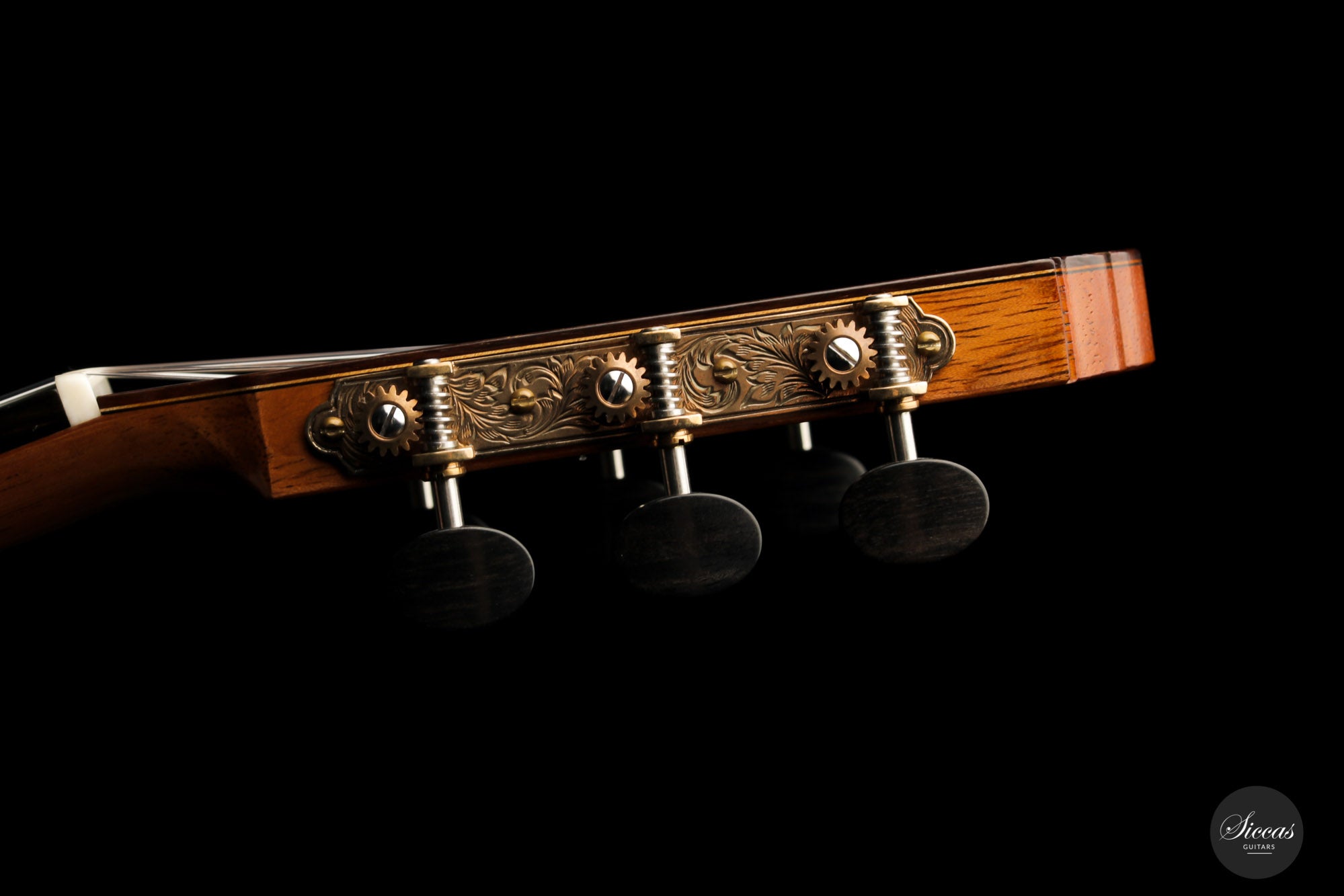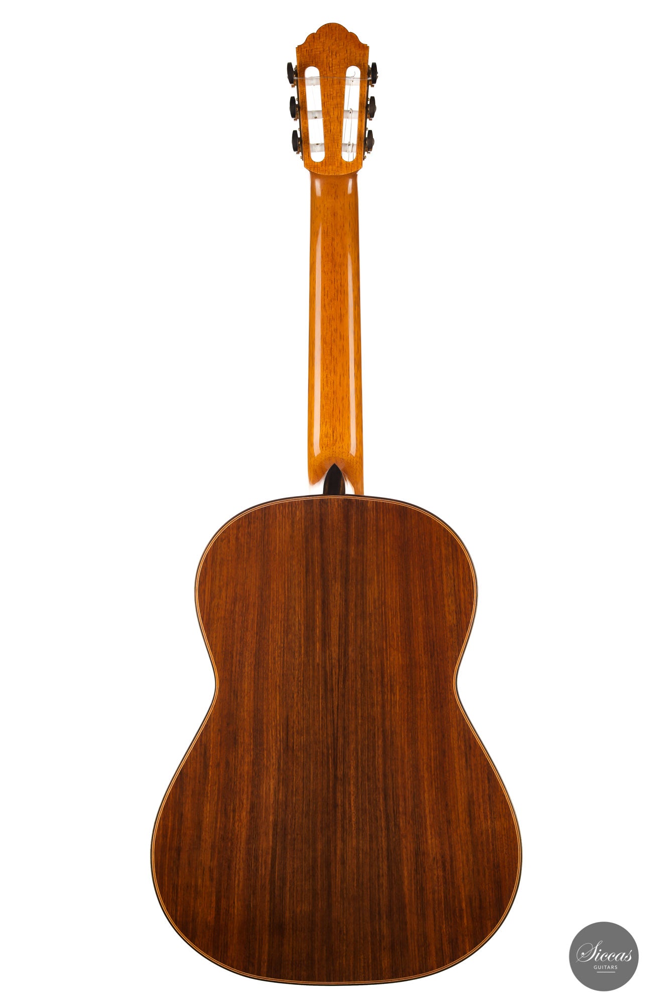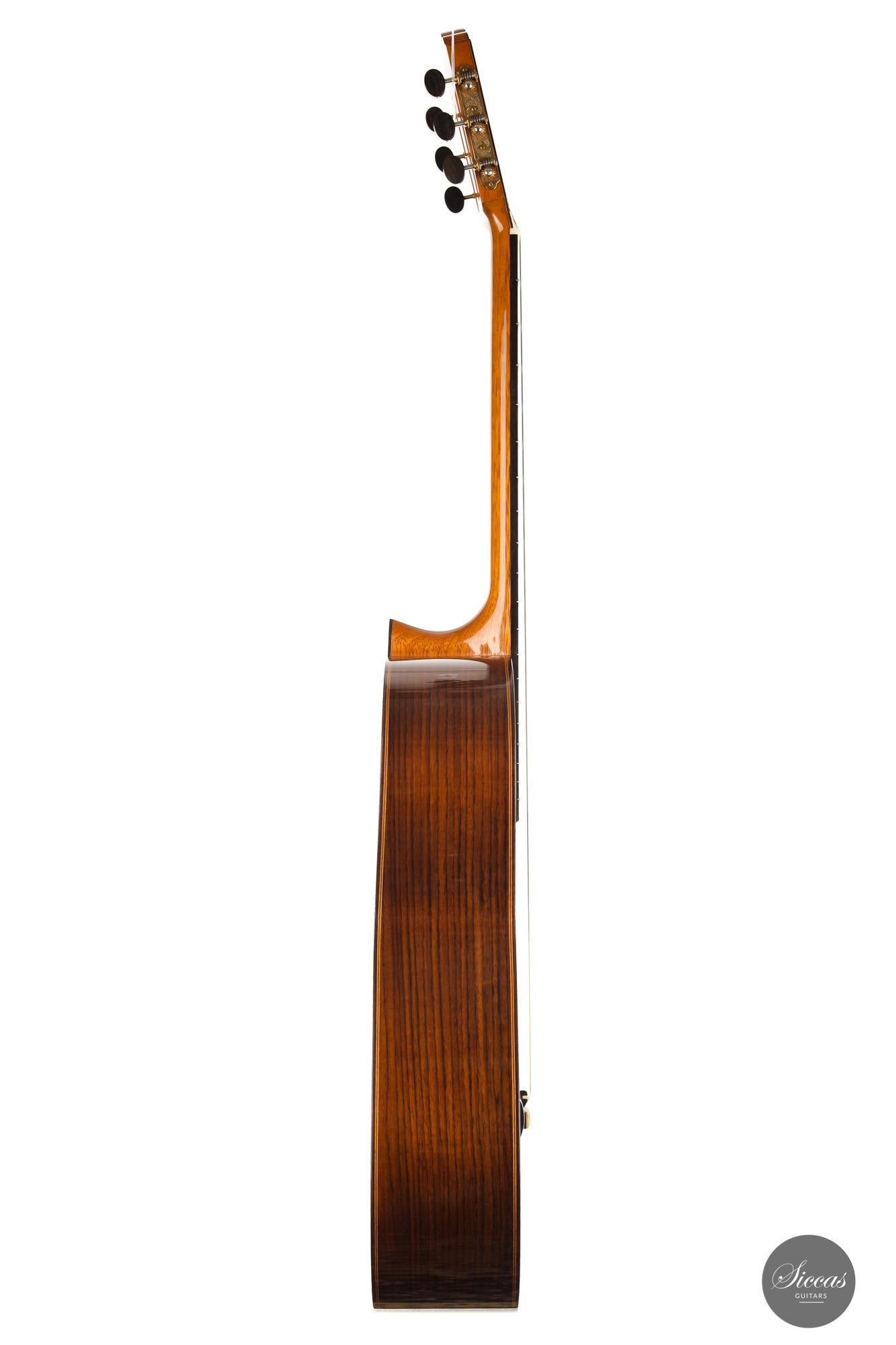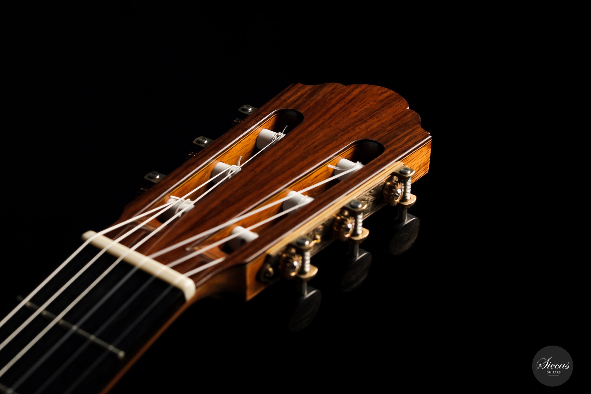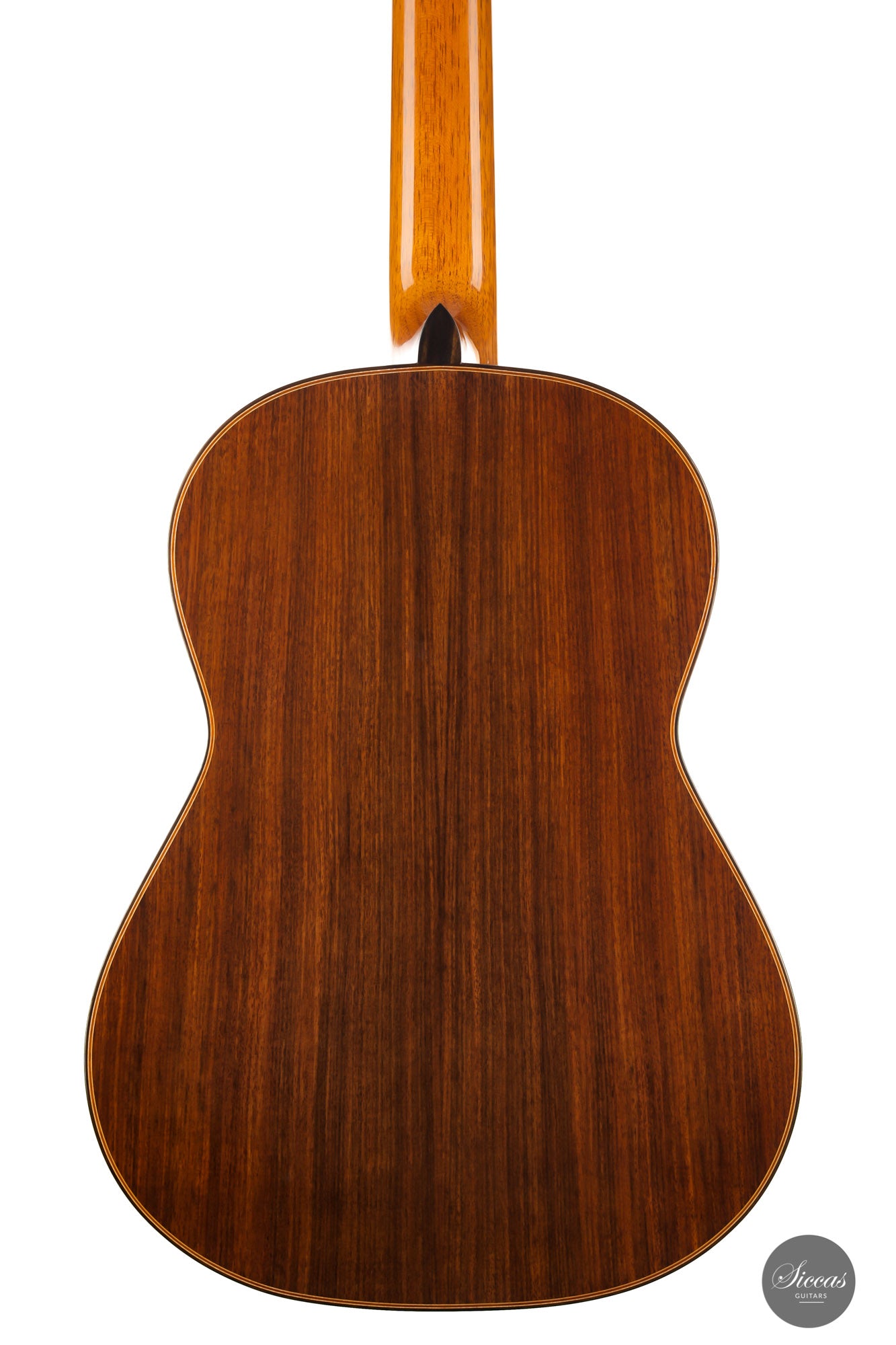 This excellent classical guitar is Kristof Meeus' personal concert model. It features a fascinating lattice bracing pattern made of spruce, reinforced by cedar inlays at each crossing to give it strength and flexibility. This guitar's overall look, particularly the rosette, reminds of some Enrique Garcia designs and is appealing to the eye. Conveying a feeling of harmony in its aesthetic, one can also find this quality in this instrument's sound. The response of the soundboard is immediate and develops a mature, velvety sound. Stunning balance and delightful playability finalise the overall excellent picture of this fine guitar.