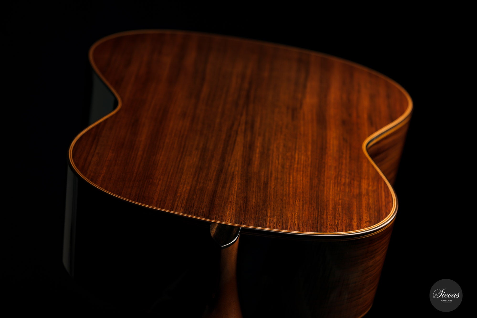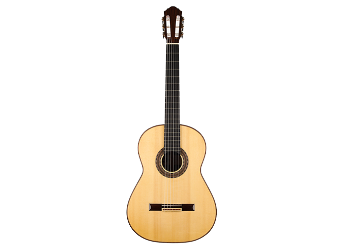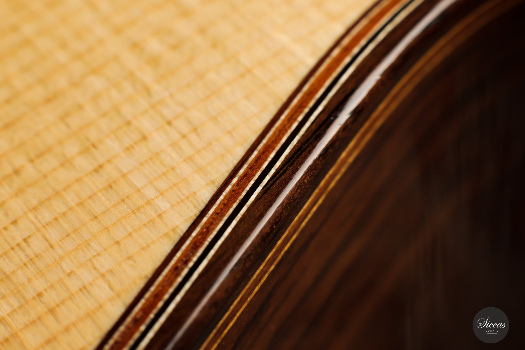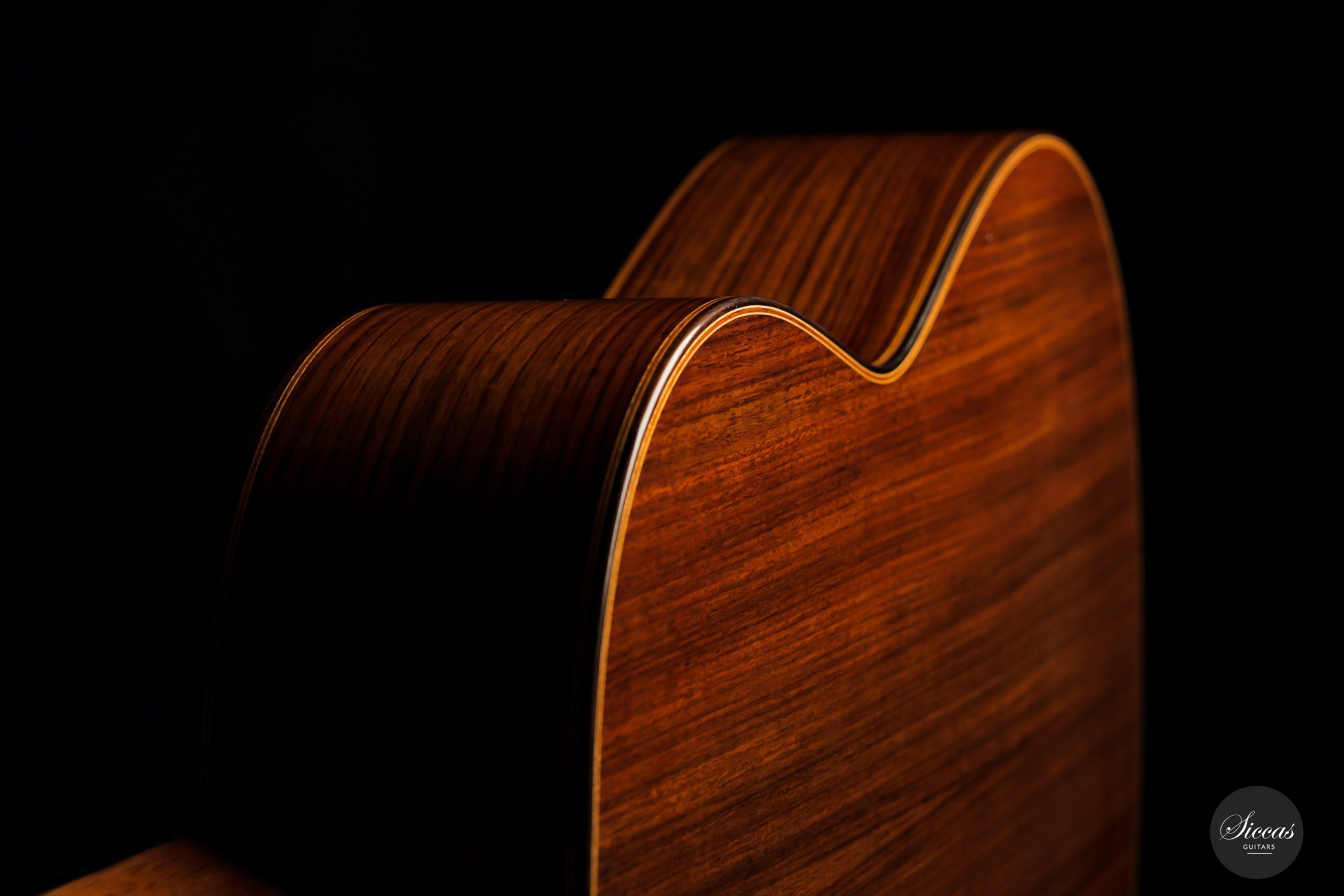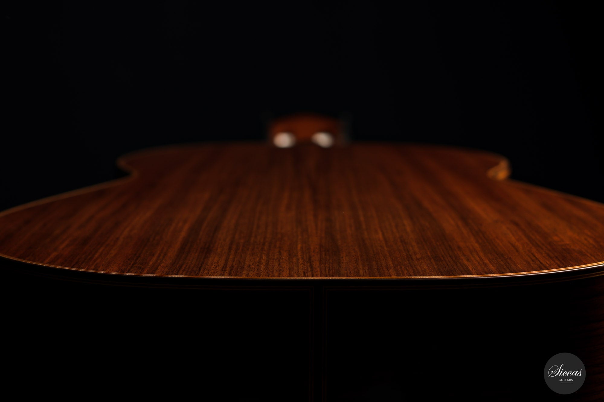 This excellent classical guitar is Kristof Meeus' personal concert model. It features a fascinating lattice bracing pattern made of spruce, reinforced by cedar inlays at each crossing to give it strength and flexibility. This guitar's overall look, particularly the rosette, reminds of some Enrique Garcia designs and is appealing to the eye. Conveying a feeling of harmony in its aesthetic, one can also find this quality in this instrument's sound. The response of the soundboard is immediate and develops a mature, velvety sound. Stunning balance and delightful playability finalise the overall excellent picture of this fine guitar.