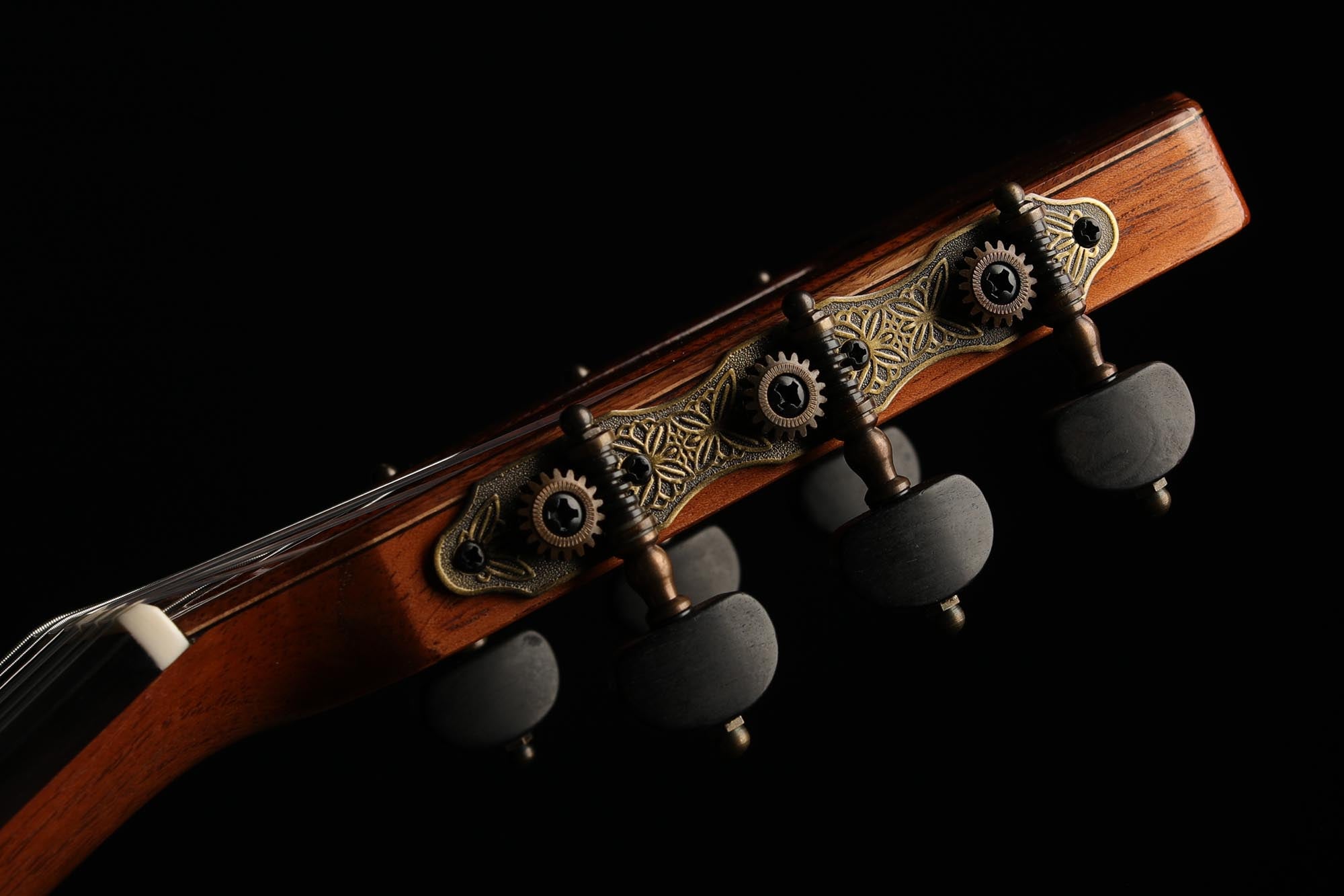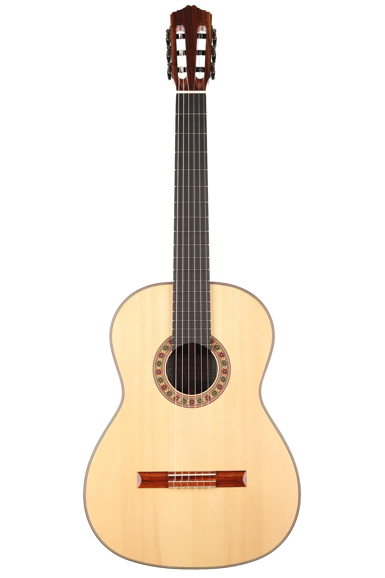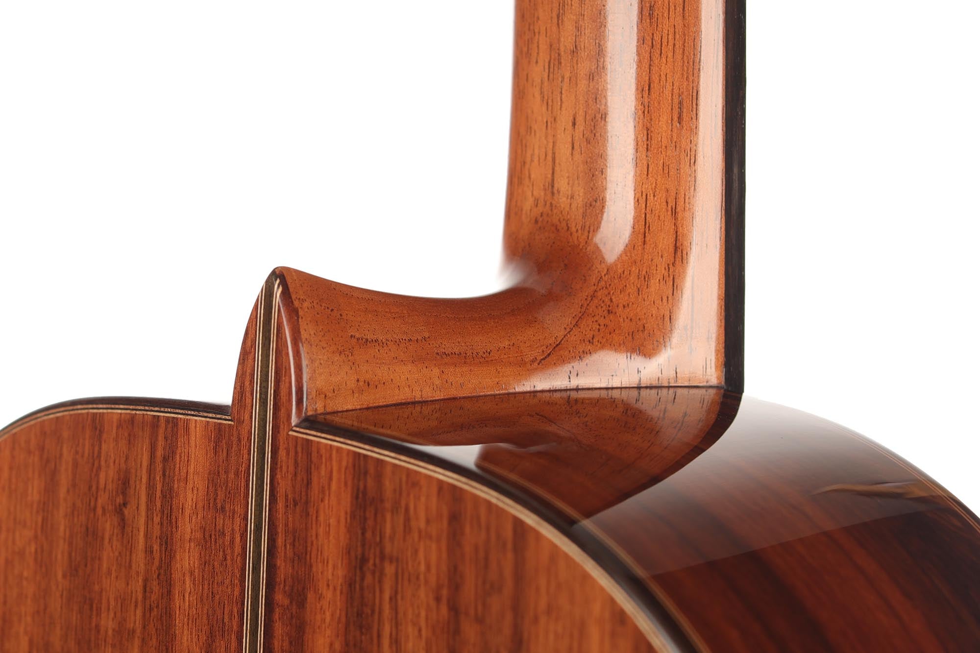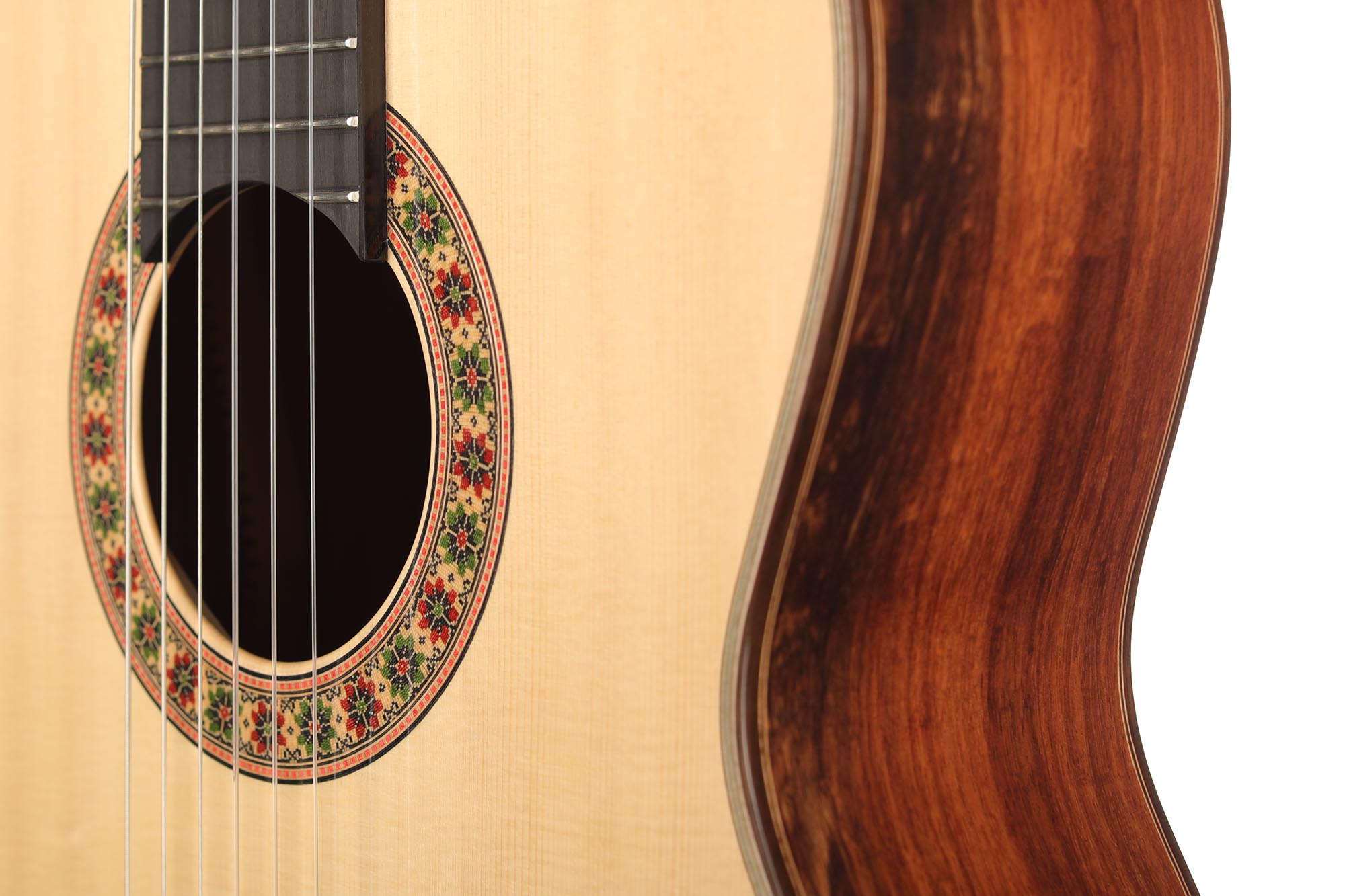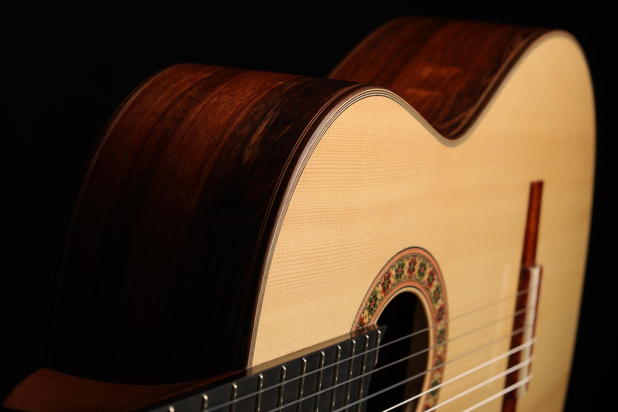 The cathedral model is based on Celedonio Romero’s church gate guitar by Miguel Rodriguez, also known as “La Catedral”.