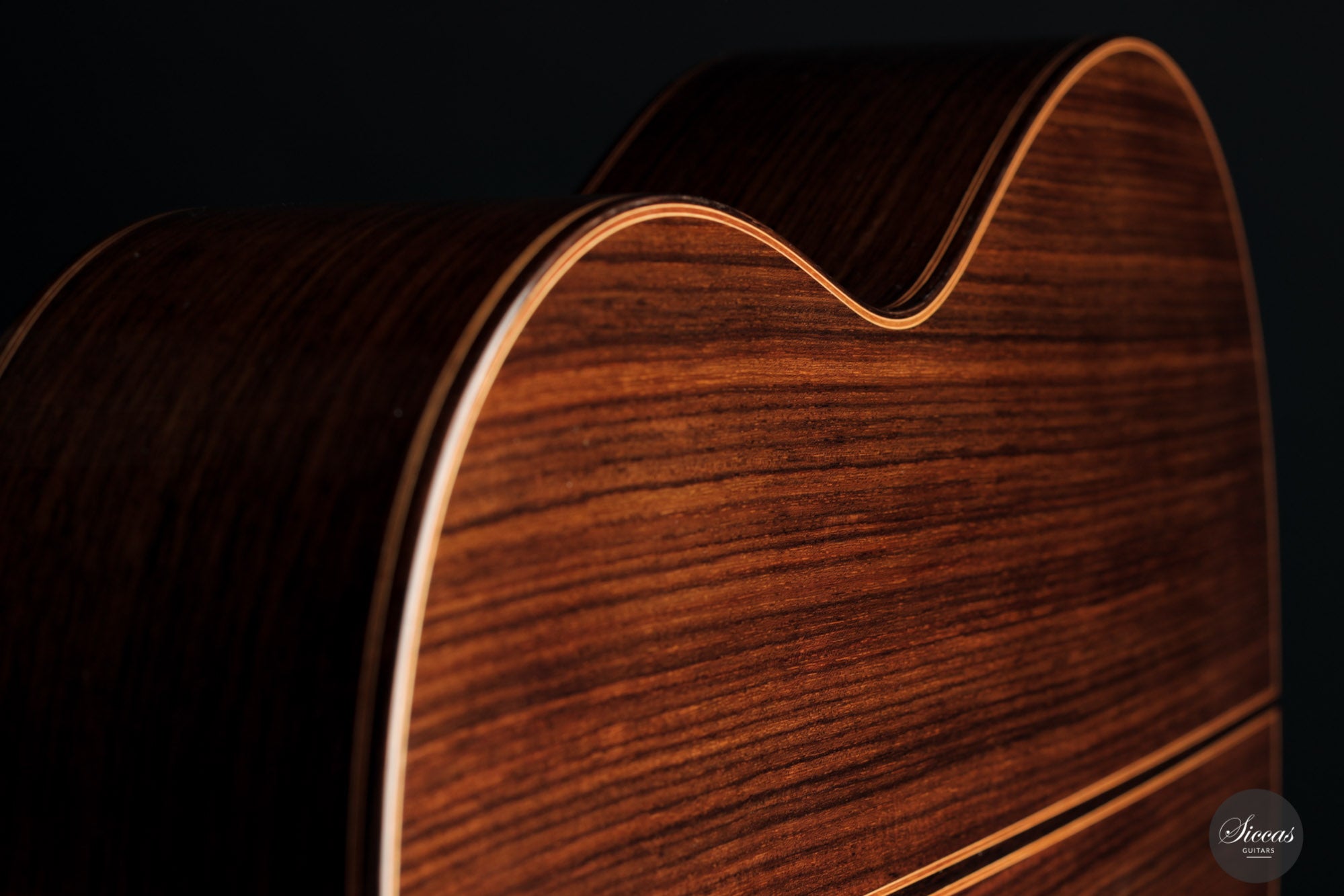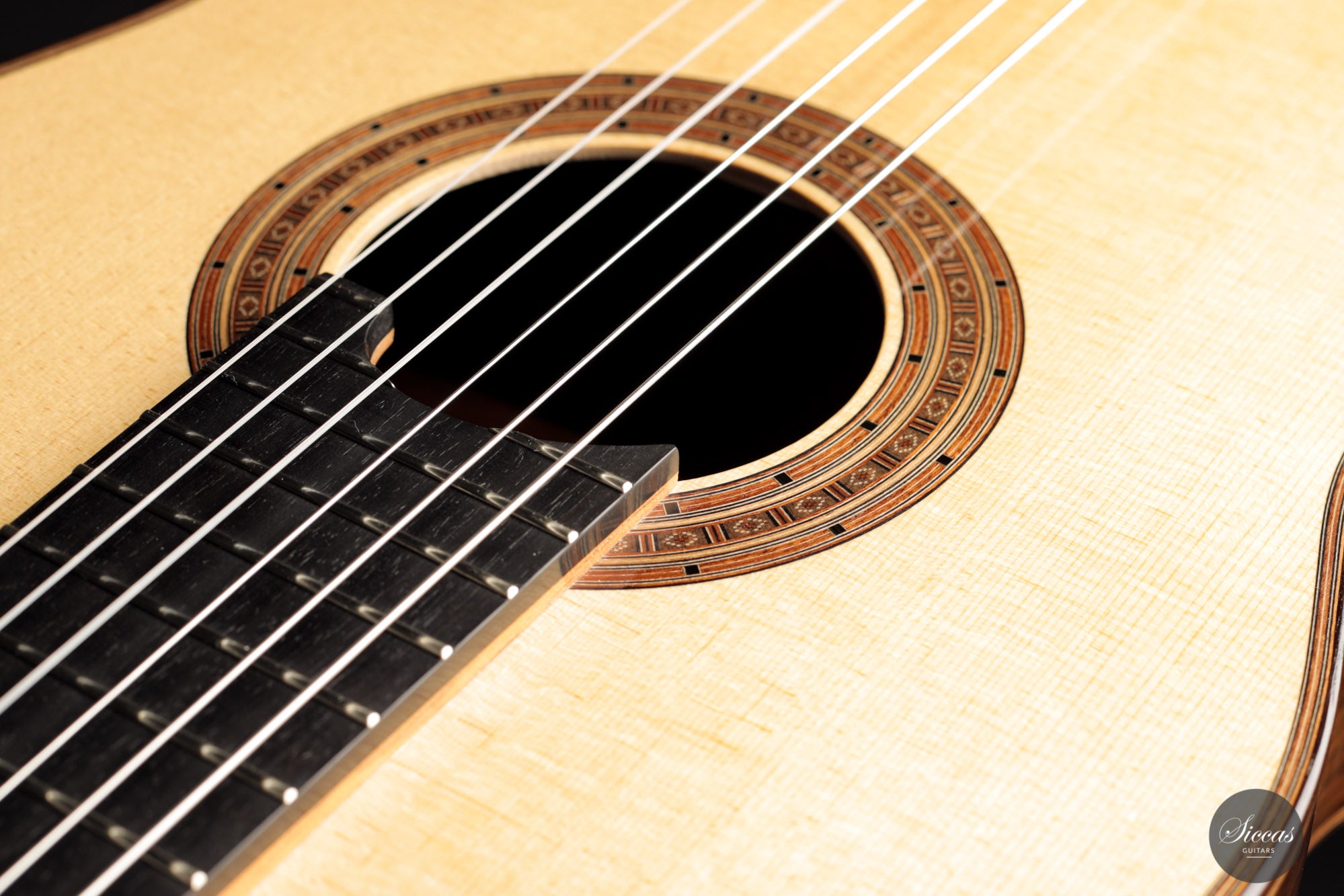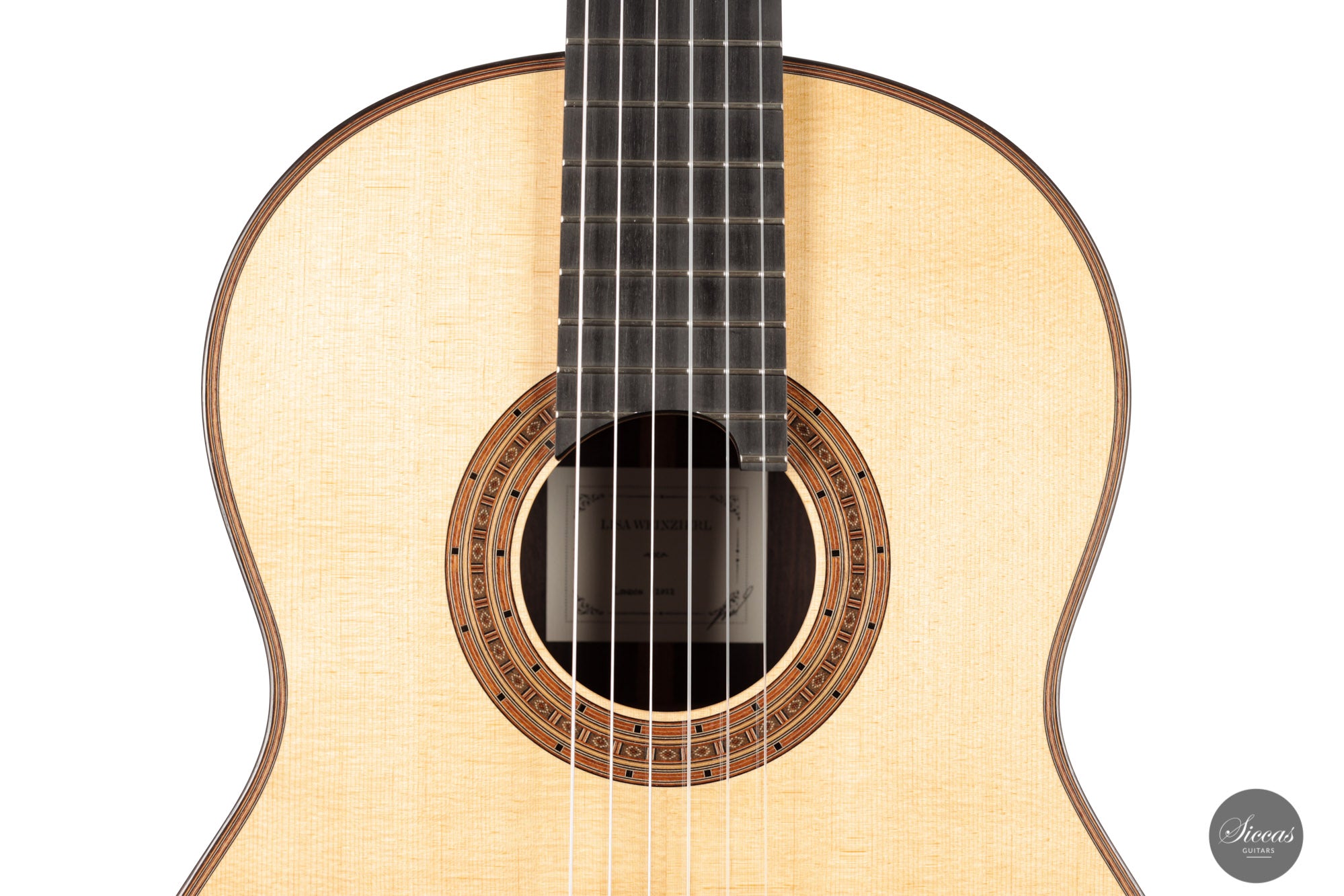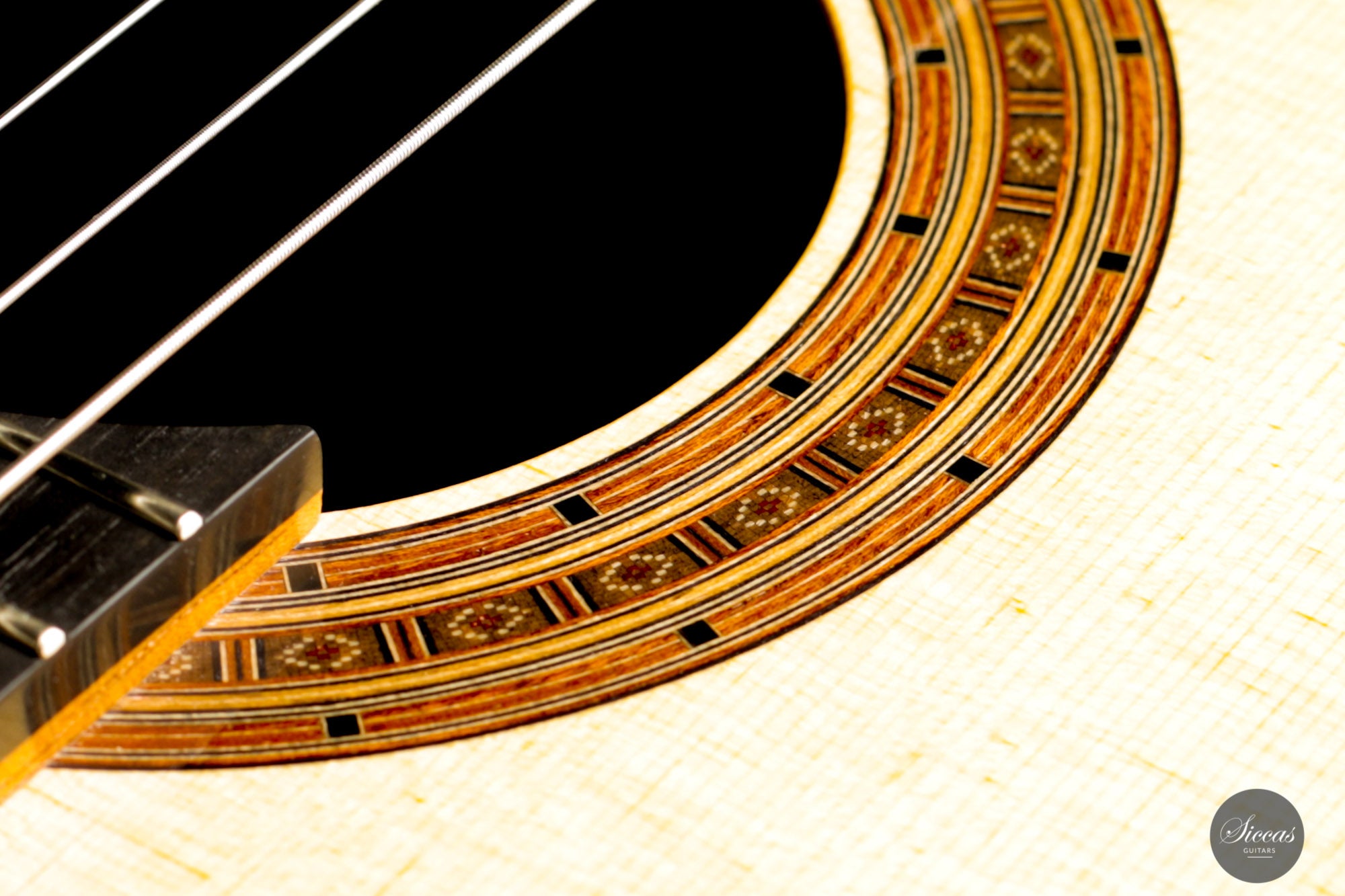 This brand-new instrument has a classic wood combination with a first-class spruce soundboard and Indian rosewood for the back and sides, making for a wide, complex, and colorful sound. The gorgeously crafted rosette shows some vibrant matching colors, well complemented by the most splendid purflings and a super comfortable neck. When playing on the instrument, one can immediately feel its responsiveness and the fine attack, a very lyrical sustain, and deep bass response. Looking further into the design, the guitar is built with double sides that make the structural integrity firmer. Using this technique allows the luthier to build lighter, thus creating a complex tone with a lot of core. This guitar suits the musician that wants perfection delivered with a lush, sweet, and singing tone.