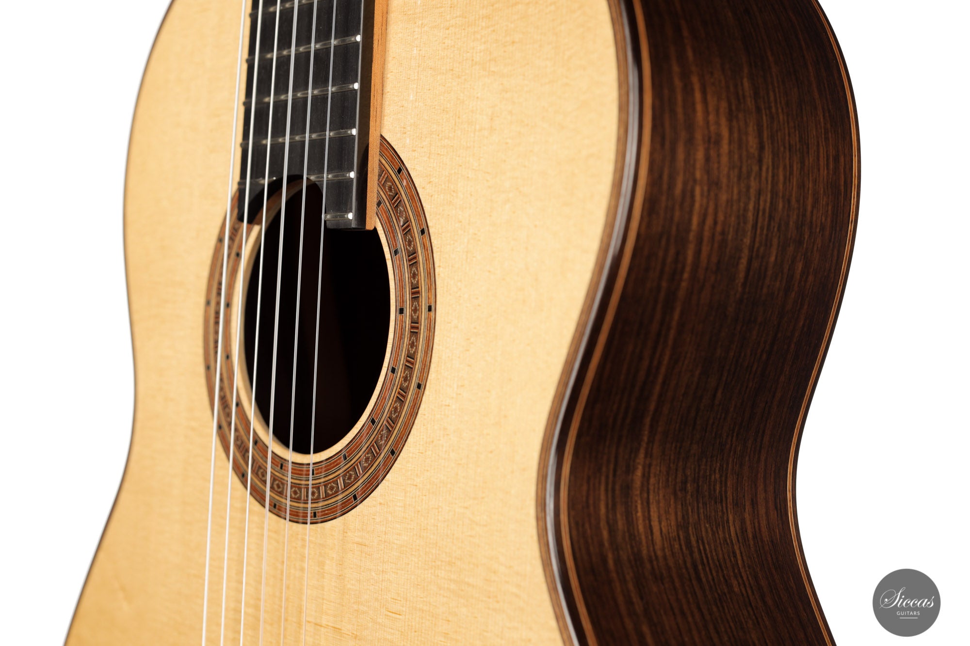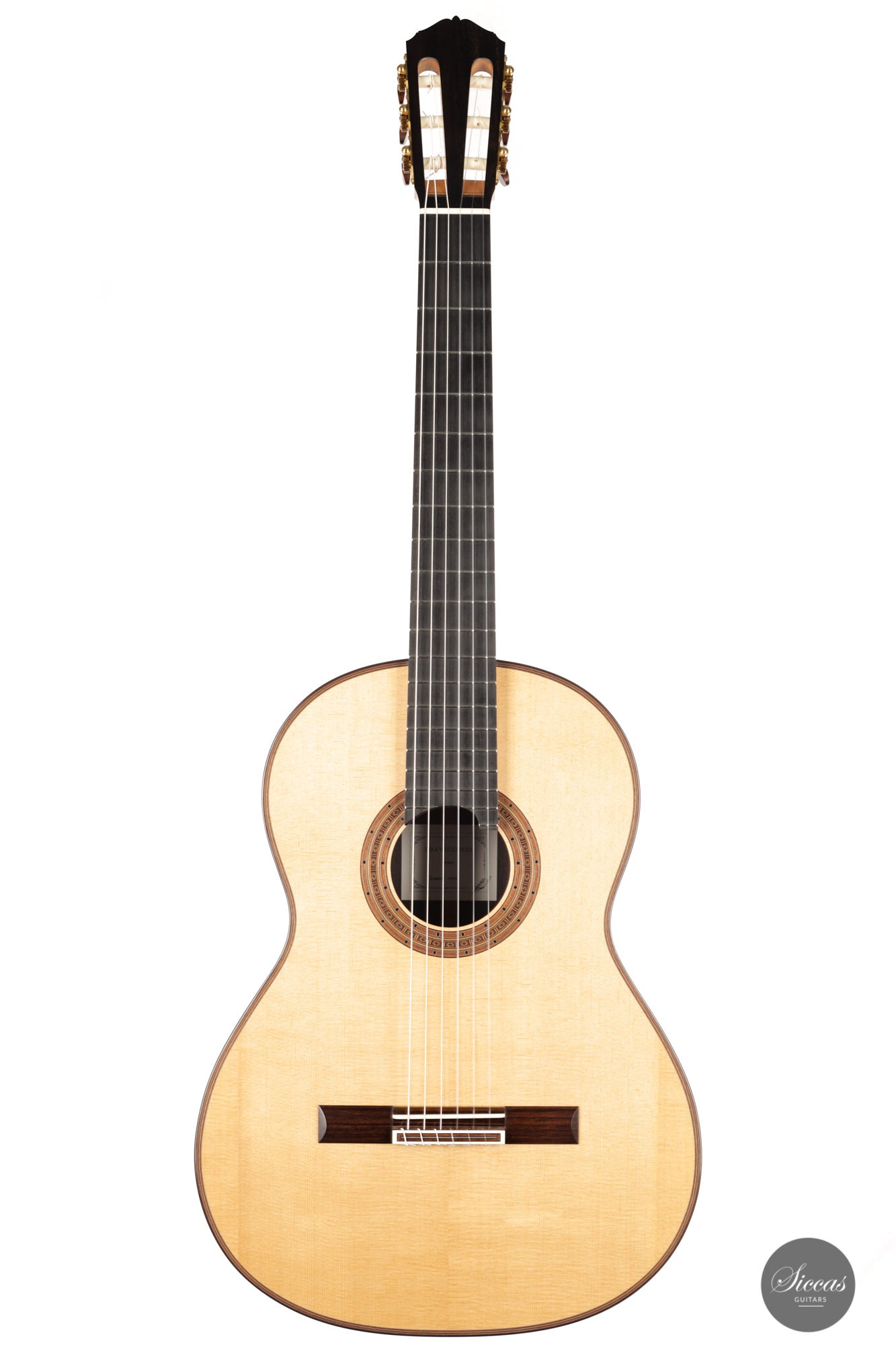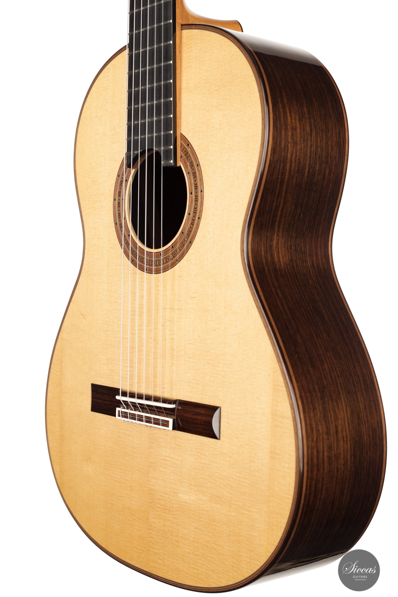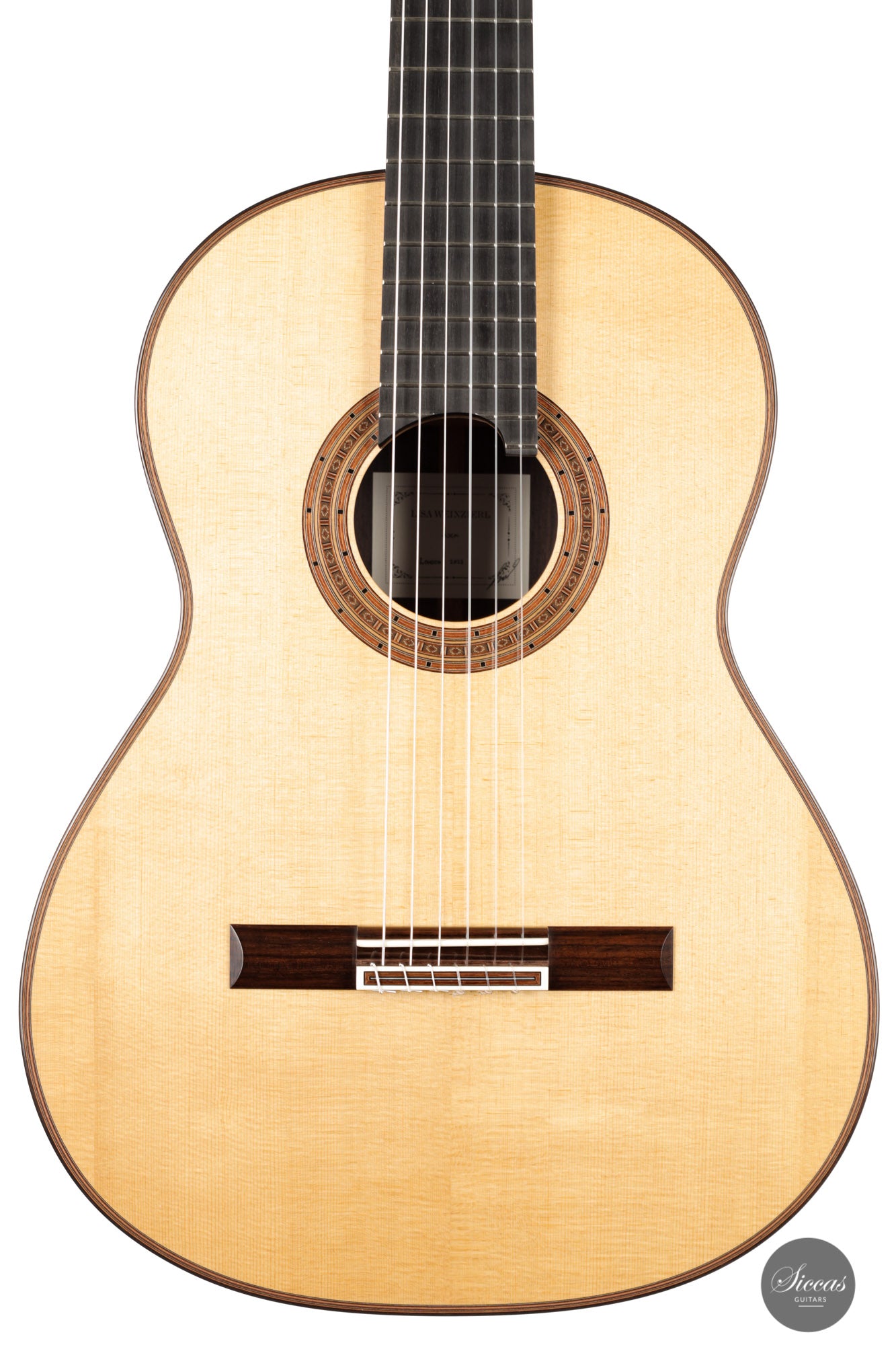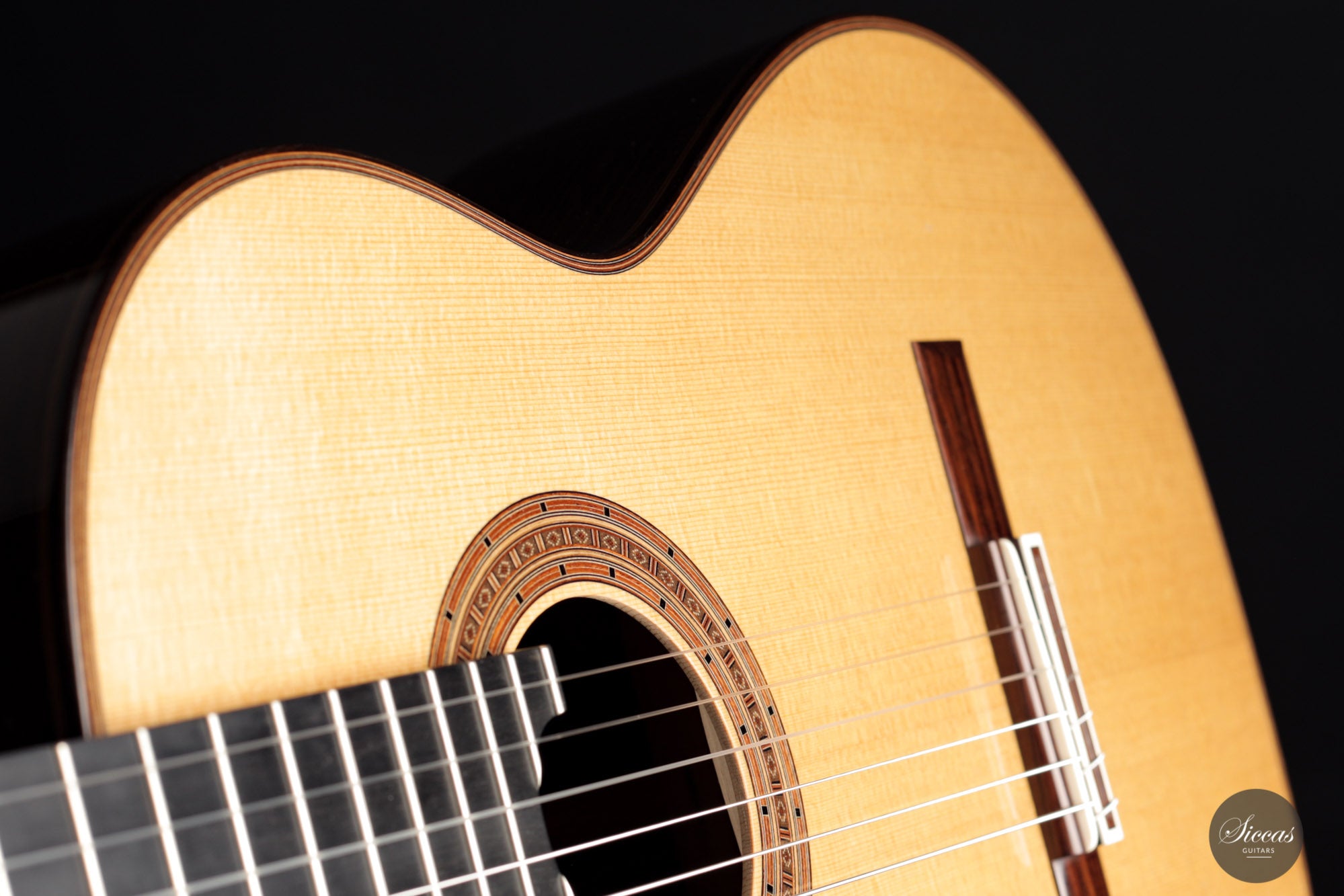This brand-new instrument has a classic wood combination with a first-class spruce soundboard and Indian rosewood for the back and sides, making for a wide, complex, and colorful sound. The gorgeously crafted rosette shows some vibrant matching colors, well complemented by the most splendid purflings and a super comfortable neck. When playing on the instrument, one can immediately feel its responsiveness and the fine attack, a very lyrical sustain, and deep bass response. Looking further into the design, the guitar is built with double sides that make the structural integrity firmer. Using this technique allows the luthier to build lighter, thus creating a complex tone with a lot of core. This guitar suits the musician that wants perfection delivered with a lush, sweet, and singing tone.