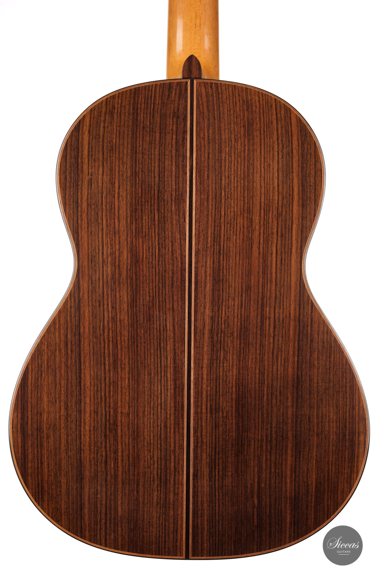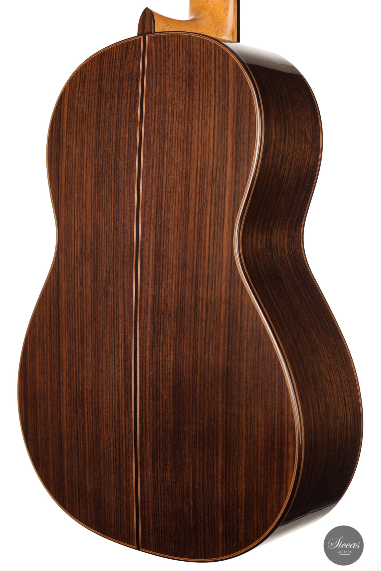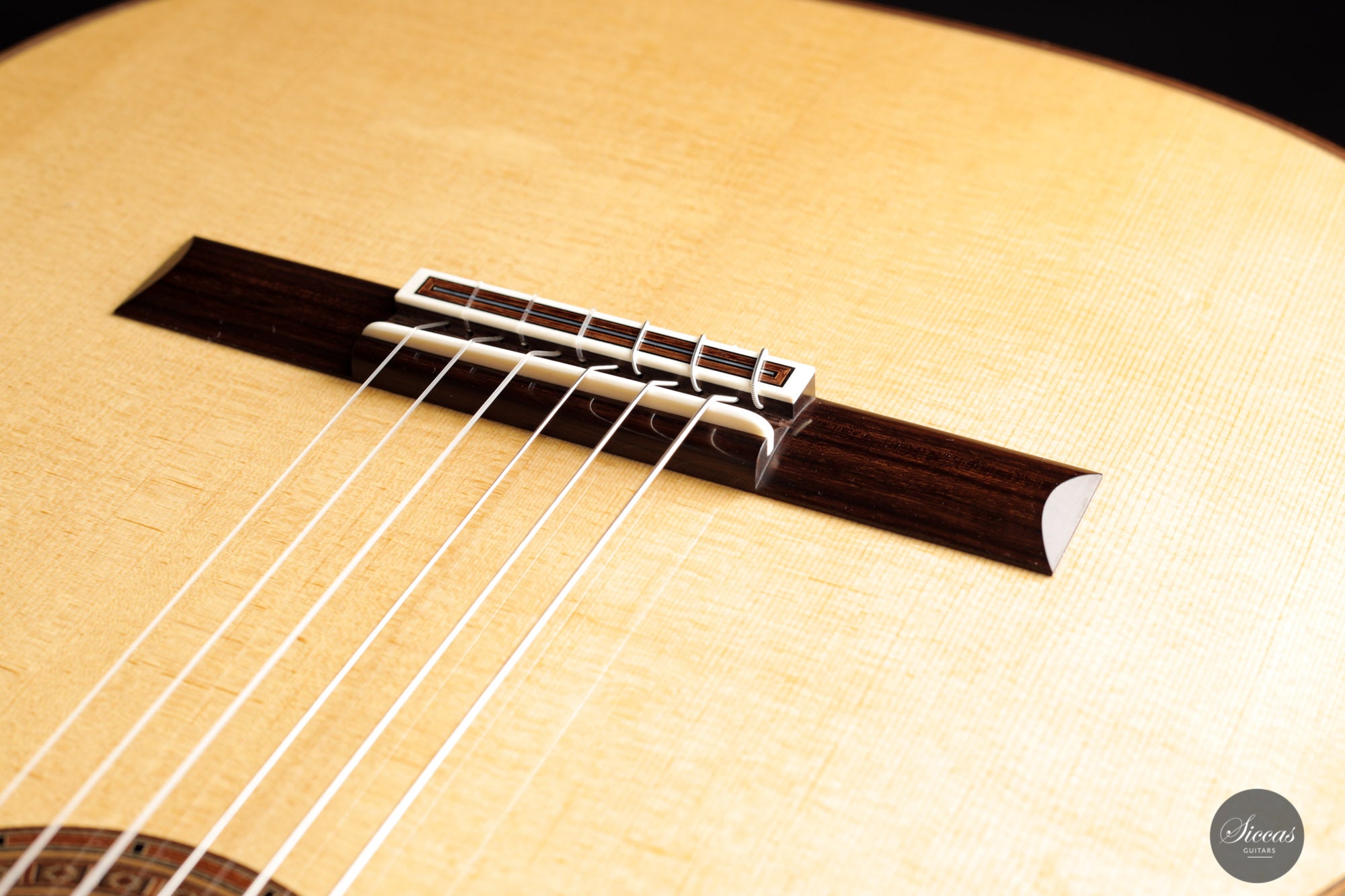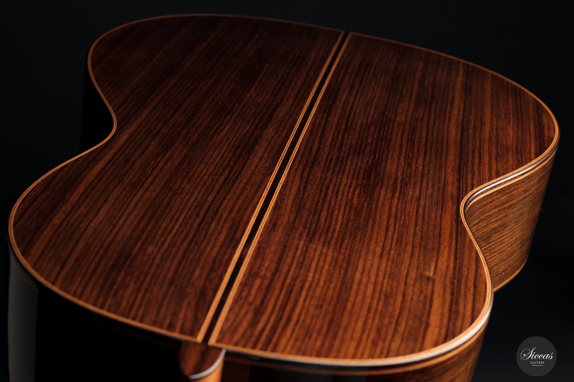 This brand-new instrument has a classic wood combination with a first-class spruce soundboard and Indian rosewood for the back and sides, making for a wide, complex, and colorful sound. The gorgeously crafted rosette shows some vibrant matching colors, well complemented by the most splendid purflings and a super comfortable neck. When playing on the instrument, one can immediately feel its responsiveness and the fine attack, a very lyrical sustain, and deep bass response. Looking further into the design, the guitar is built with double sides that make the structural integrity firmer. Using this technique allows the luthier to build lighter, thus creating a complex tone with a lot of core. This guitar suits the musician that wants perfection delivered with a lush, sweet, and singing tone.