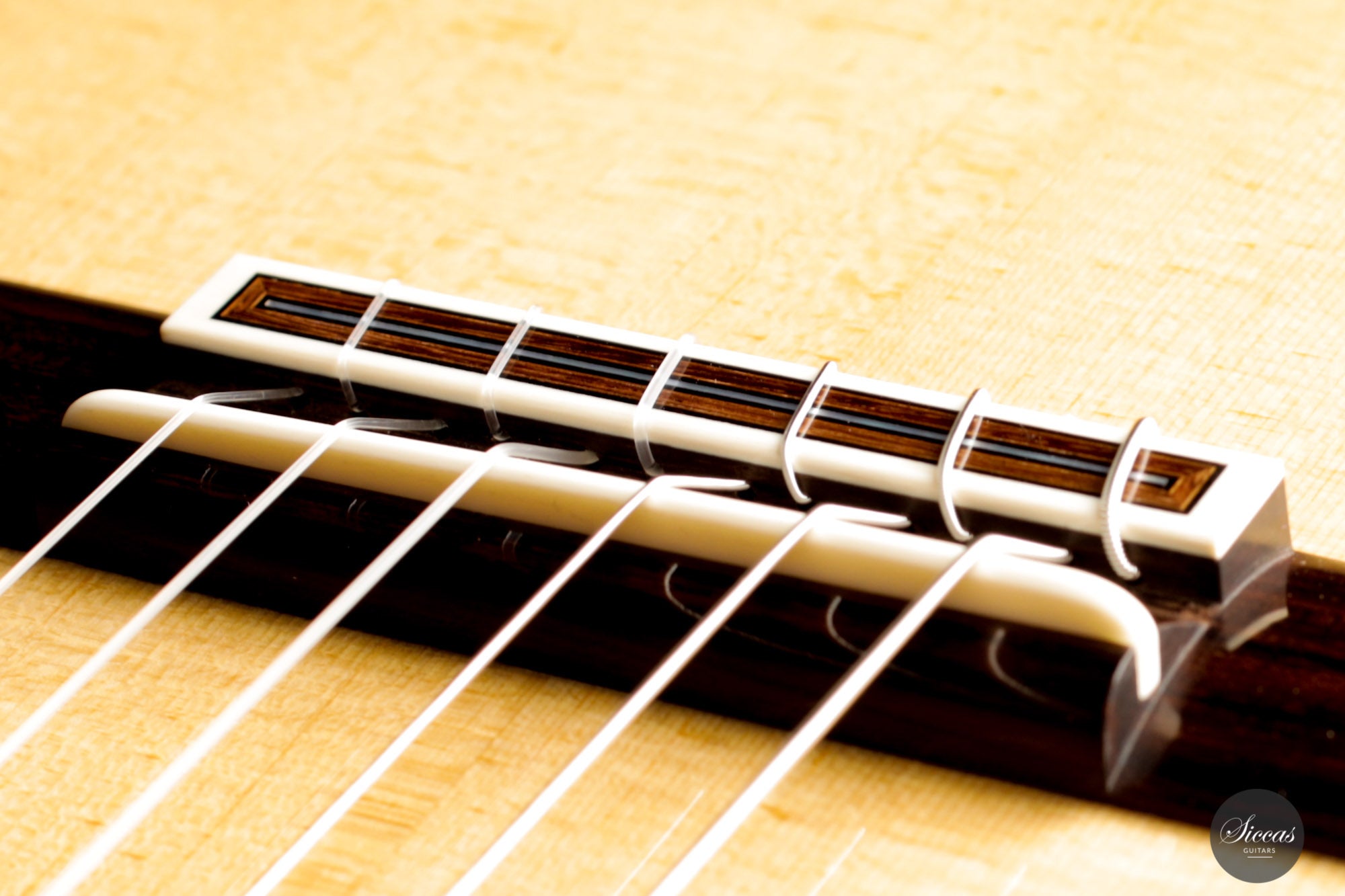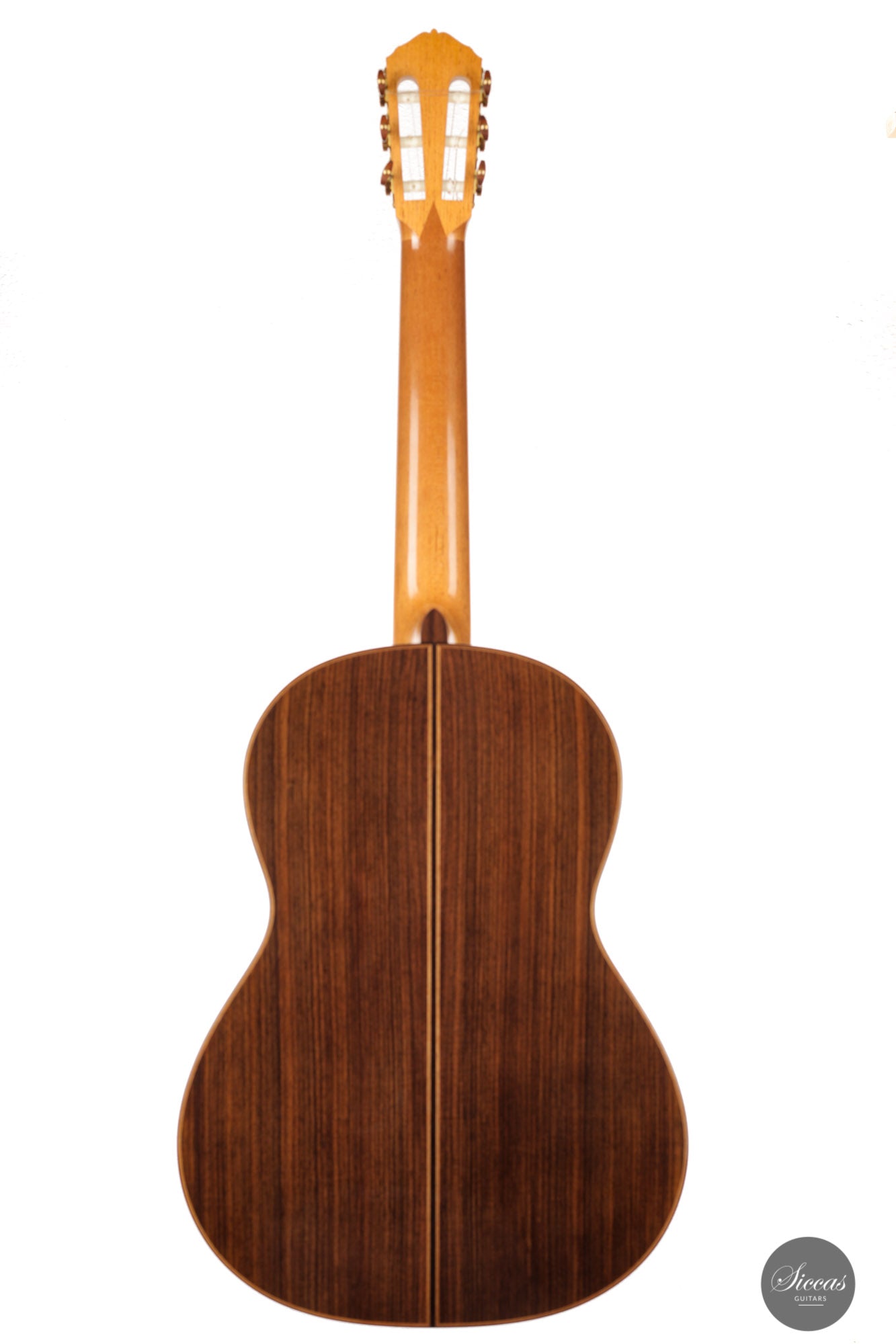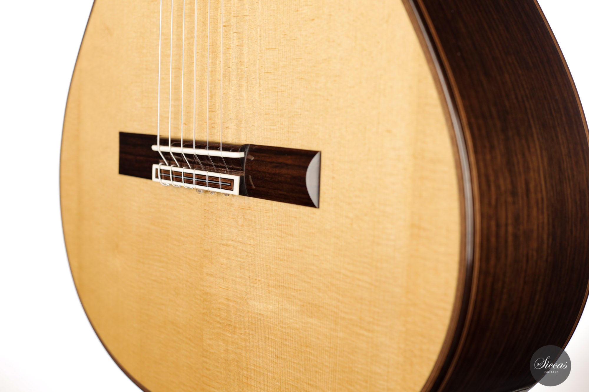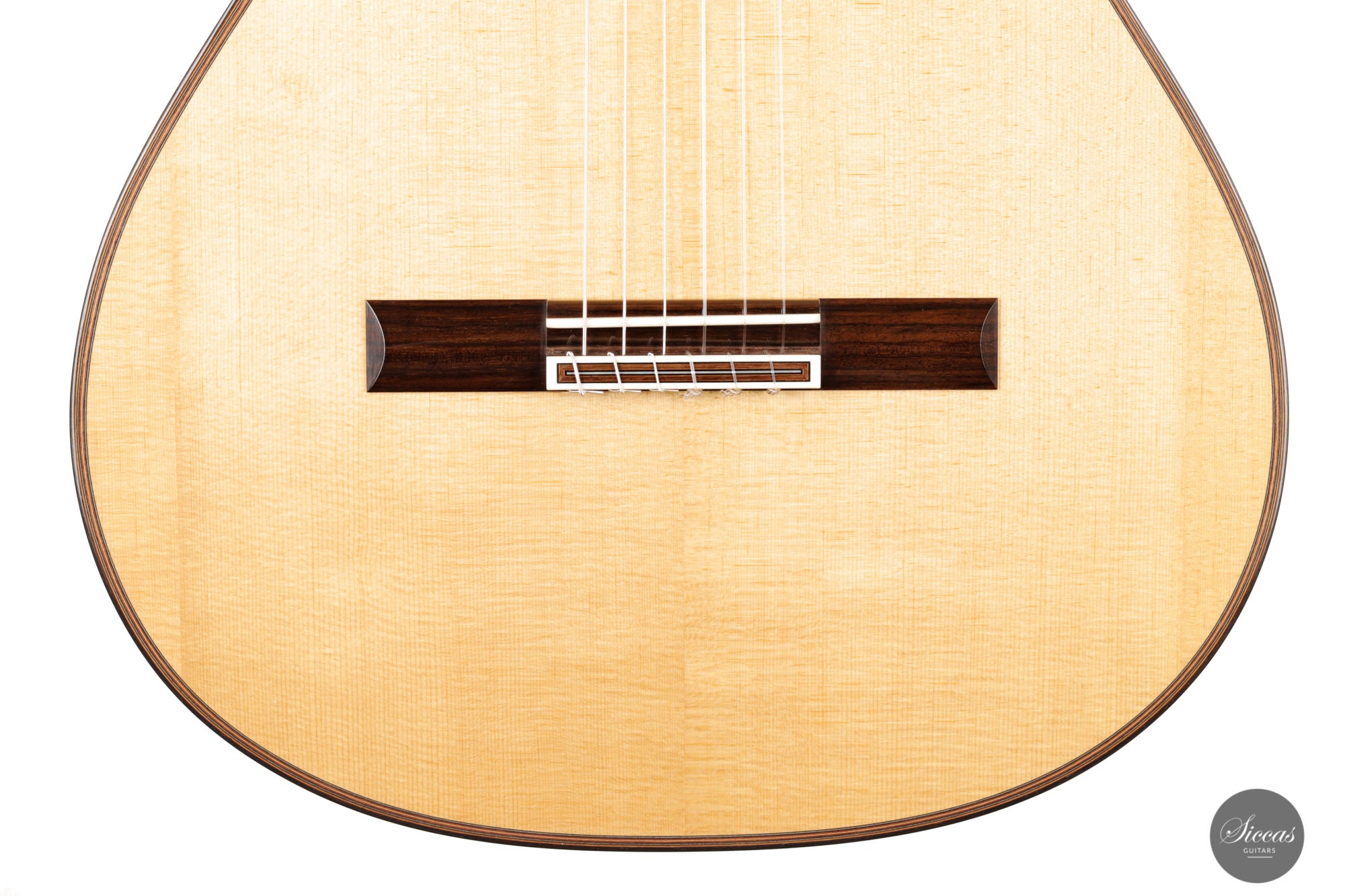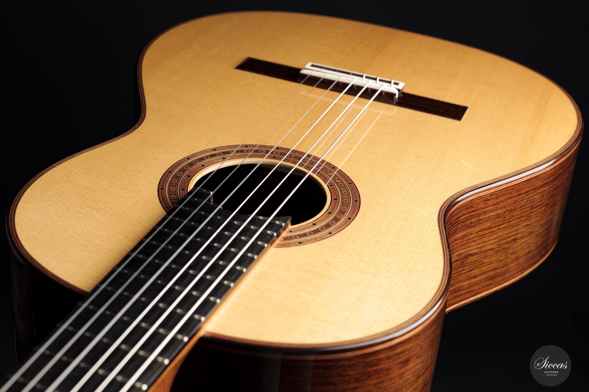 This brand-new instrument has a classic wood combination with a first-class spruce soundboard and Indian rosewood for the back and sides, making for a wide, complex, and colorful sound. The gorgeously crafted rosette shows some vibrant matching colors, well complemented by the most splendid purflings and a super comfortable neck. When playing on the instrument, one can immediately feel its responsiveness and the fine attack, a very lyrical sustain, and deep bass response. Looking further into the design, the guitar is built with double sides that make the structural integrity firmer. Using this technique allows the luthier to build lighter, thus creating a complex tone with a lot of core. This guitar suits the musician that wants perfection delivered with a lush, sweet, and singing tone.