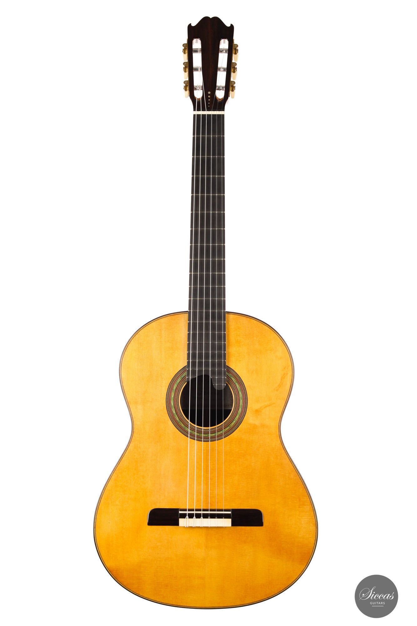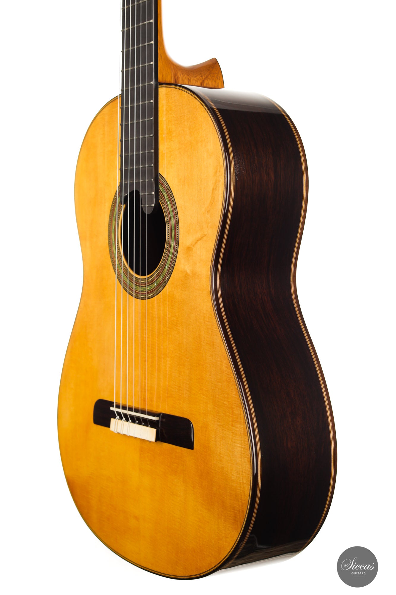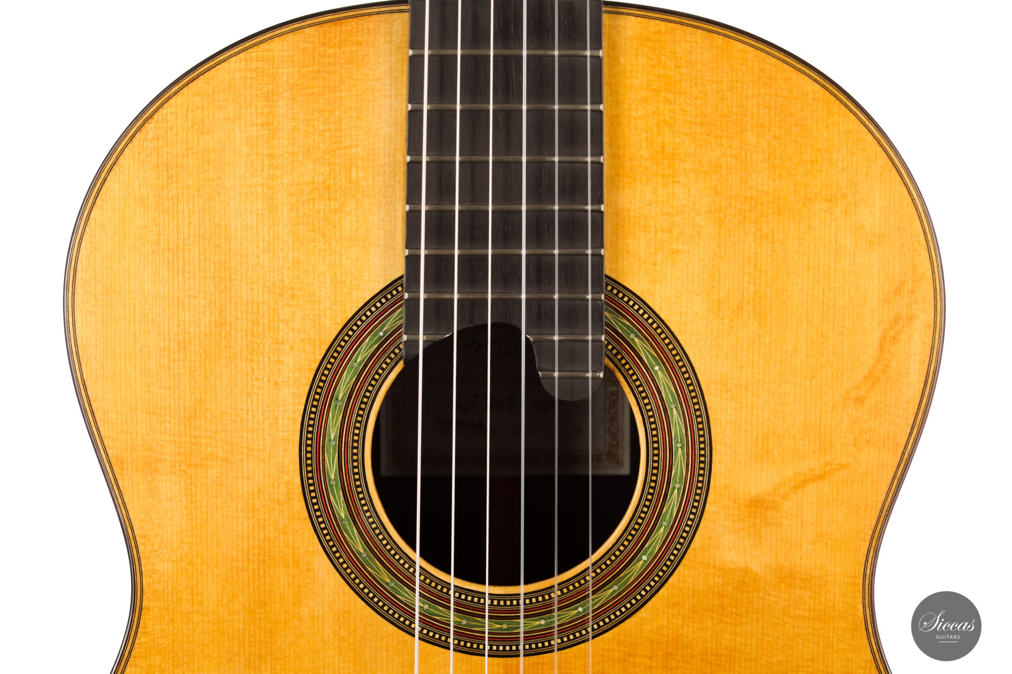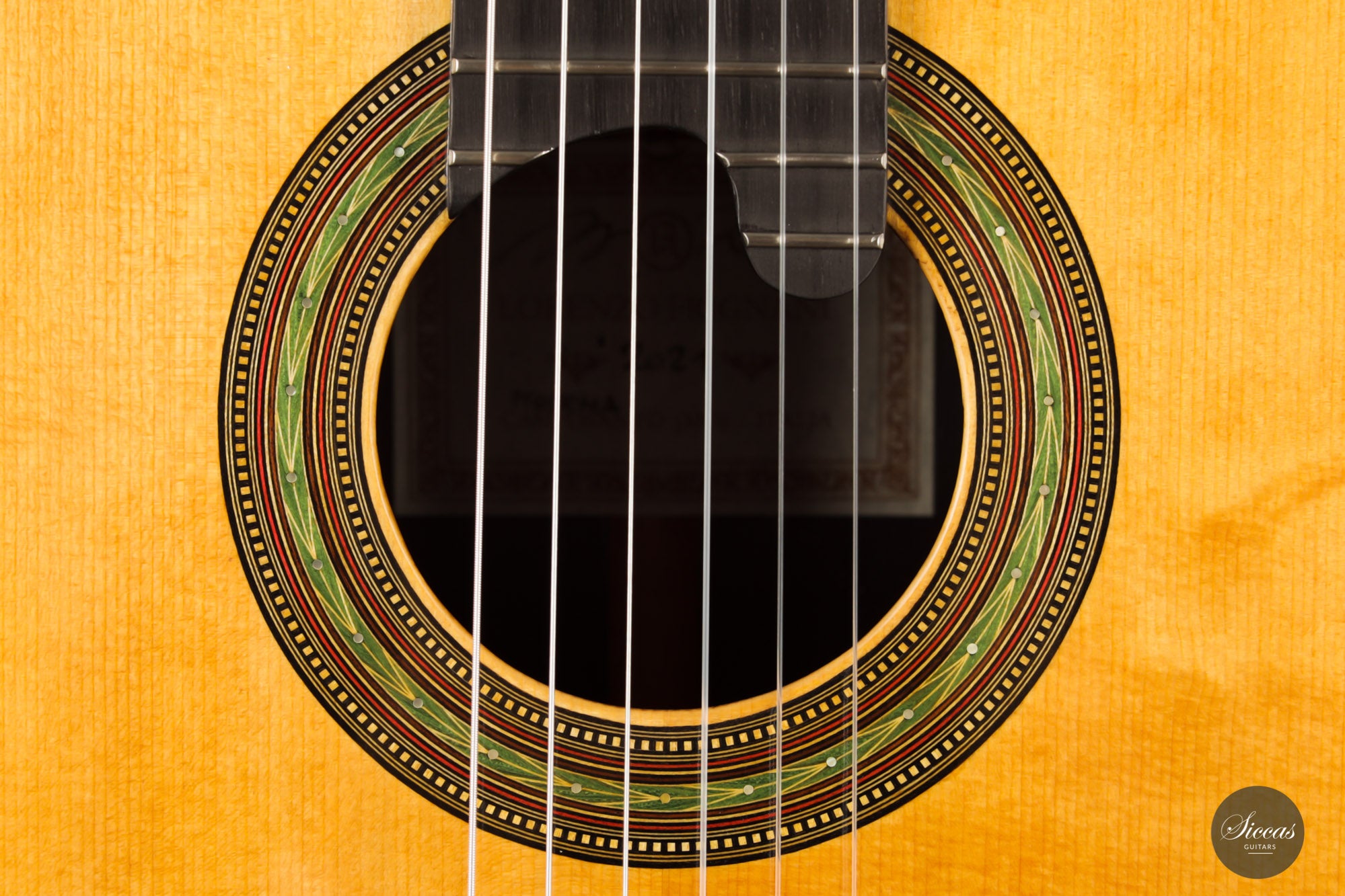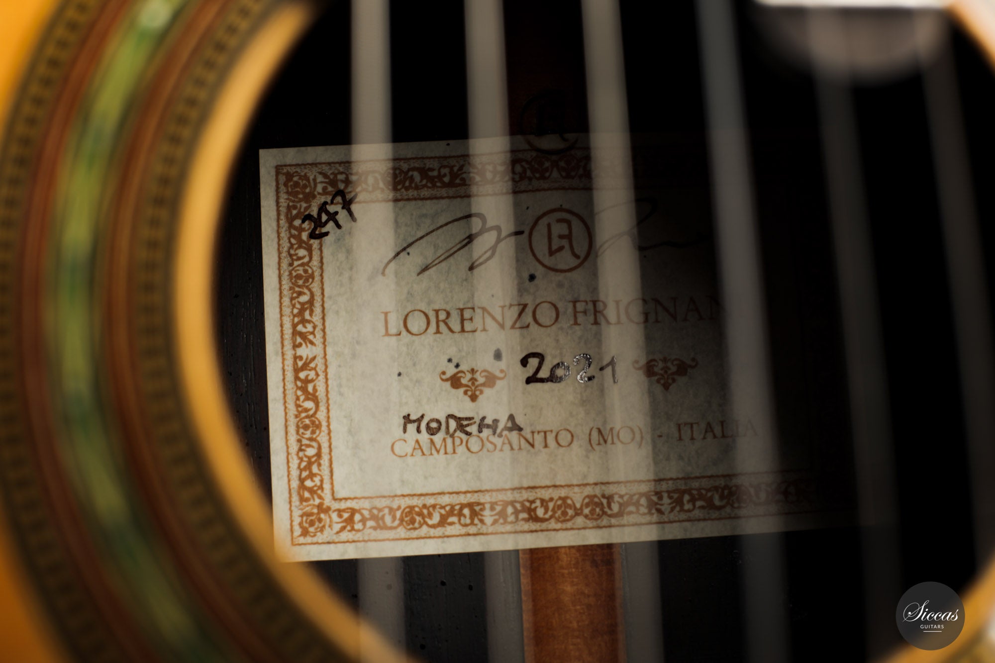Lorenzo Frignani found inspiration for this wonderful guitar number 247 in the guitars of David Rubio. Using Rubio's plantilla and ideal of sound, he adapted the internal construction and opted for a traditional "x-bracing", the hallmark of Lorenzo Frignani's guitars. The appearance of this instrument is exceptional with a gold-colored spruce top and long-seasoned dark Indian rosewood back and sides. The mother of pearl dots in the rosette and headstock, along with the many refined marquetry details, make this instrument a true gem.