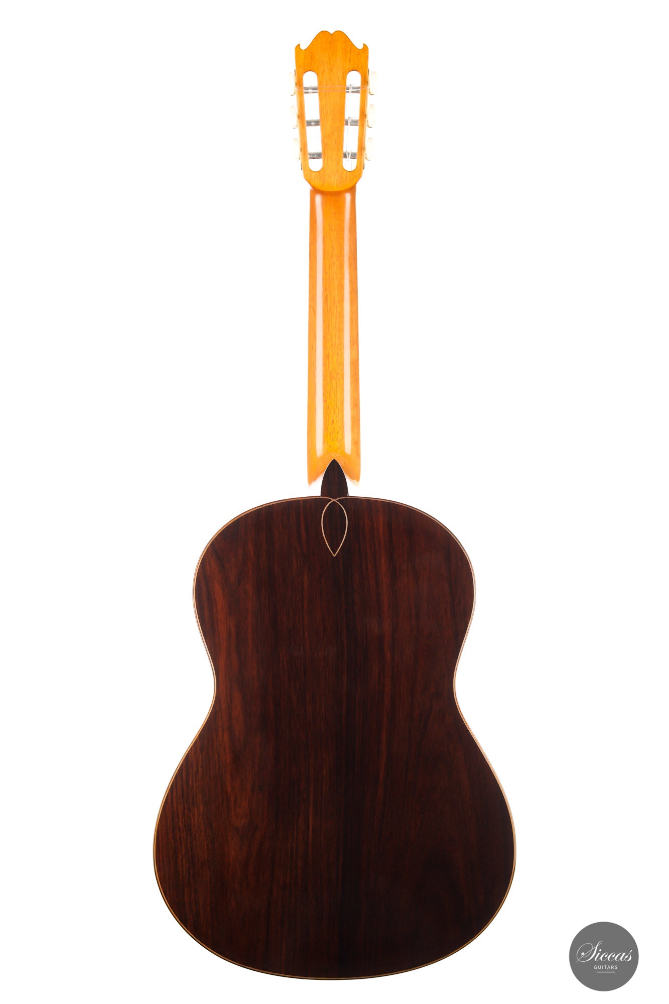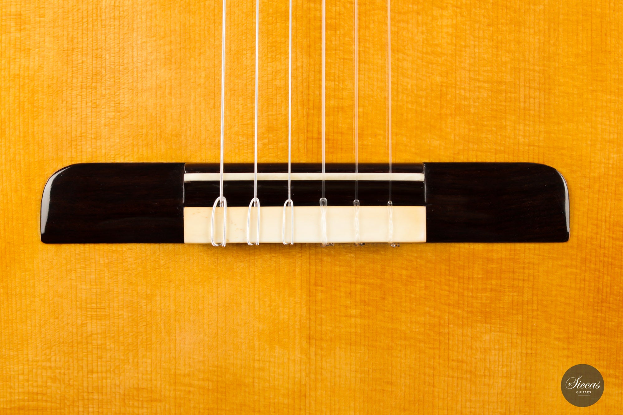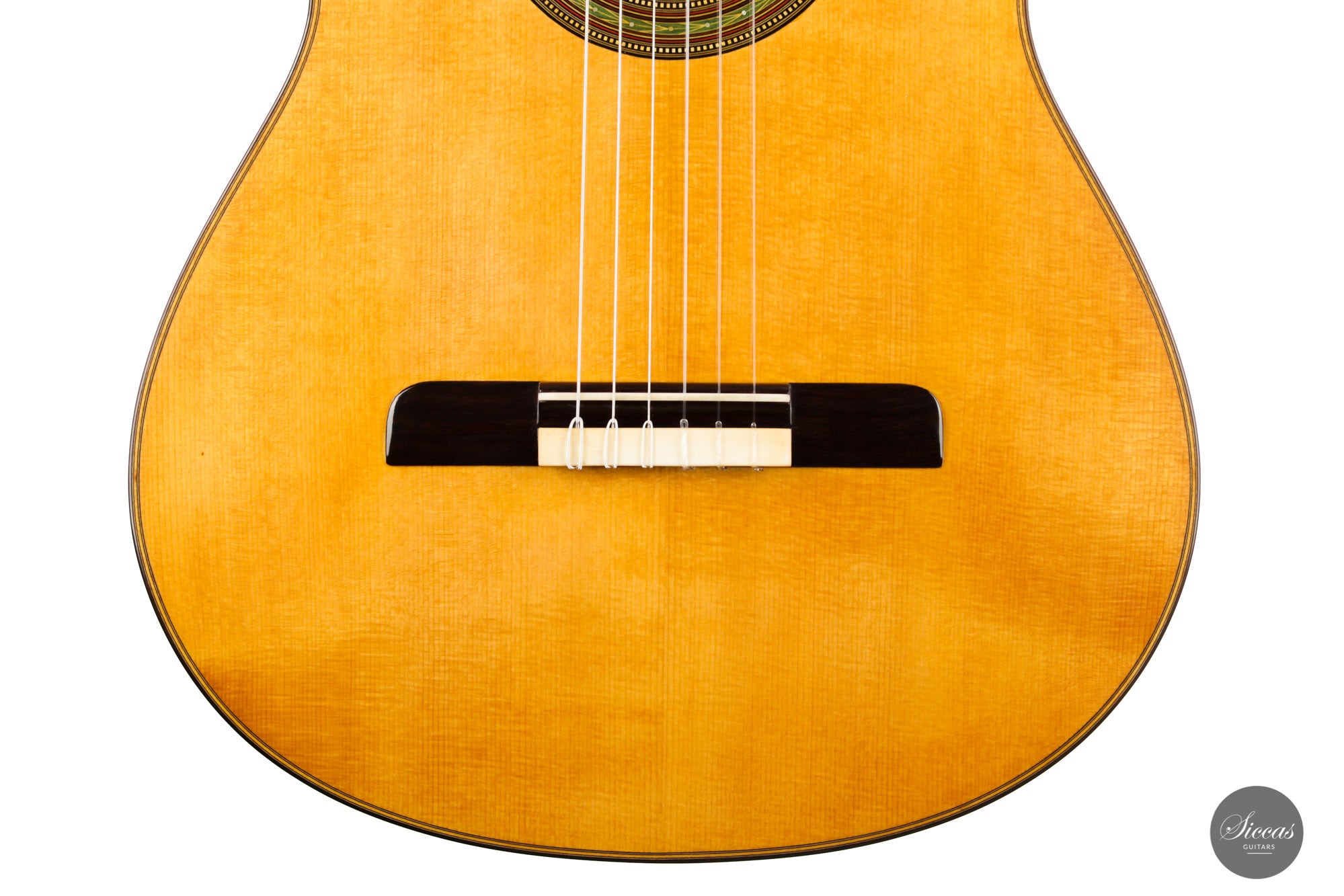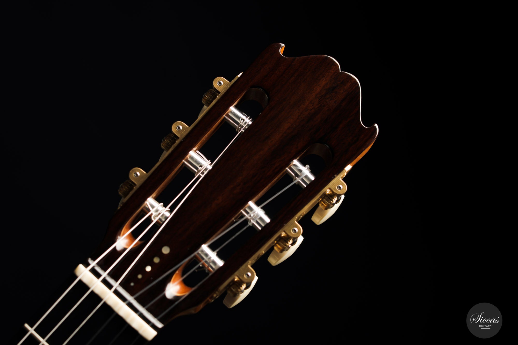 Lorenzo Frignani found inspiration for this wonderful guitar number 247 in the guitars of David Rubio. Using Rubio's plantilla and ideal of sound, he adapted the internal construction and opted for a traditional "x-bracing", the hallmark of Lorenzo Frignani's guitars. The appearance of this instrument is exceptional with a gold-colored spruce top and long-seasoned dark Indian rosewood back and sides. The mother of pearl dots in the rosette and headstock, along with the many refined marquetry details, make this instrument a true gem.