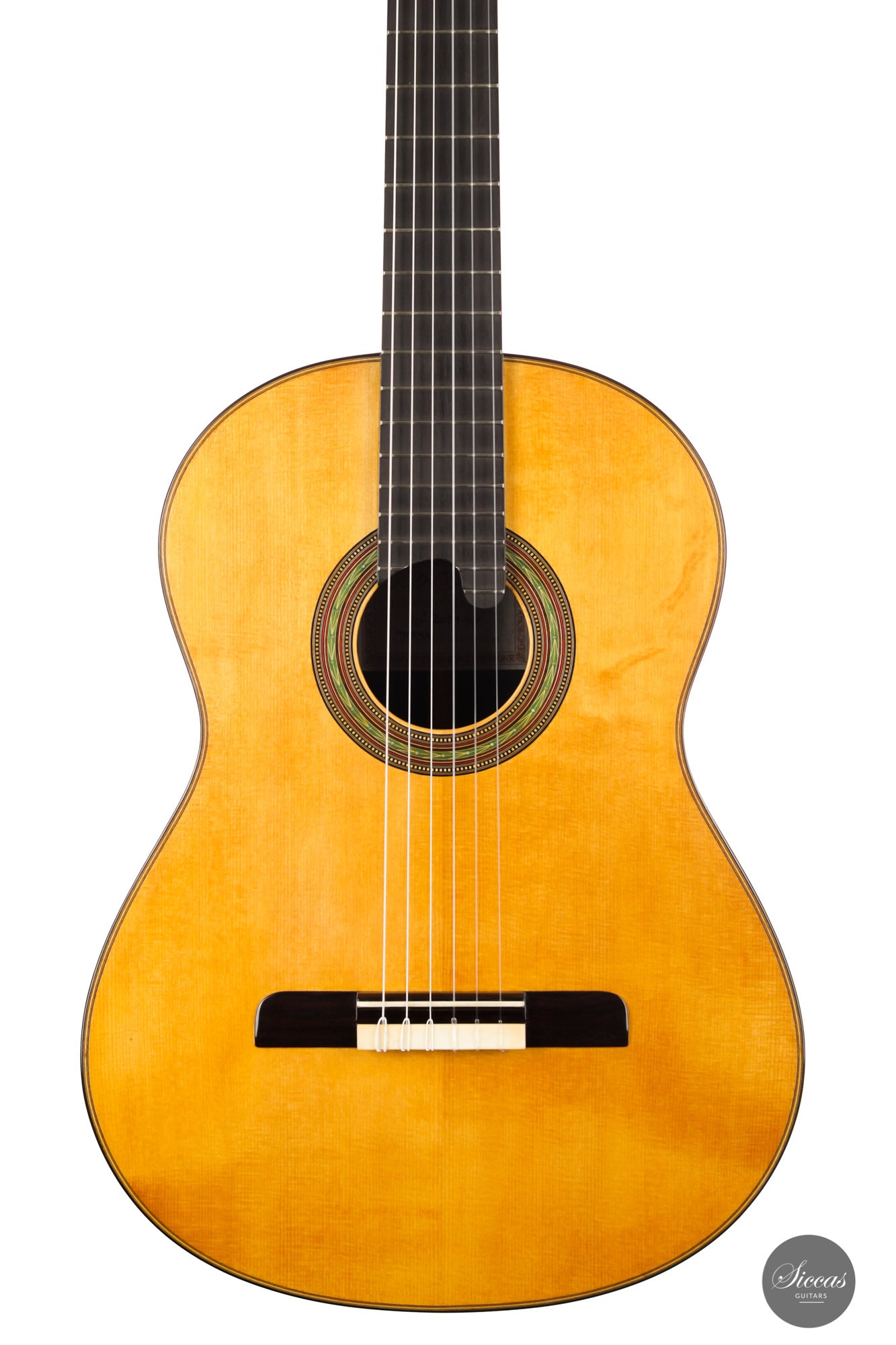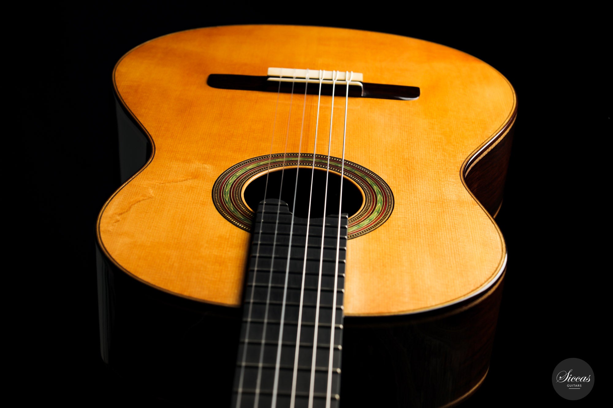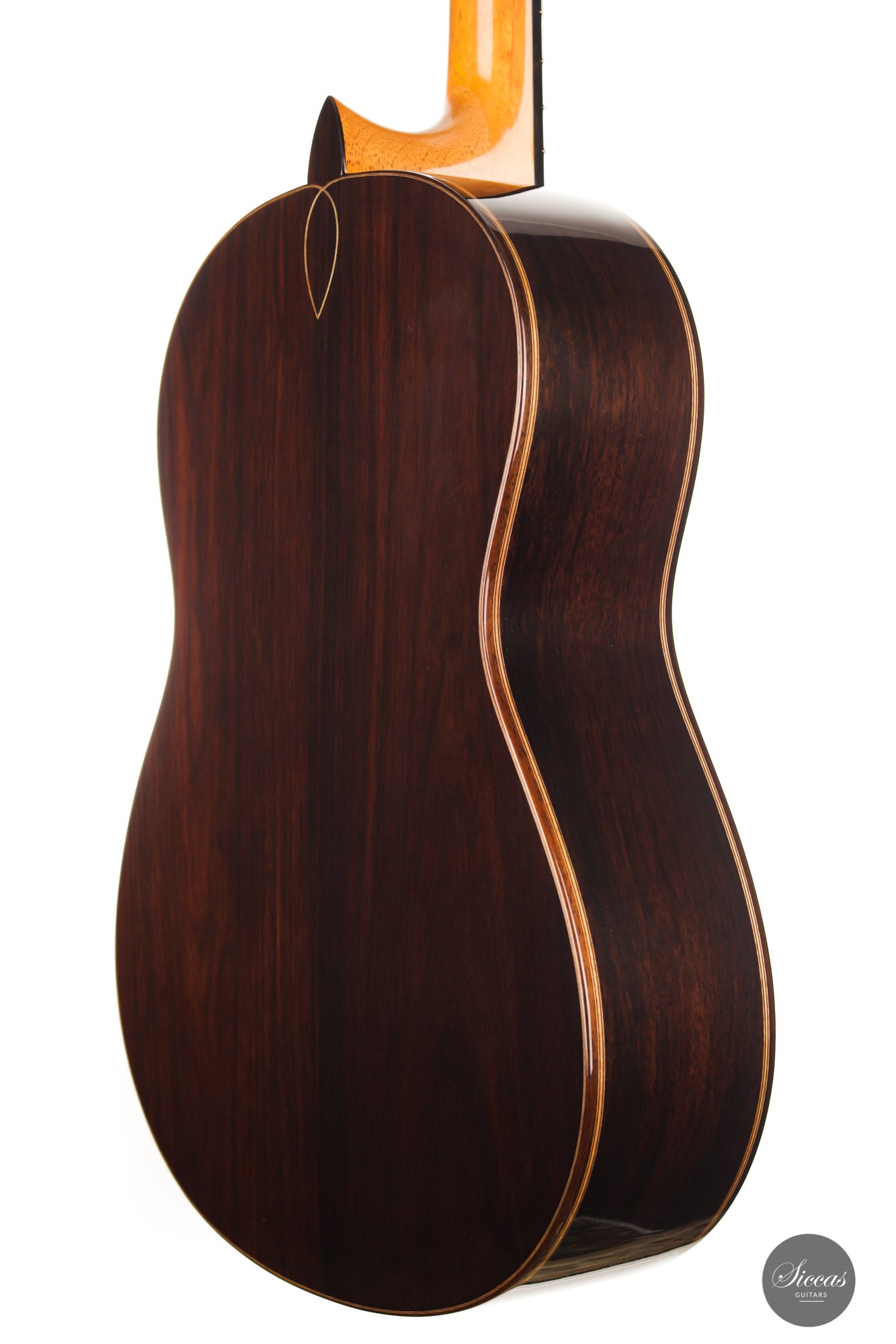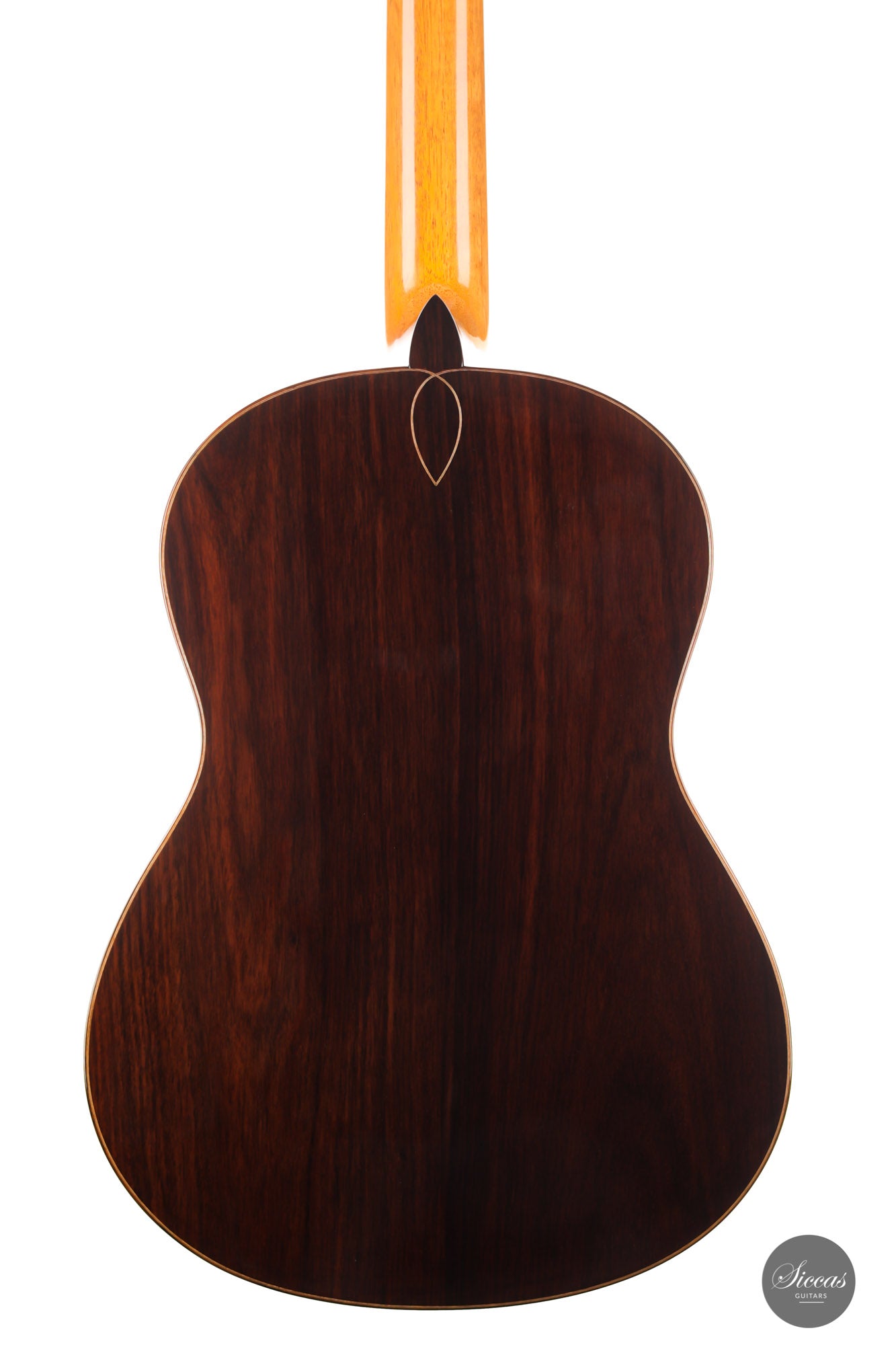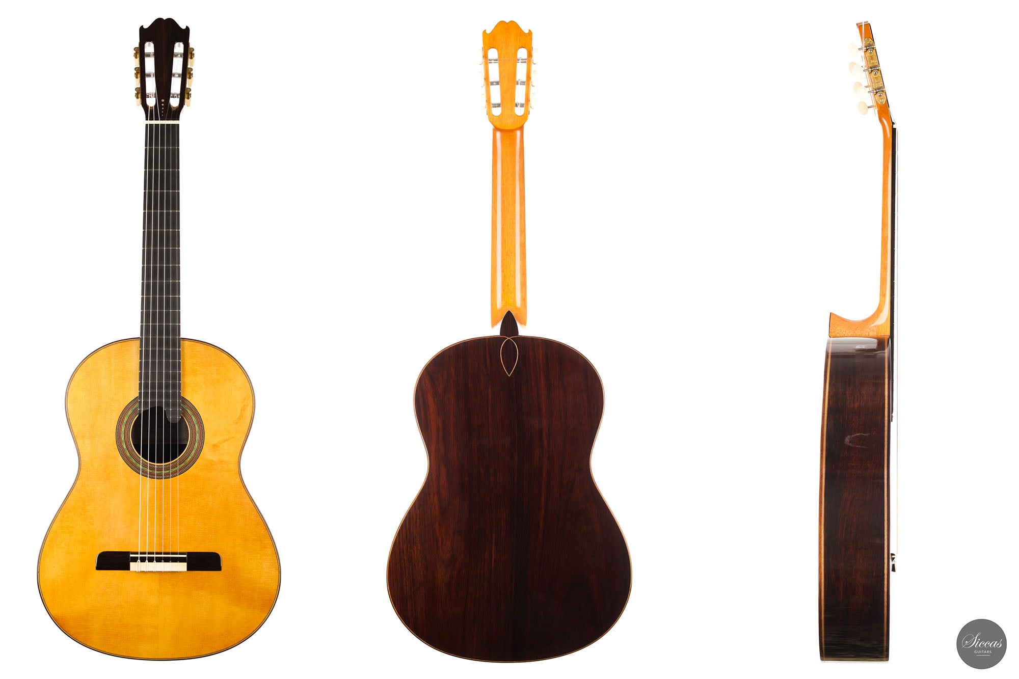 Lorenzo Frignani found inspiration for this wonderful guitar number 247 in the guitars of David Rubio. Using Rubio's plantilla and ideal of sound, he adapted the internal construction and opted for a traditional "x-bracing", the hallmark of Lorenzo Frignani's guitars. The appearance of this instrument is exceptional with a gold-colored spruce top and long-seasoned dark Indian rosewood back and sides. The mother of pearl dots in the rosette and headstock, along with the many refined marquetry details, make this instrument a true gem.