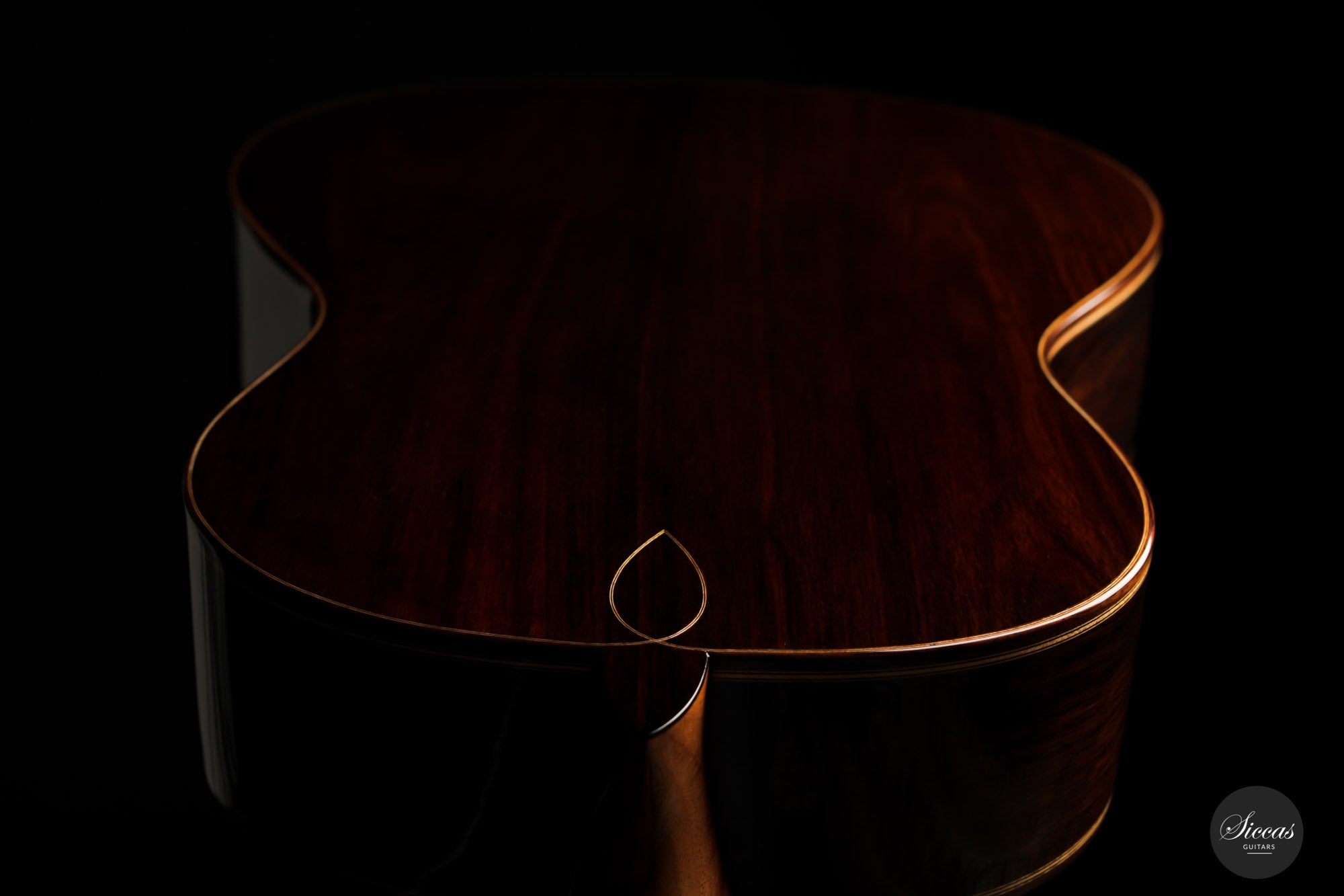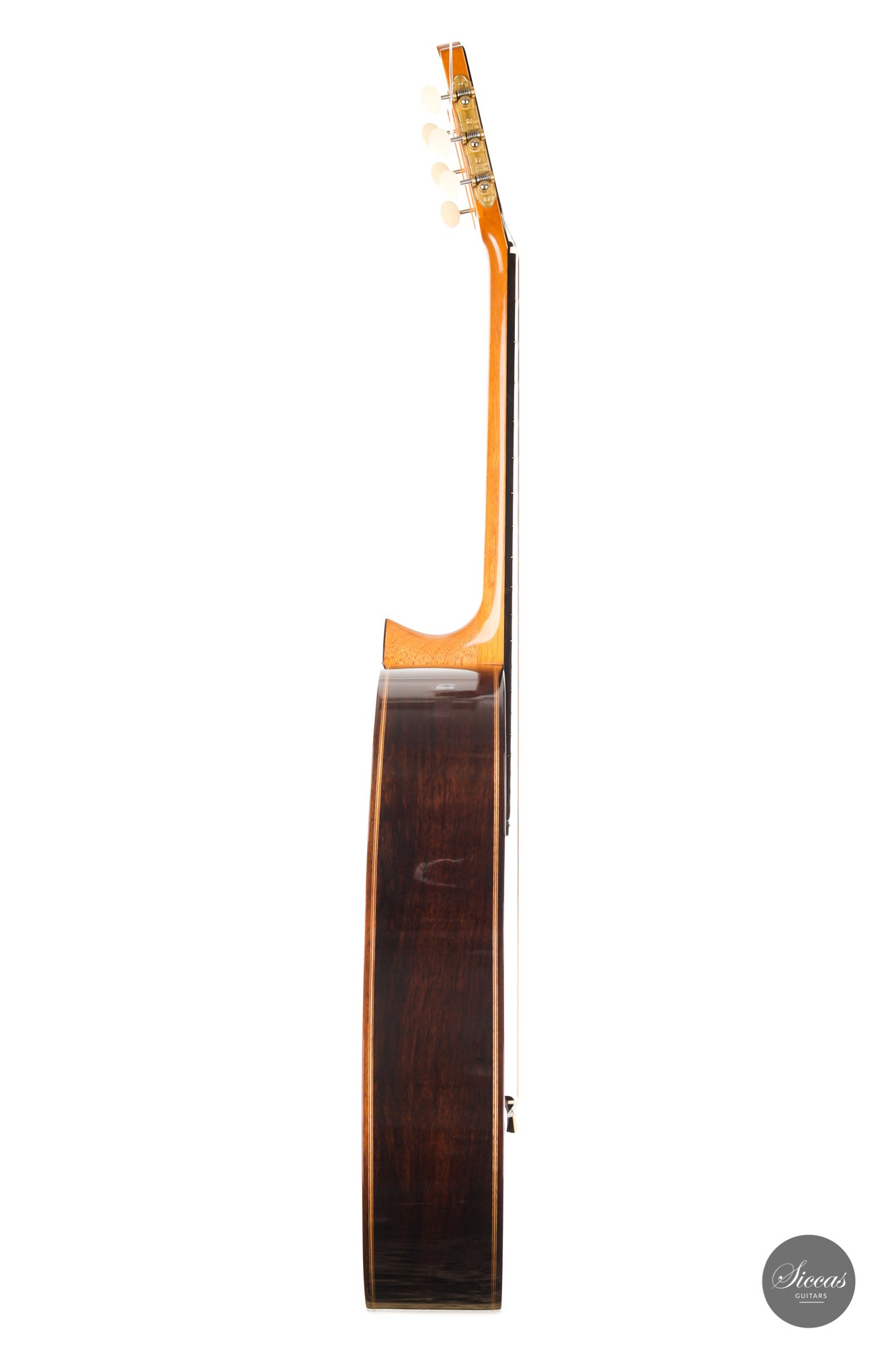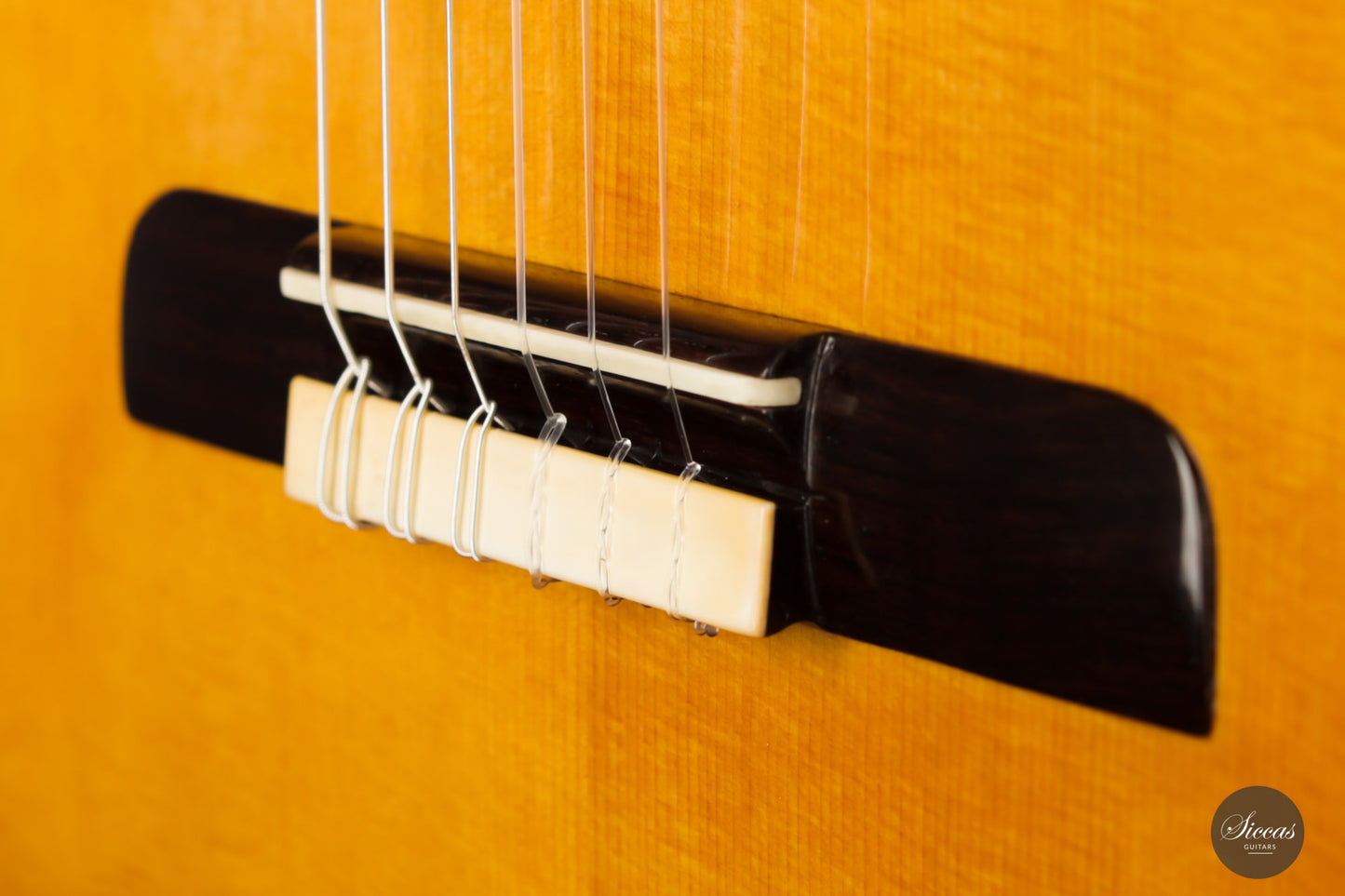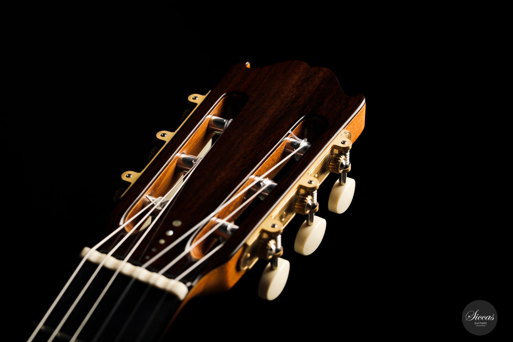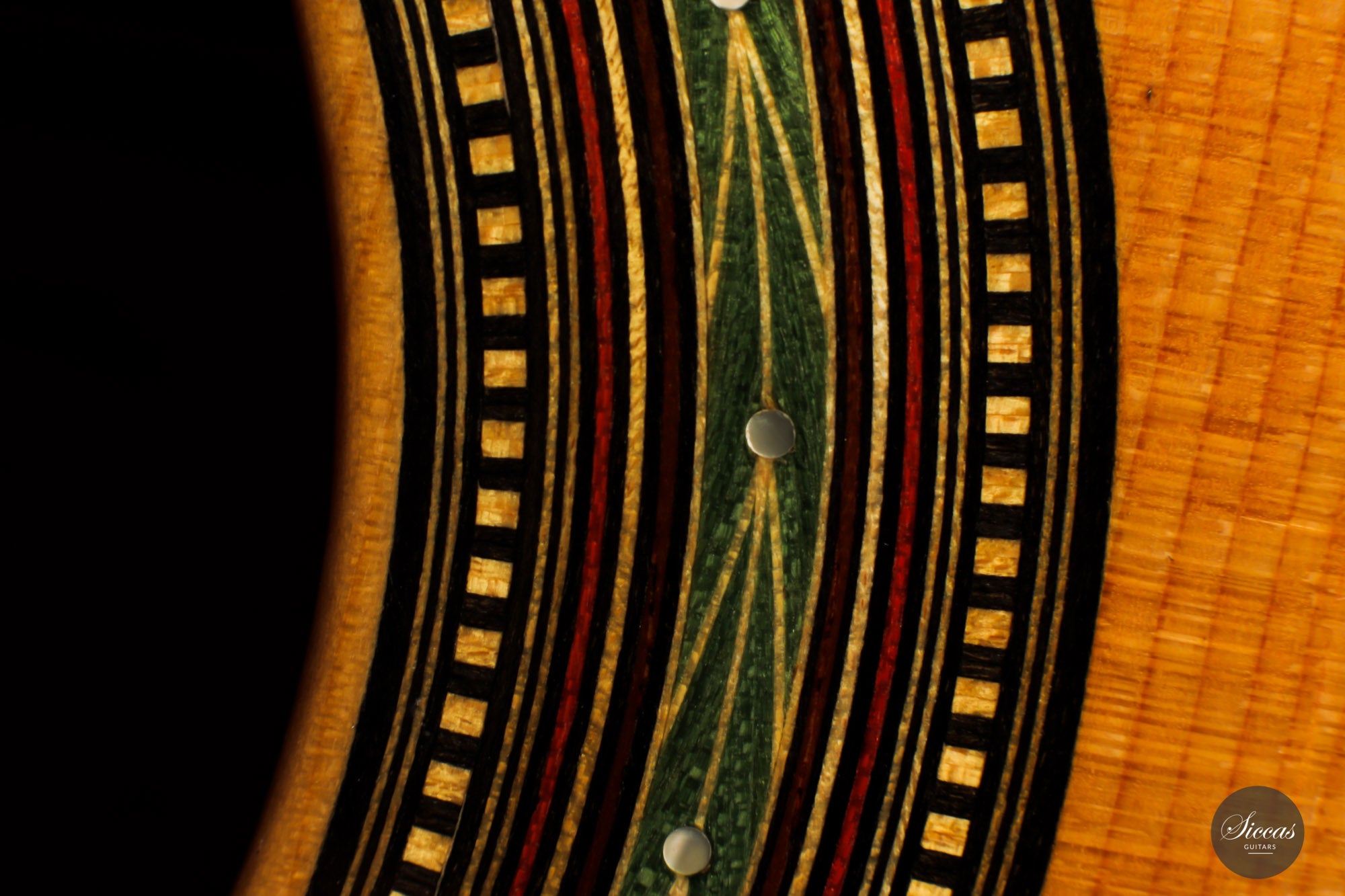 Lorenzo Frignani found inspiration for this wonderful guitar number 247 in the guitars of David Rubio. Using Rubio's plantilla and ideal of sound, he adapted the internal construction and opted for a traditional "x-bracing", the hallmark of Lorenzo Frignani's guitars. The appearance of this instrument is exceptional with a gold-colored spruce top and long-seasoned dark Indian rosewood back and sides. The mother of pearl dots in the rosette and headstock, along with the many refined marquetry details, make this instrument a true gem.