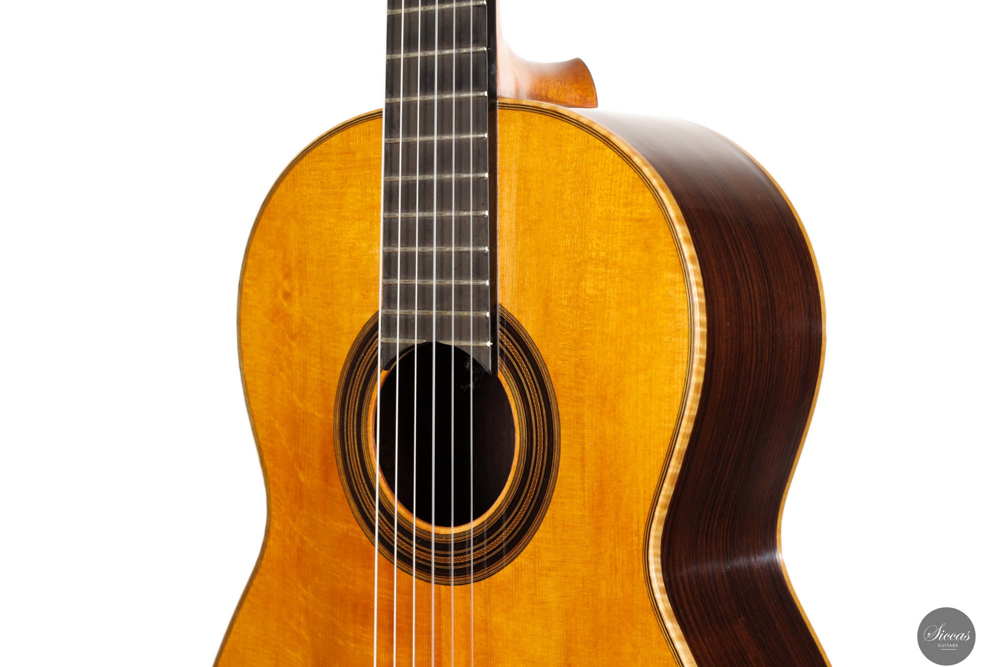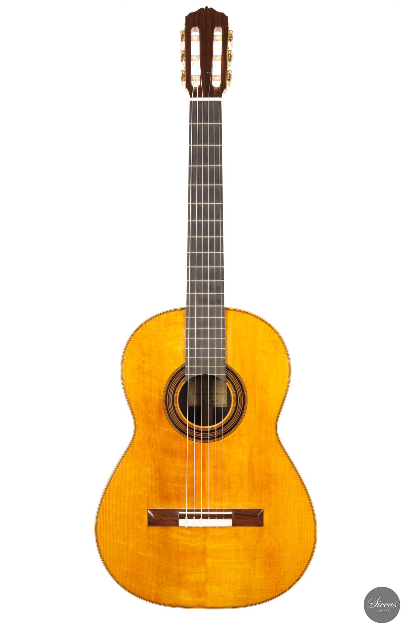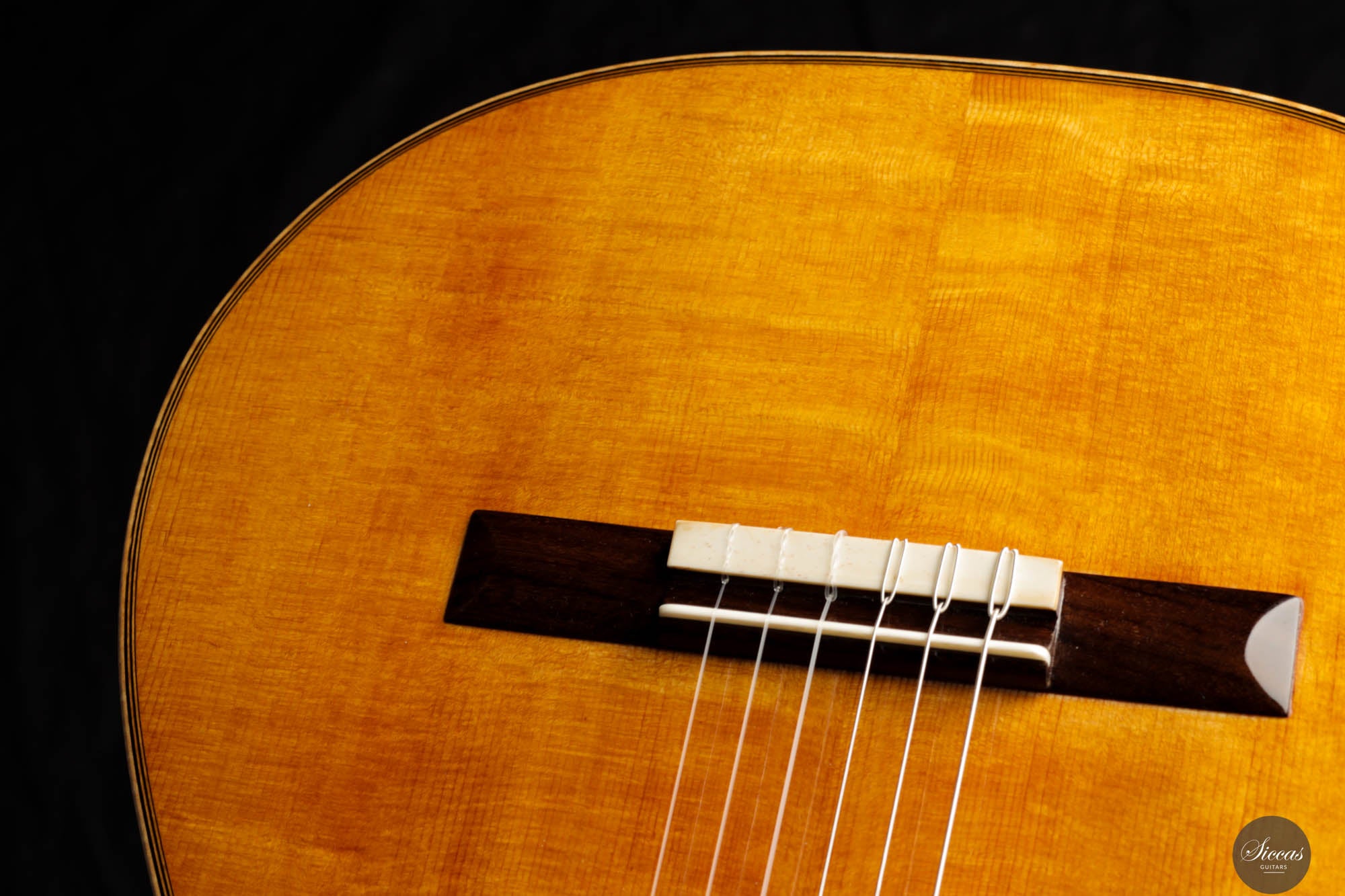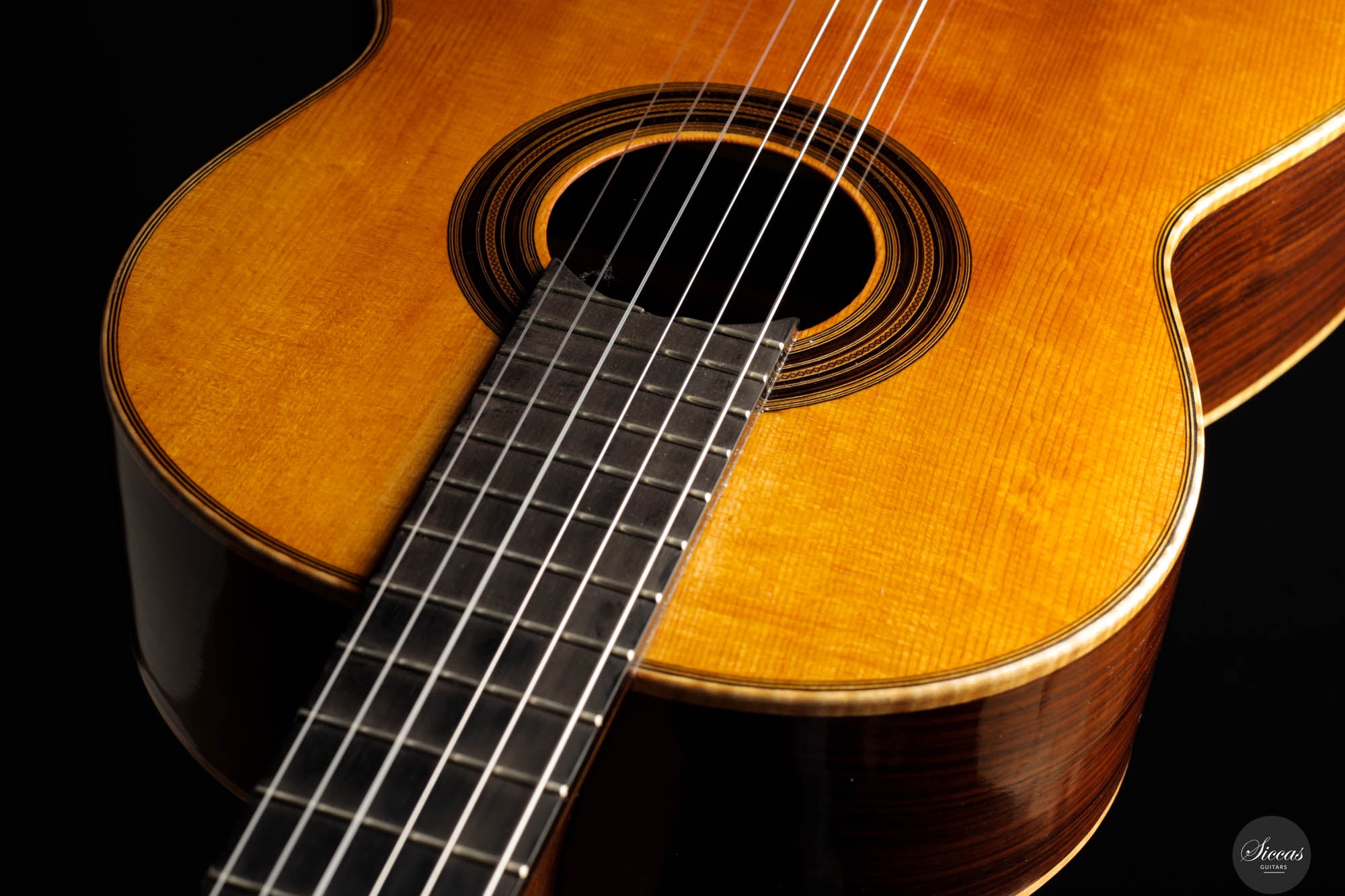 This 1910 Manuel Ramirez copy, a stunning creation dated 2022 and numbered 249, emerges from the esteemed workshop of Lorenzo Frignani, a maestro in the world of luthiery. This guitar is more than an instrument; it's a bridge across time, faithfully capturing the essence of its historic counterpart. The guitar's old-world tone immediately transports the player and listener alike to a bygone era of guitar craftsmanship. This remarkable replication is a testament to Frignani's deep understanding and appreciation of the original 1910 Manuel Ramirez guitar. His unique position as both a luthier and an important collector, especially as the owner of the original Ramirez, has afforded him unlimited access to study and replicate its intricacies. The resulting instrument is not just a copy, but a near-perfect echo of the original, reflecting Frignani's dedication to authenticity and precision in craftsmanship.